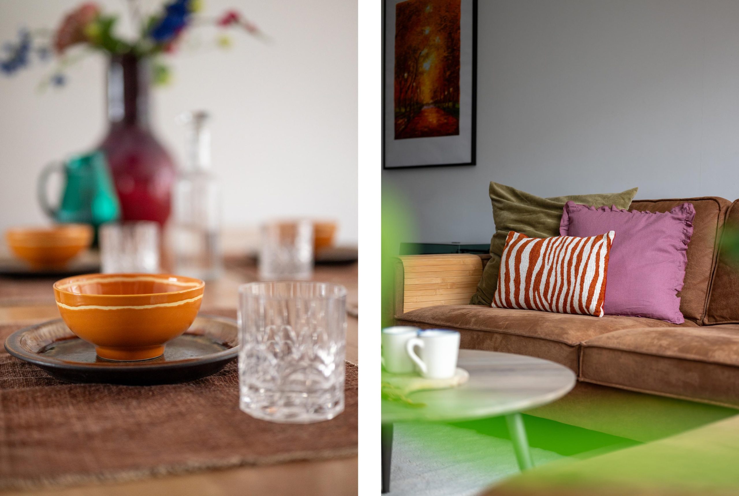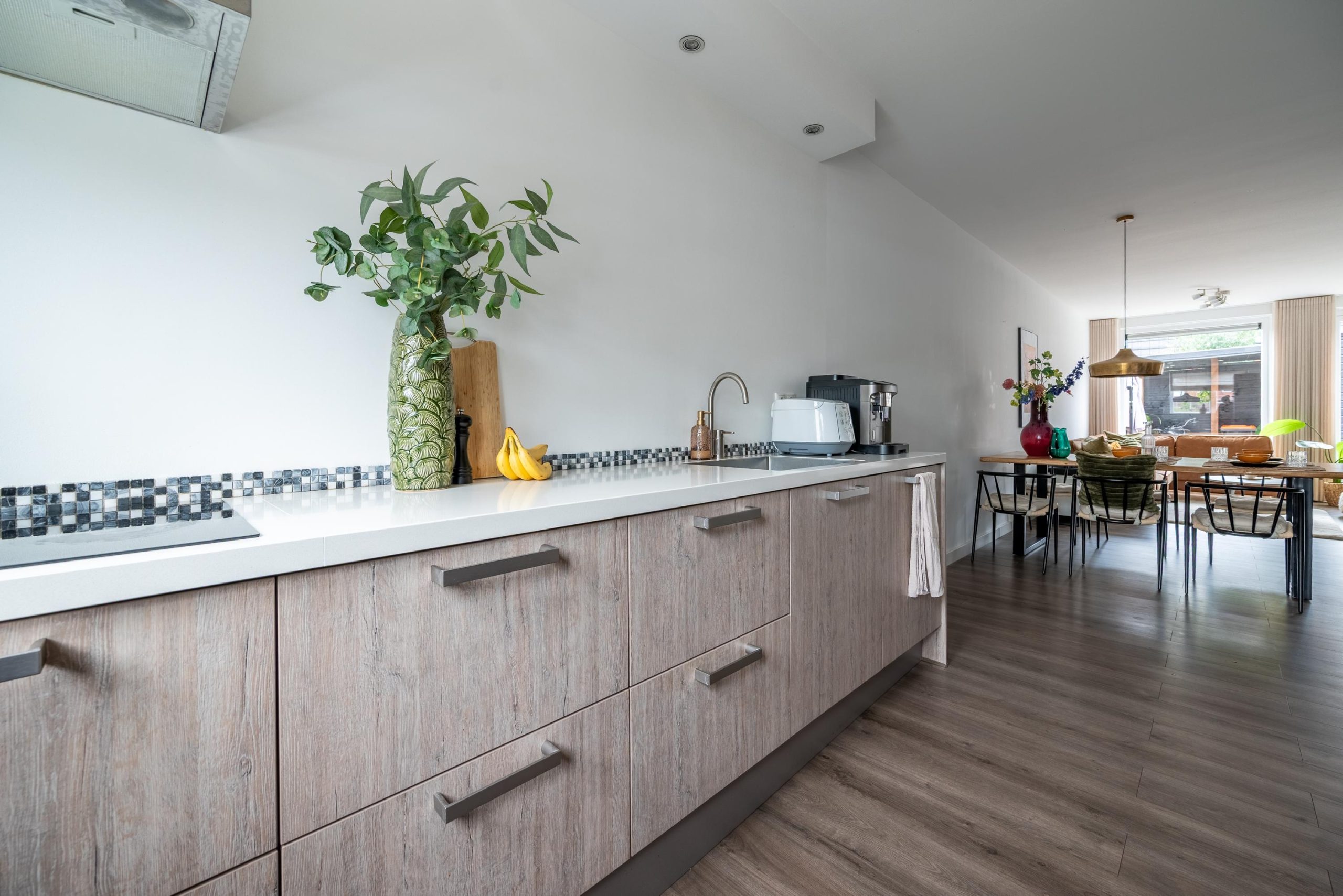 De woonkamer is fijn en huiselijk. De moderne inrichting en wandkast zorgen voor een rustige, moderne uitstraling. Het triple glas en de strakke pvc-vloer zorgen ervoor dat het hier altijd behaaglijk is. Richting de keuken is genoeg ruimte om een fijne eettafel neer te zetten, die in direct contact staat met de keuken. De ideale plek voor een uitgebreide brunch of een gezellige spelletjesavond met vrienden. Ook de keuken is strak afgewerkt en voorzien van alle gemakken, waaronder een inductiekookplaat, oven, magnetron, koelkast, vriezer en vaatwasser.