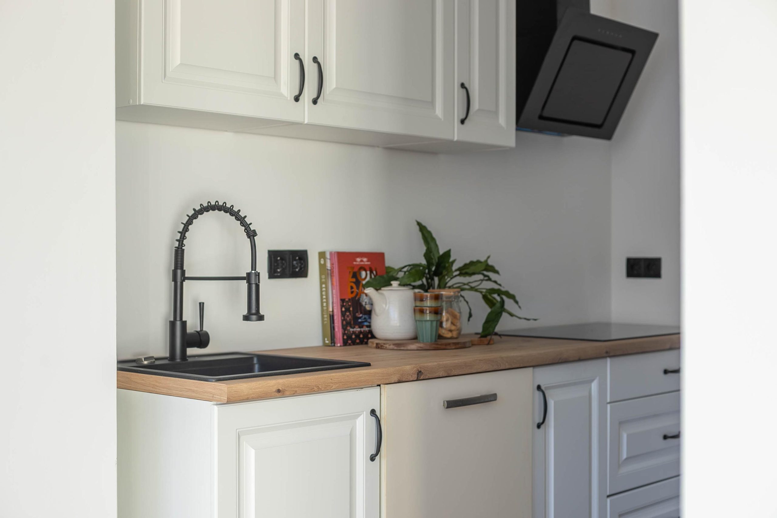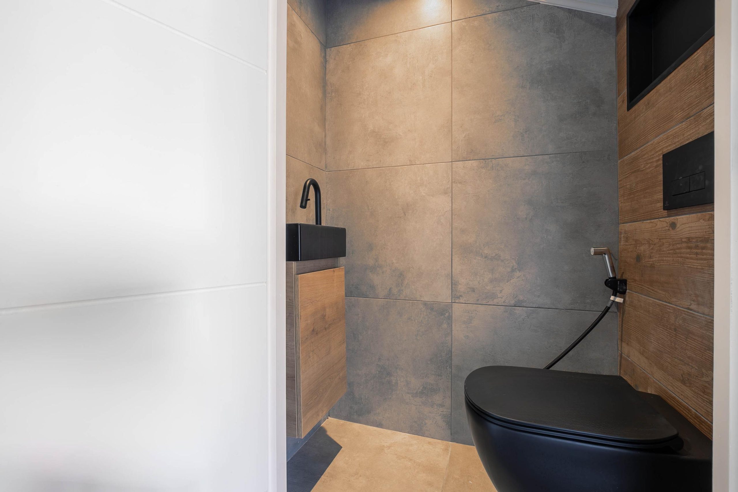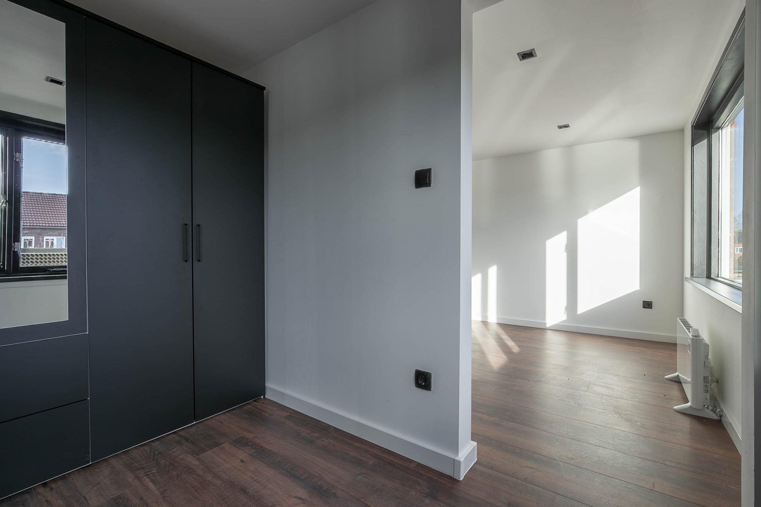 De uitbouw met de glazen schuifpui zorgen voor een royale woonkamer vol licht, met ruimte voor een grote eettafel en een gezellige zithoek. De halfopen keuken, nog helemaal nieuw, is fris wit met een warm houten aanrechtblad en moderne zwarte accenten, volledig ingericht om het perfecte diner te bereiden.