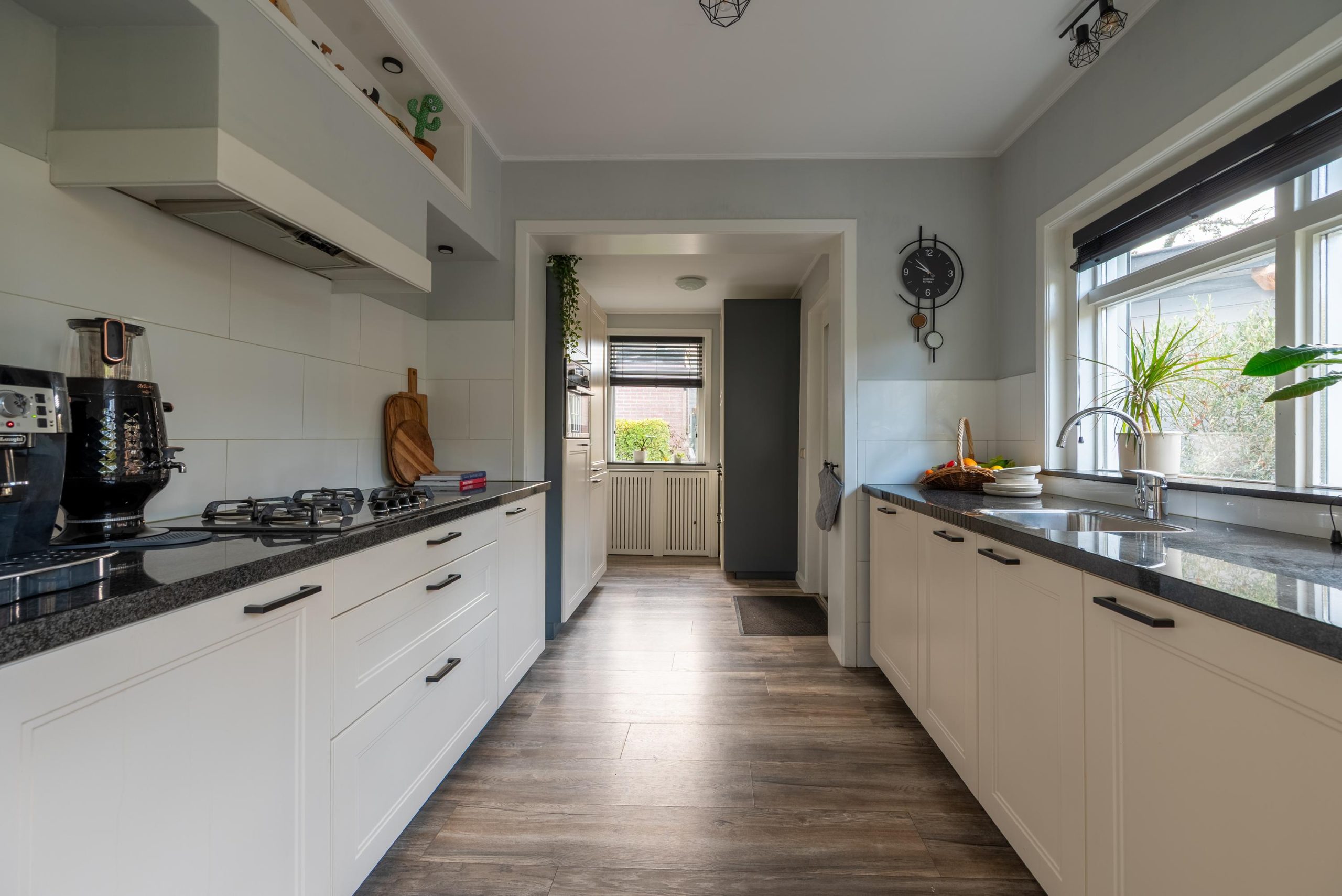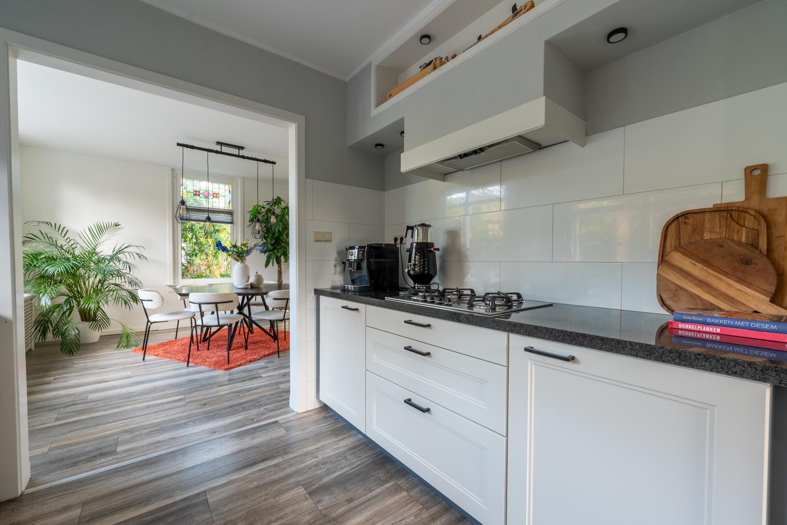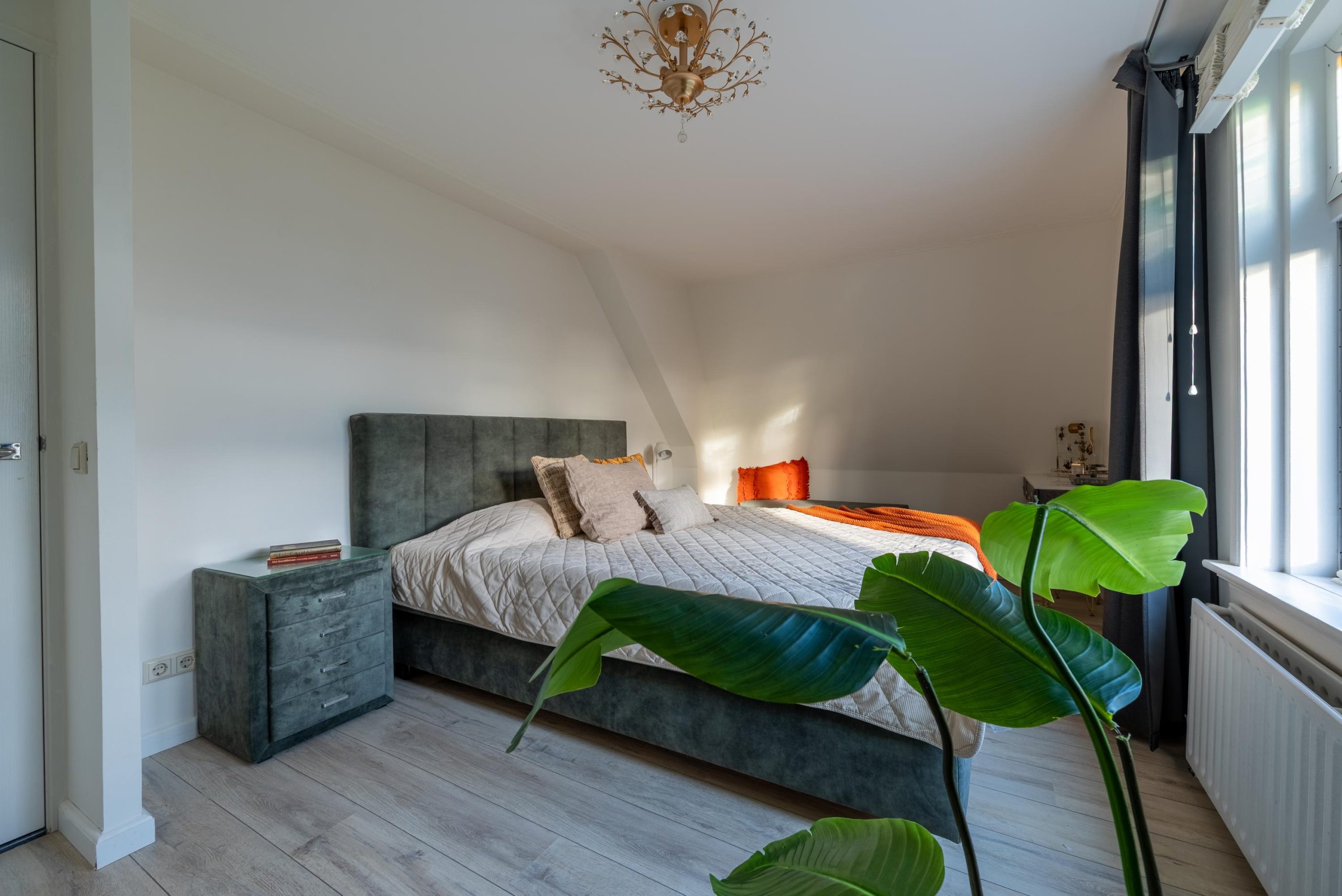 De woonkamer ademt jaren ’30-charme, maar is met zorg gemoderniseerd. In de erker is het heerlijk zitten met een kop koffie, terwijl de elektrische haard zorgt voor extra warmte en gezelligheid. De lichtbruine laminaatvloer vormt een rustige basis voor het geheel. De landelijke keuken in zachte beige tinten is ruim en praktisch, met een granieten werkblad en alle benodigde inbouwapparatuur zoals o.a. een gaskookplaat, combi-oven, vaatwasser, koelkast en aparte vriezer. Vanuit hier kijk je fijn uit op de achtertuin. Op de eerste verdieping ligt de masterbedroom, een lichte en comfortabele ruimte met twee inloopkasten. Daarnaast zijn er twee (werk)kamers. Via de overloop is een airco aangesloten die de verdieping van extra comfort voorziet. Ook is er toegang tot de vliering voor extra bergruimte. De badkamer is luxe uitgevoerd met een dubbele inloopdouche, een stijlvol dubbel wastafelmeubel en een ligbad.