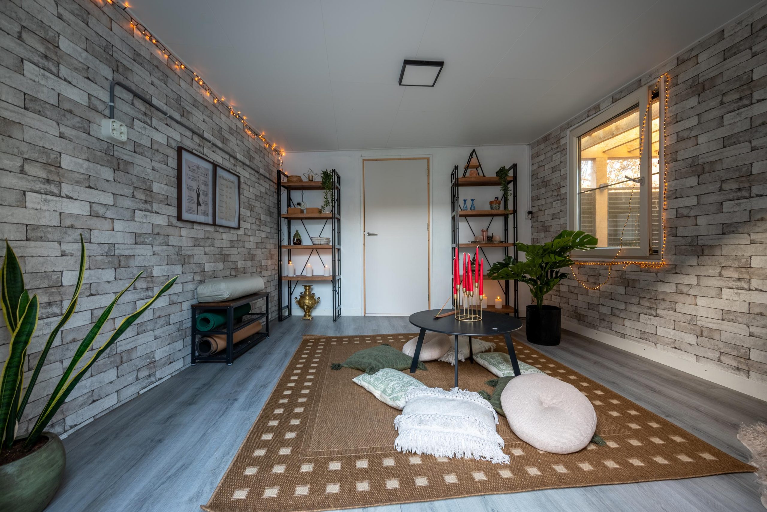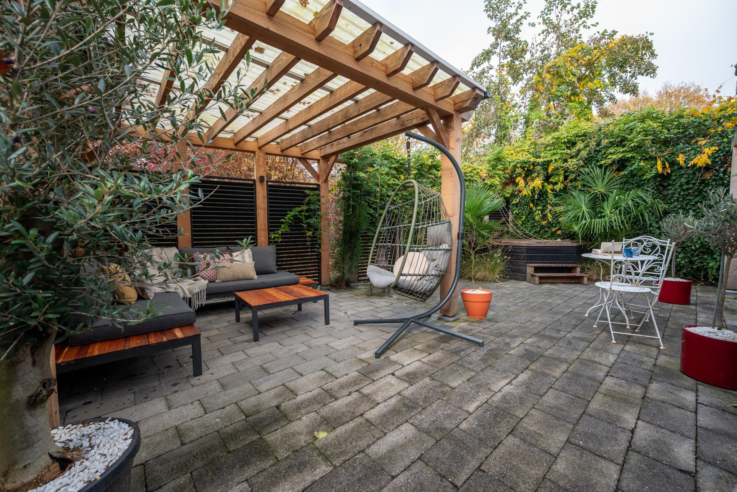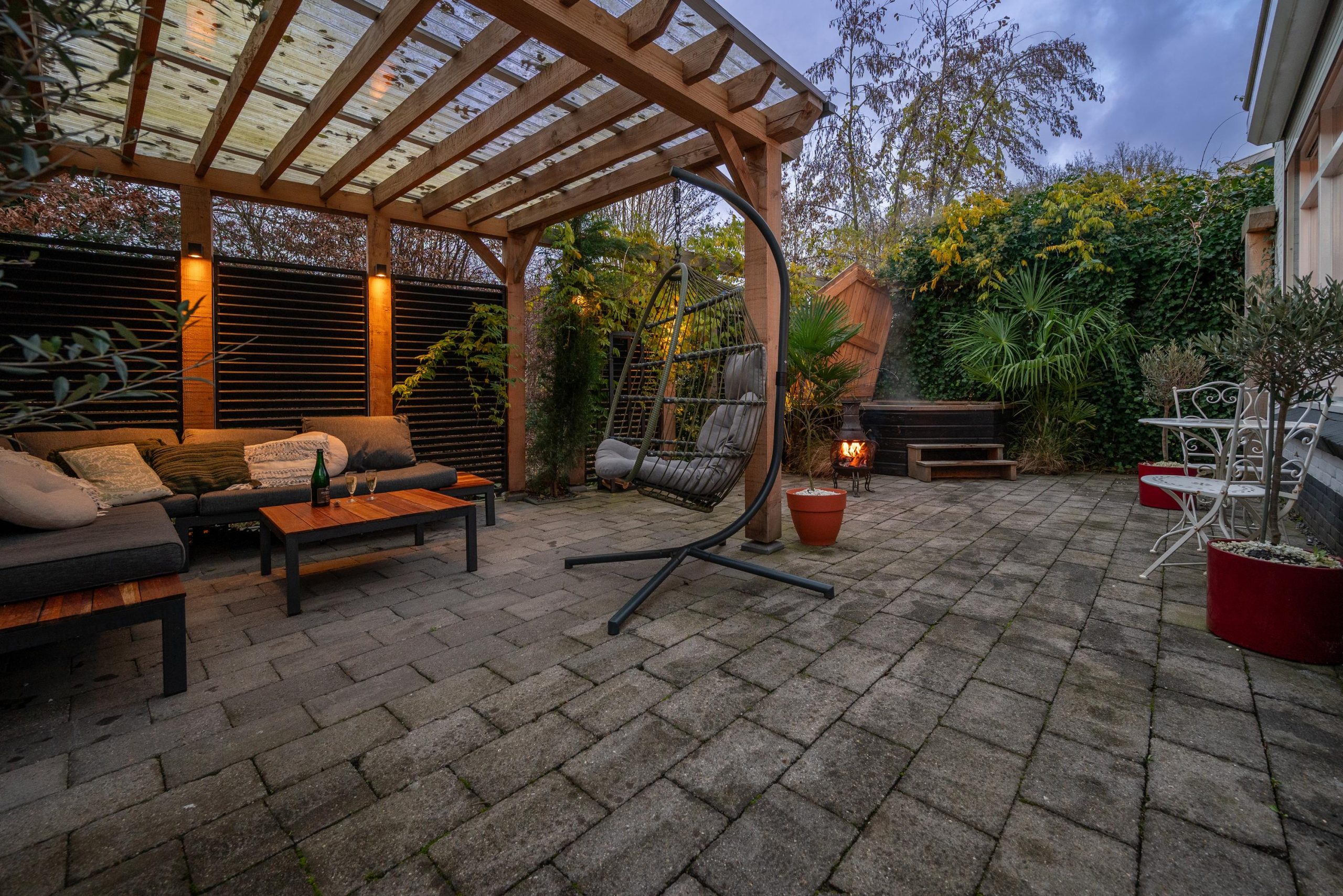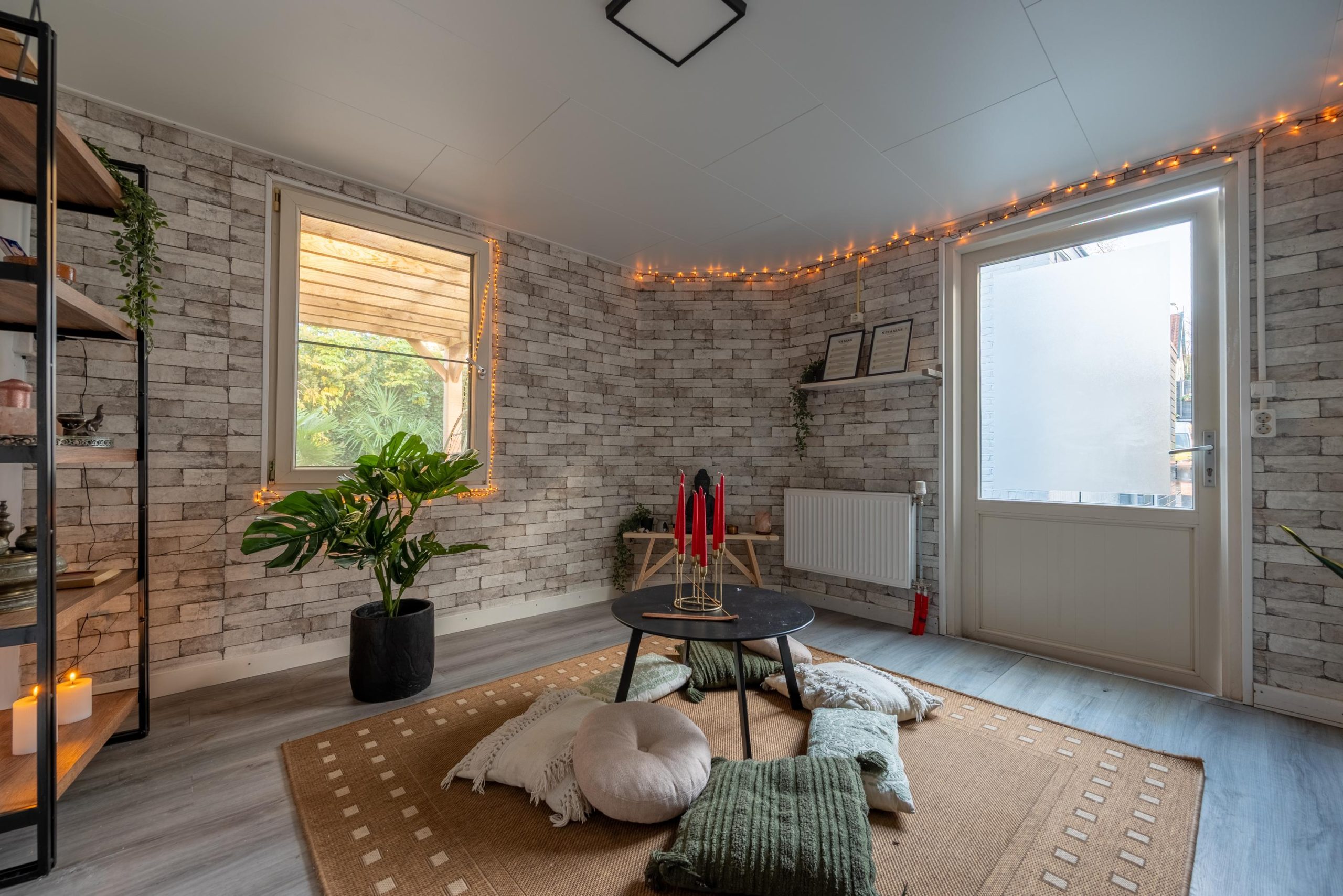De achtertuin is een fijne plek om te ontspannen, met een overkapping en een comfortabel loungegedeelte waar je lang buiten kunt zitten. Het slootje achter de tuin zorgt voor een extra rustig, groen gevoel. In de tuin staat bovendien een bijzonder bijgebouw dat is ingericht als meditatieruimte: een heerlijke plek om even terug te trekken. Naast de woning bevindt zich een ruime garage met elektrische deur, ideaal voor auto, fietsen en opslag. Ook aan de voorzijde is het karakter direct zichtbaar: de witte gevel met mansardedak en de voordeur met glas-in-lood geven een warm welkom.