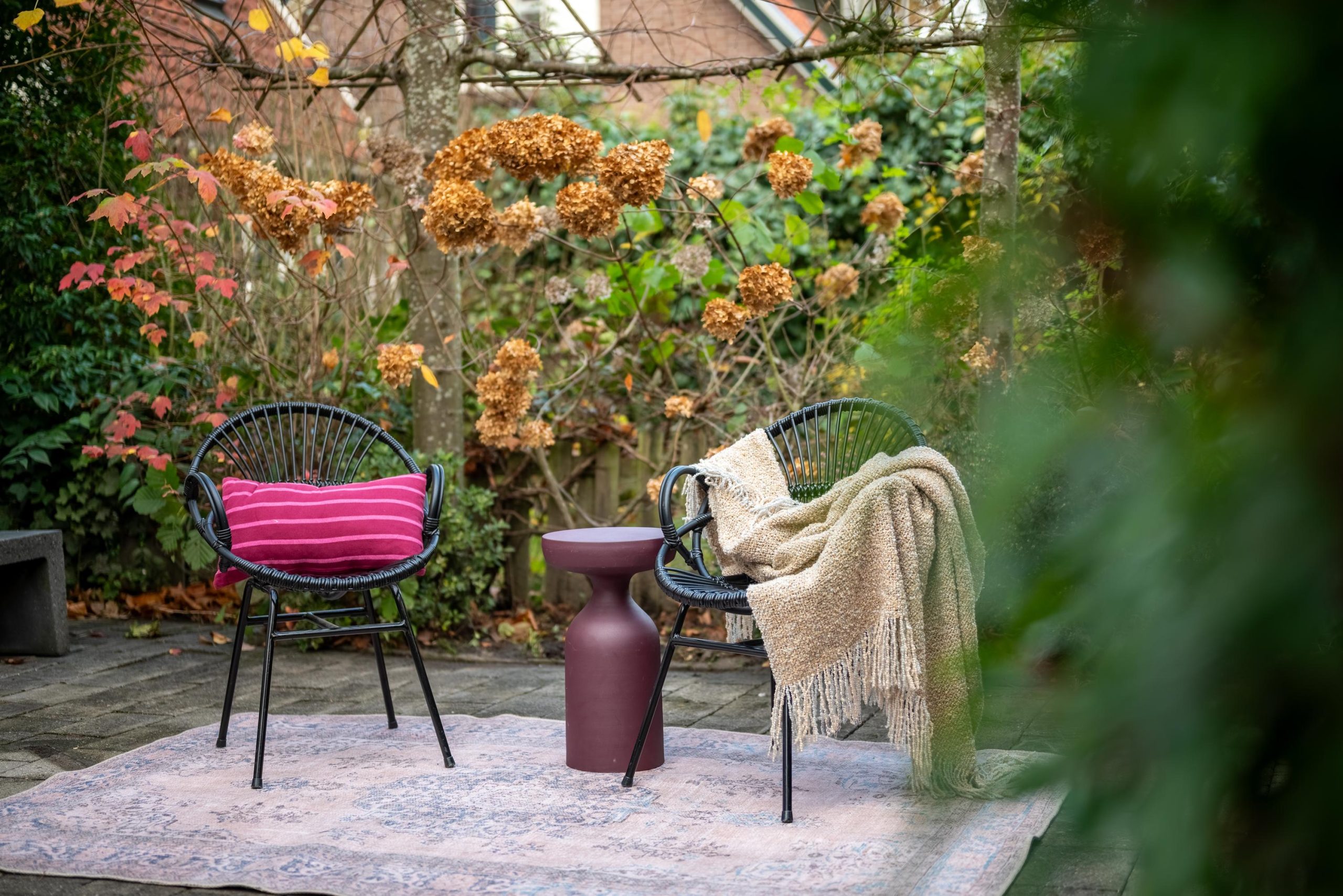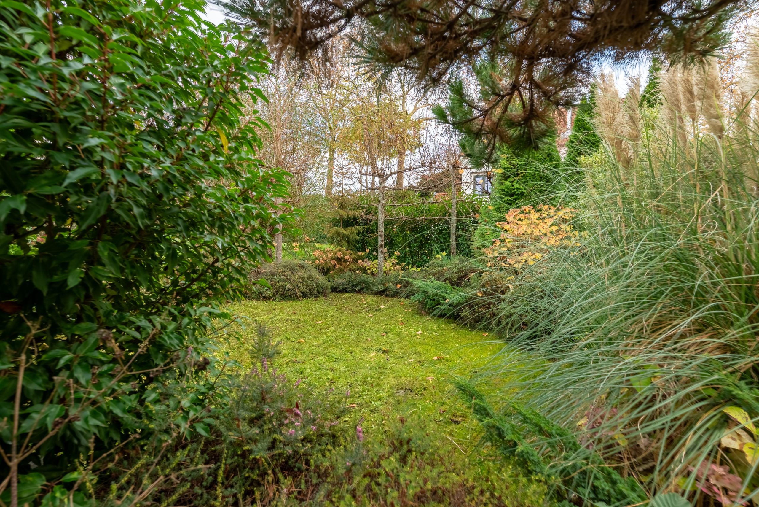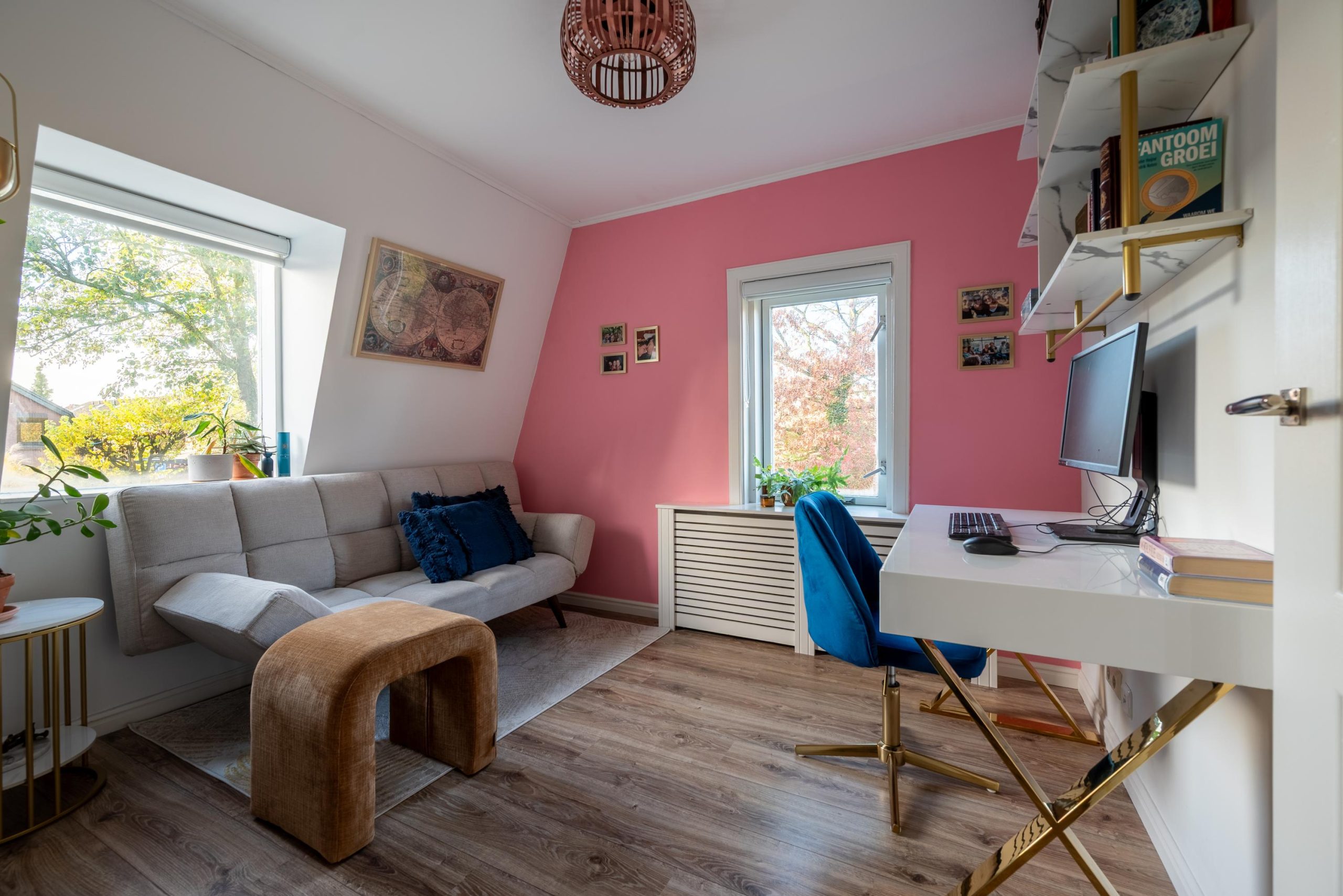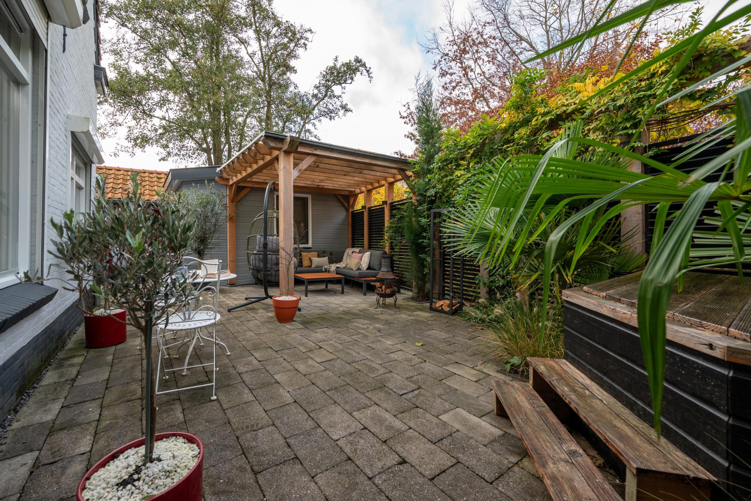De achtertuin is een fijne plek om te ontspannen, met een overkapping en een comfortabel loungegedeelte waar je lang buiten kunt zitten. Het slootje achter de tuin zorgt voor een extra rustig, groen gevoel. In de tuin staat bovendien een bijzonder bijgebouw dat is ingericht als meditatieruimte: een heerlijke plek om even terug te trekken. Naast de woning bevindt zich een ruime garage met elektrische deur, ideaal voor auto, fietsen en opslag. Ook aan de voorzijde is het karakter direct zichtbaar: de witte gevel met mansardedak en de voordeur met glas-in-lood geven een warm welkom.