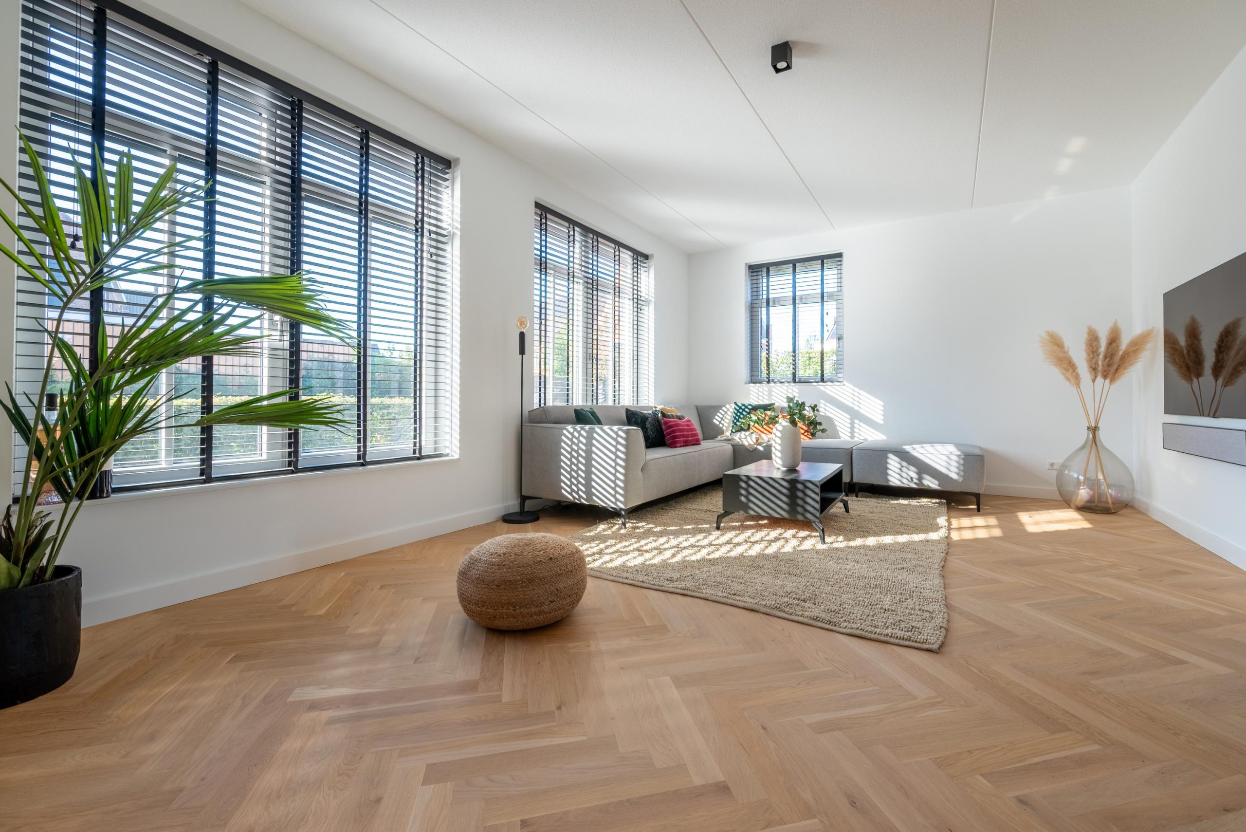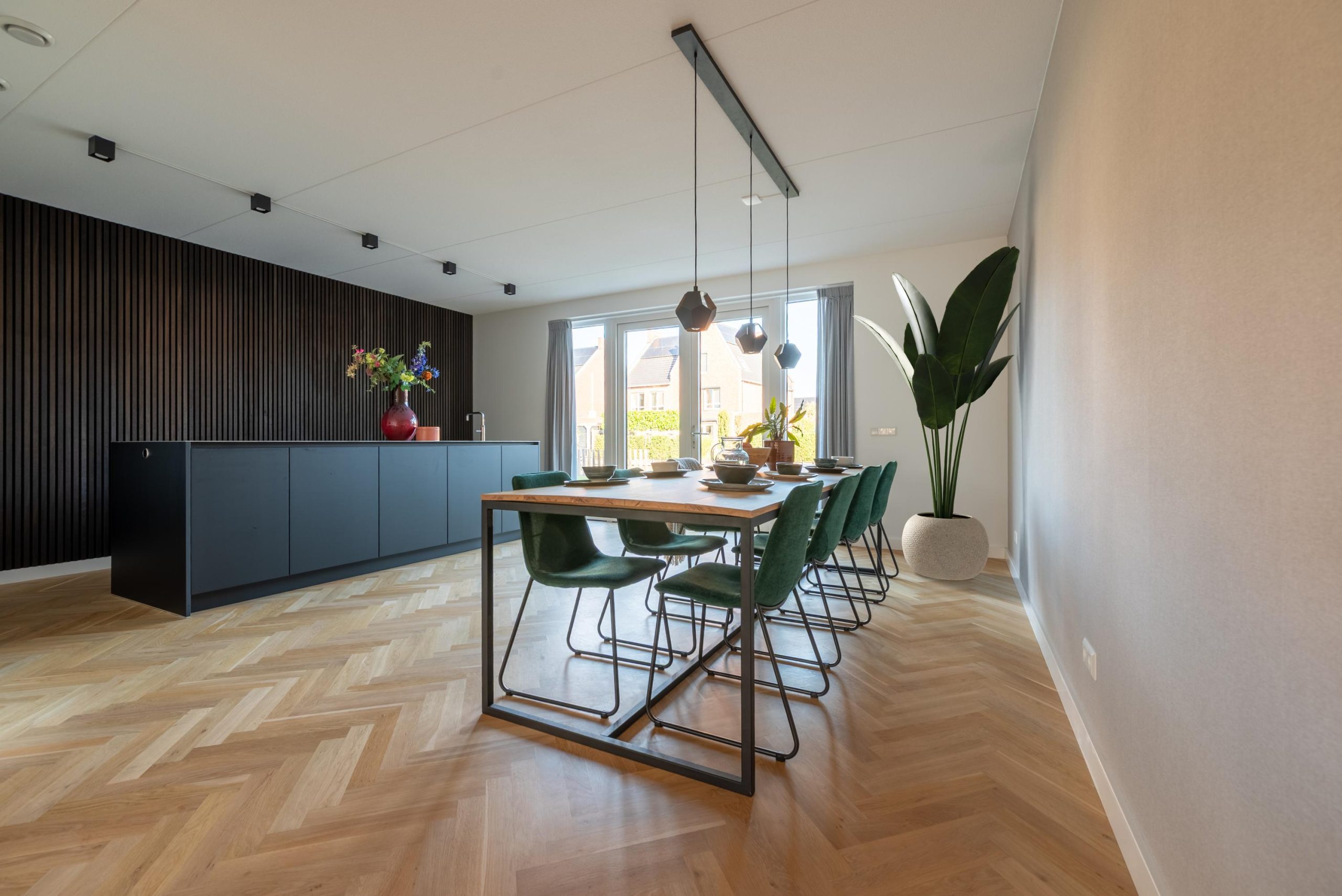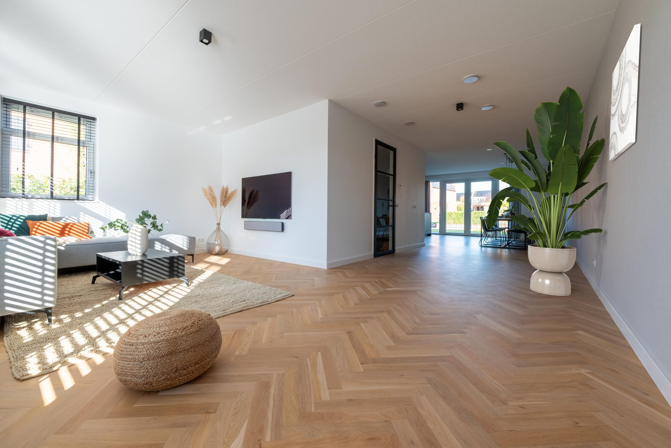 Binnen wacht een woonkamer die je meteen omarmt. Het zonnetje valt door de grote ramen naar binnen en geeft de ruimte een warme, uitnodigende sfeer. Er is volop plek voor een fijne zithoek waar je tot rust komt en voor een lange tafel waar het gezin samenkomt of vrienden aanschuiven voor een gezellige avond.