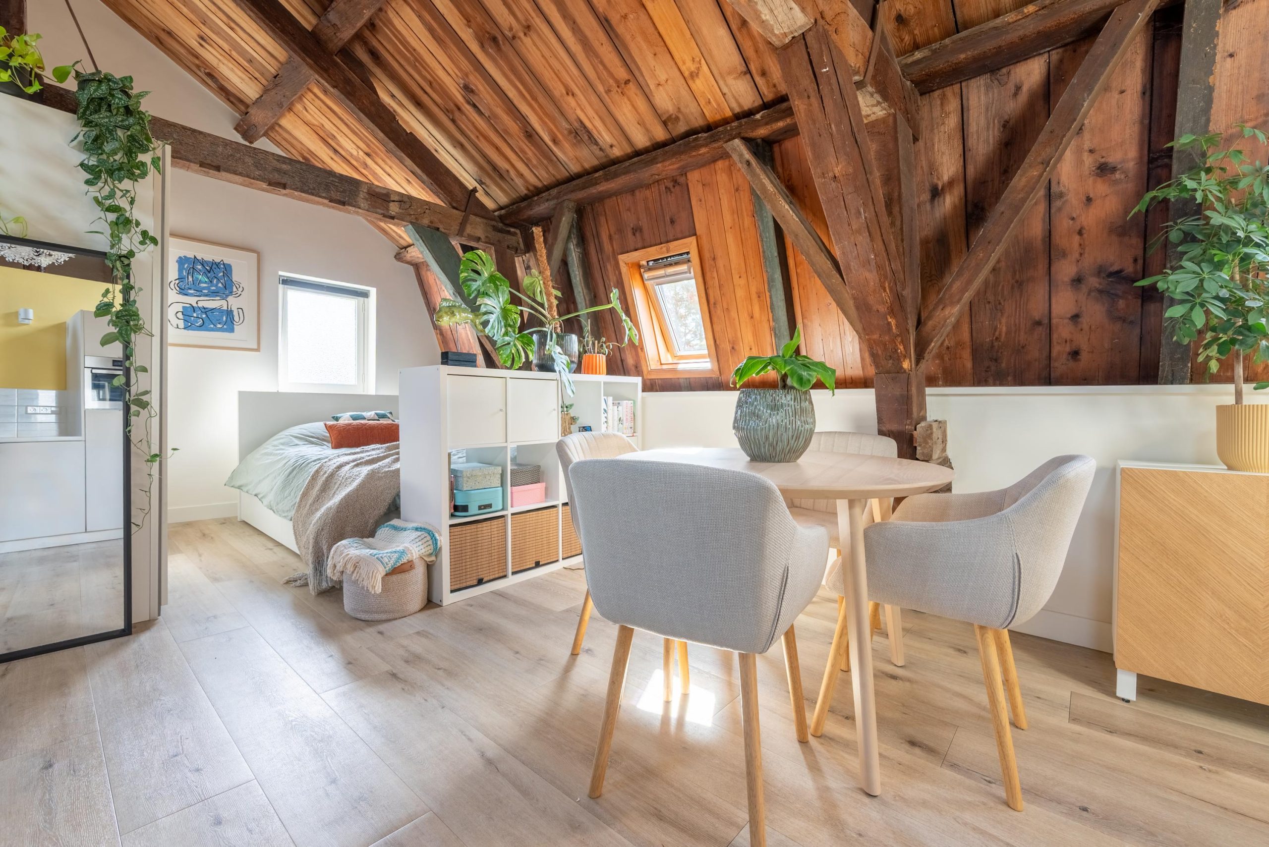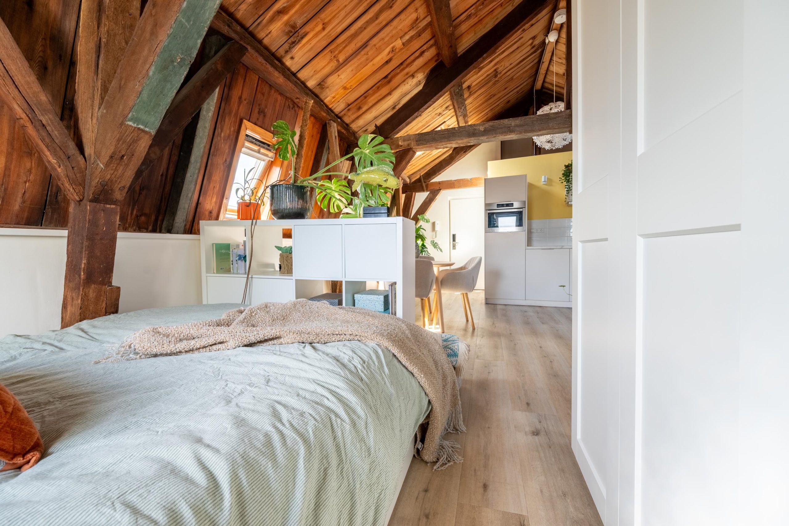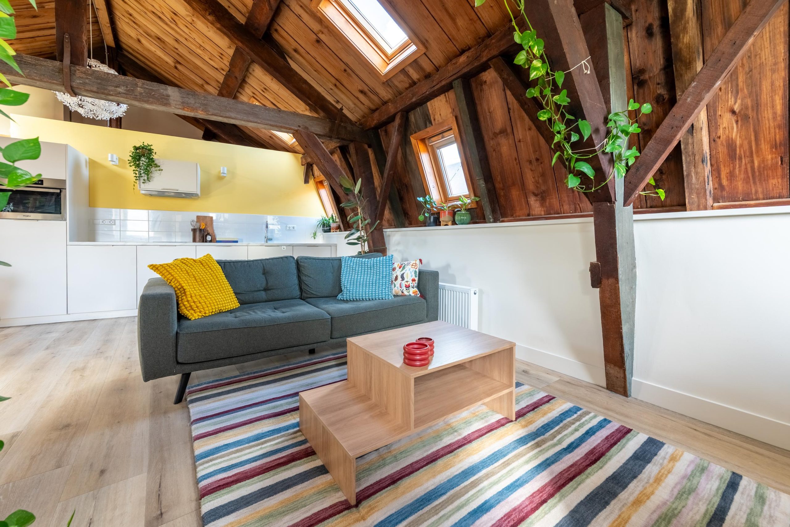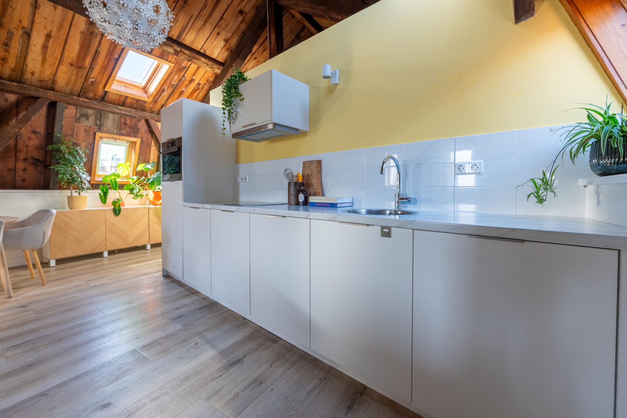 De hoge kap en zichtbare balken geven het appartement zijn unieke karakter, waarin licht en ruimte centraal staan. Je ploft neer in de knusse zithoek voor een ontspannen avond, of je bereidt een diner in de moderne keuken met zijn speelse accenten en complete inbouwapparatuur. Alles loopt vloeiend in elkaar over, waardoor koken, samenzijn en genieten vanzelfsprekend samenkomen. Trek je je liever terug? Dan biedt de beschut opgestelde slaapruimte een intieme plek, met dakramen die ’s ochtends het daglicht binnenlaten voor een frisse start van de dag. Ook de badkamer sluit hierbij aan: modern afgewerkt, met een fijne douche en praktisch ingedeelde voorzieningen.