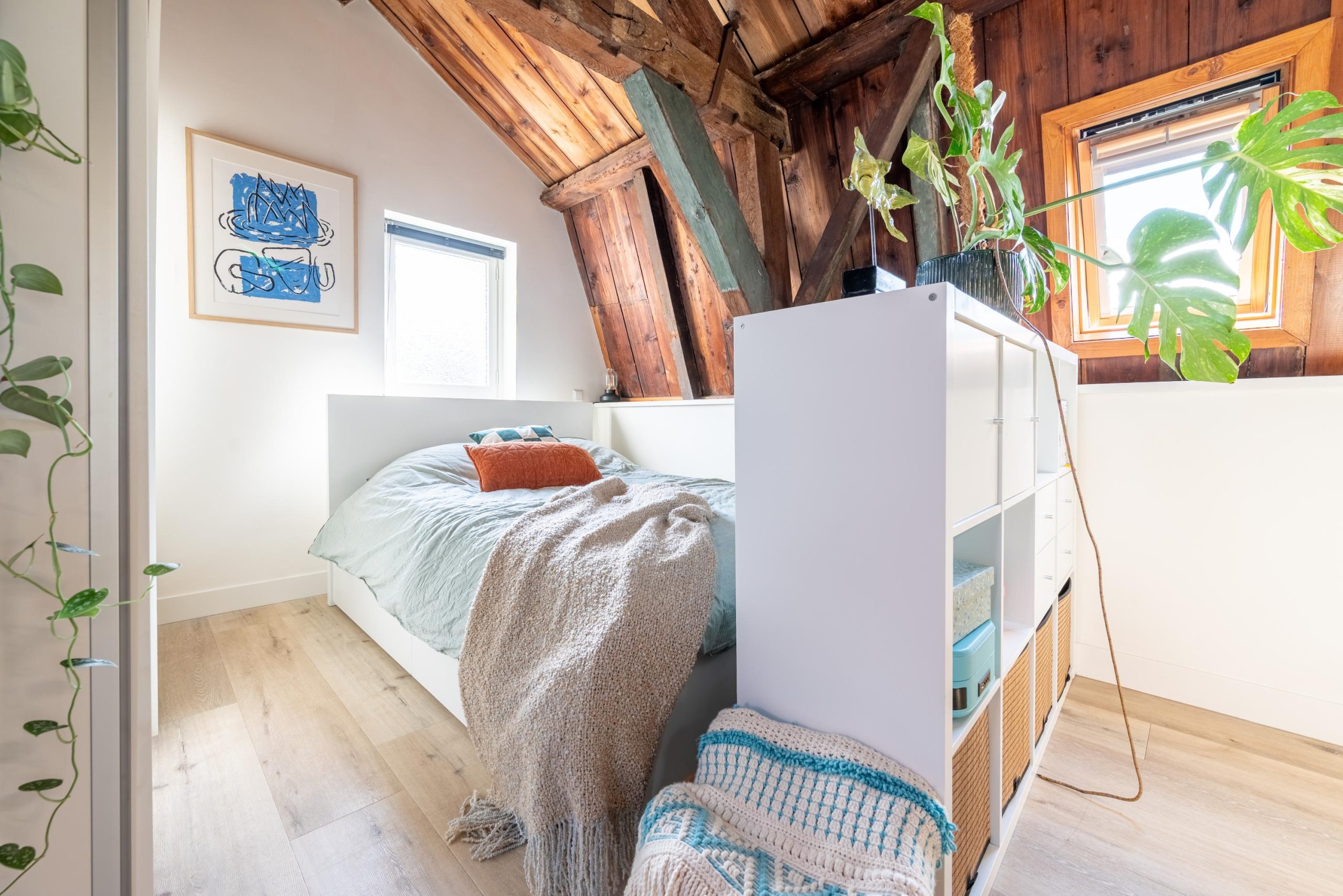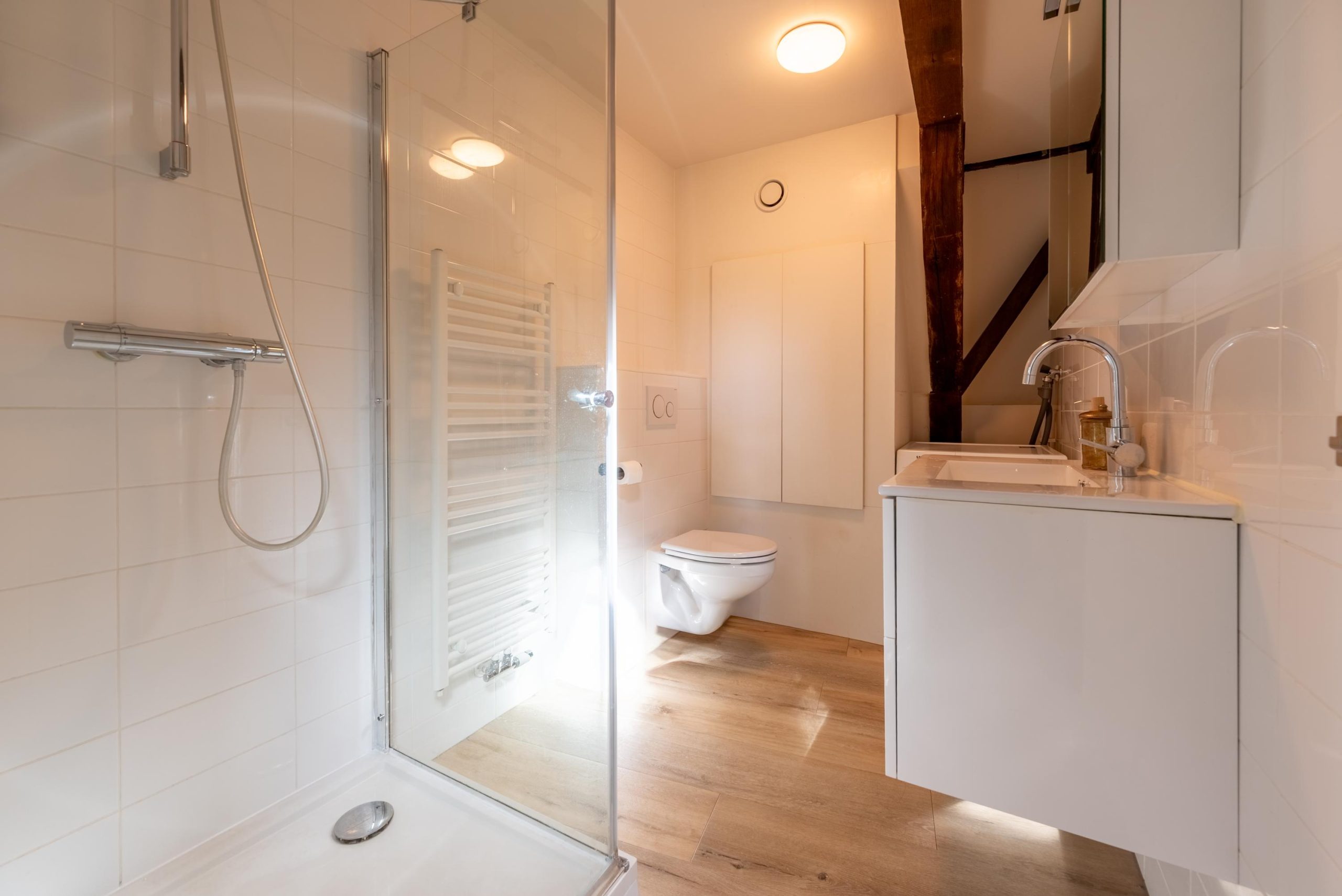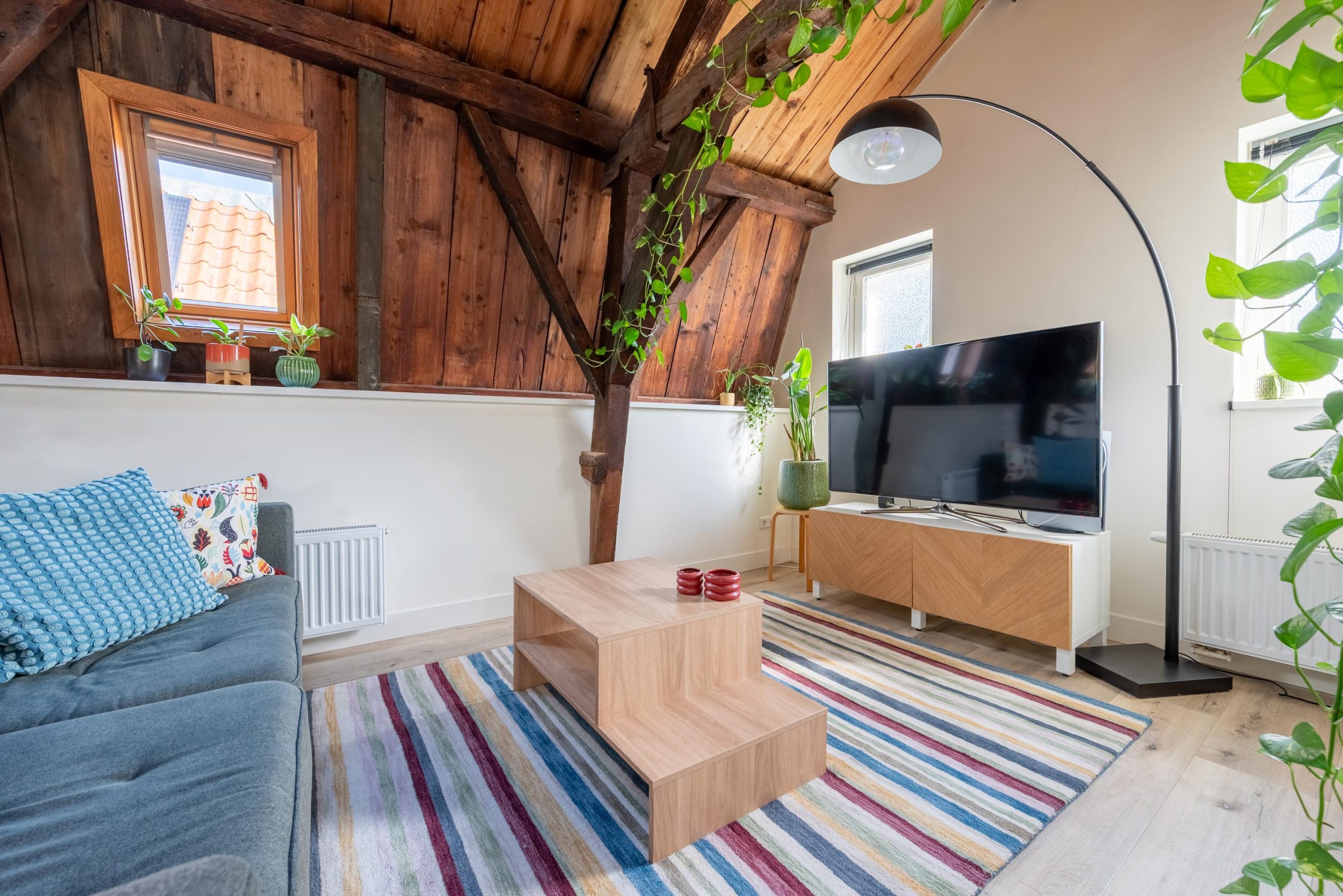 De hoge kap en zichtbare balken geven het appartement zijn unieke karakter, waarin licht en ruimte centraal staan. Je ploft neer in de knusse zithoek voor een ontspannen avond, of je bereidt een diner in de moderne keuken met zijn speelse accenten en complete inbouwapparatuur. Alles loopt vloeiend in elkaar over, waardoor koken, samenzijn en genieten vanzelfsprekend samenkomen. Trek je je liever terug? Dan biedt de beschut opgestelde slaapruimte een intieme plek, met dakramen die ’s ochtends het daglicht binnenlaten voor een frisse start van de dag. Ook de badkamer sluit hierbij aan: modern afgewerkt, met een fijne douche en praktisch ingedeelde voorzieningen.