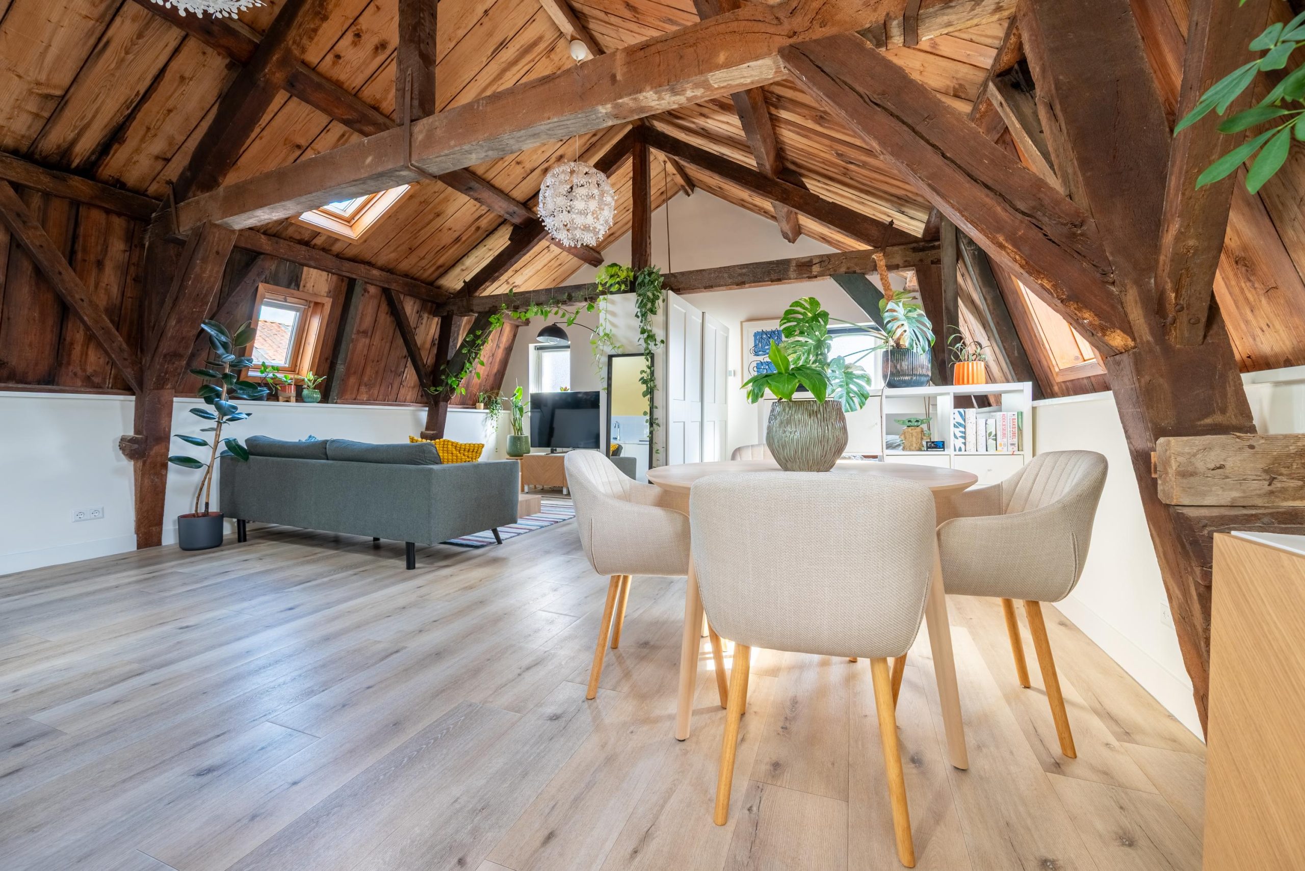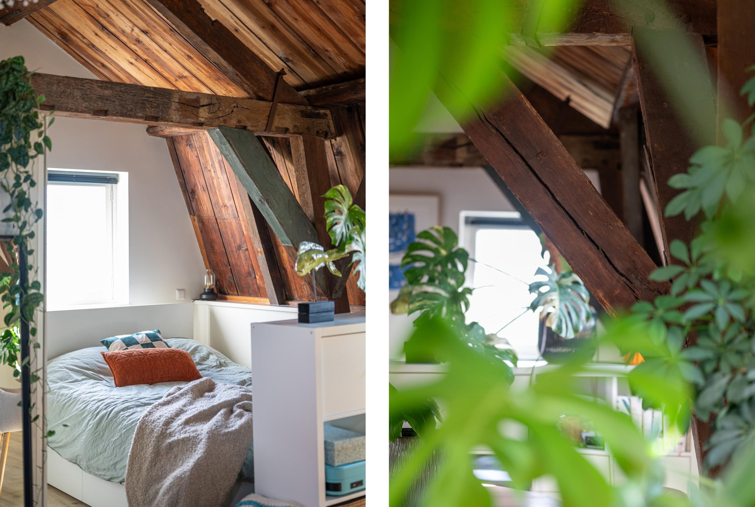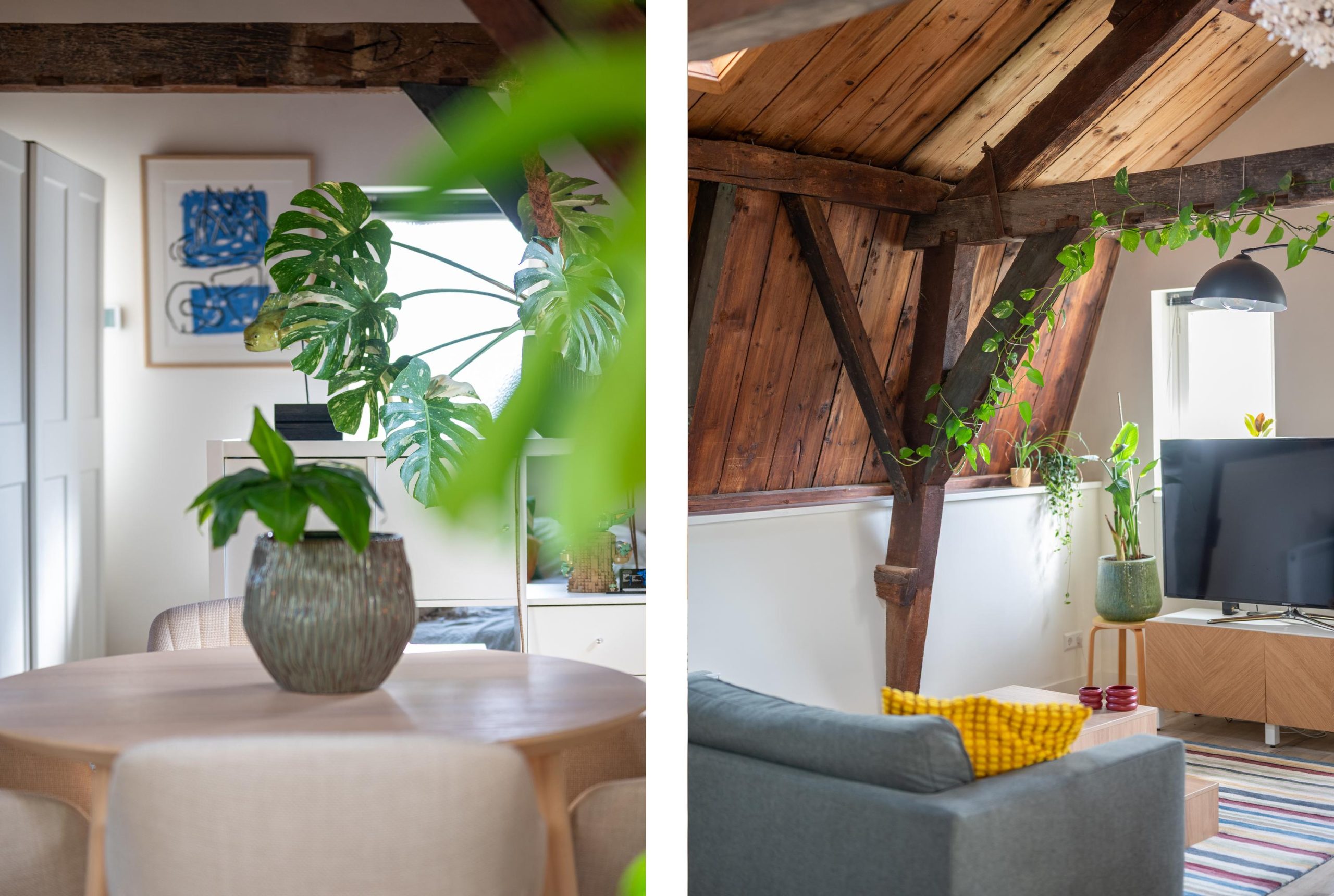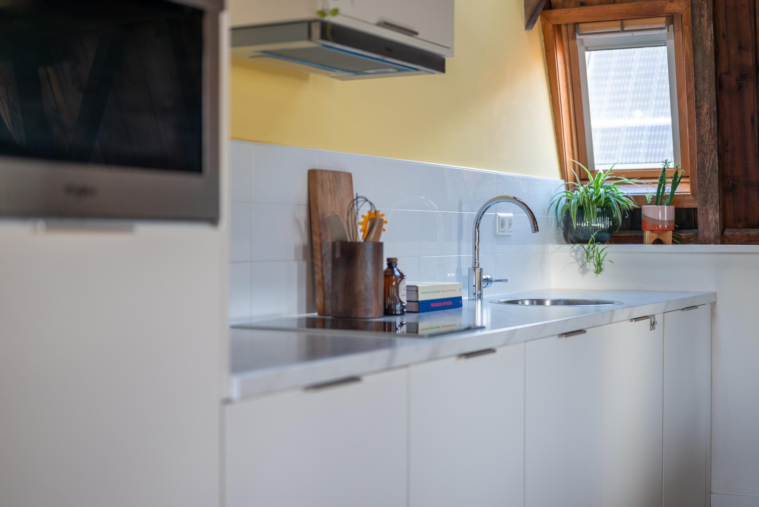 De hoge kap en zichtbare balken geven het appartement zijn unieke karakter, waarin licht en ruimte centraal staan. Je ploft neer in de knusse zithoek voor een ontspannen avond, of je bereidt een diner in de moderne keuken met zijn speelse accenten en complete inbouwapparatuur. Alles loopt vloeiend in elkaar over, waardoor koken, samenzijn en genieten vanzelfsprekend samenkomen. Trek je je liever terug? Dan biedt de beschut opgestelde slaapruimte een intieme plek, met dakramen die ’s ochtends het daglicht binnenlaten voor een frisse start van de dag. Ook de badkamer sluit hierbij aan: modern afgewerkt, met een fijne douche en praktisch ingedeelde voorzieningen.