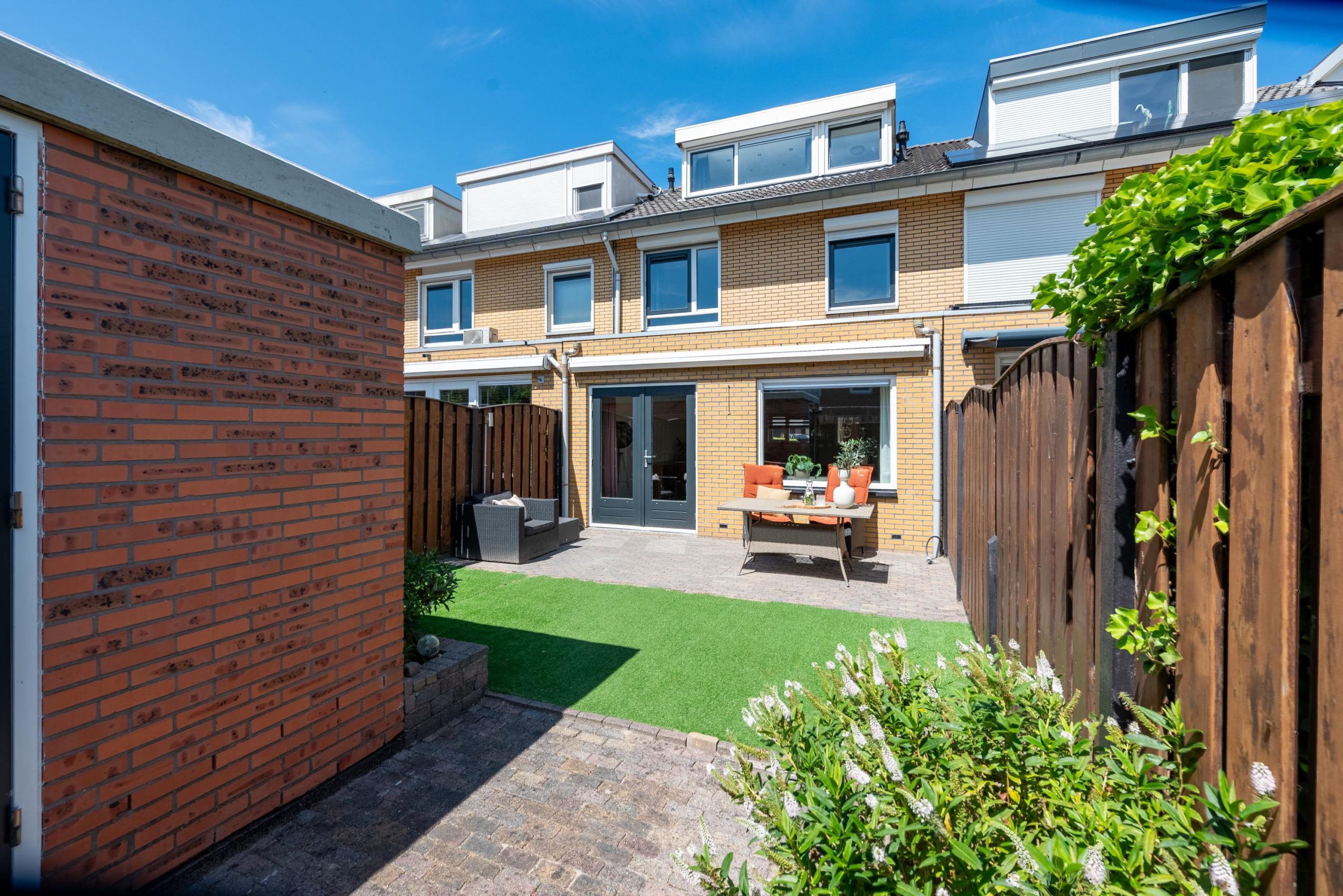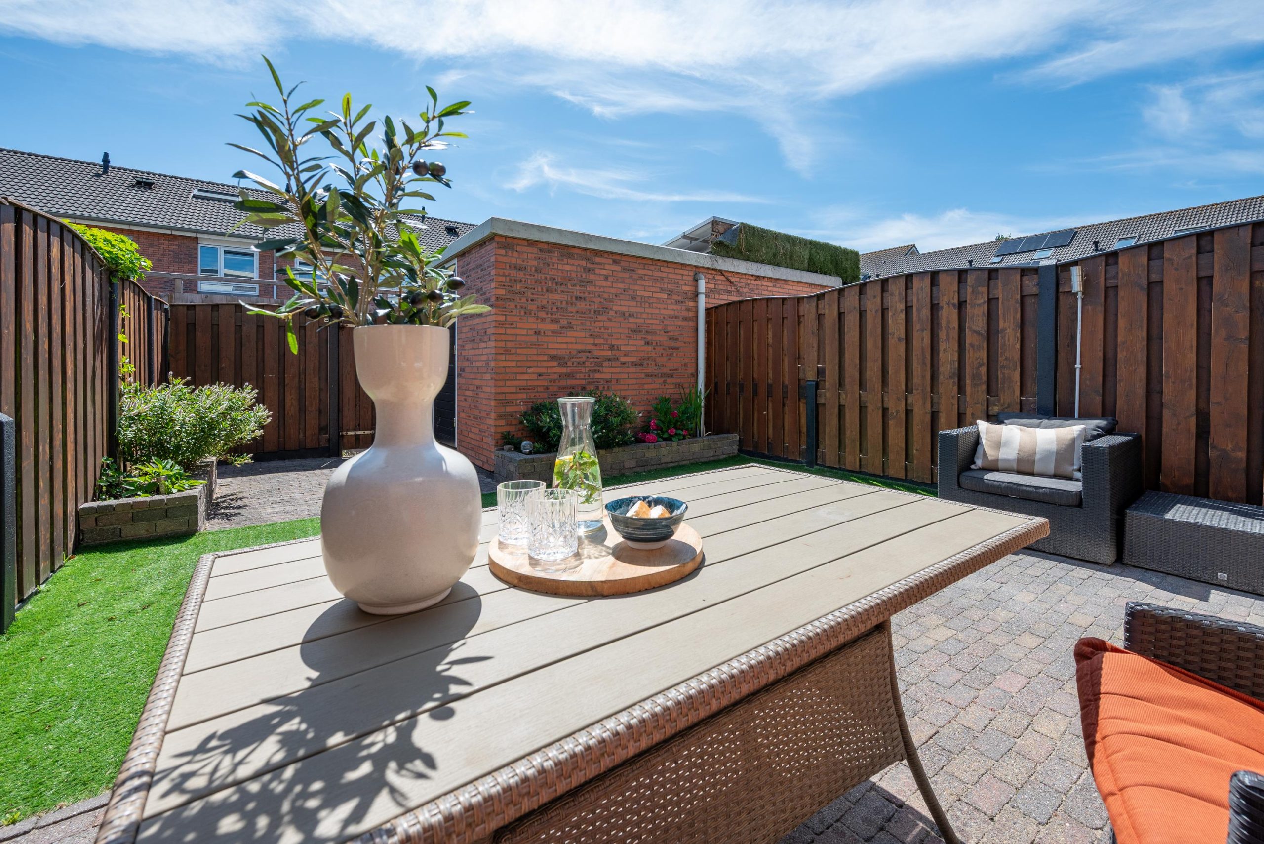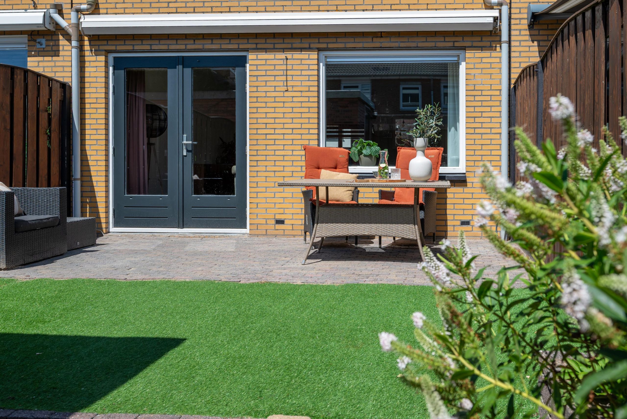 De tuin is gelegen op het zonnige zuiden, heerlijk onderhoudsvriendelijk dankzij kunstgras en voorzien van een berging en een elektrisch zonnescherm voor de warme dagen. Hier is leven geen gedoe, je kunt gewoon meteen lekker buiten zitten.