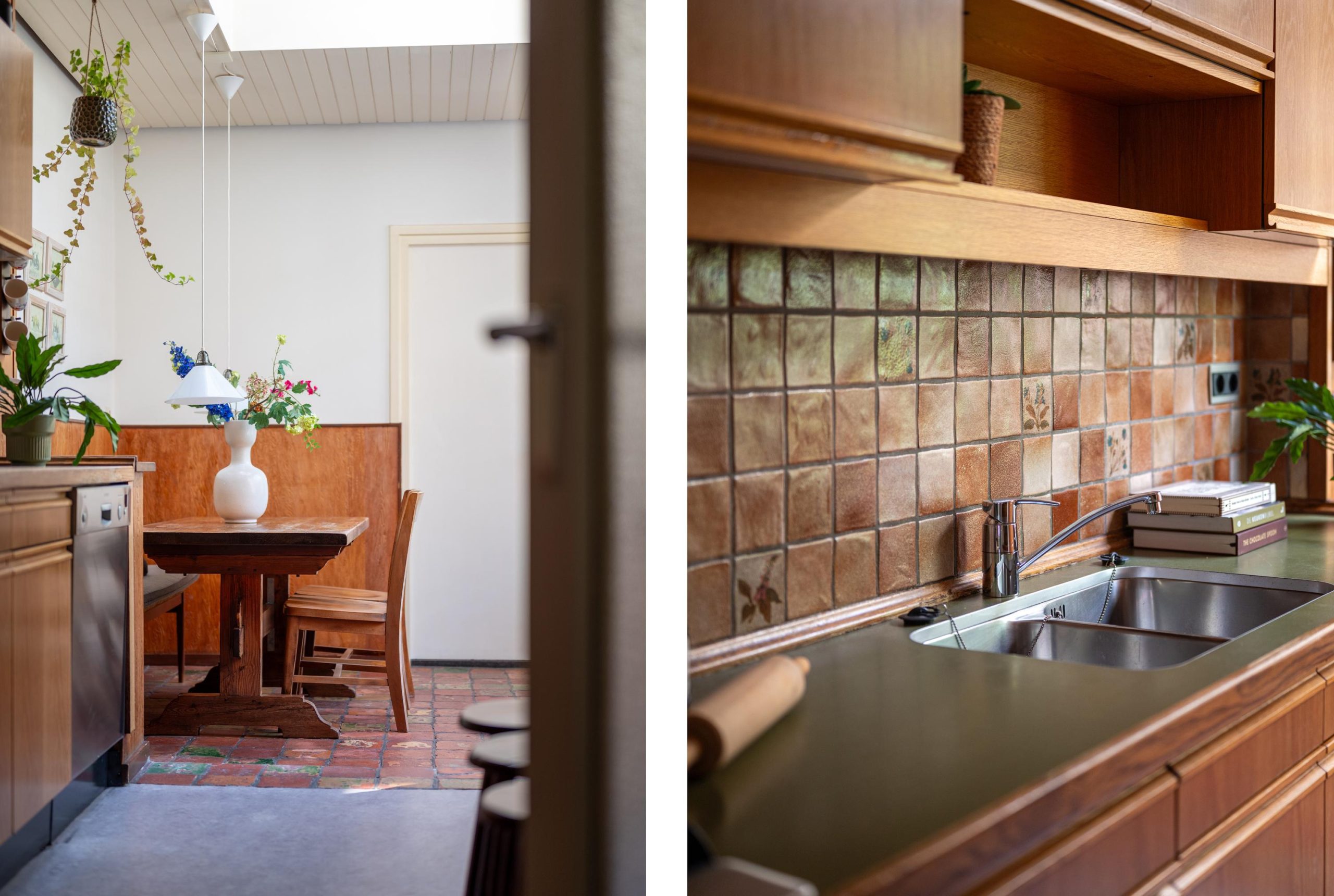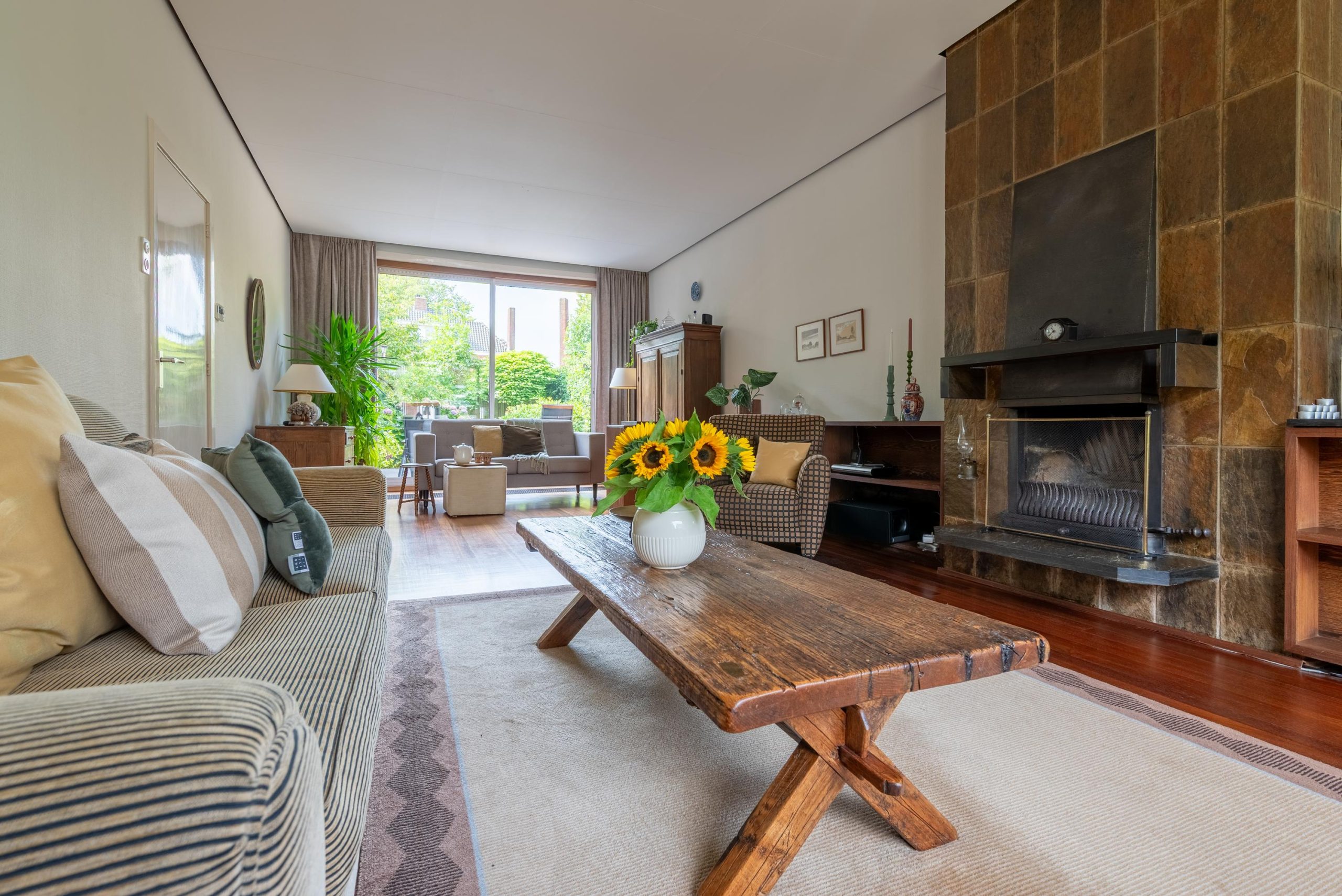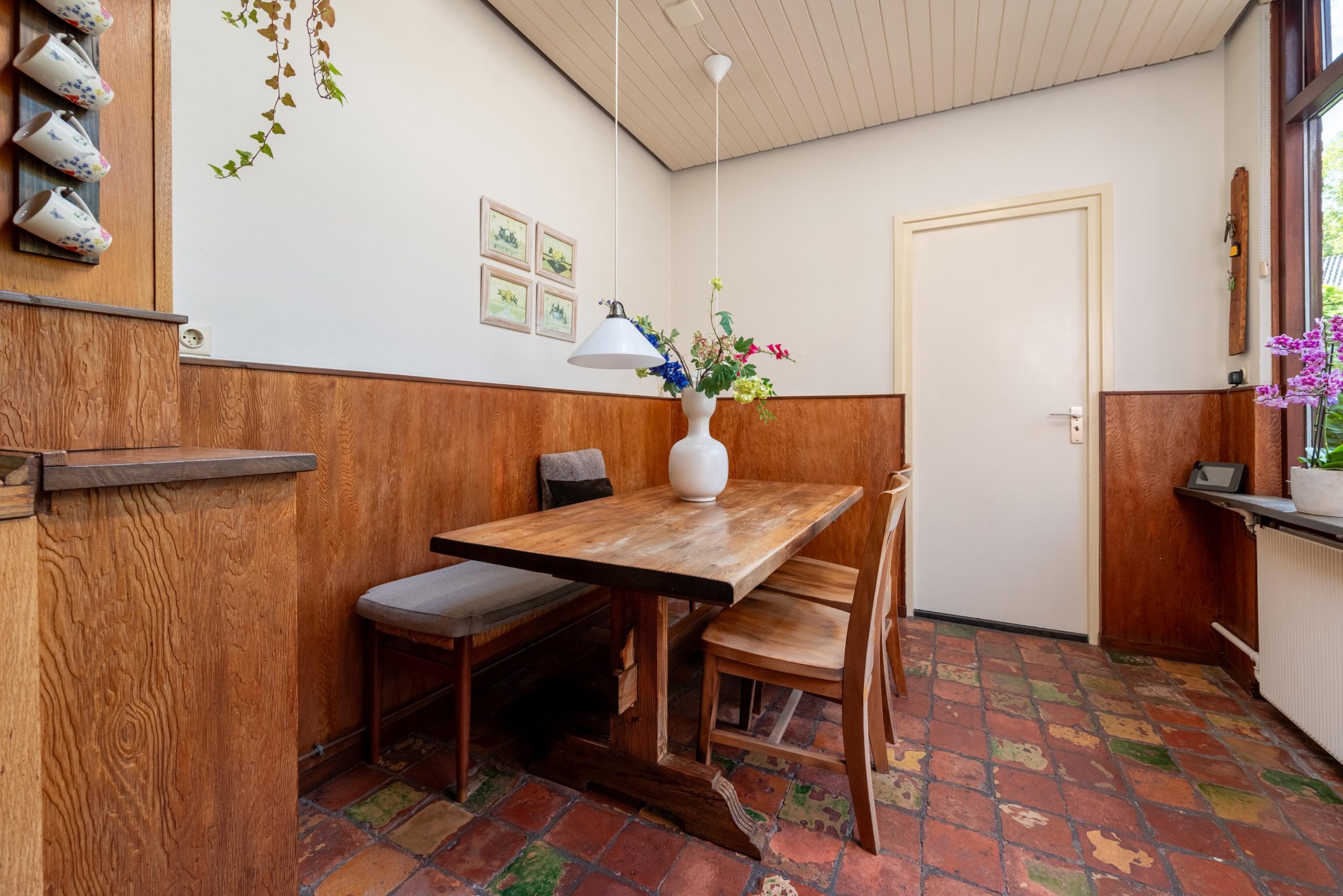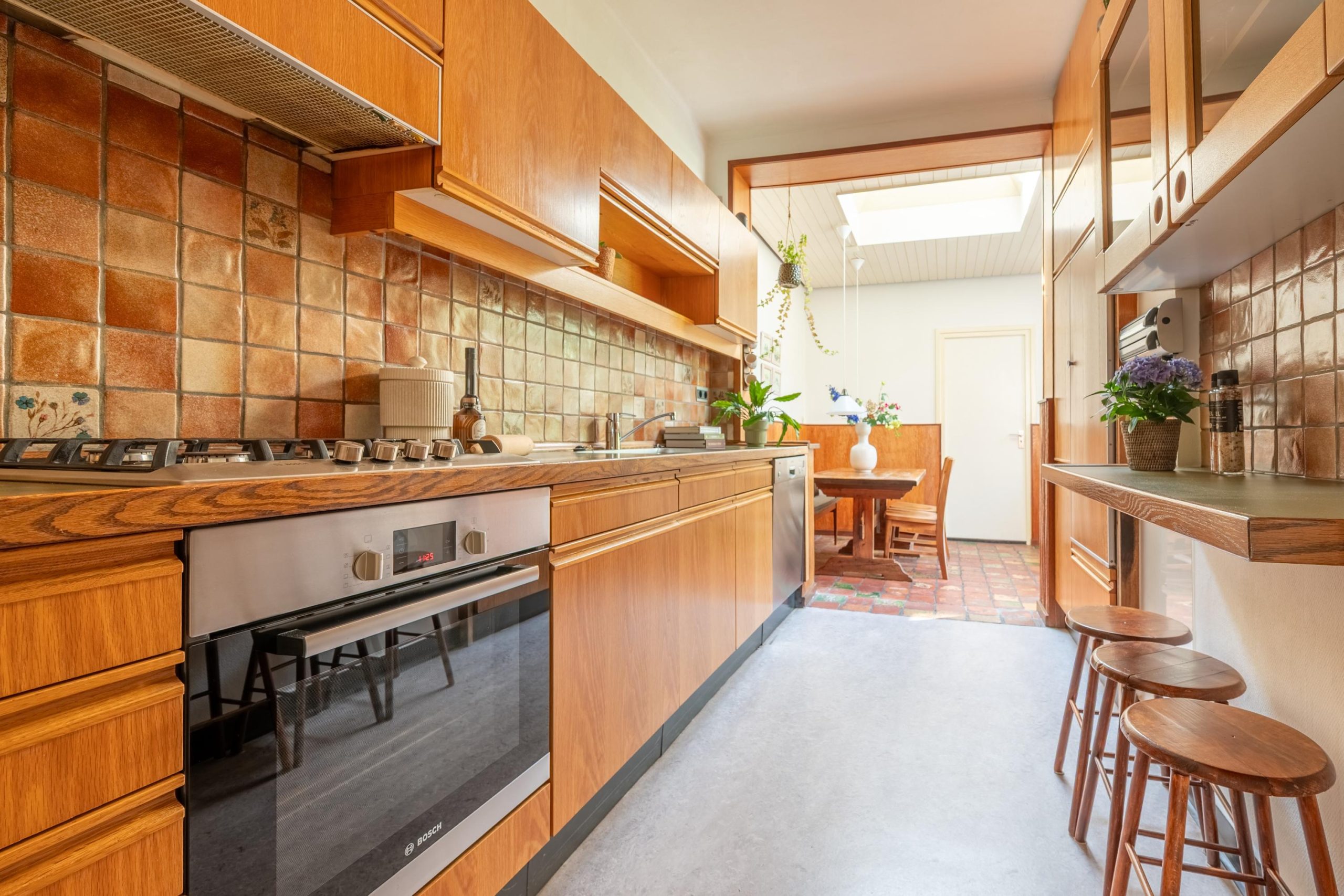 Binnen is het licht en ruim. In de woonkamer ligt een Basralocus houten vloer, zorgt de haard voor extra gezelligheid en trekt de grote schuifpui je op zonnige dagen zó de tuin in. De keuken heeft nog die heerlijke jaren ’70 knipoog met bruin-beige tegeltjes, maar is praktisch ingericht met een gaskookplaat, oven, koelkast met vriesvak en vaatwasser. In de aanbouw staat de eettafel: dé plek voor koffie, huiswerk, lange diners en “we blijven nog even zitten”. Extra leuk detail: onder de linoleumvloer ligt een granieten vloer die je, als je wilt, weer tevoorschijn kunt halen.