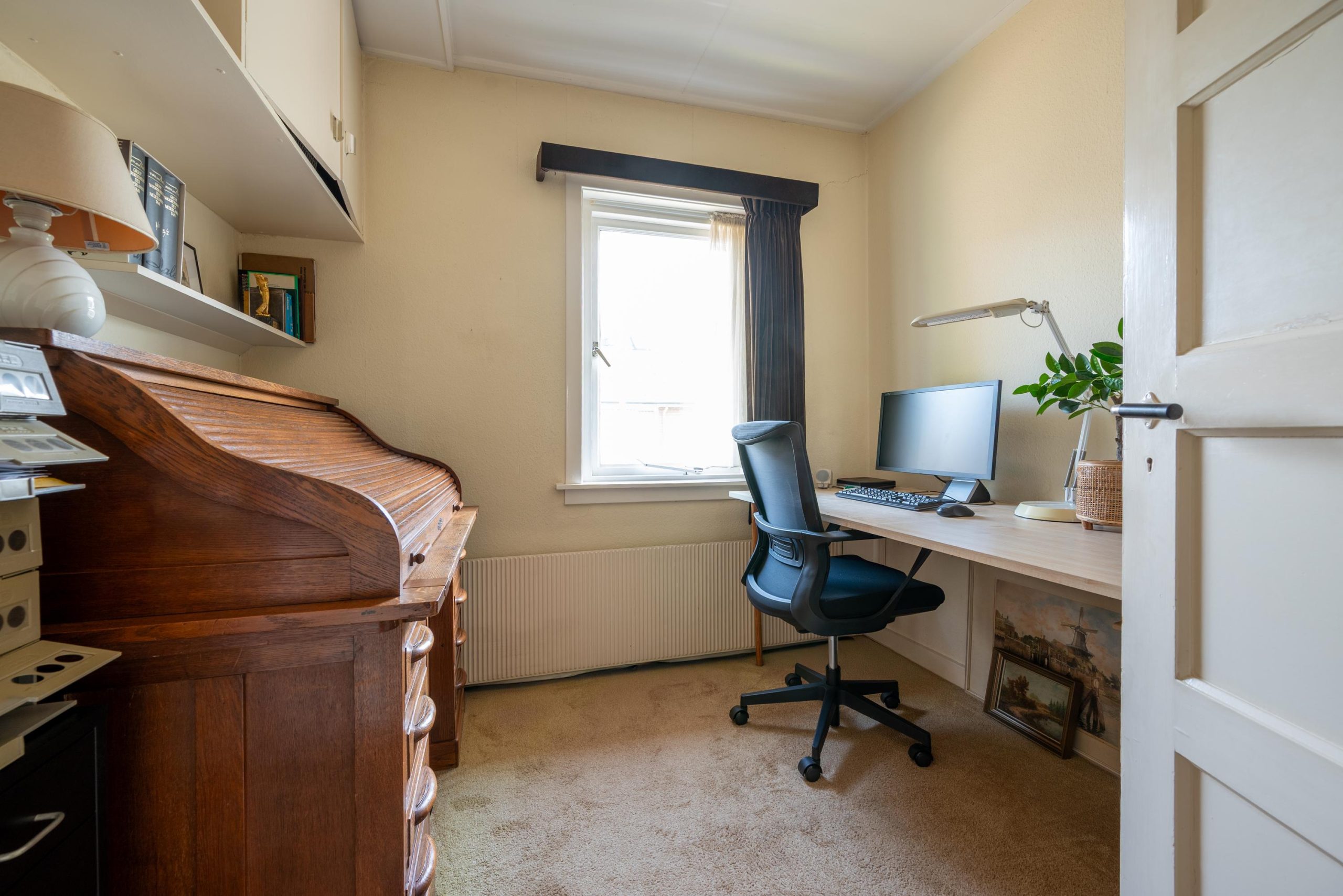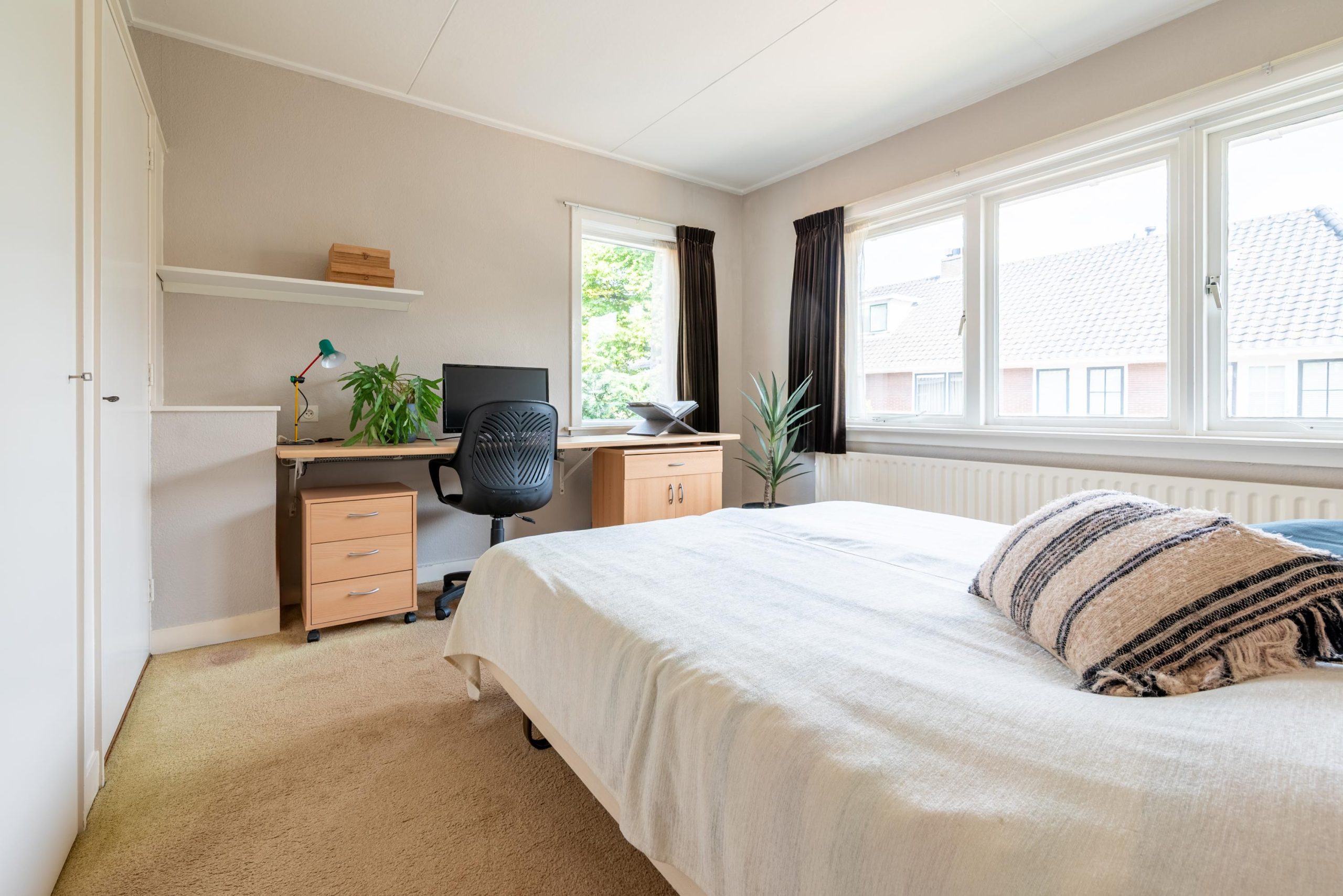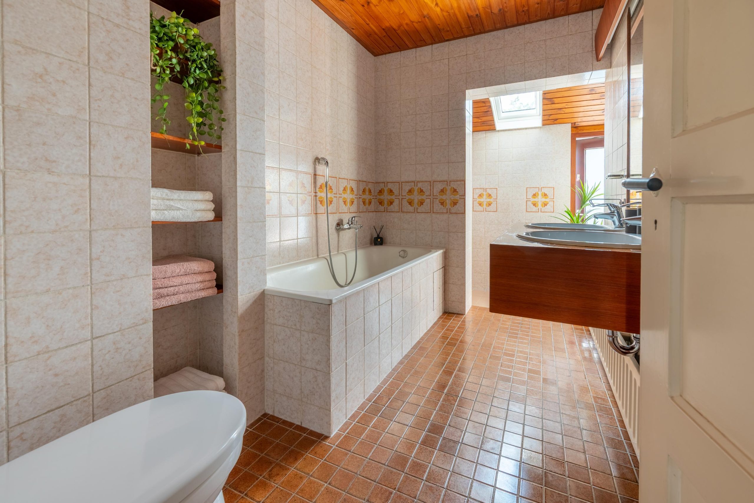 Boven zijn er vier slaapkamers verdeeld over twee verdiepingen. Op de eerste verdieping vind je drie kamers, waaronder de masterbedroom en een tweede slaapkamer met handige inbouwkasten, plus een werkkamer die net zo makkelijk een hobbyruimte kan worden. Op de tweede verdieping ligt nog een verrassend lichte vierde kamer met dakkapel. Een fijne plek voor bijvoorbeeld een kinderkamer, met daarnaast extra bergruimte achter de schotten. De badkamer is compleet en past zich moeiteloos aan jouw dag aan: ’s ochtends snel onder de ruime inloopdouche, of juist ’s avonds even ontspannen in bad. En net als de keuken heeft ook deze ruimte die eigenzinnige jaren ’70 sfeer.