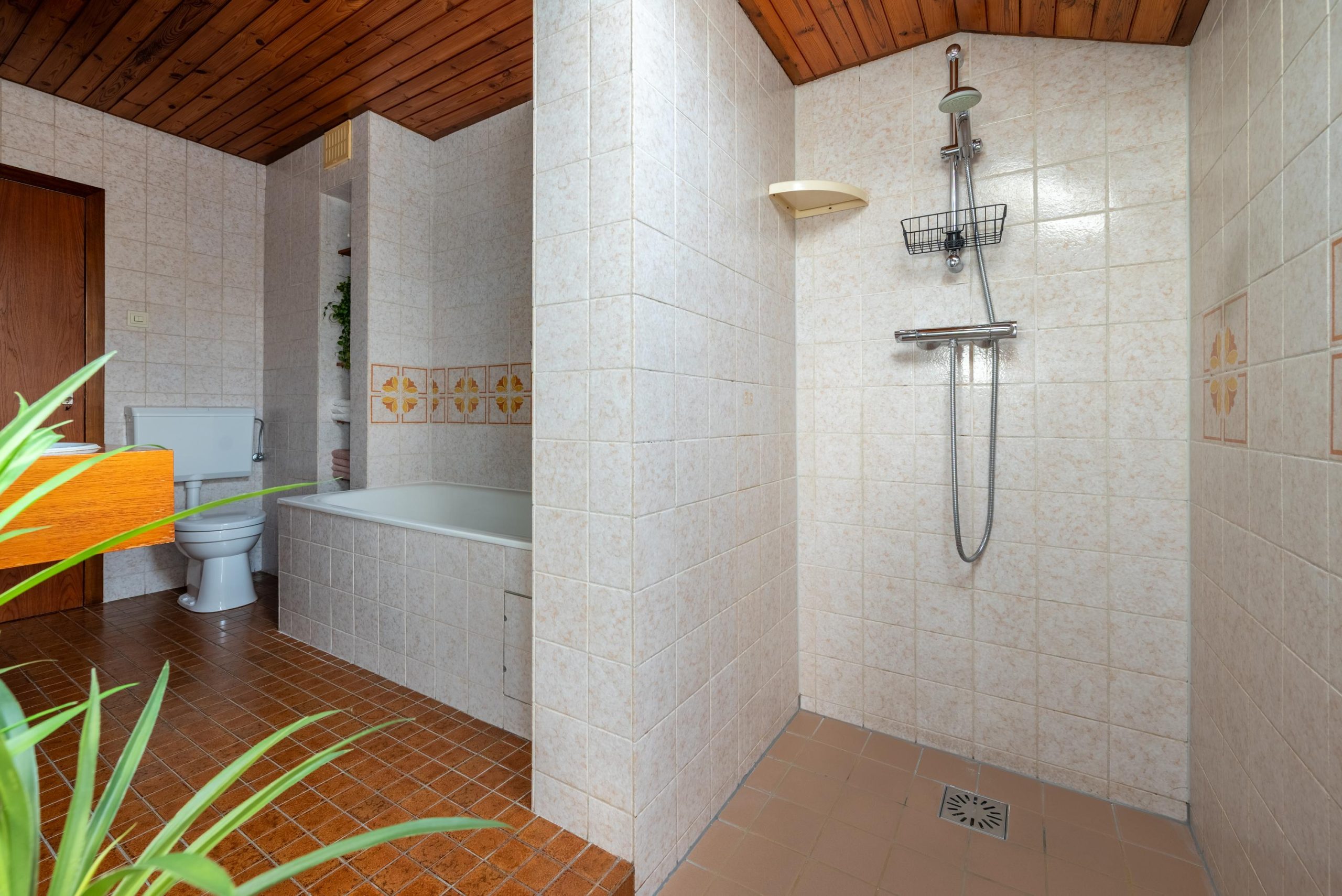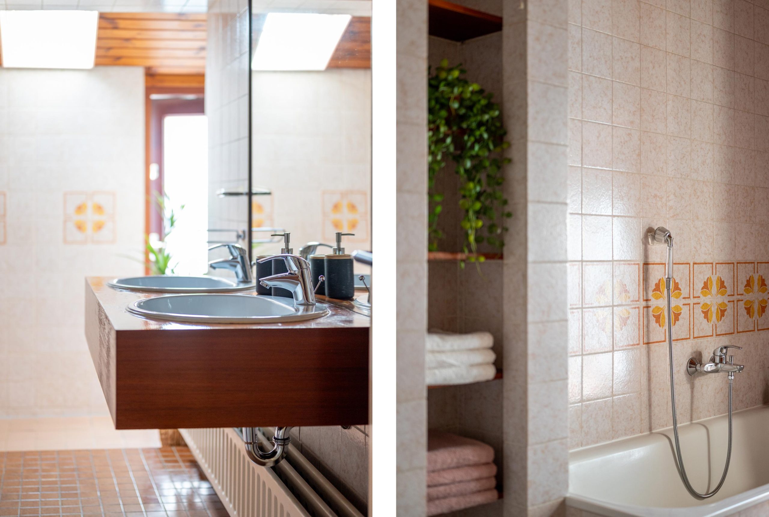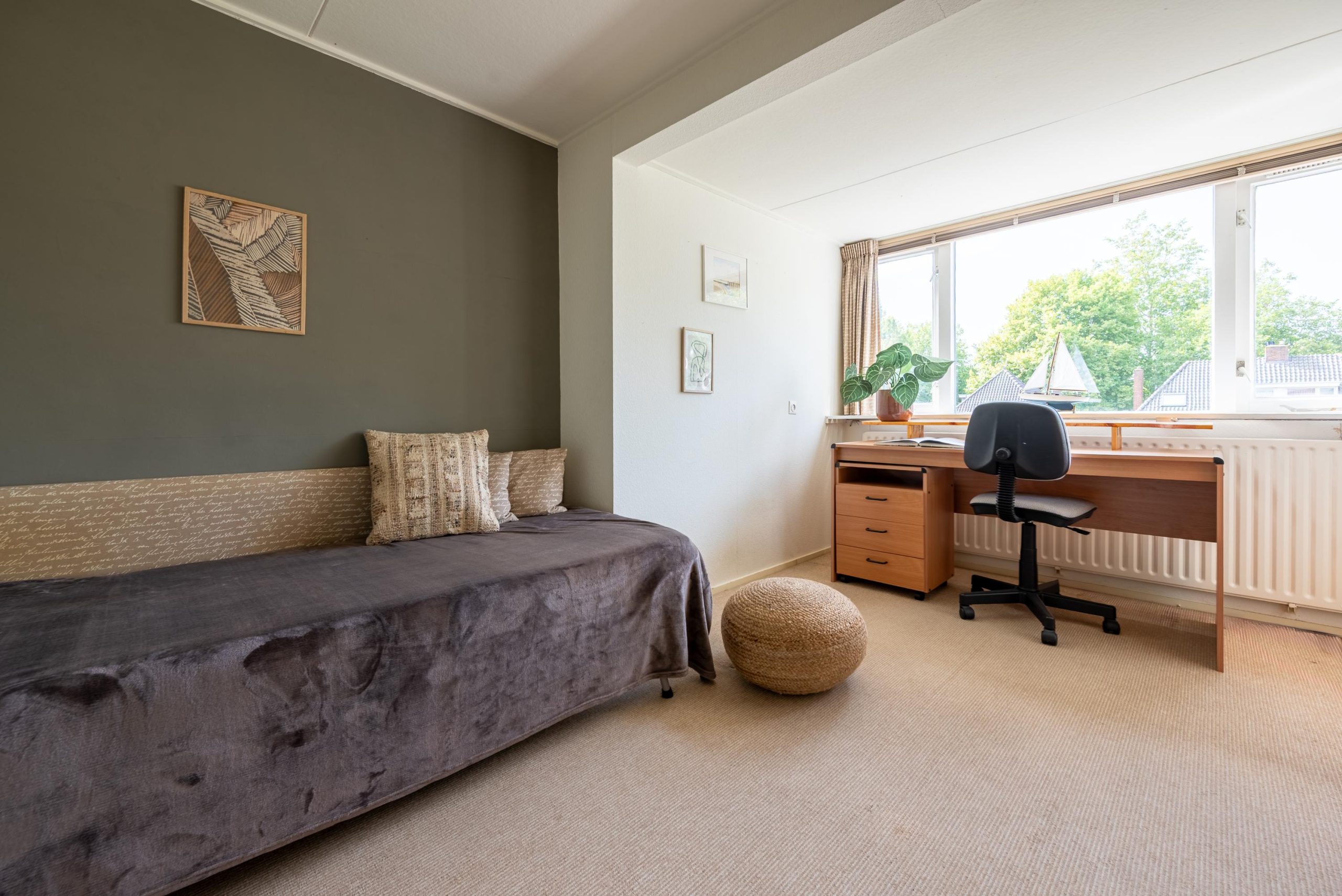 Boven zijn er vier slaapkamers verdeeld over twee verdiepingen. Op de eerste verdieping vind je drie kamers, waaronder de masterbedroom en een tweede slaapkamer met handige inbouwkasten, plus een werkkamer die net zo makkelijk een hobbyruimte kan worden. Op de tweede verdieping ligt nog een verrassend lichte vierde kamer met dakkapel. Een fijne plek voor bijvoorbeeld een kinderkamer, met daarnaast extra bergruimte achter de schotten. De badkamer is compleet en past zich moeiteloos aan jouw dag aan: ’s ochtends snel onder de ruime inloopdouche, of juist ’s avonds even ontspannen in bad. En net als de keuken heeft ook deze ruimte die eigenzinnige jaren ’70 sfeer.