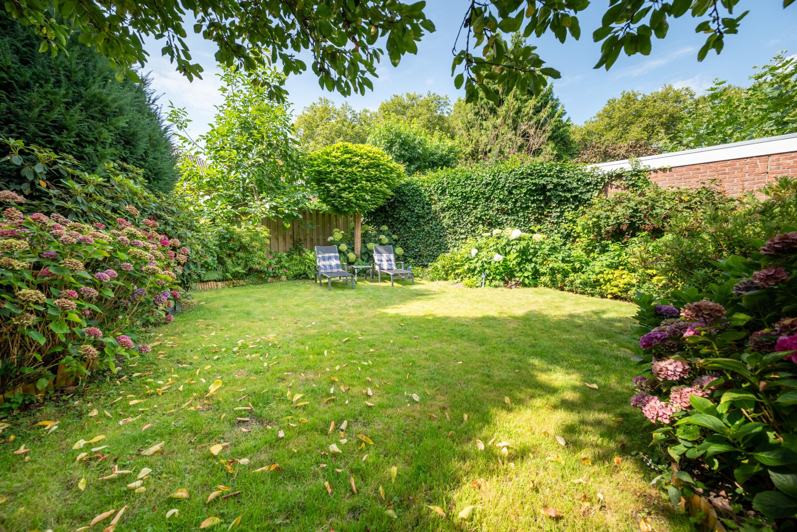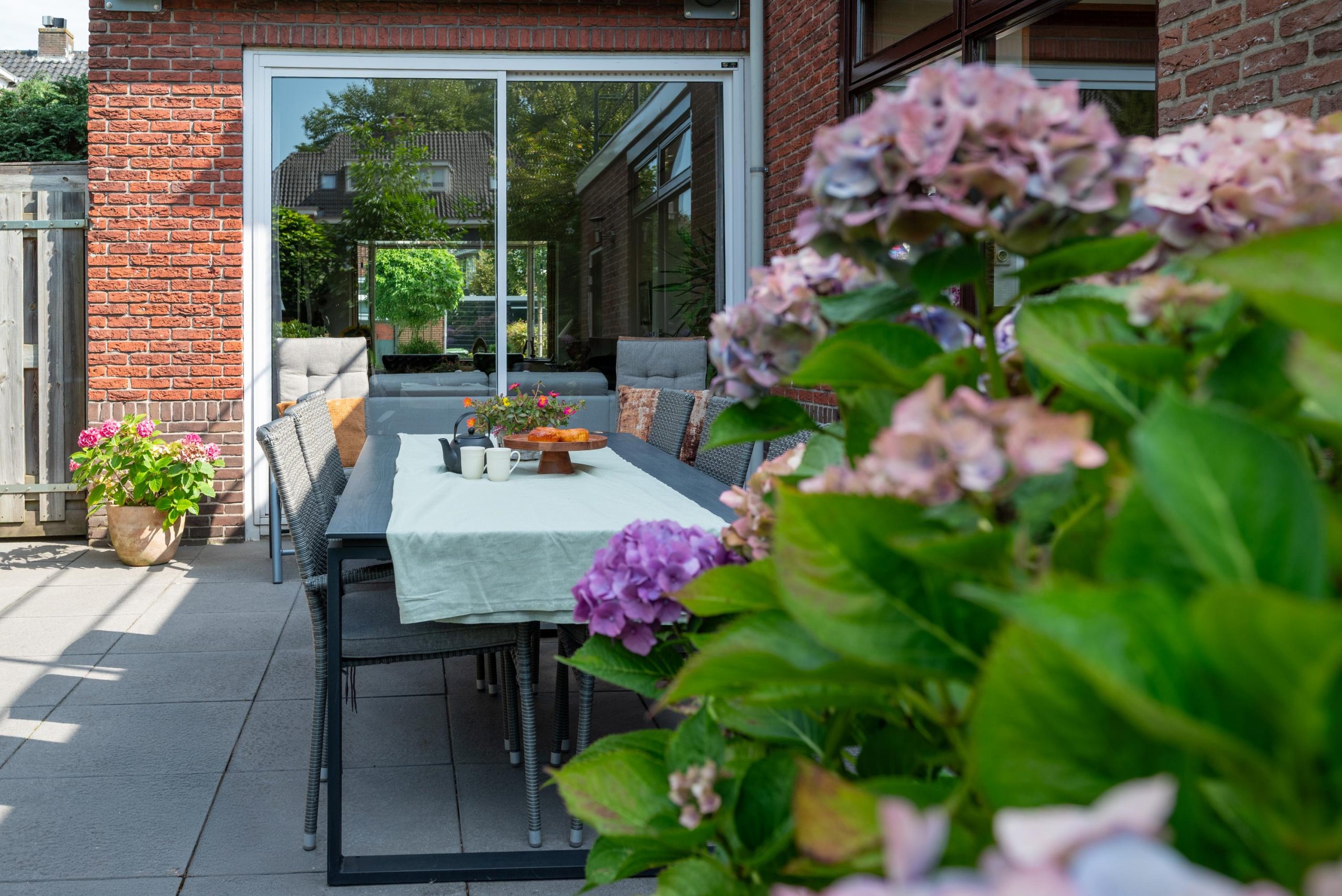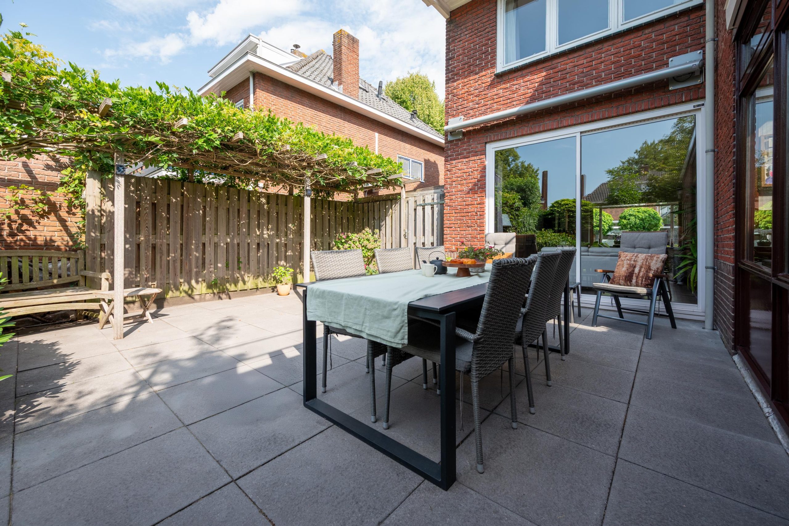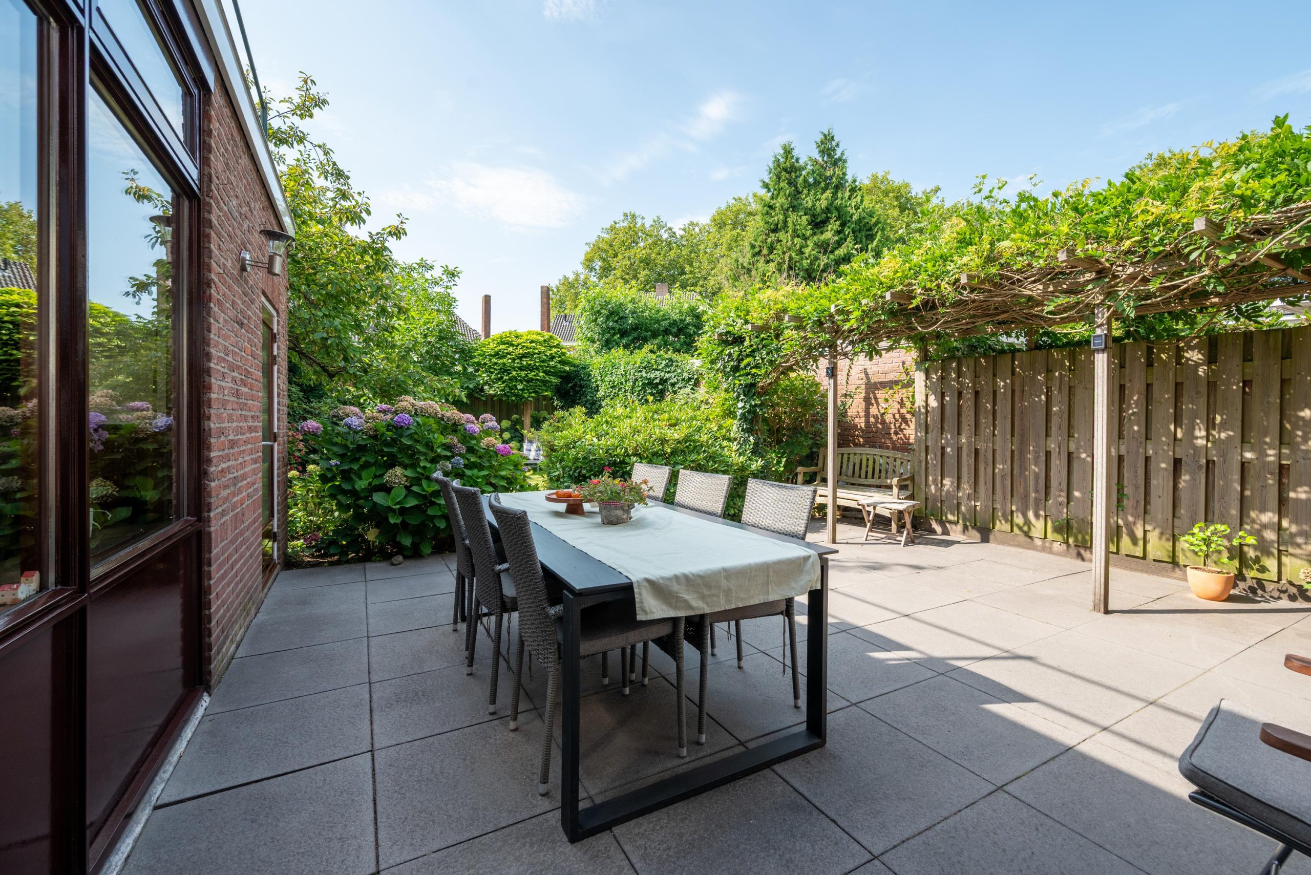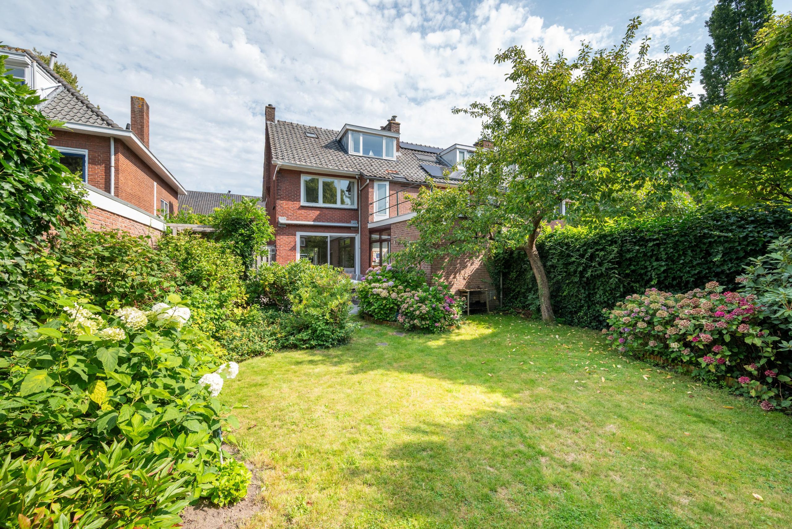 En dan buiten: een groene tuin met veel privacy die rondom het huis doorloopt. Altijd wel een plekje in de zon of juist in de schaduw, en genoeg ruimte voor lange zomeravonden met vrienden. De tuinberging is ideaal voor fietsen, tuingereedschap en kussens, alles netjes opgeborgen, maar wel binnen handbereik.