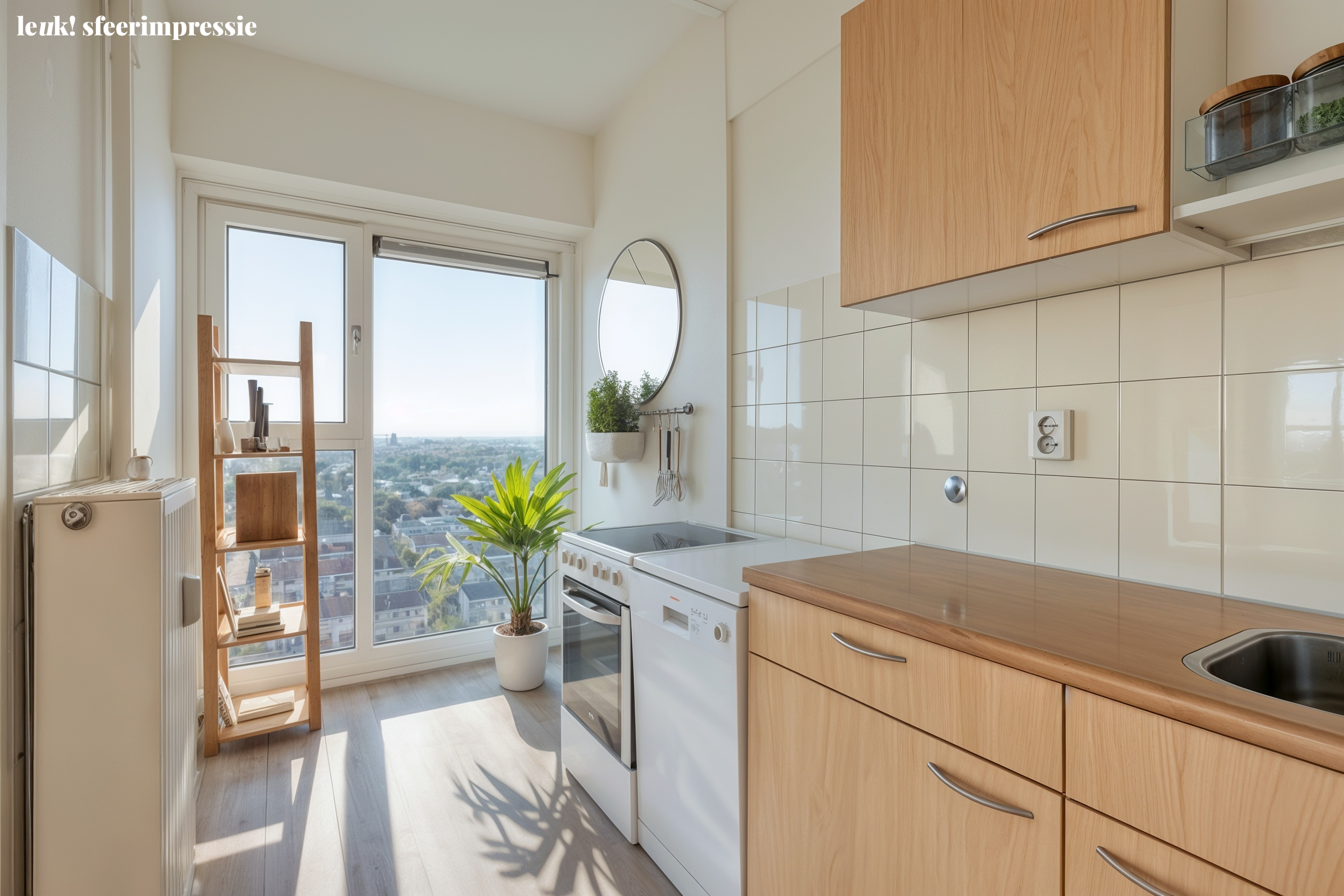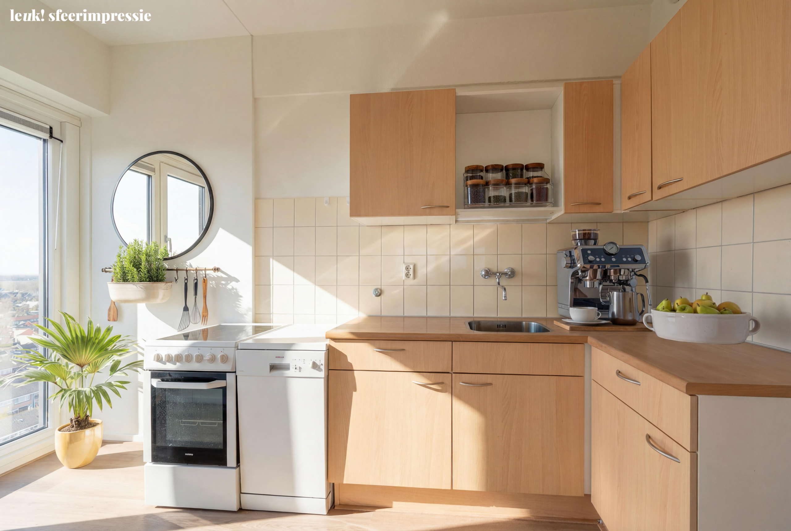 Dit appartement heeft een ruime woonkamer met een flinke partij ramen op het zuiden en westen. Heerlijk licht! En door het uitzicht voelt dit appartement nóg ruimtelijker. Ook in de keuken kun je optimaal genieten van het uitzicht! Terwijl de saus pruttelt zou je hier zelfs heerlijk in een luie stoel bij het raam kunnen zitten, terwijl je met één oog de pan in de gaten houdt. De open verbinding met de woonkamer zorgt ervoor dat je altijd contact behoud met je gasten.
