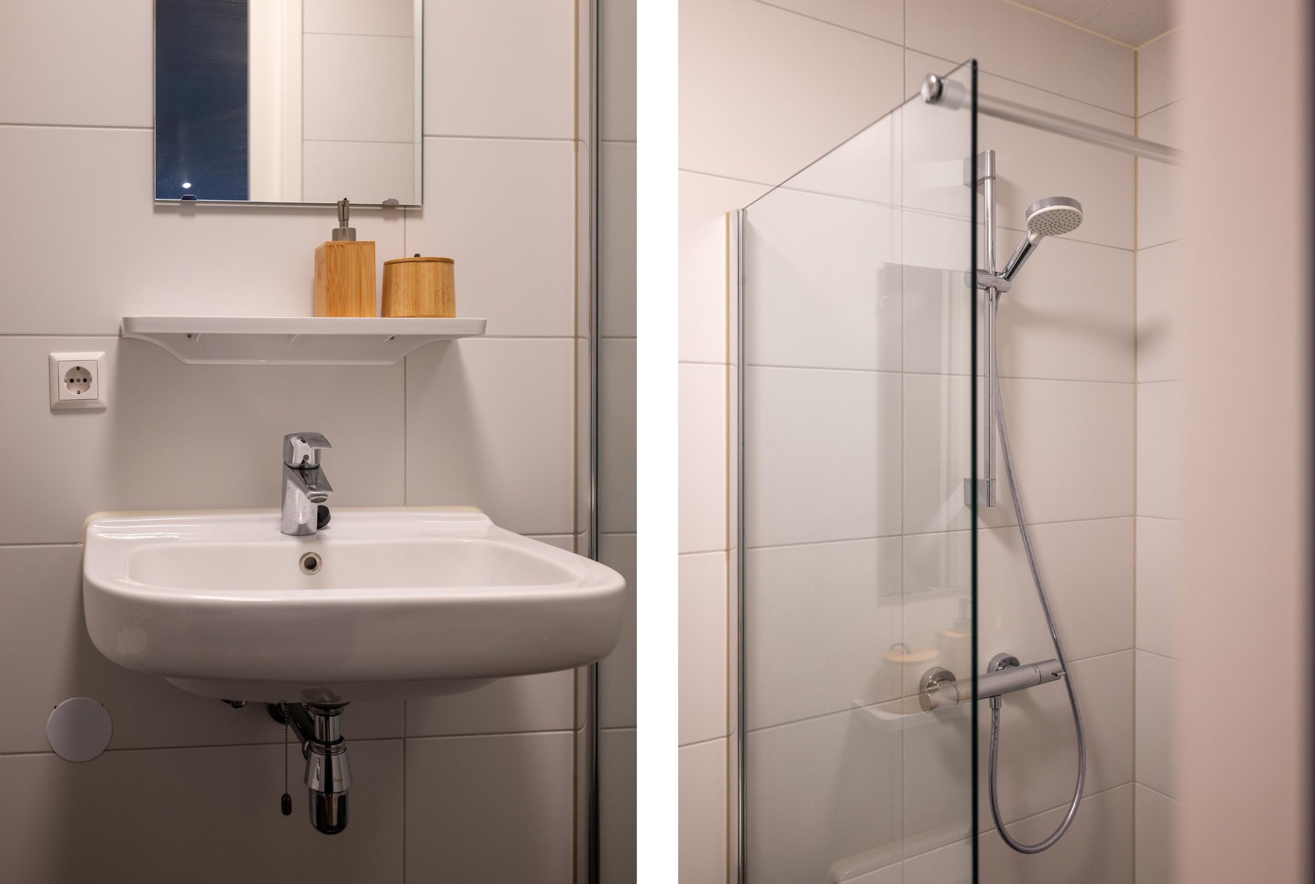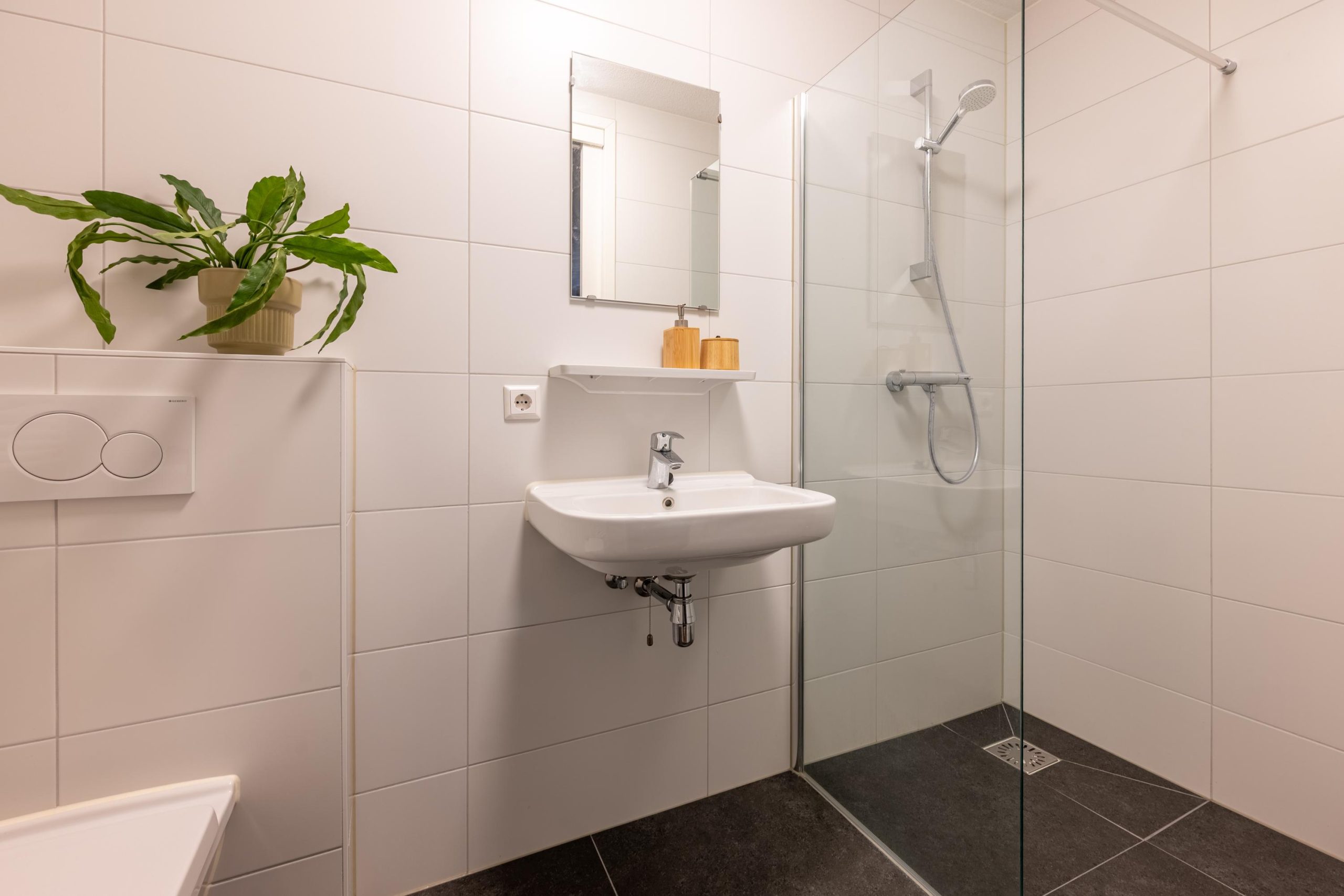 De badkamer, die bereikbaar is via een schuifdeur, is uitgerust met een inloopdouche, een wastafel met spiegel en planchet, een wandtoilet, een designradiator en er is mechanische ventilatie aanwezig. De donkergrijze vloertegels en witte wandtegels zorgen voor een frisse, moderne uitstraling.