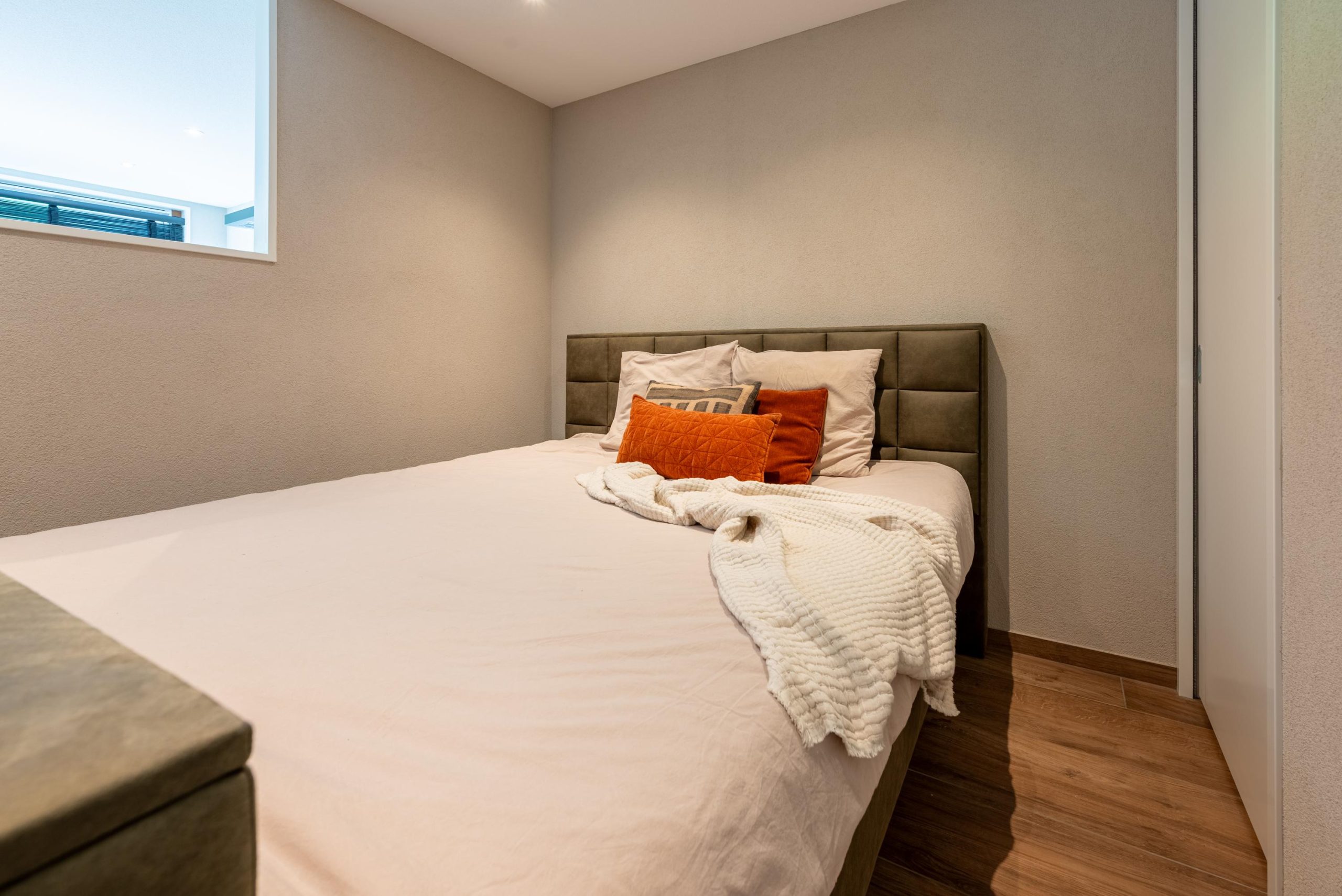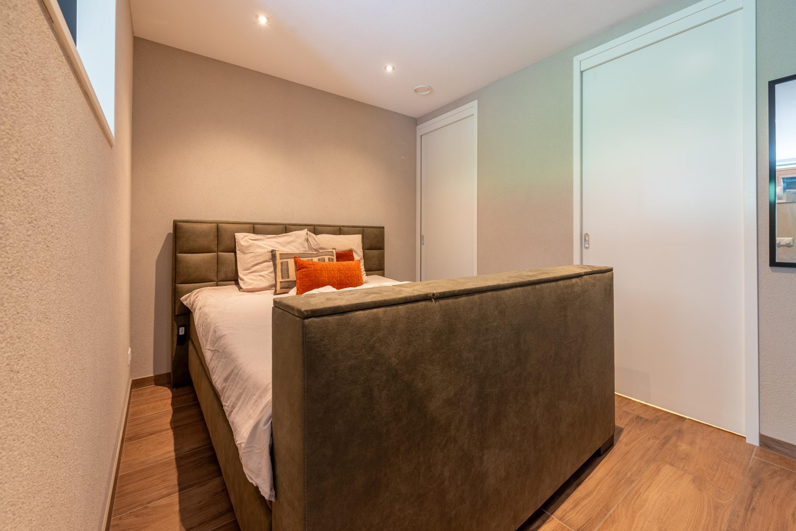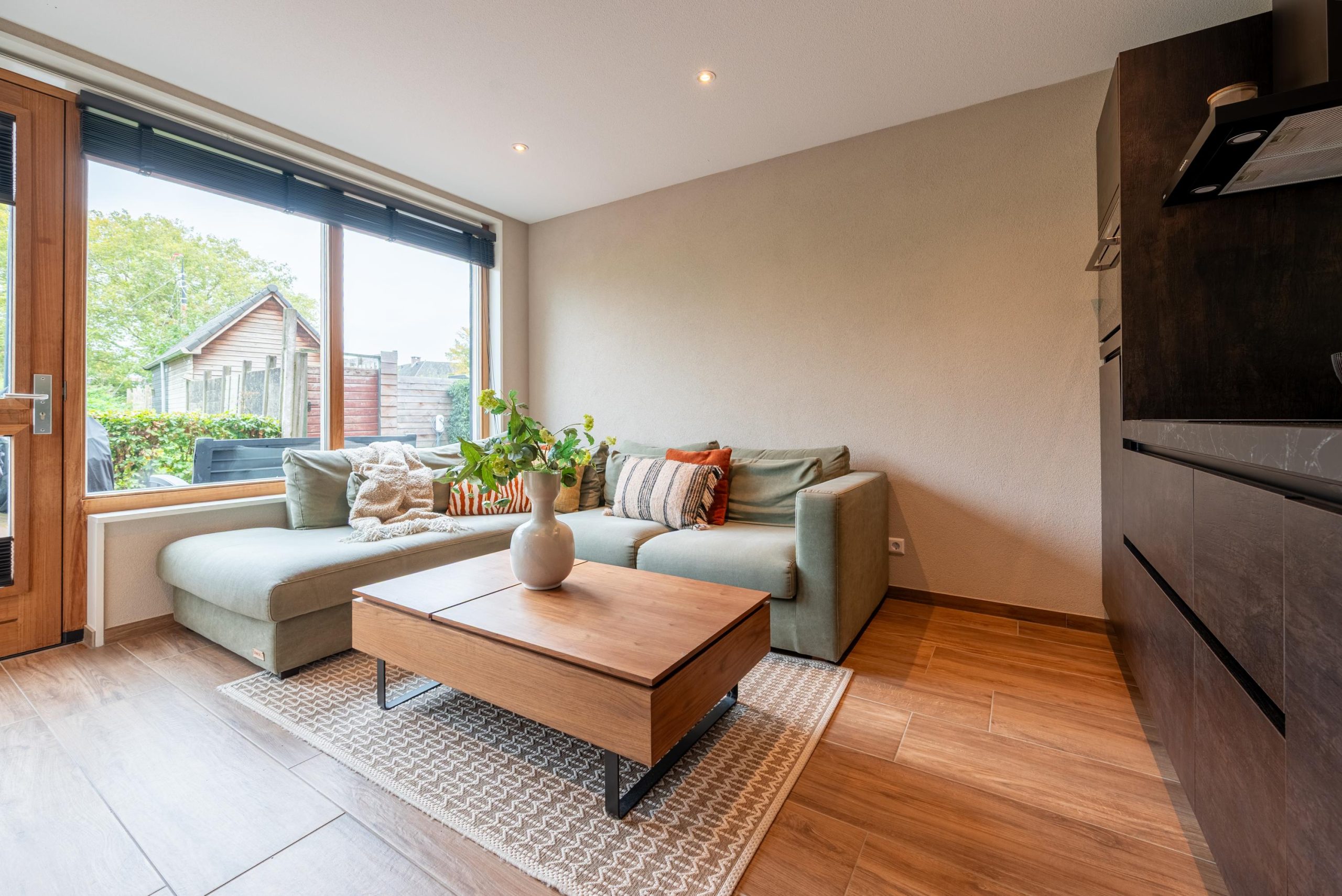 De studio zelf is slim ingedeeld, met een open woonkamer, een laag muurtje dat het slaapgedeelte subtiel scheidt, en een praktische kast met schuifdeur voor de ketel en de wasmachine. De woonkamer heeft een plavuizen vloer in een lichte houtlook met vloerverwarming, zandkleurige muren en een gezellige haard.