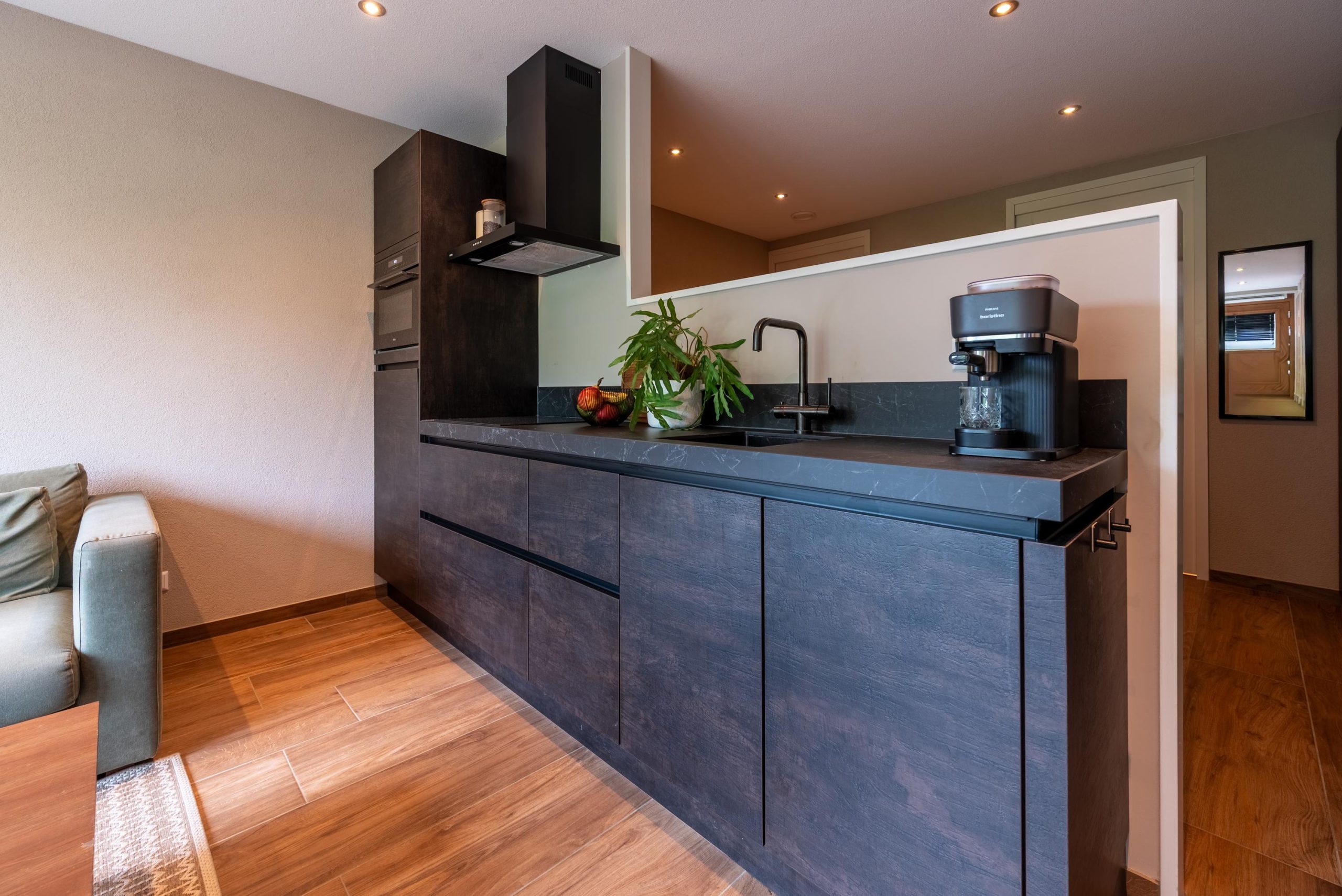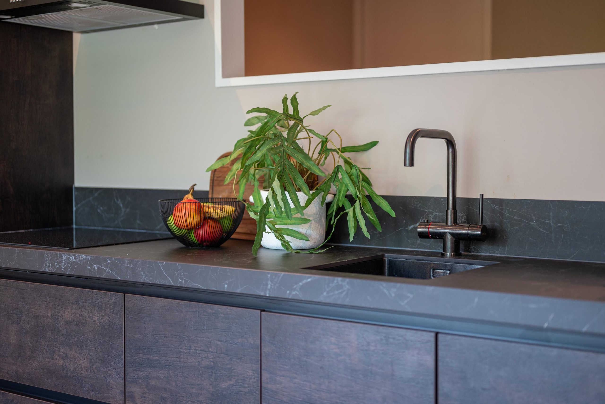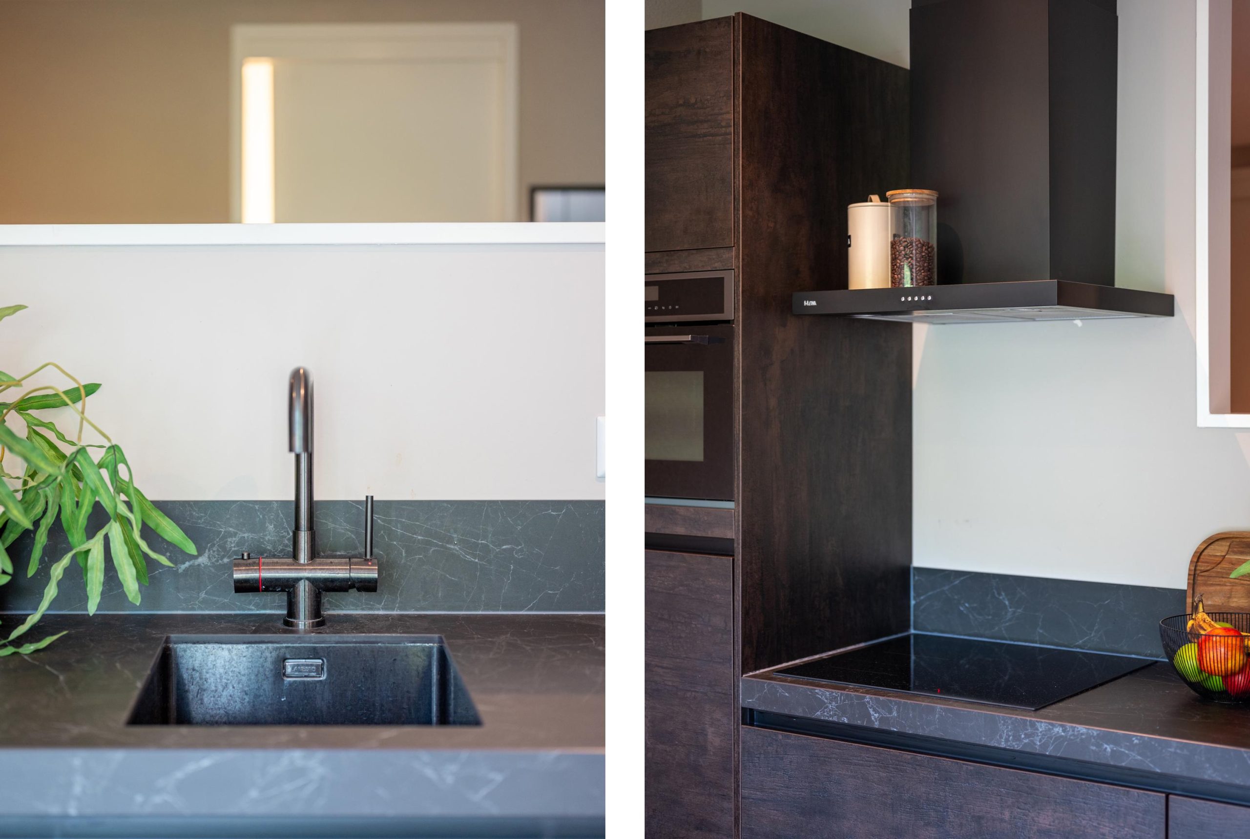 De moderne keuken in donkerbruine houtstructuur is voorzien van een zwart gemarmerd aanrechtblad, een inductiekookplaat, een matzwarte afzuigkap en wasbak, een kokendwaterkraan, een combimagnetron, een koelkast met vriesvak en een vaatwasser. Ook is er sfeerverlichting aangebracht onder het aanrechtblad.