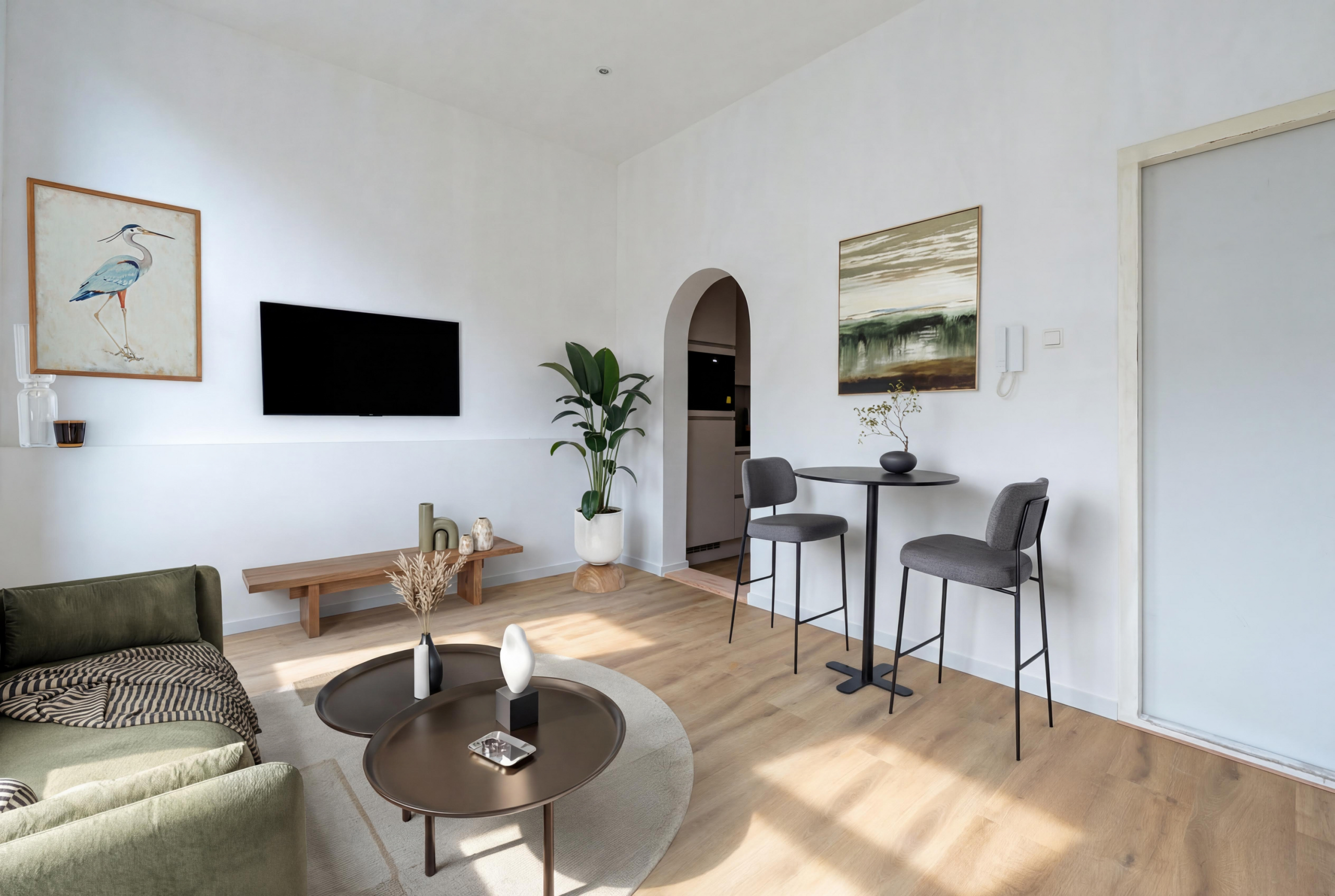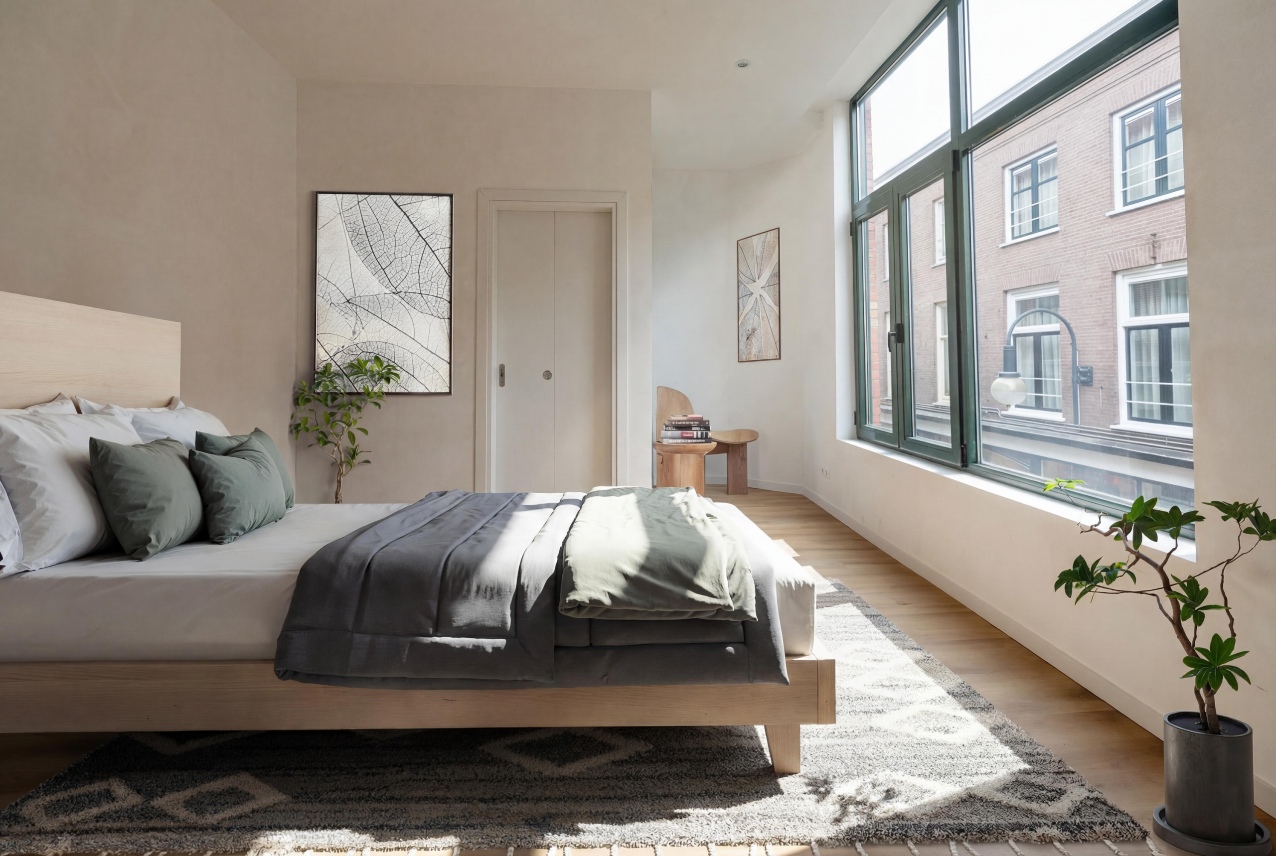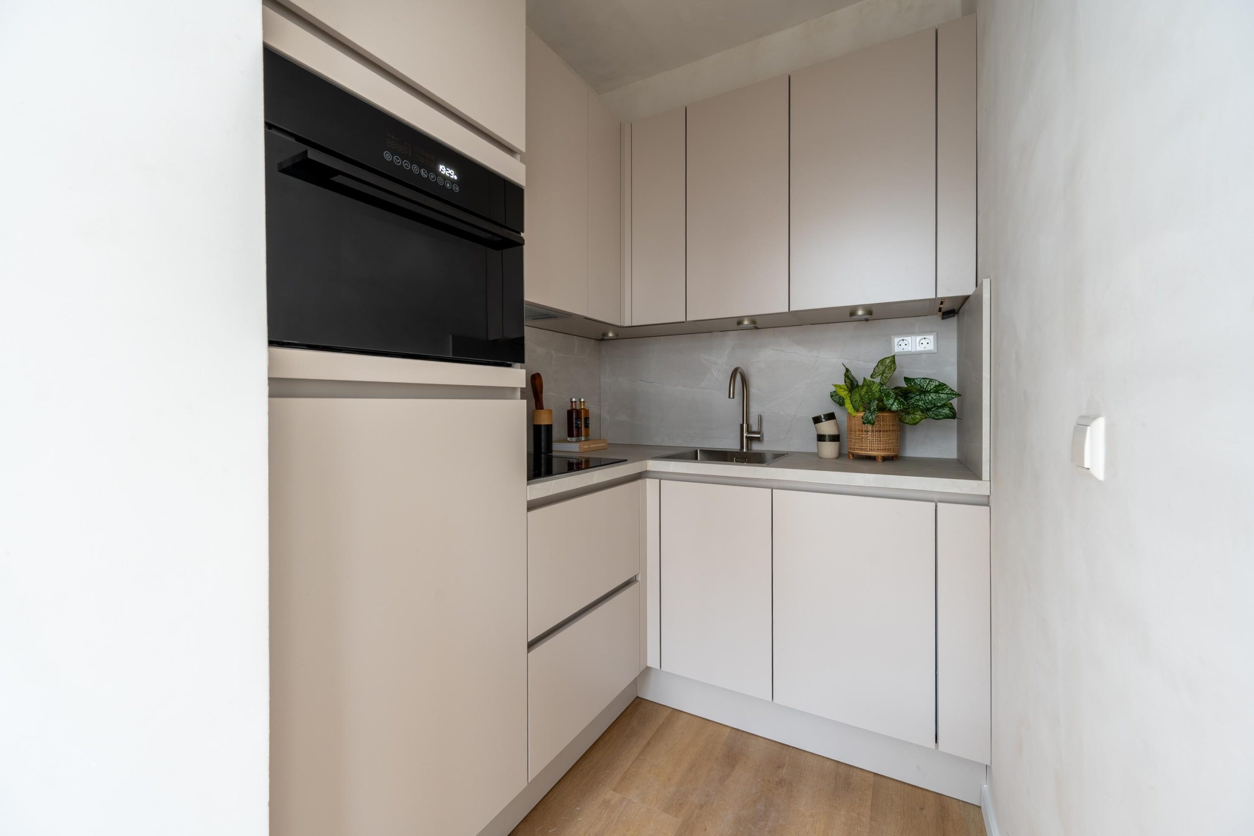Het appartement zelf is een heerlijk fris canvas, om helemaal je eigen te maken. Je hebt een fijne woonkamer met grote ramen en een half open keuken met alle voorzieningen die je nodig hebt. Van inductiefornuis tot combimagnetron en van vaatwasser tot koel-vriescombinatie.