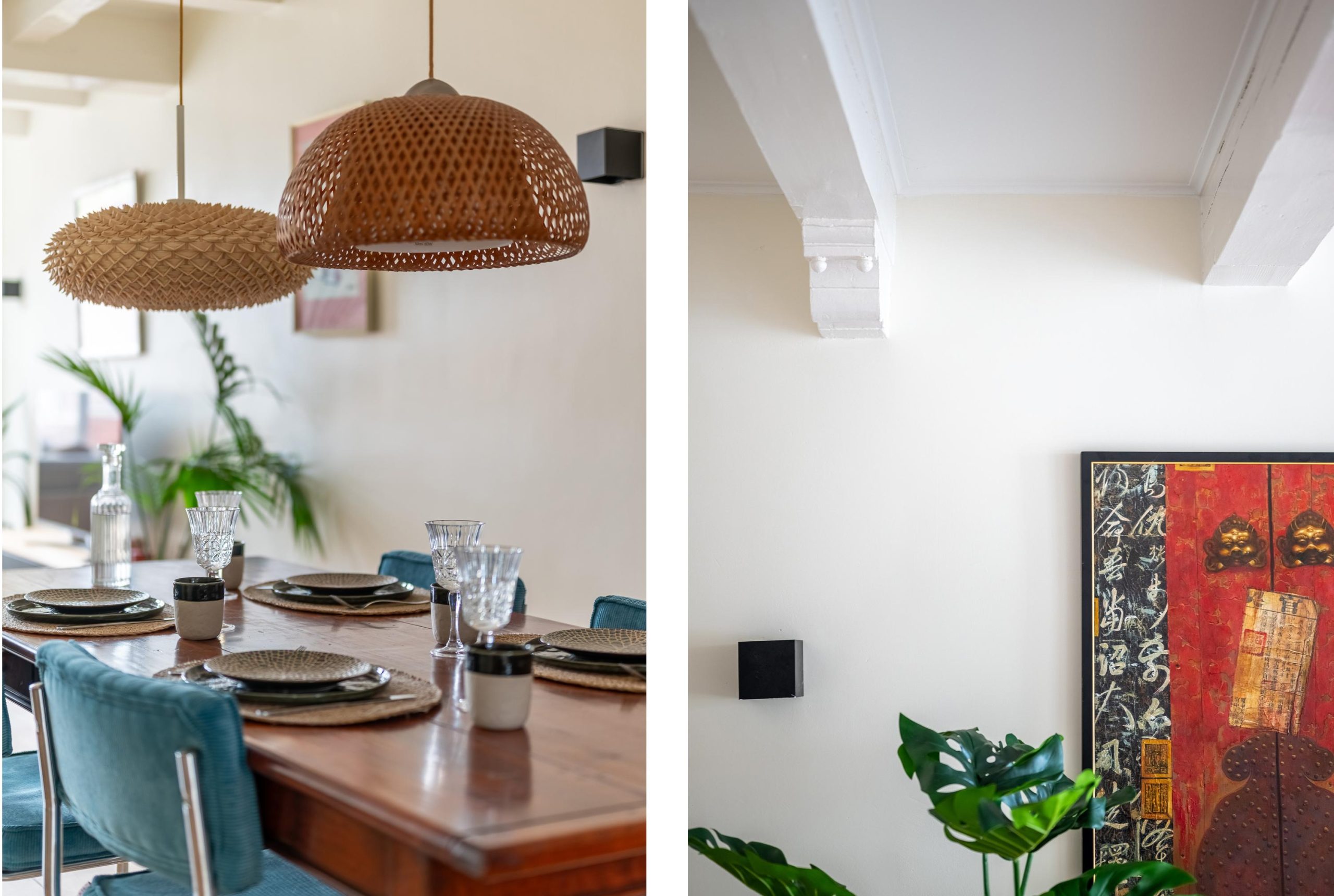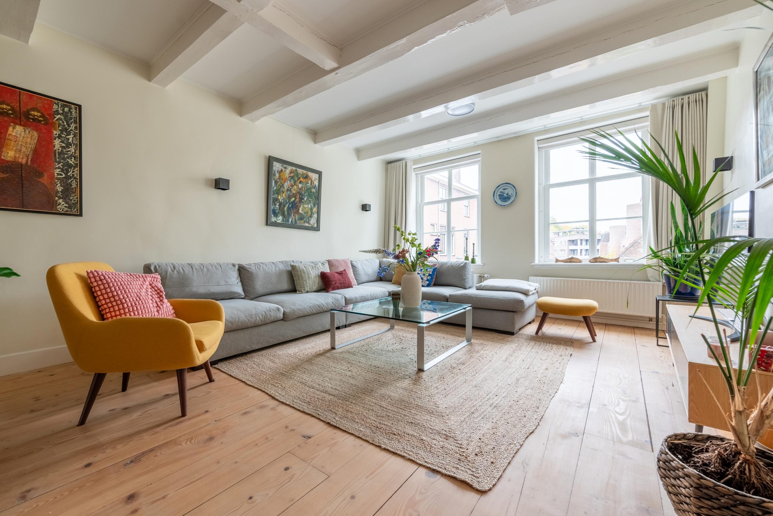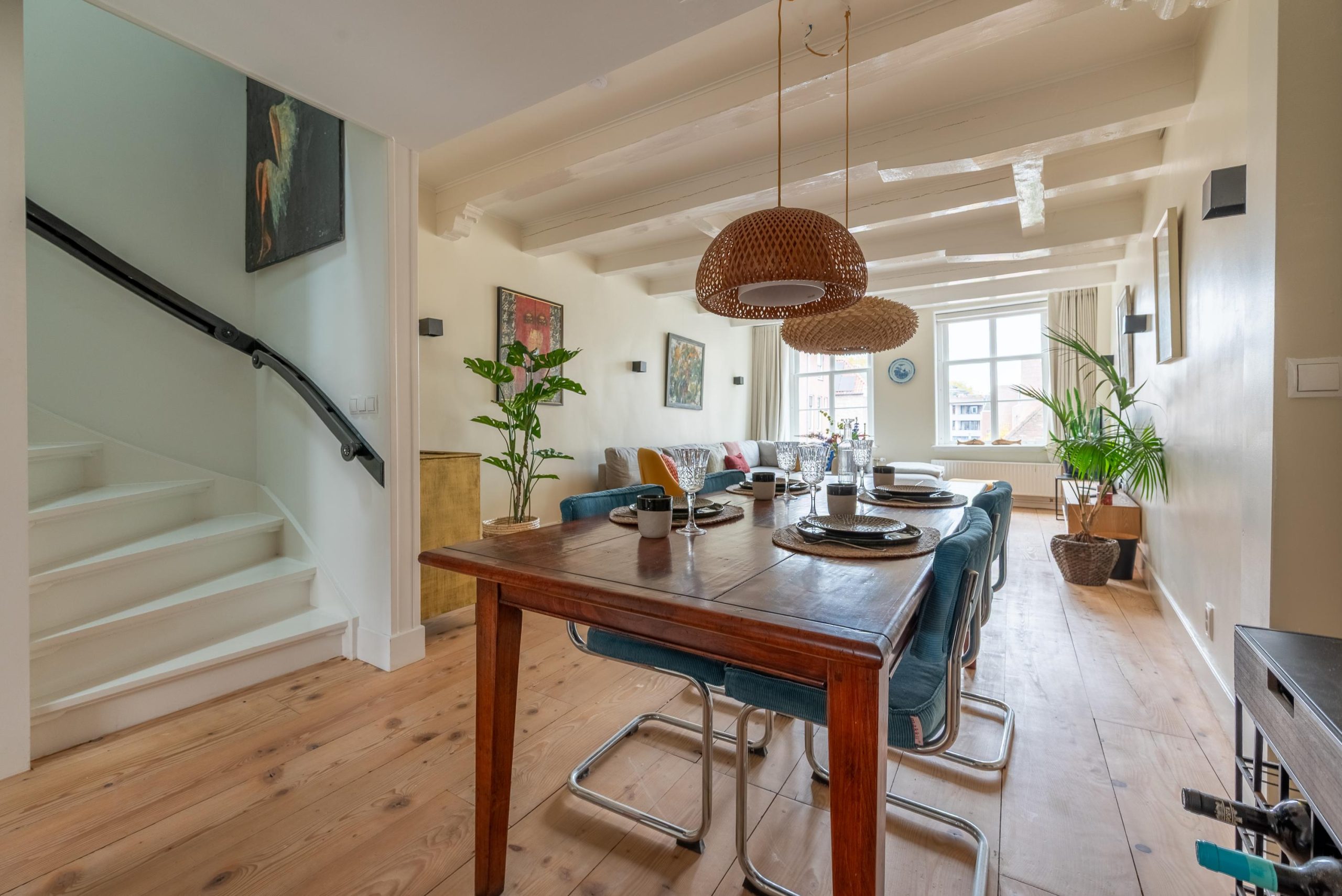 Een verdieping hoger ademt de woonkamer charme. Hoge ramen laten het daglicht rijkelijk binnen, de houten vloer brengt warmte en het balkenplafond voegt karakter toe. Voor, midden, achter: plek voor een royale zithoek, een lange eettafel en de logische doorloop naar de keuken. Het voelt royaal, luchtig en heel ‘thuis’.