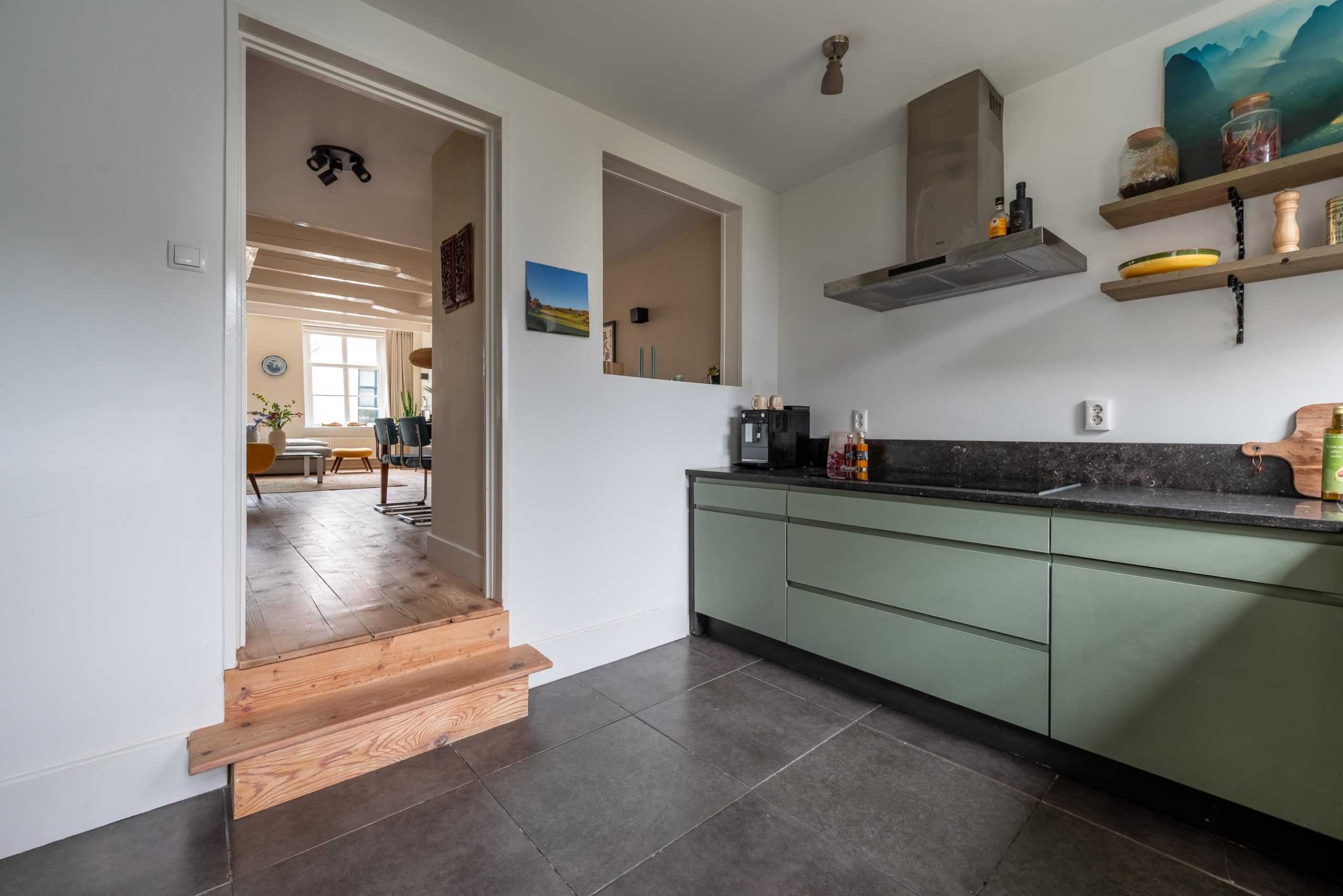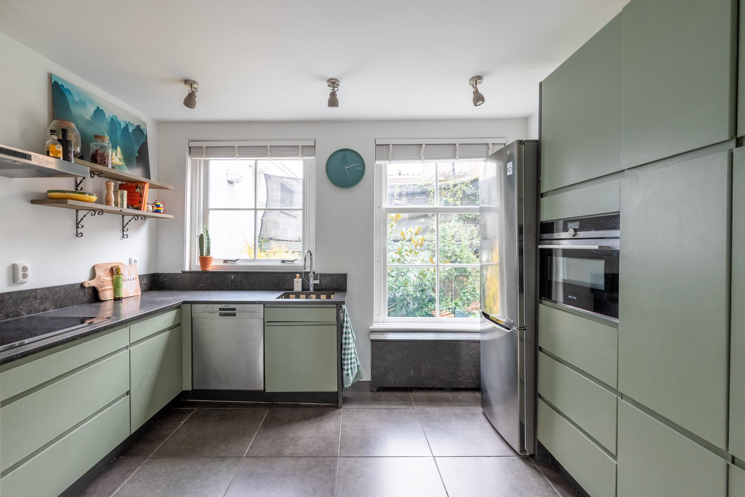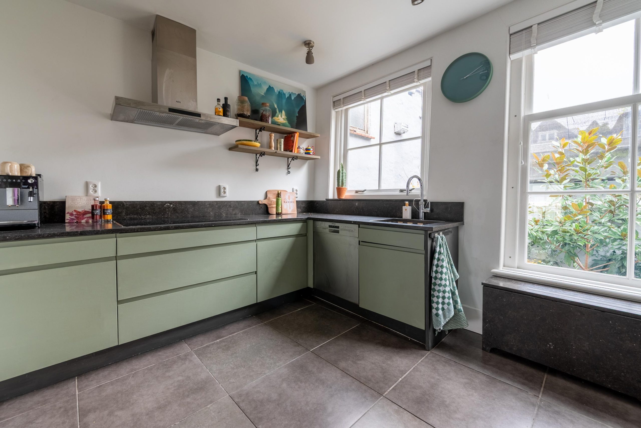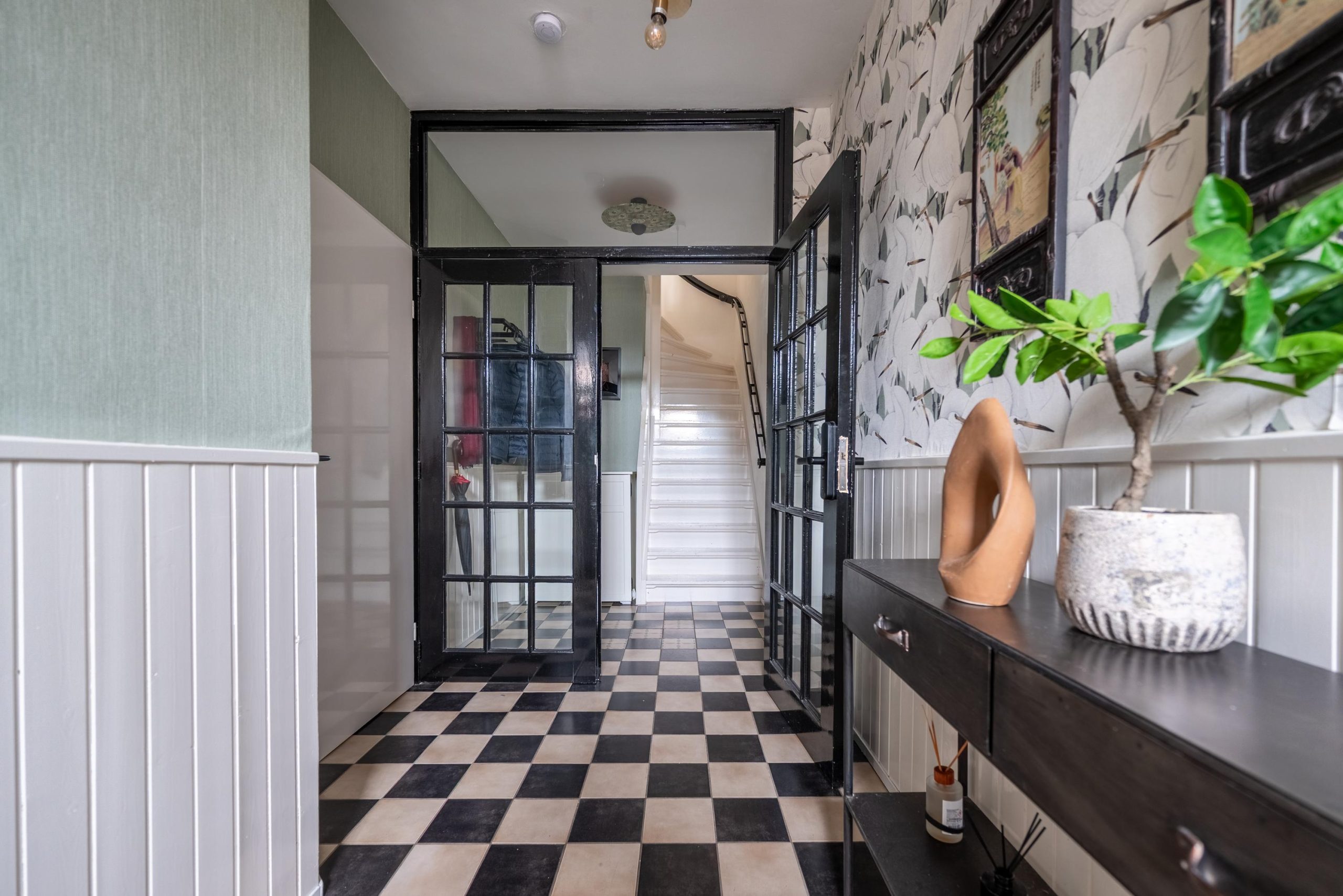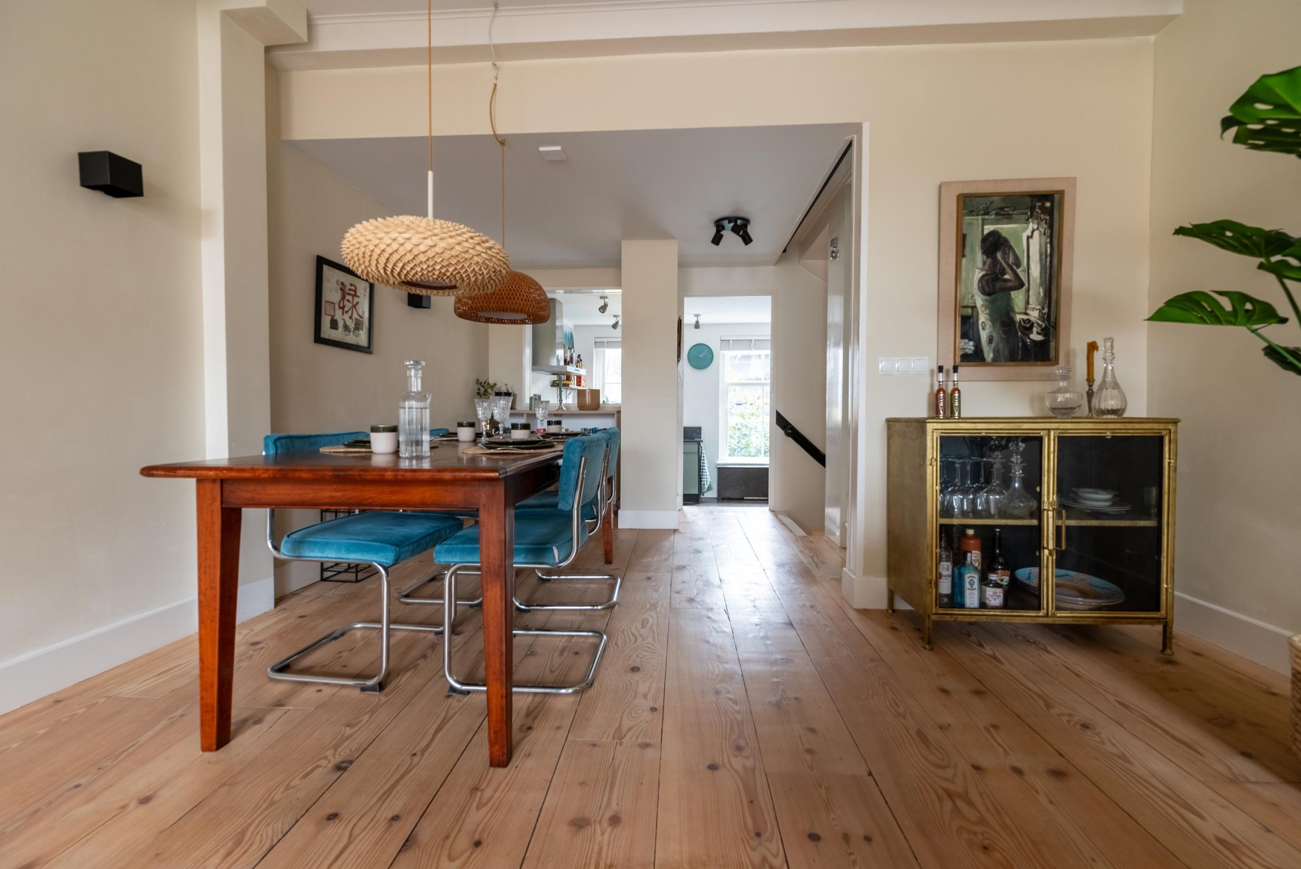 Je stapt binnen in een ruime hal met authentieke details. Links lonkt een deur; je opent ’m en staat in een kleurrijke eetkamer met keukenblok: precies de plek voor wie nét even meer wil. Werkplek? Atelier? Of een zelfstandige studio voor je kind? Het kan hier allemaal, want beneden is er ook een badkamer: slim, speels en superpraktisch.