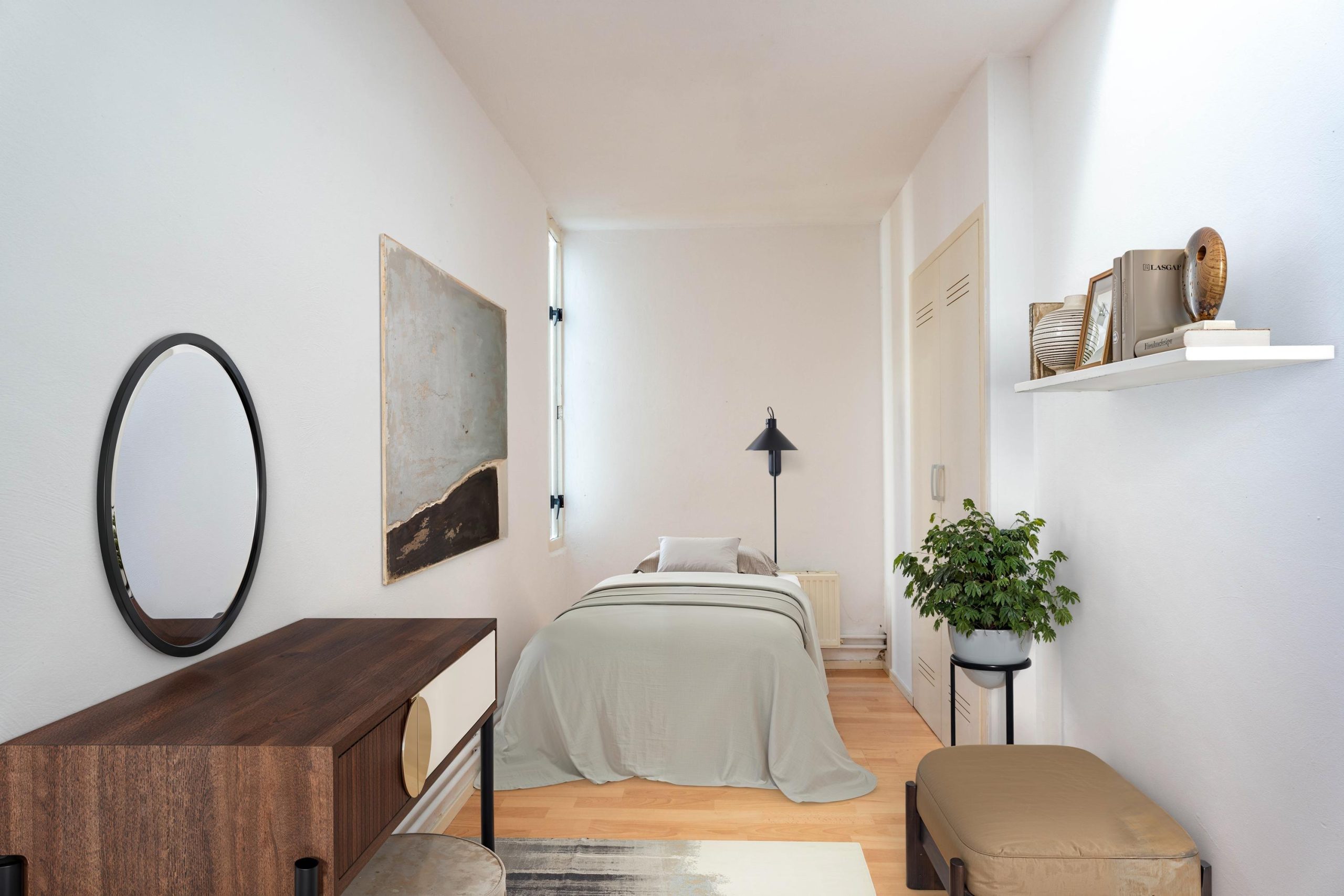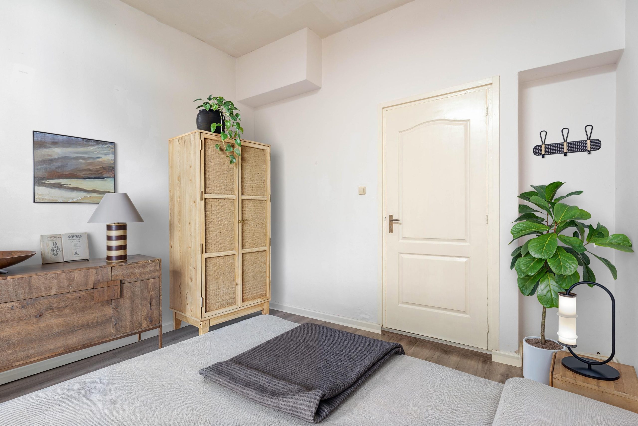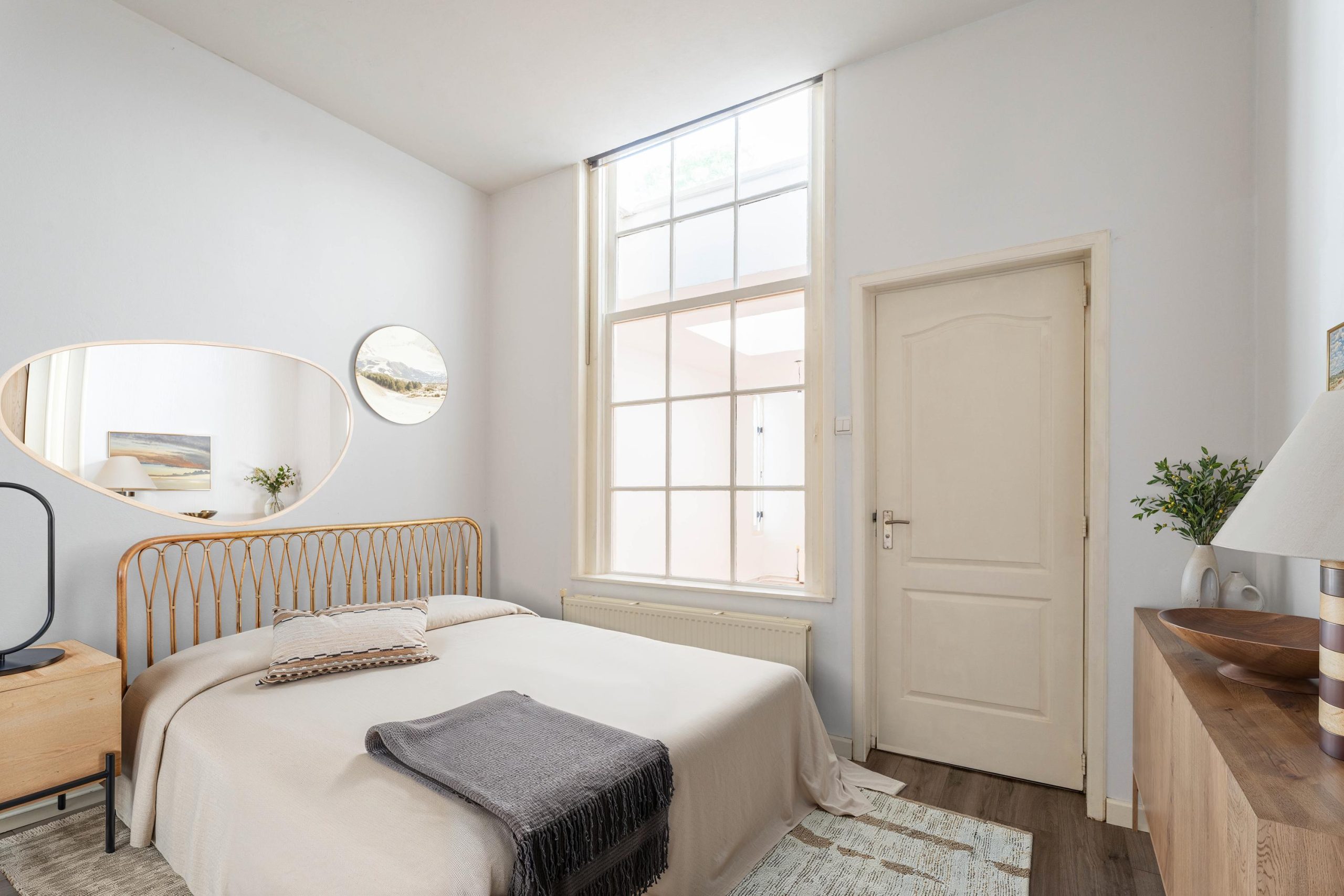 Loop je verder naar achteren, dan ontdek je de multifunctionele kamer en de slaapkamer. Een lichte ruimte met voldoende plek voor een comfortabel bed en kasten, waarbij de grote ramen zorgen voor een prettige hoeveelheid daglicht en een rustige sfeer. Aansluitend vind je de badkamer, deze is praktisch ingericht.