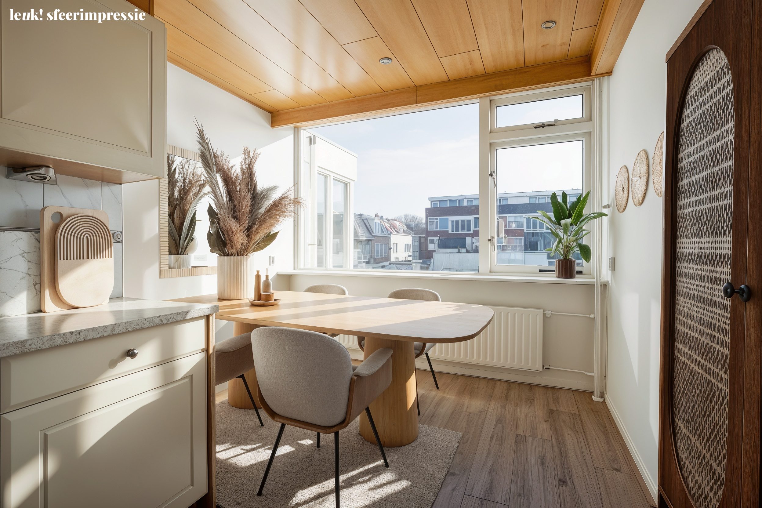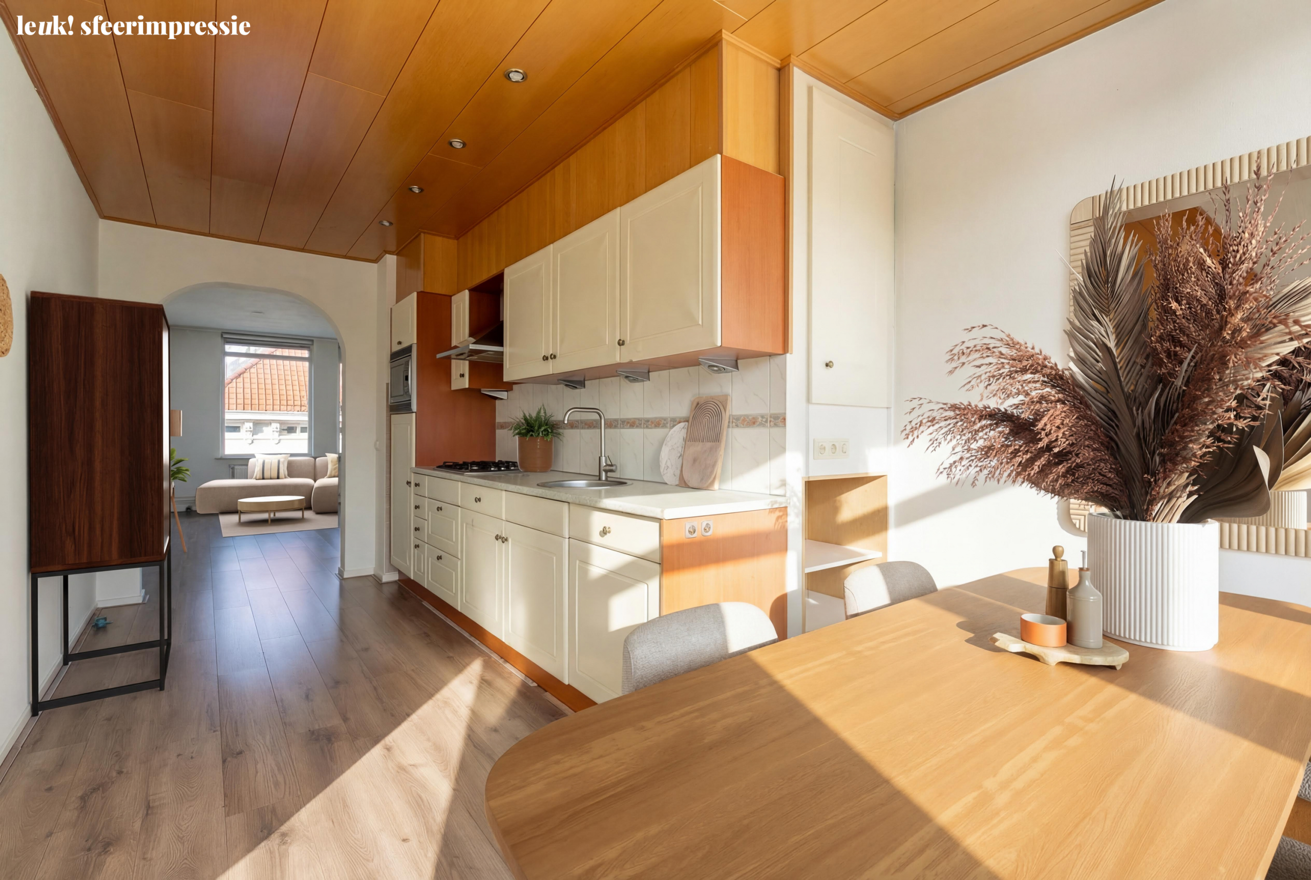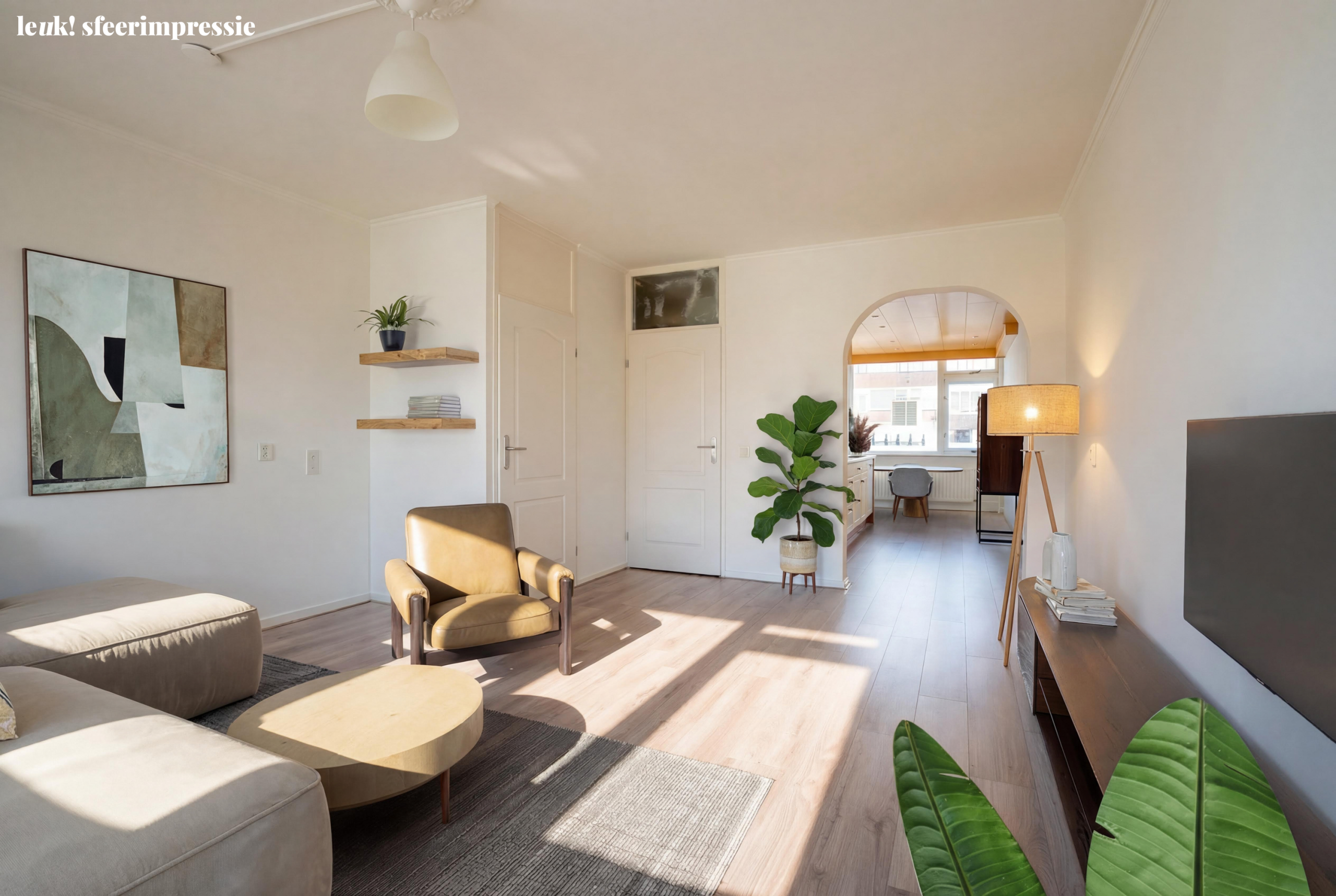 Binnen voelt het al snel eigen. Een lichte woonkamer waar je je dozen uitpakt en je bank neerzet. Via de boog loopt de ruimte over in de keuken, waar straks de eerste etentjes met vrienden plaatsvinden.