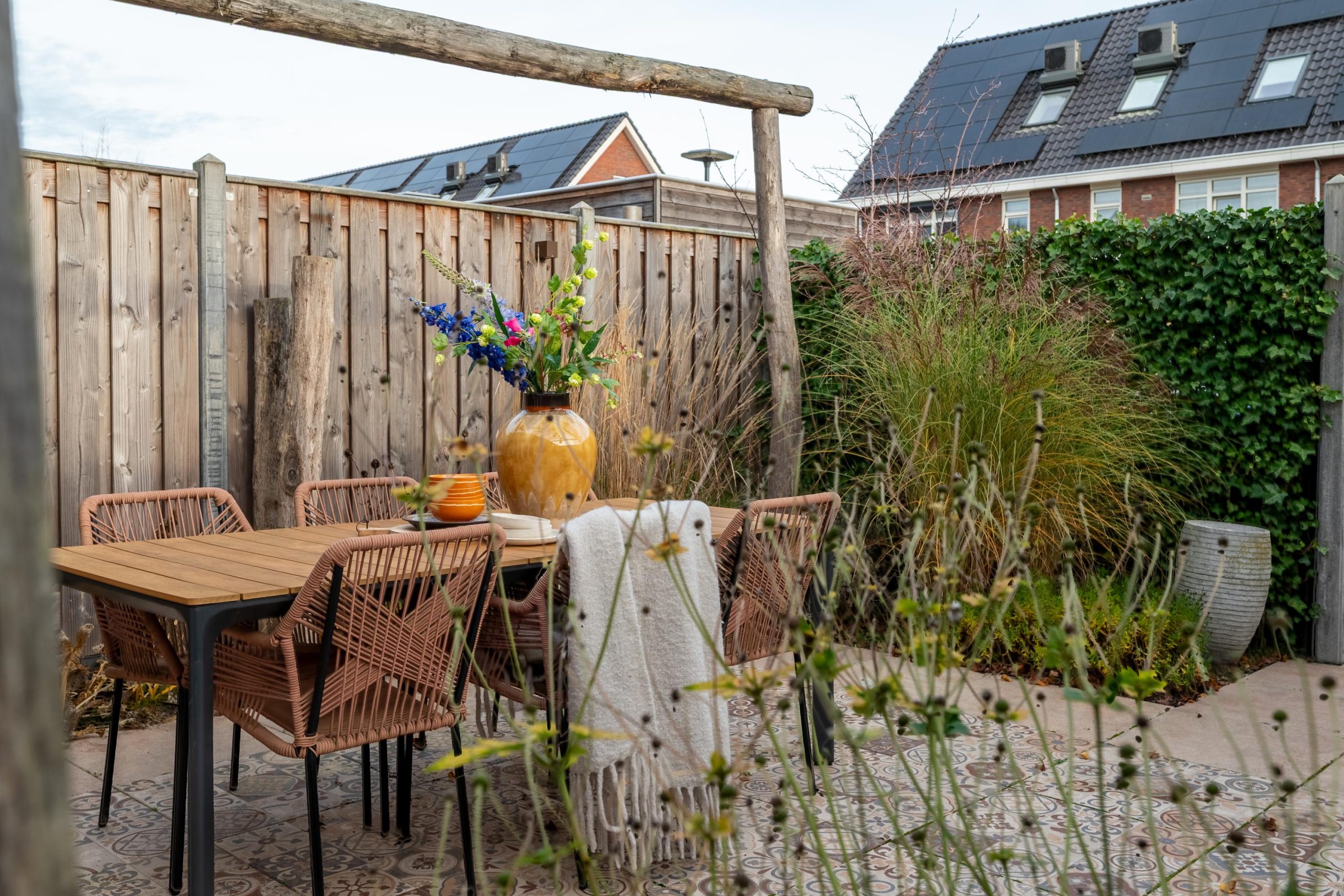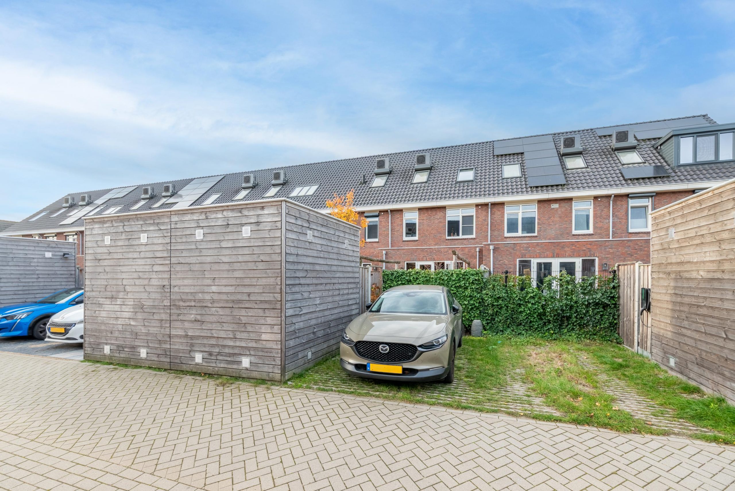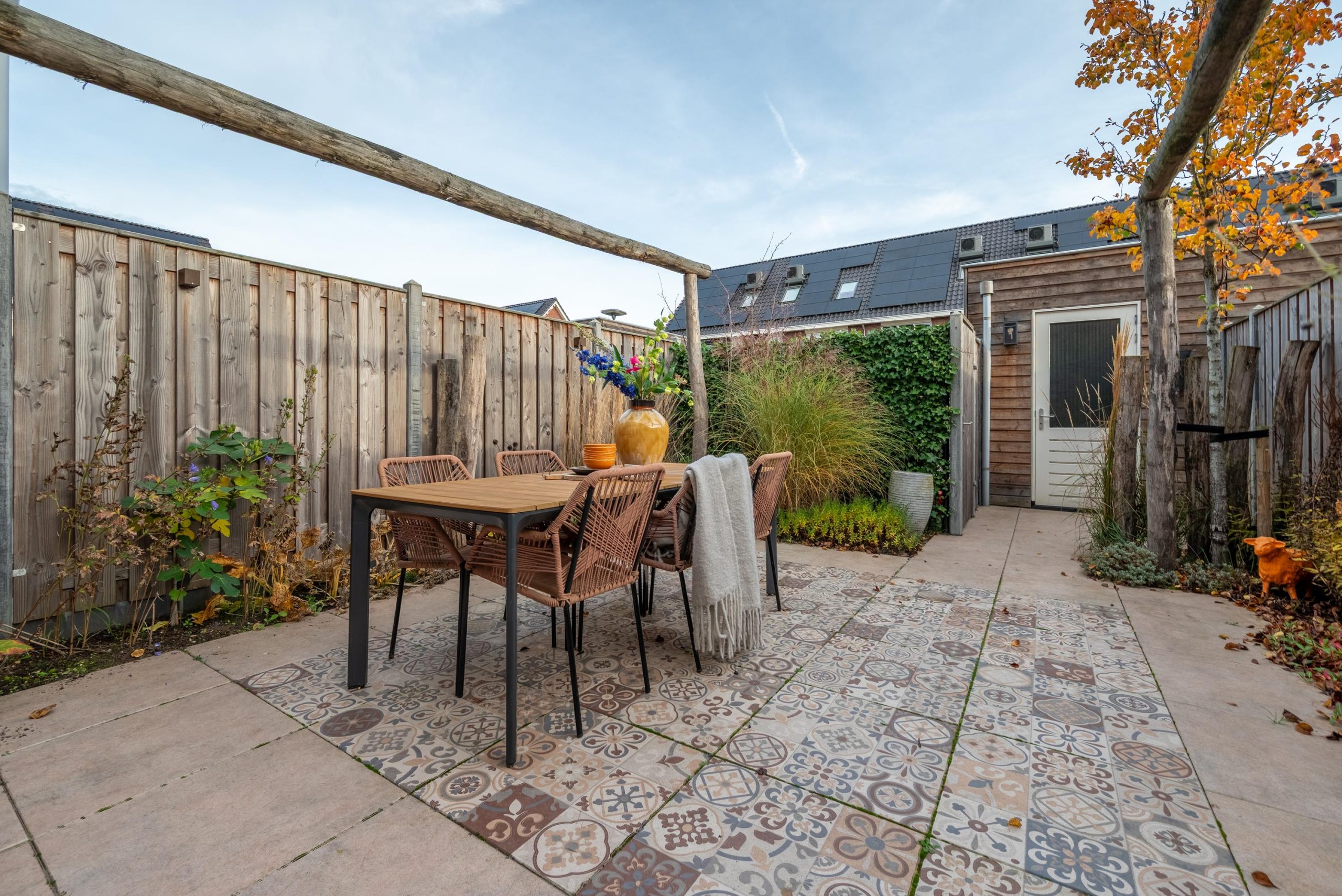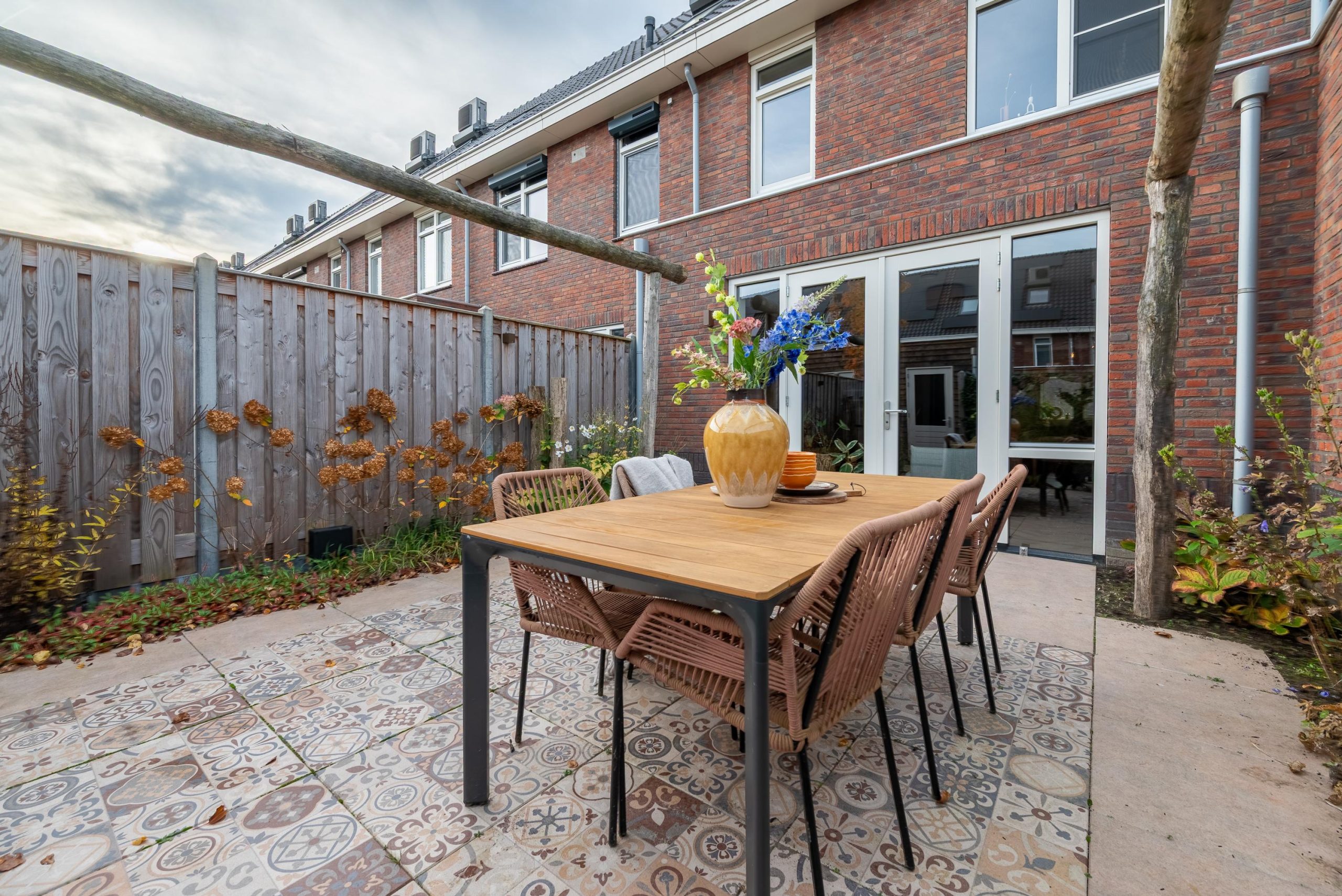 En dan de tuin. Diepe tegels, veel groen en een plek waar de dag zich vanzelf verplaatst van binnen naar buiten. De kinderen die veilig spelen, vrienden die aanschuiven voor een barbecue, het gemak van even door de poort lopen om je auto op je eigen plek te parkeren. Alles klopt. Alles voelt doordacht.
