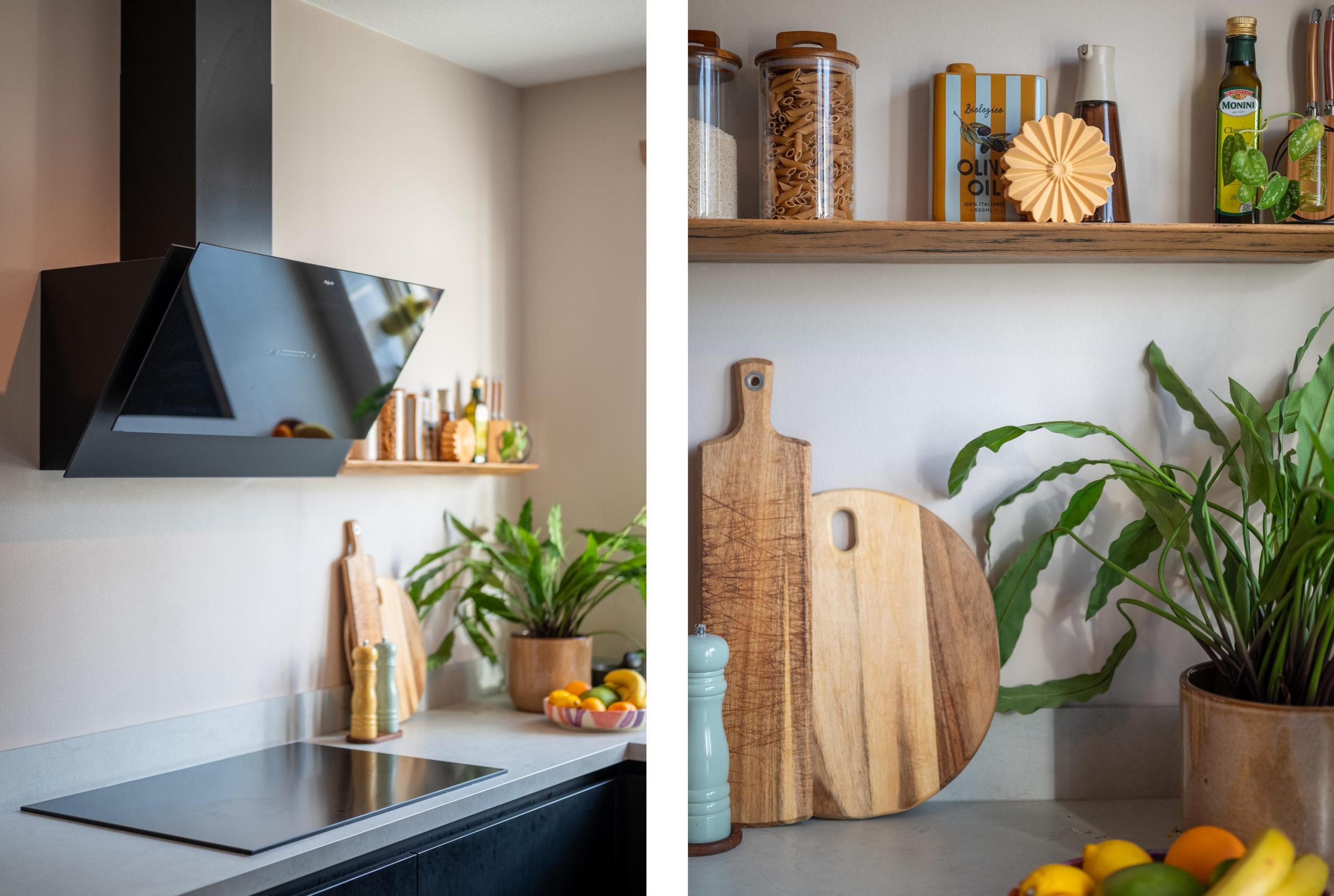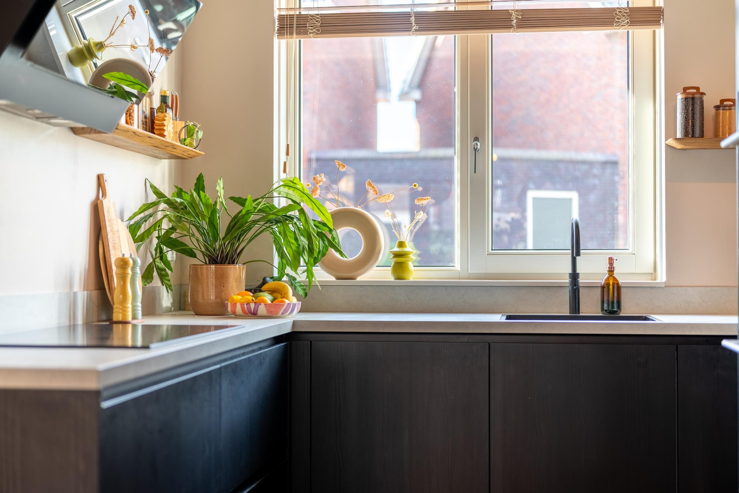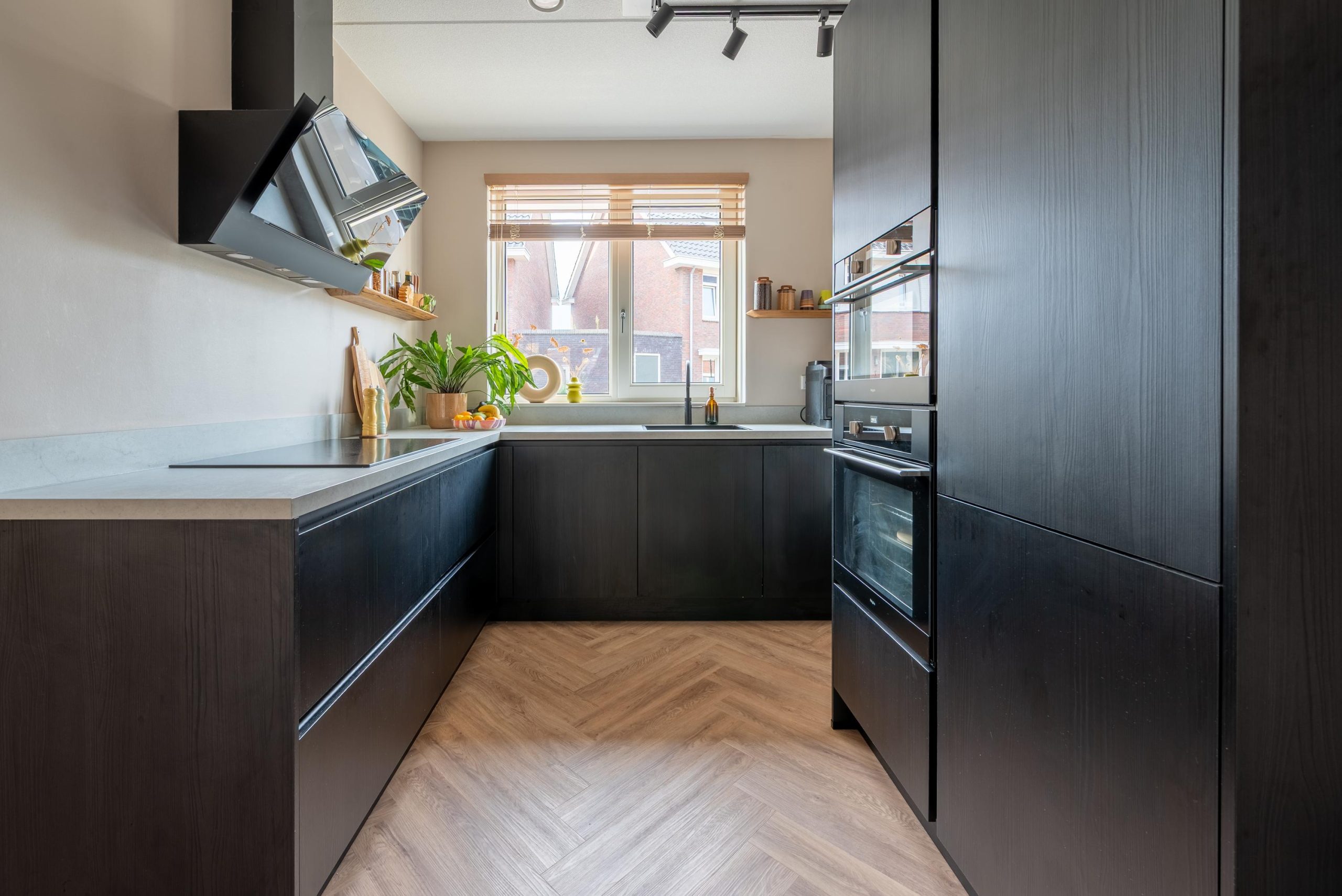 In de keuken bereid je op een drukke doordeweekse avond met gemak een maaltijd, maar net zo goed sta je hier op zaterdag pizza’s te bakken voor een gezellige borrel. Dankzij zowel een normale oven als een combi-oven lukt het je moeiteloos om voor een hele tafel te koken. De openslaande deuren naar de tuin staan open, er waait een zacht briesje naar binnen, je gasten zitten buiten te kletsen en jij beweegt je vrij door de ruimte. Dat werkt hier gewoon vanzelf.
