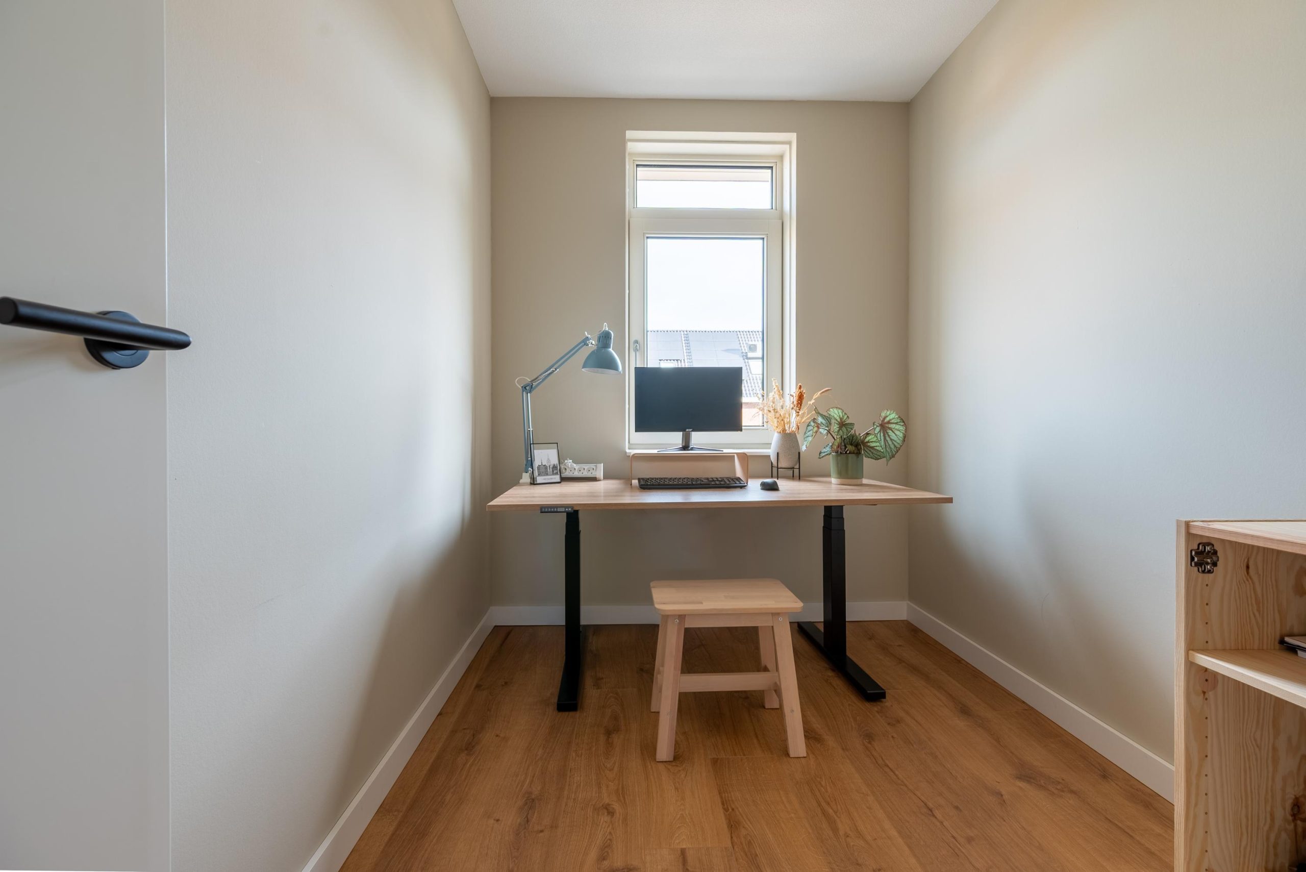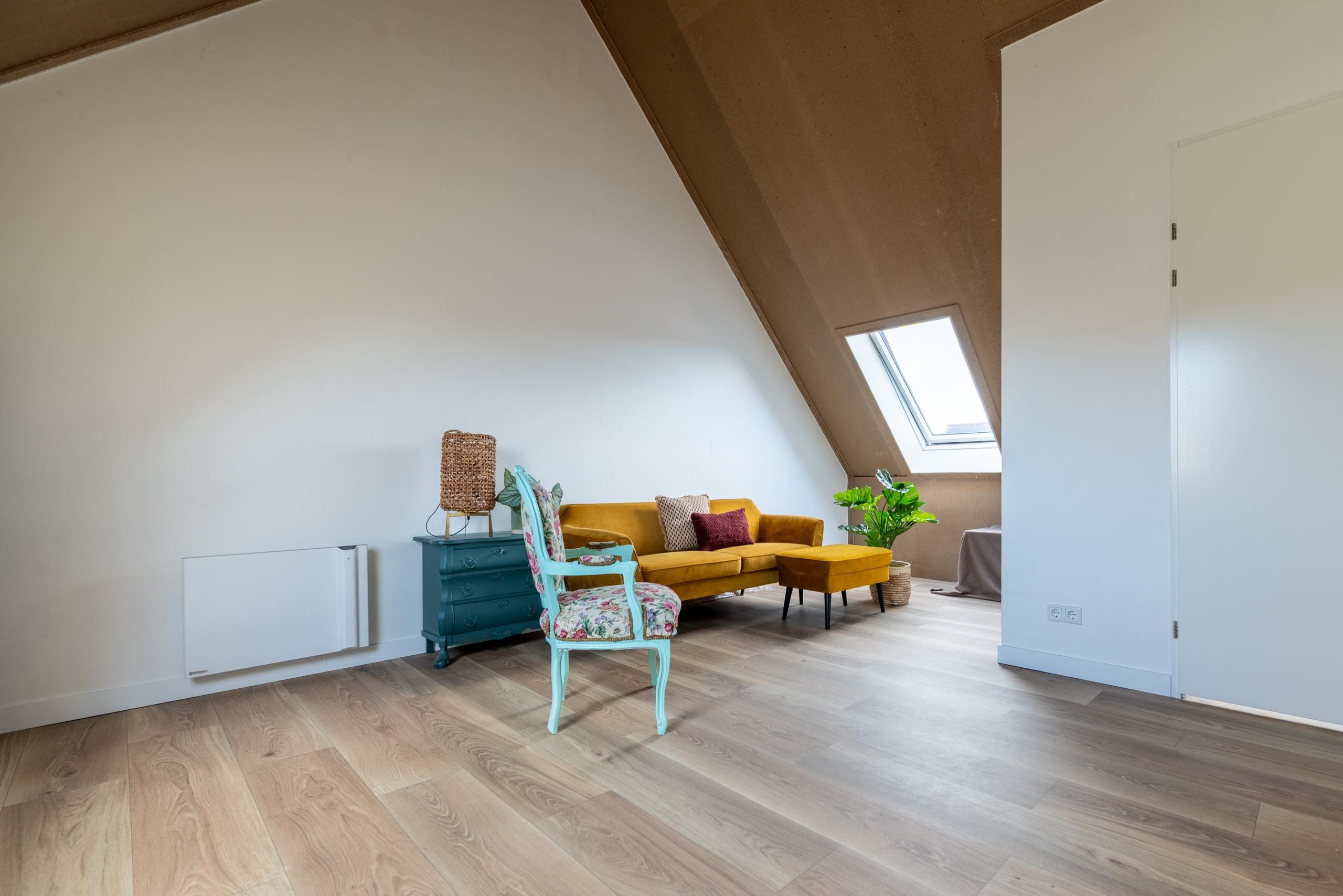Loop je naar boven, dan merk je hoe goed de ruimtes zijn ingedeeld. Drie slaapkamers, elk met hun eigen sfeer. De grootste voelt als een kleine retreat, met ruimte voor een grote kast en kleuren die je ’s ochtends rustig laten wakker worden. De andere kamers kun je helemaal naar wens invullen. Een kinderkamer, een werkplek, een logeerruimte, alles past. En dan is er nog de ruime tweede verdieping, die je meteen verrast. De hoogte, het licht, de vrijheid om hier te creëren wat je maar wilt. In de aparte technische ruimte staat alles netjes bij elkaar: de wasmachine, de droger en de omvormer van de zonnepanelen. Praktisch en overzichtelijk.