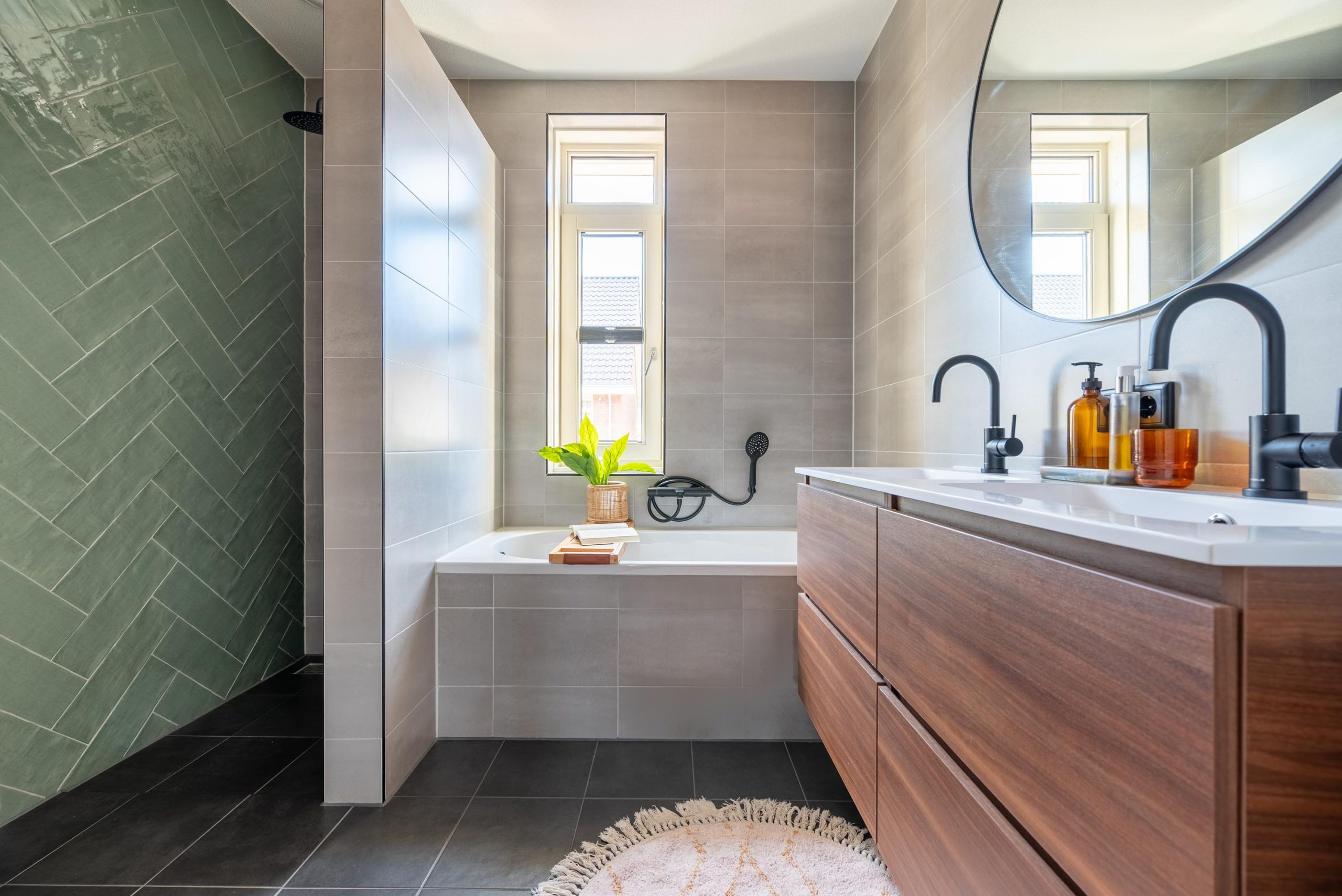 Waar kun je echt tot rust komen? Misschien denk je aan een dagje wellness, maar die vind je hier gewoon thuis. Het ligbad, het zachte schuim en de frisse geur geven direct dat luxe spa-gevoel. De ruime inloopdouche met groene tegel en de dubbele wastafel maken de badkamer stijlvol en praktisch tegelijk. Een plek waar je even helemaal kunt ontspannen.