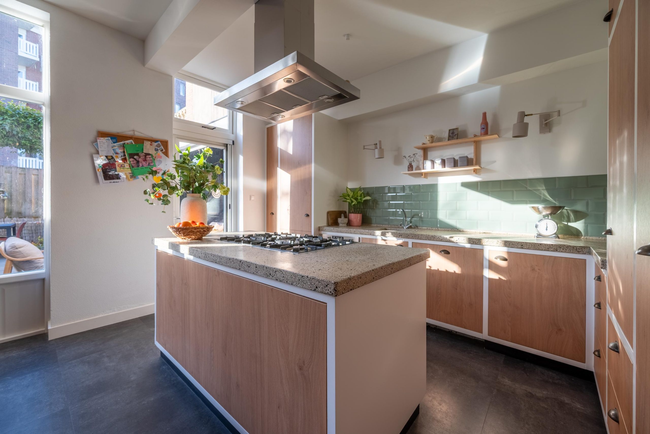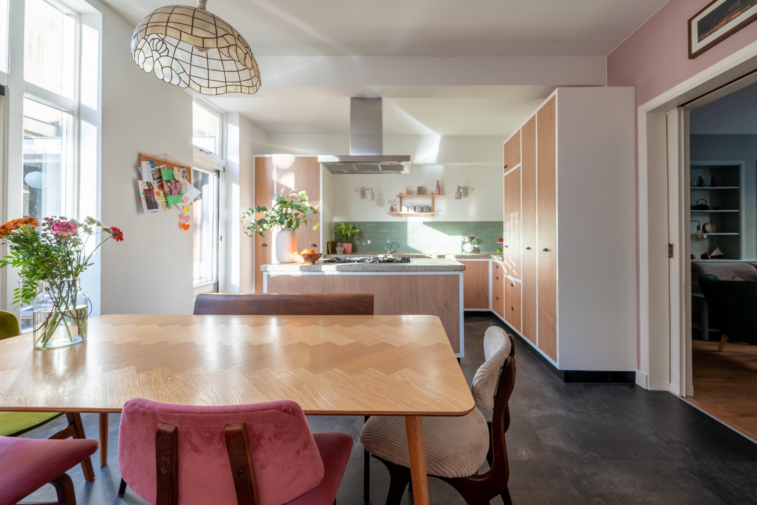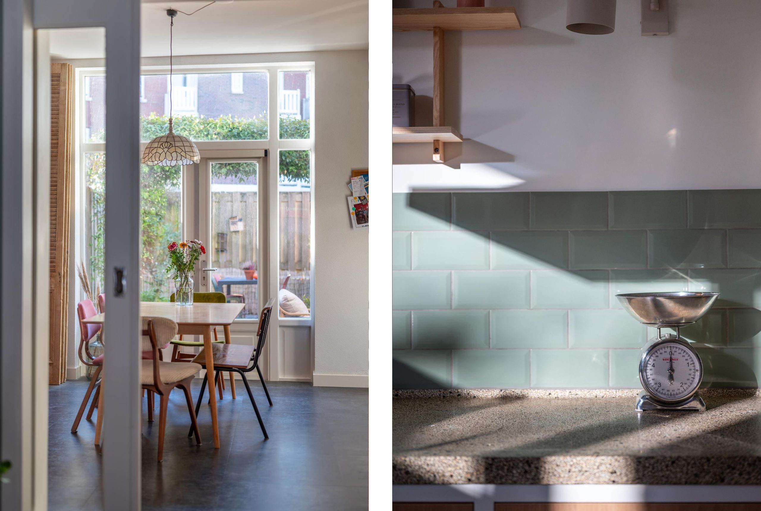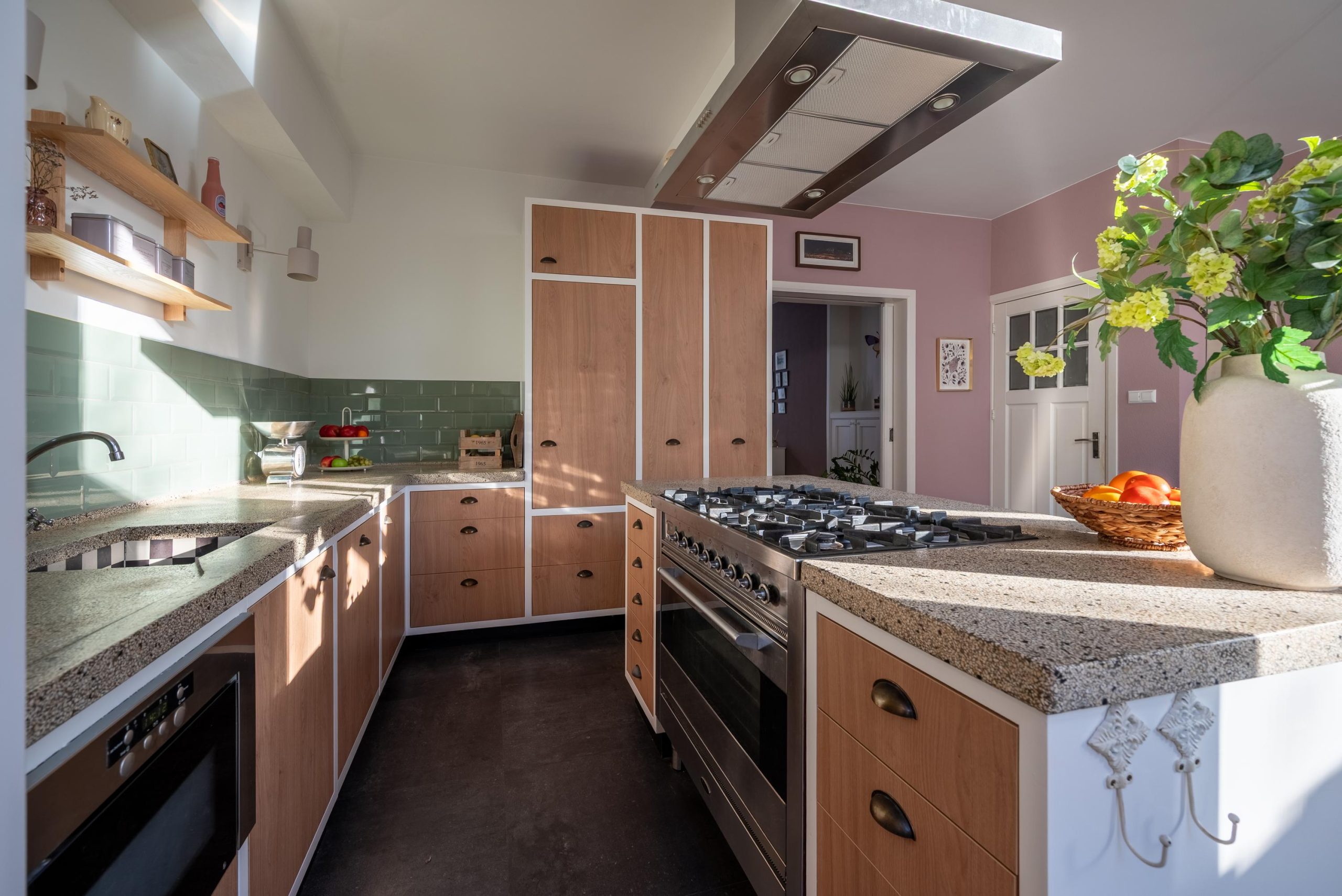 De woonkamer is licht en warm door de grote ramen en de houten vloer, een plek om gezellige samen te zijn. In de leefkeuken is het terrazzo aanrechtblad gecombineerd met houten kastjes en alle moderne gemakken, de vloerverwarming zorgt voor comfort. De ensuite deuren maken het eenvoudig het geluid van de kinderen even buiten te houden. In de zomer gaan de deuren naar de tuin open en vloeien binnen en buiten moeiteloos in elkaar over.