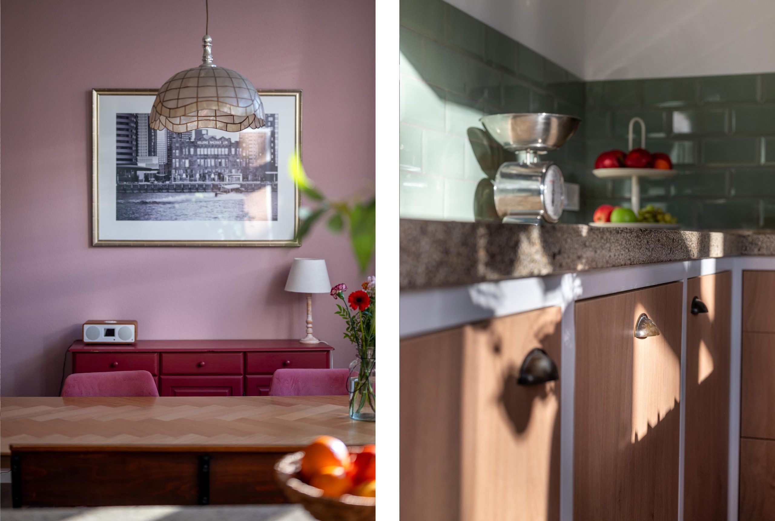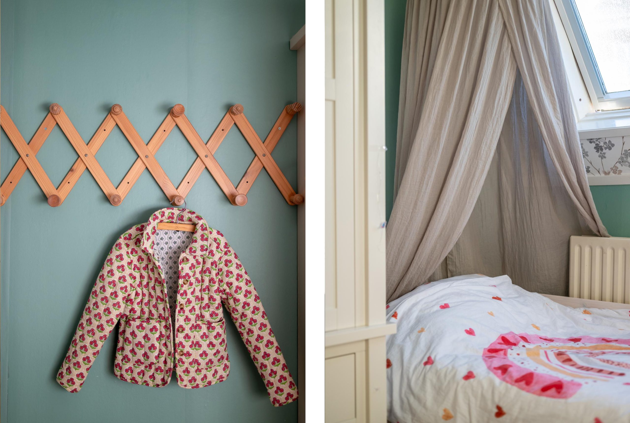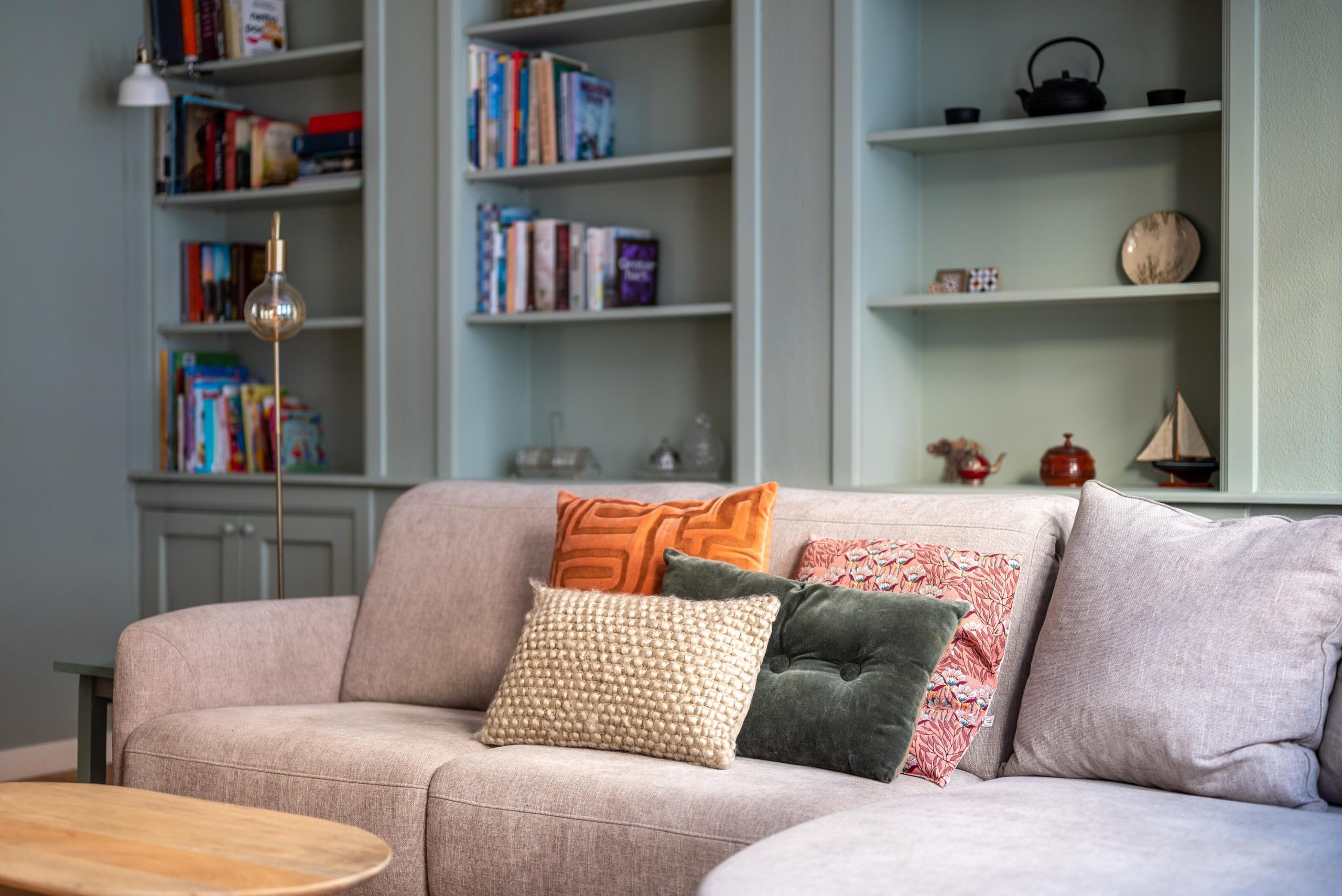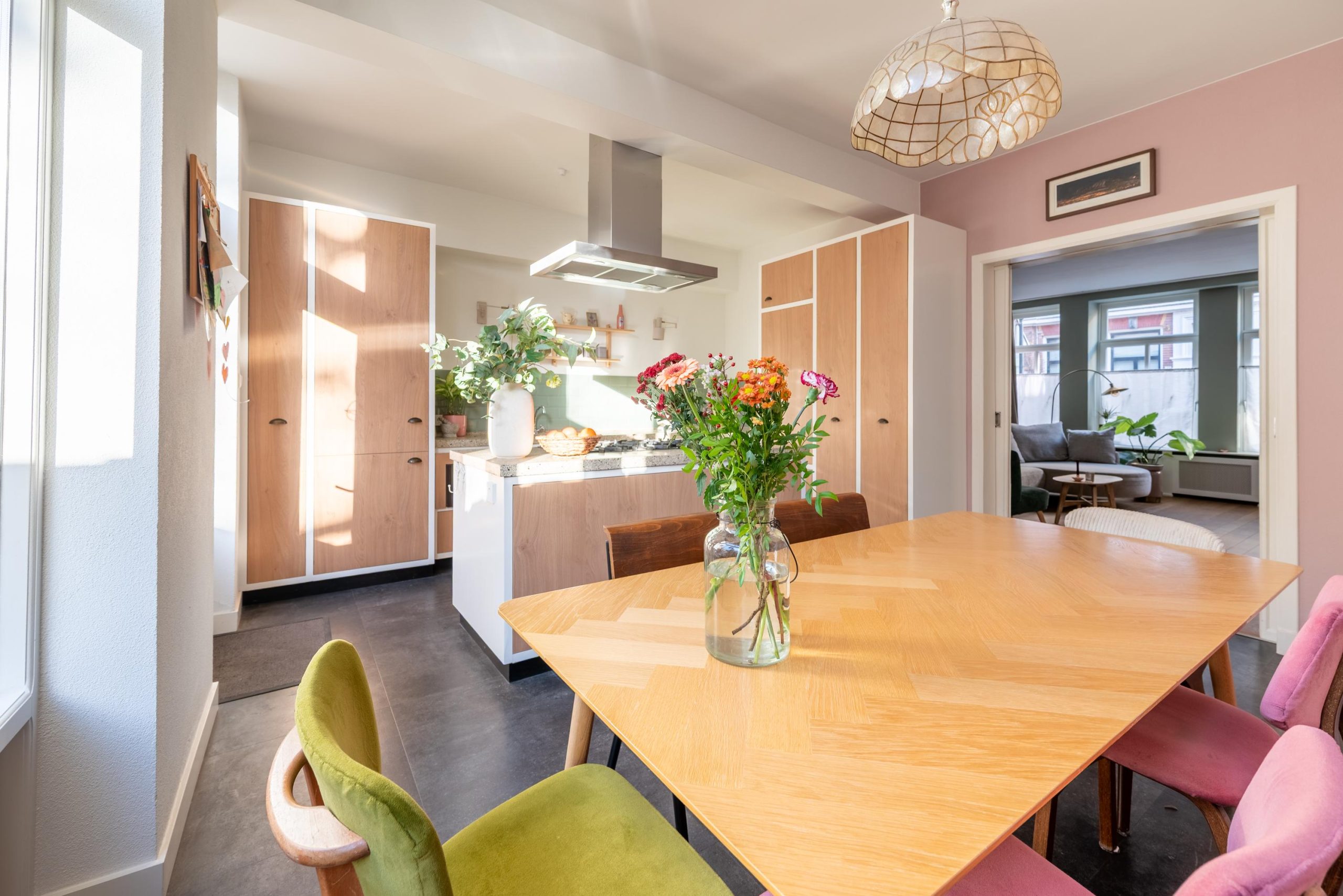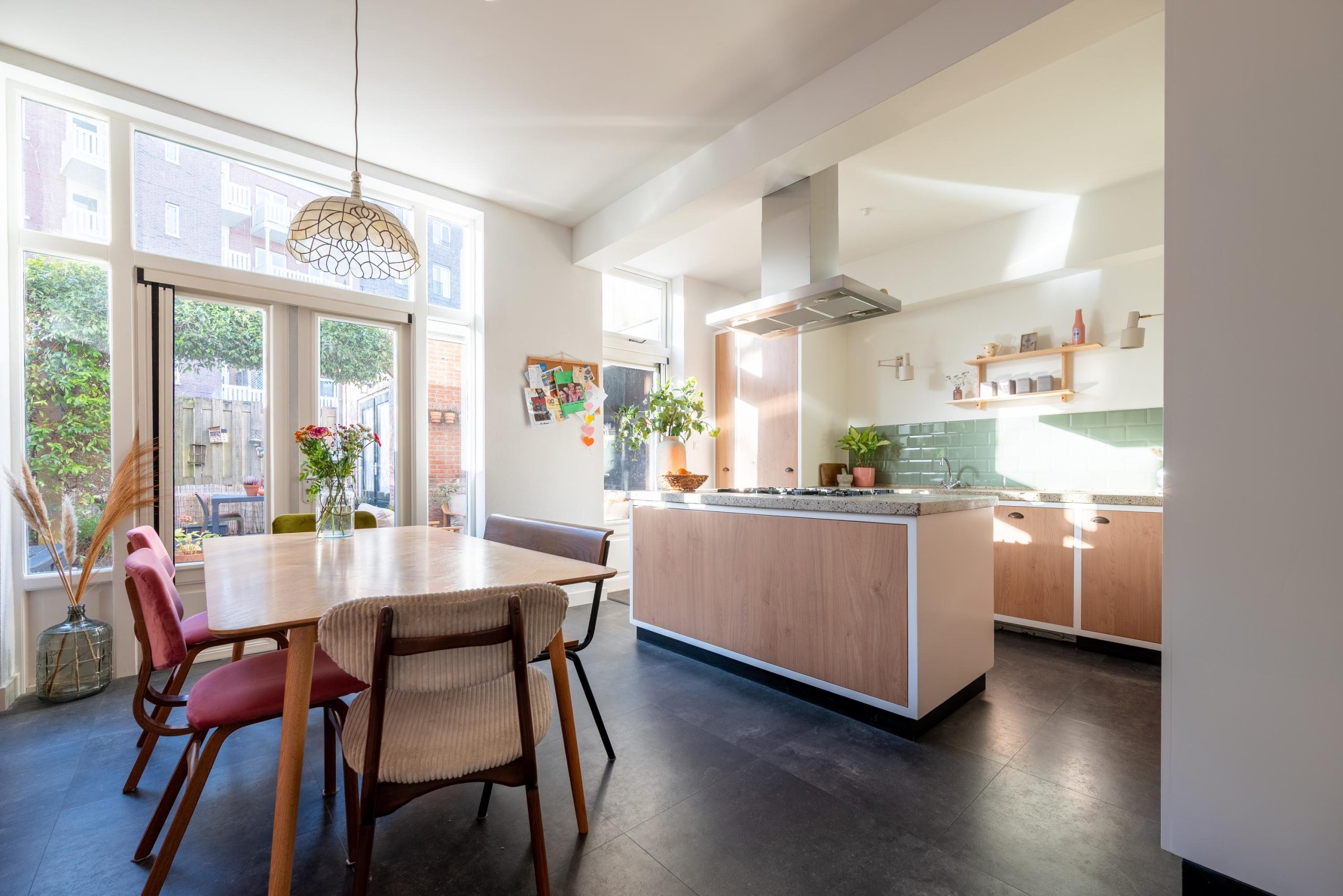 De woonkamer is licht en warm door de grote ramen en de houten vloer, een plek om gezellige samen te zijn. In de leefkeuken is het terrazzo aanrechtblad gecombineerd met houten kastjes en alle moderne gemakken, de vloerverwarming zorgt voor comfort. De ensuite deuren maken het eenvoudig het geluid van de kinderen even buiten te houden. In de zomer gaan de deuren naar de tuin open en vloeien binnen en buiten moeiteloos in elkaar over.