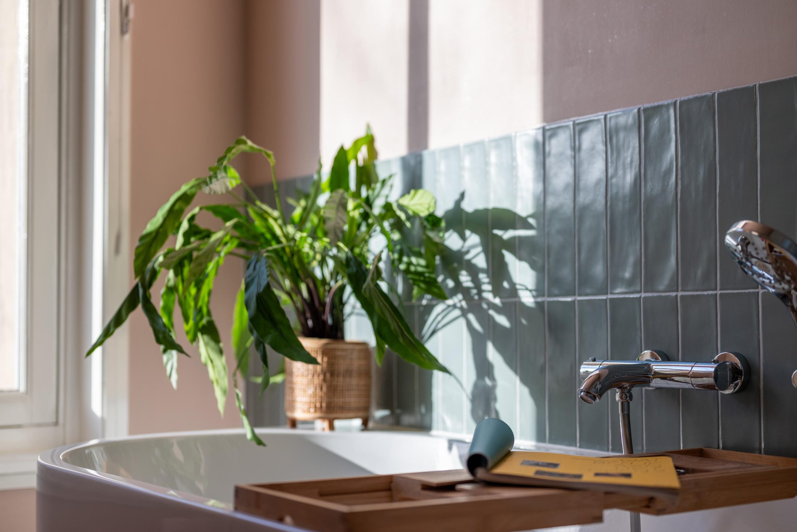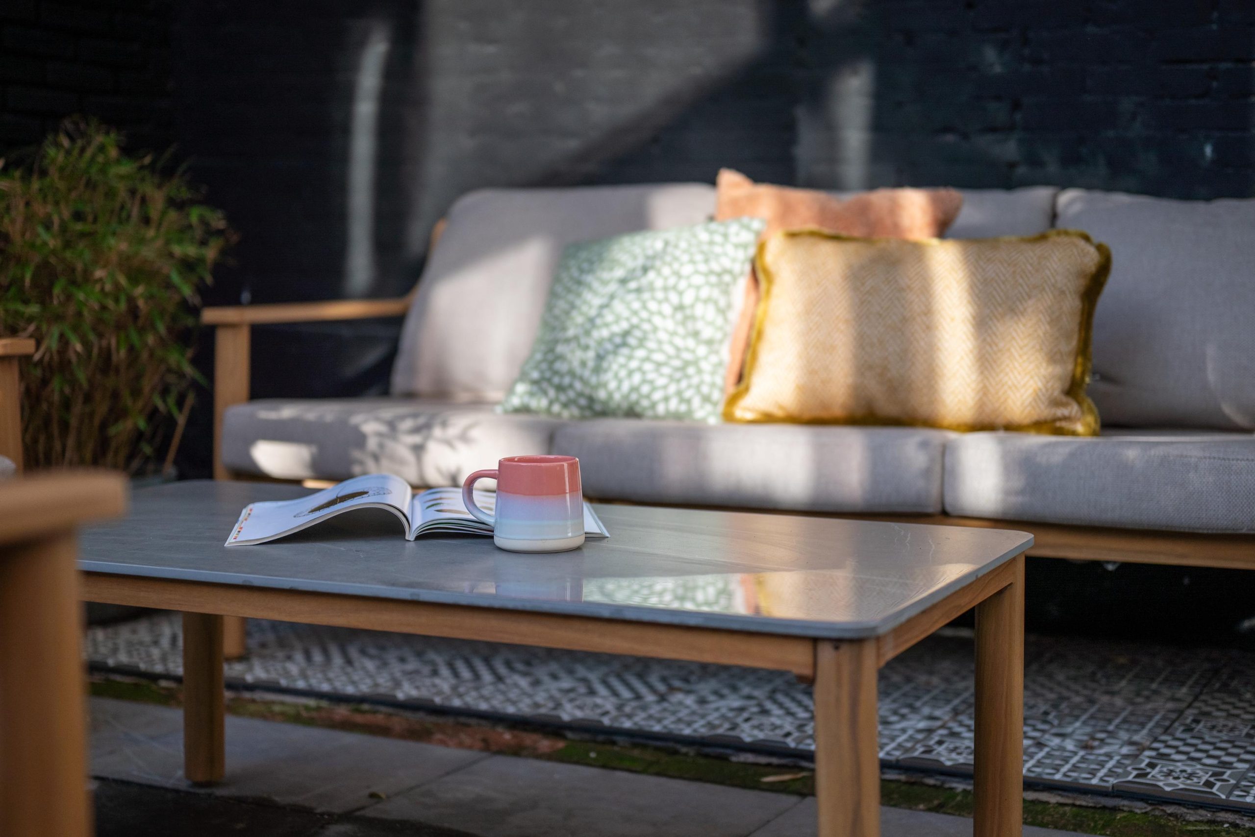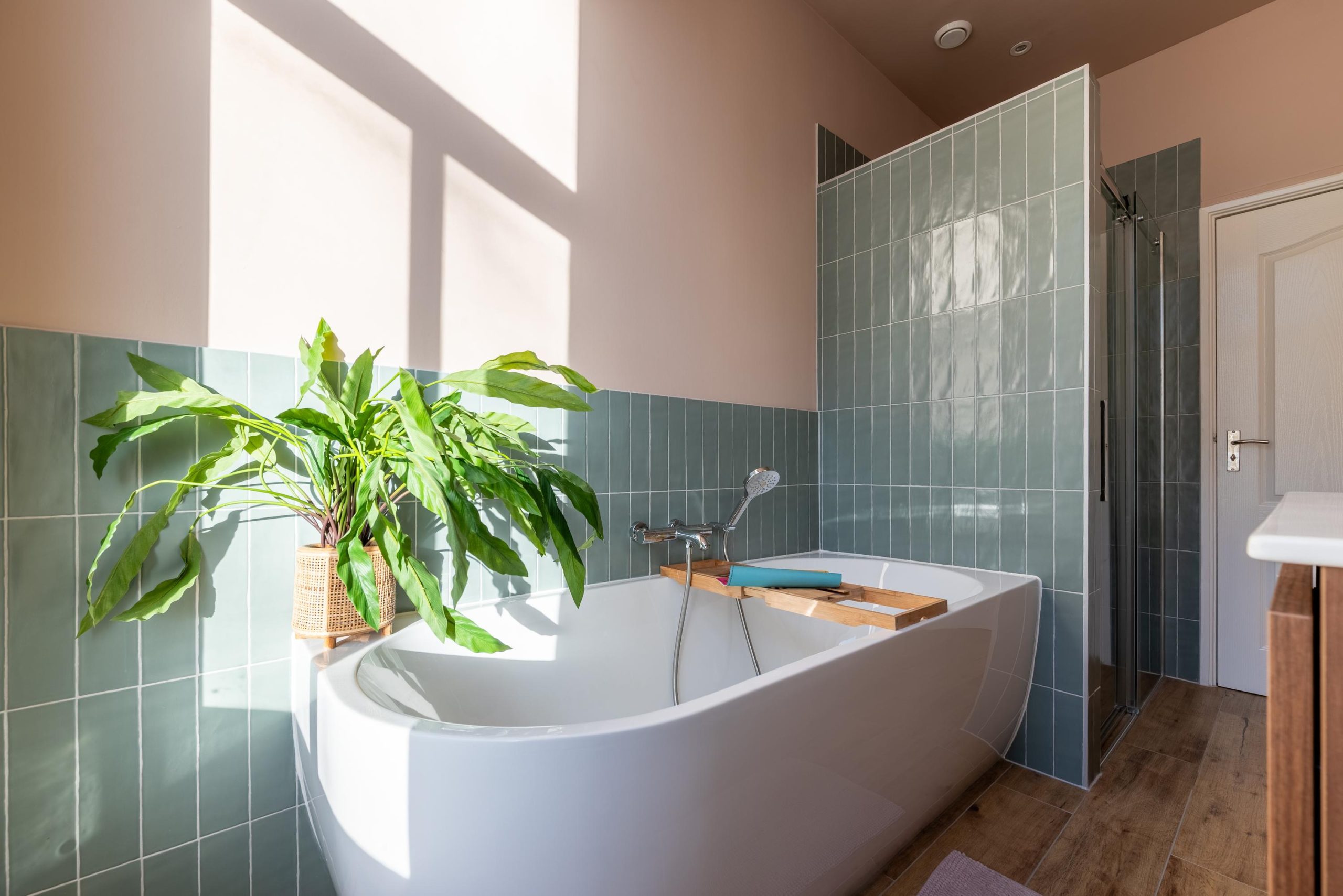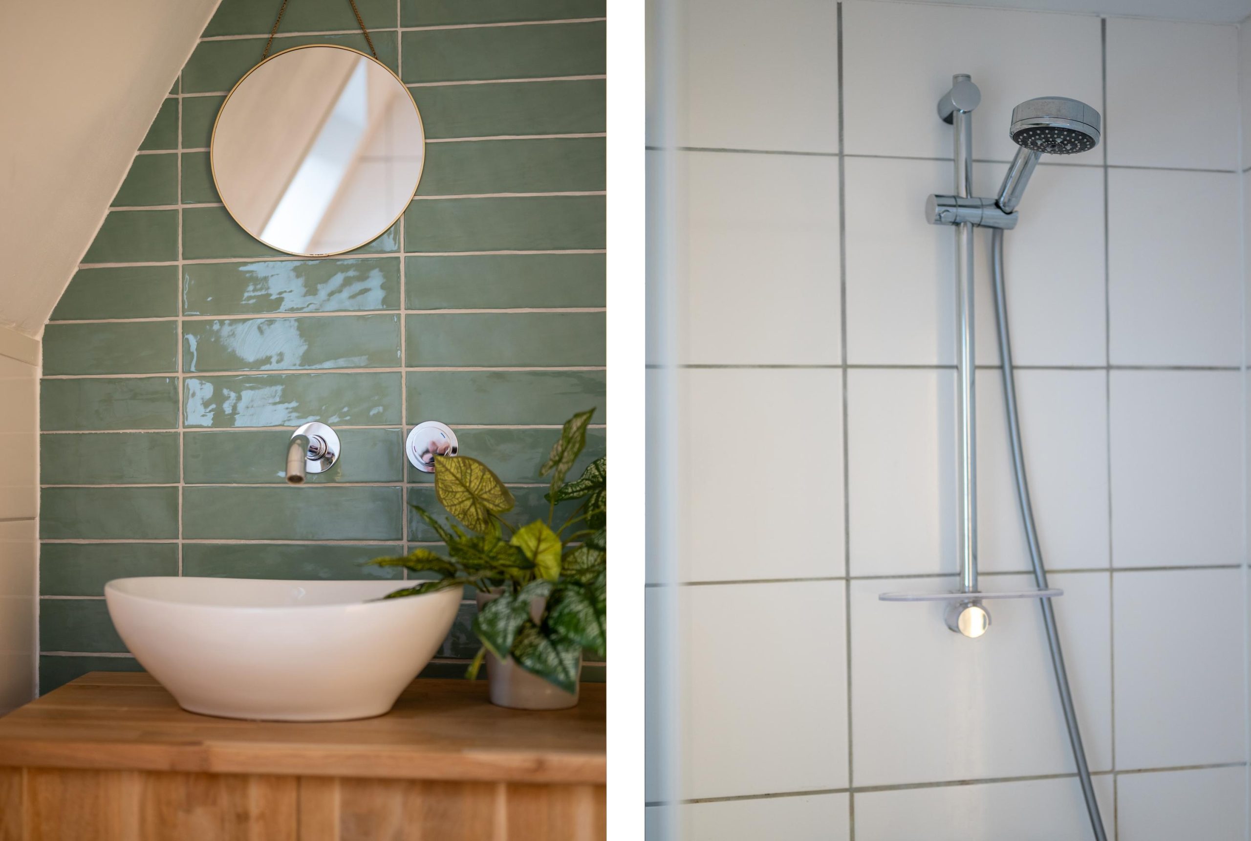 De woonkamer is licht en warm door de grote ramen en de houten vloer, een plek om gezellige samen te zijn. In de leefkeuken is het terrazzo aanrechtblad gecombineerd met houten kastjes en alle moderne gemakken, de vloerverwarming zorgt voor comfort. De ensuite deuren maken het eenvoudig het geluid van de kinderen even buiten te houden. In de zomer gaan de deuren naar de tuin open en vloeien binnen en buiten moeiteloos in elkaar over.