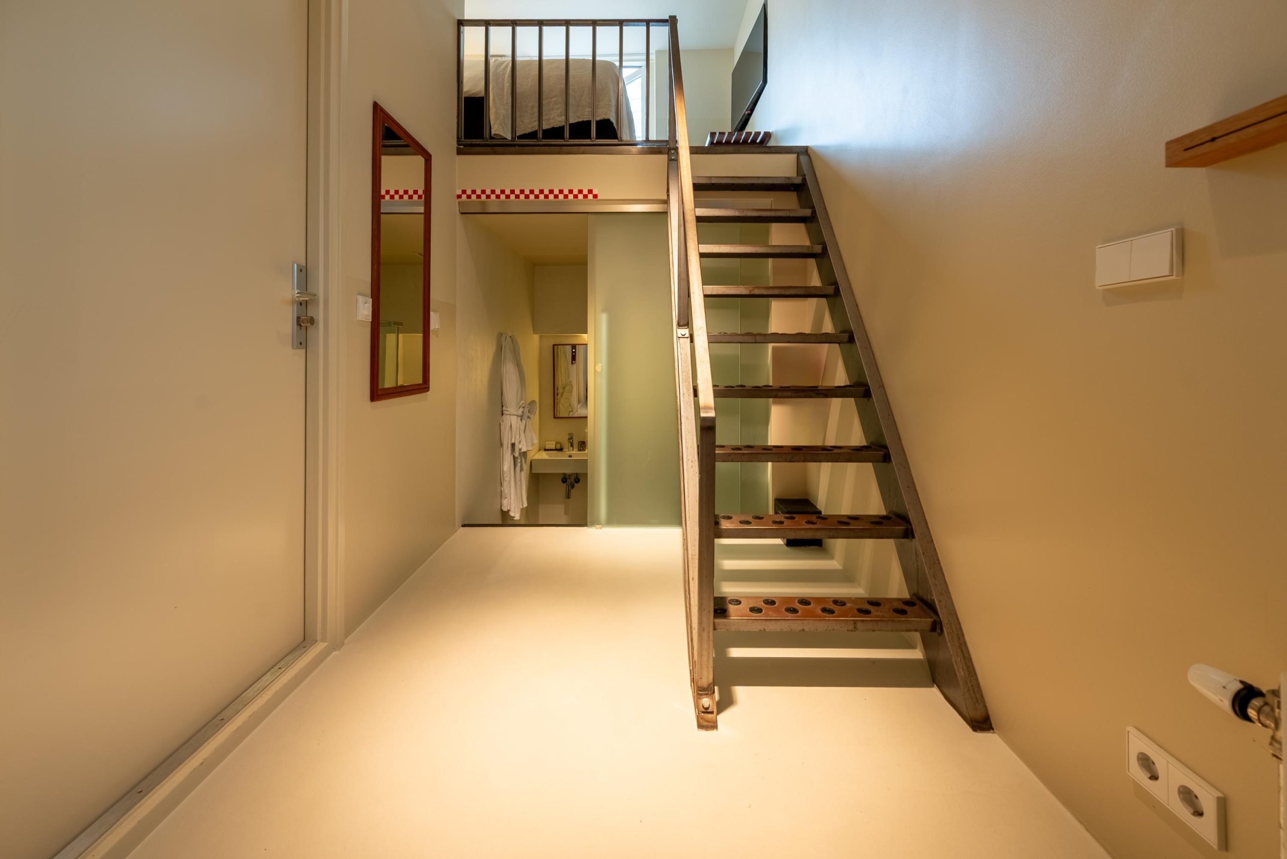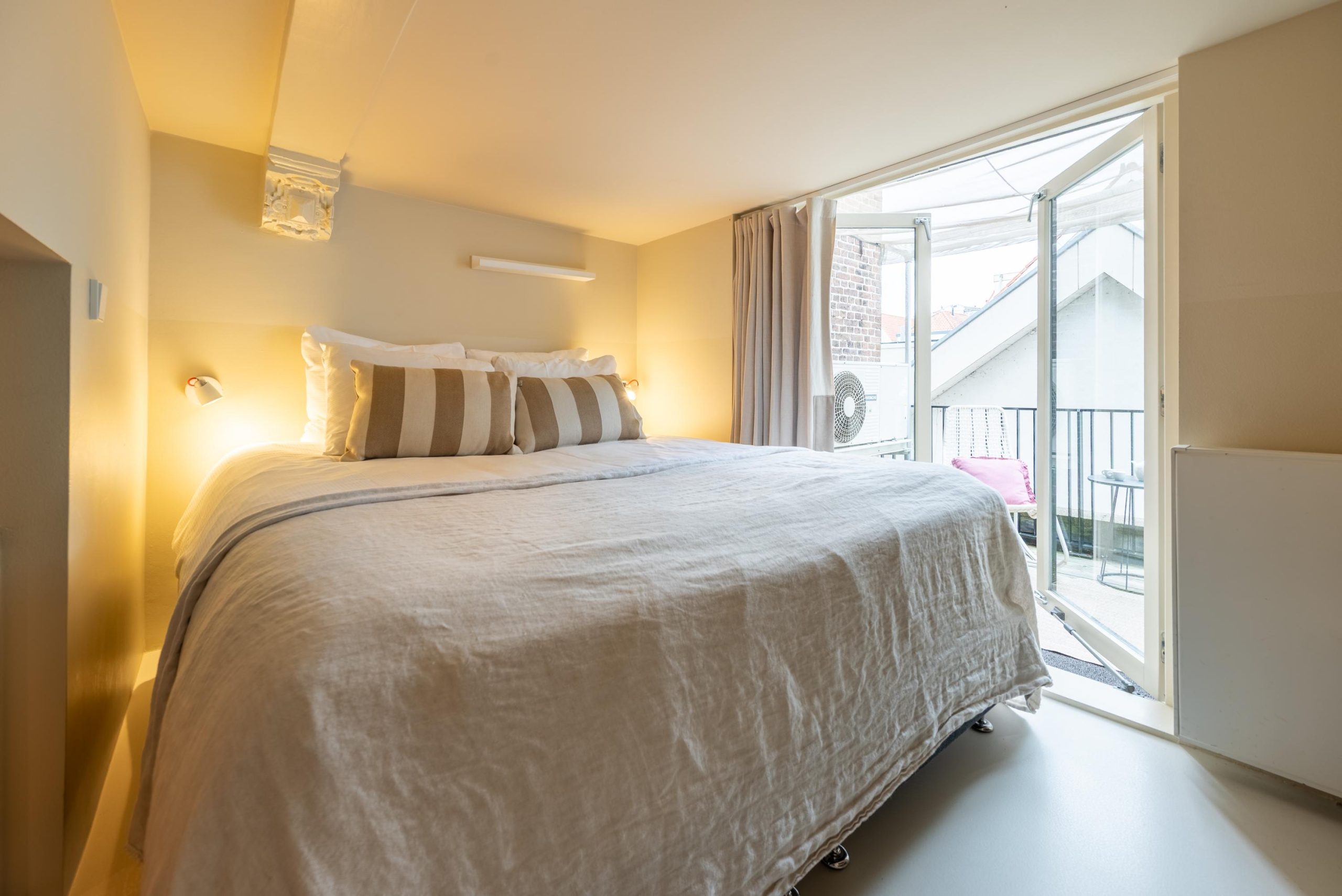 De trap brengt je naar de slaapkamer, waar de wereld vanzelf vertraagt. Het is een lichte, rustige ruimte met genoeg plek voor een groot bed en een flinke kledingkast. En het mooiste: vanuit bed kijk je zó naar buiten, waar de deuren naar het terras uitnodigend openstaan. ’s Ochtends schuif je die deuren open voor een frisse start; ’s avonds kruip je onder de dekens terwijl de stilte van de binnenstad om je heen valt.