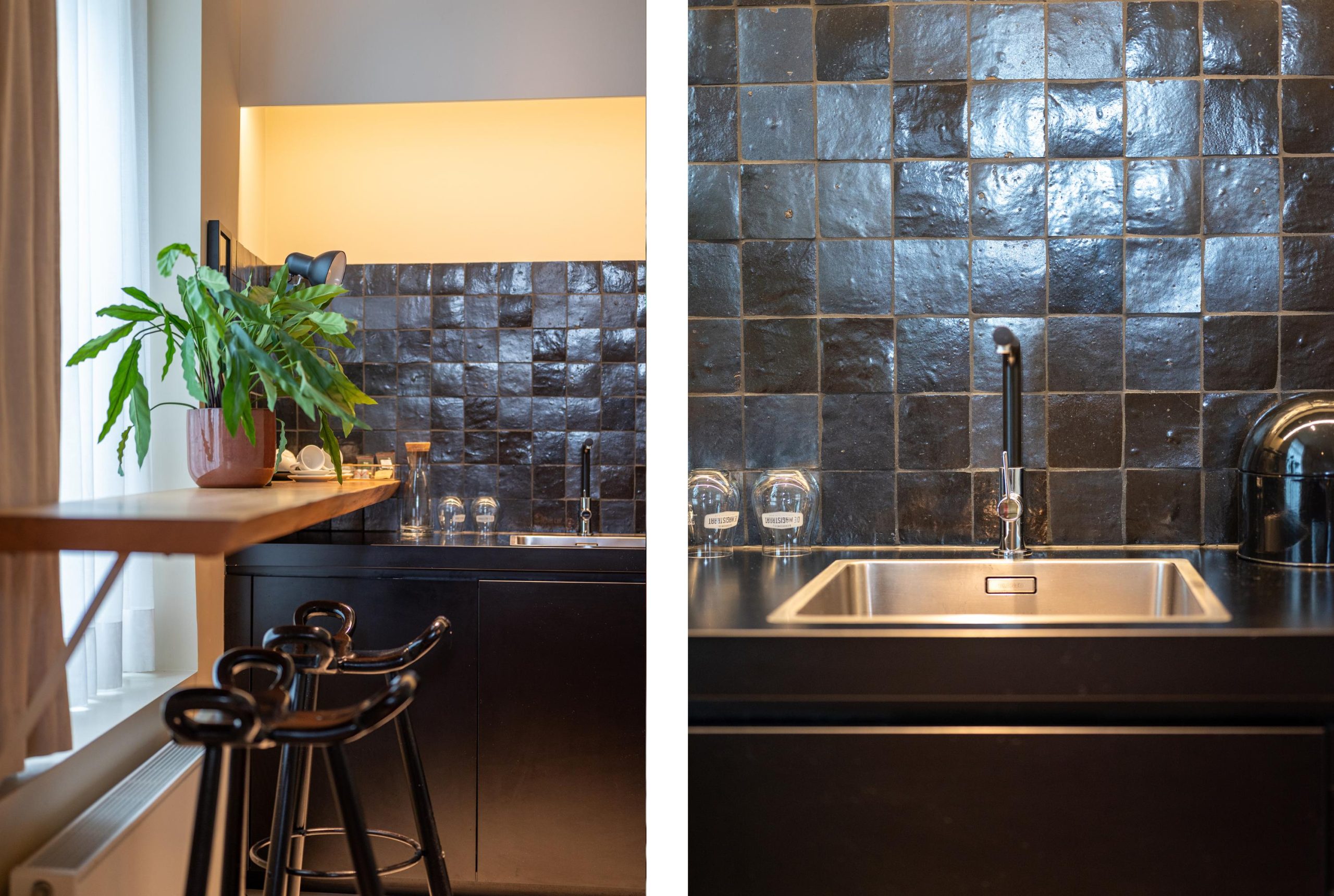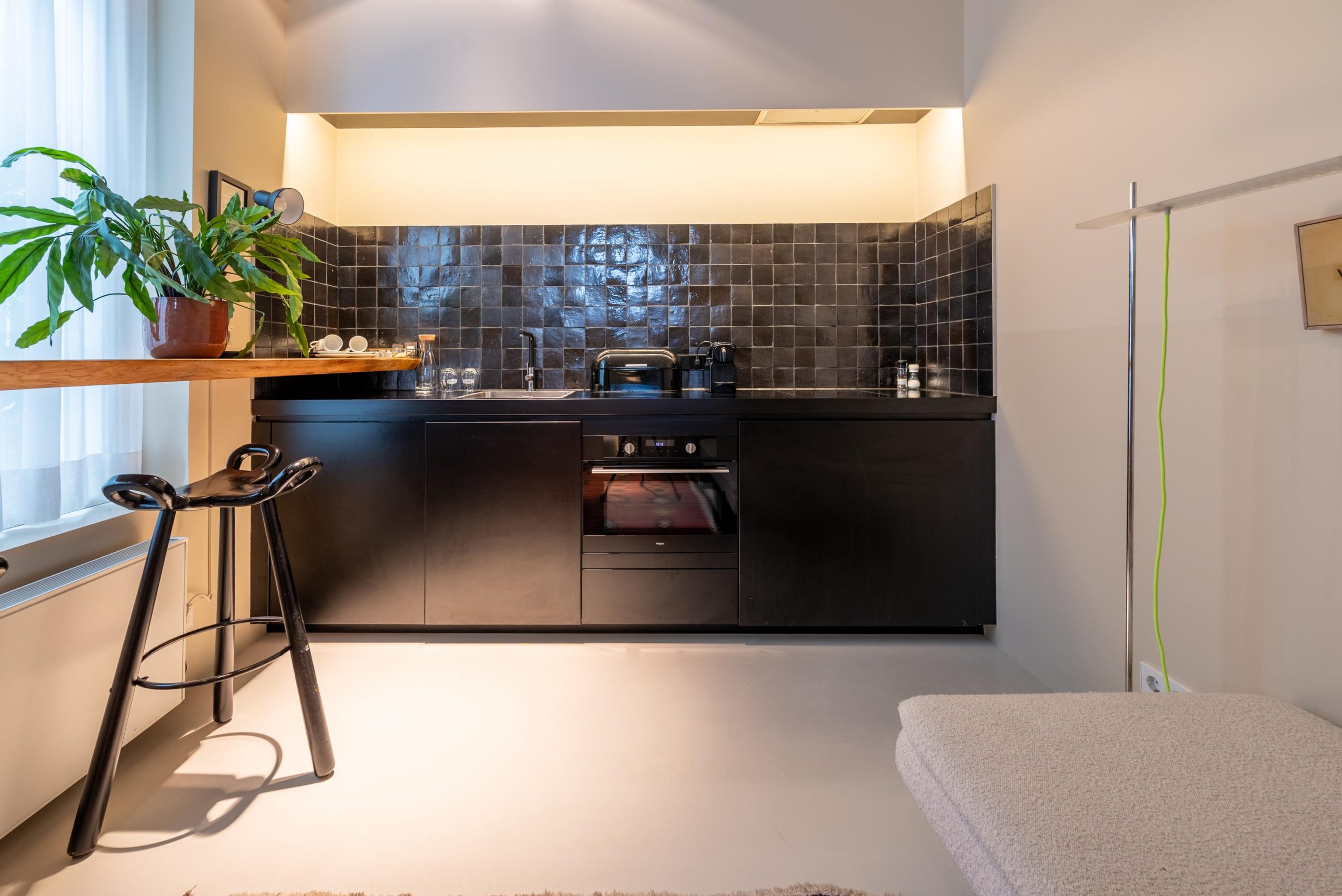 De keuken is compact maar stijlvol, met mooie donkere tegels die rust en luxe uitstralen. Terwijl je staat te koken, kijk je uit over de woonkamer en voel je hoe alles hier precies klopt: intiem, maar nooit benauwd.