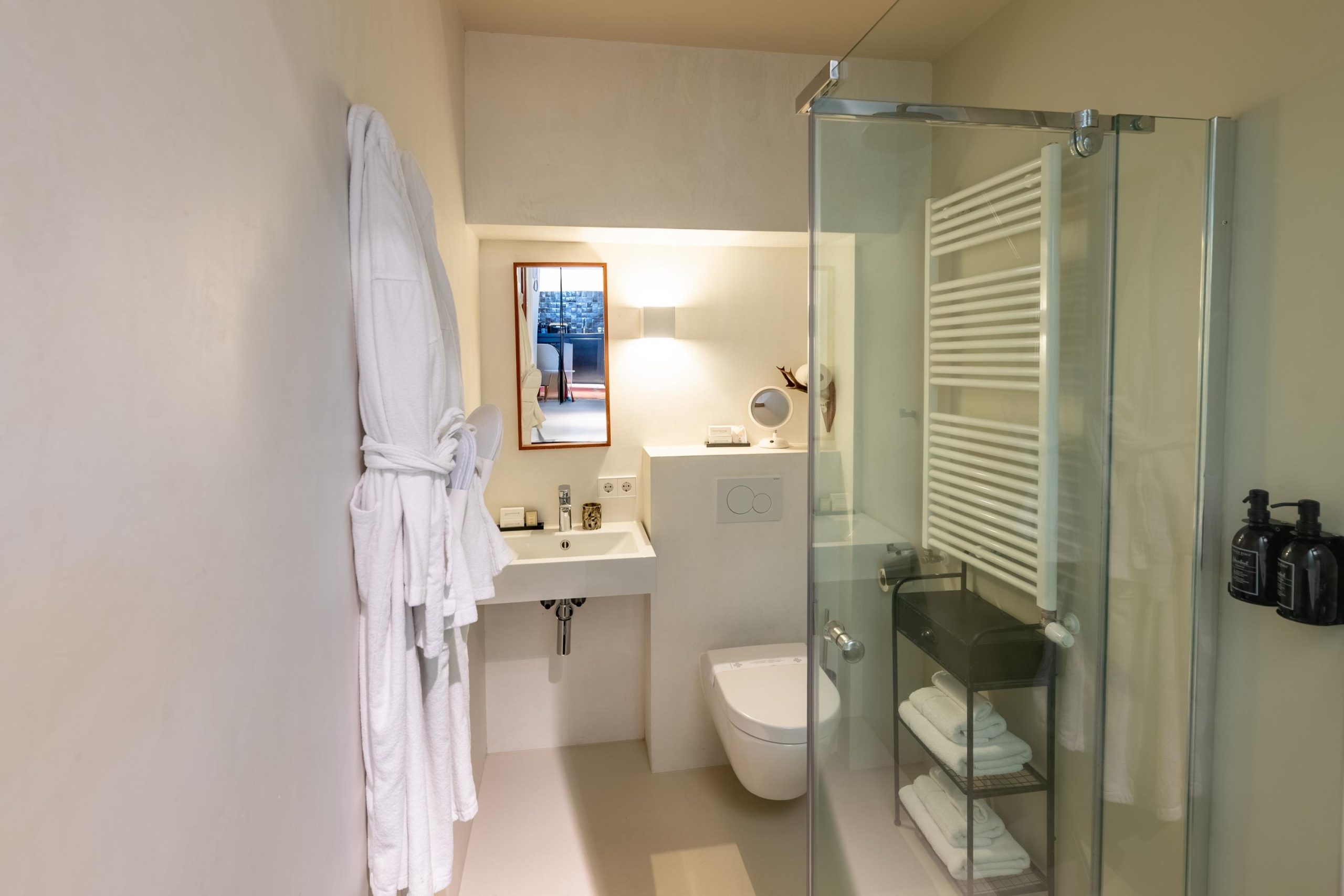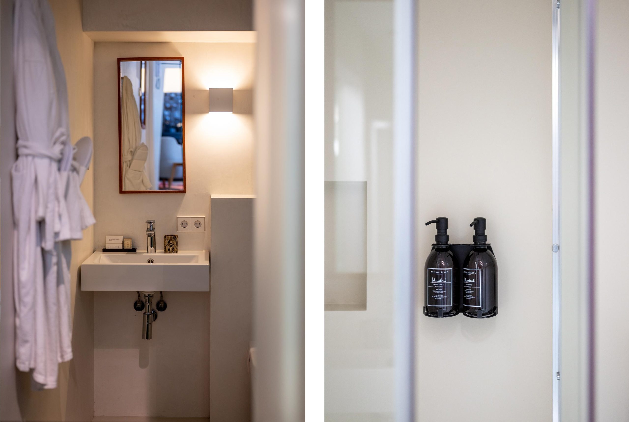 De badkamer sluit helemaal aan op die serene sfeer. Fris, licht, praktisch én precies voldoende om je dag goed te beginnen. Een warme douche, zachte badjas, kop koffie — meer heeft een ochtend eigenlijk niet nodig.