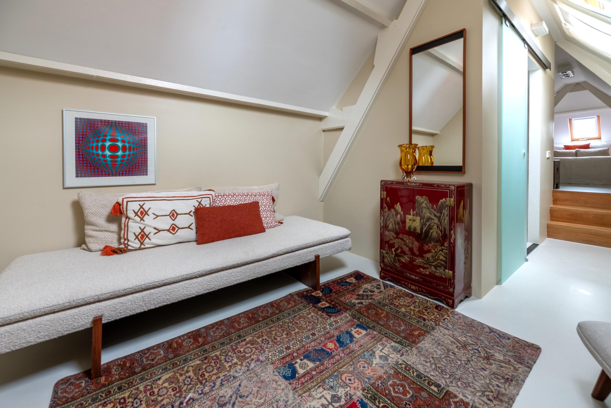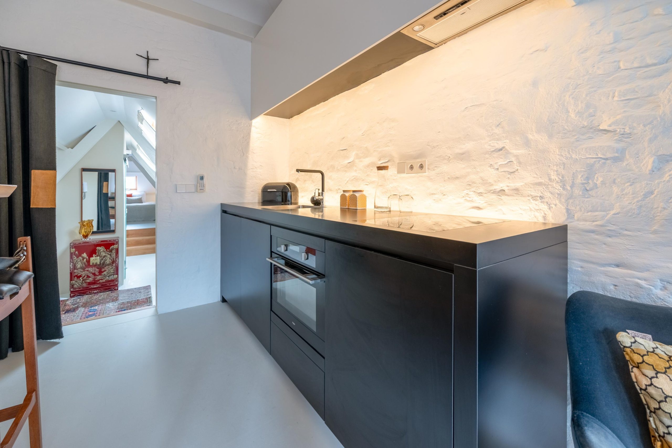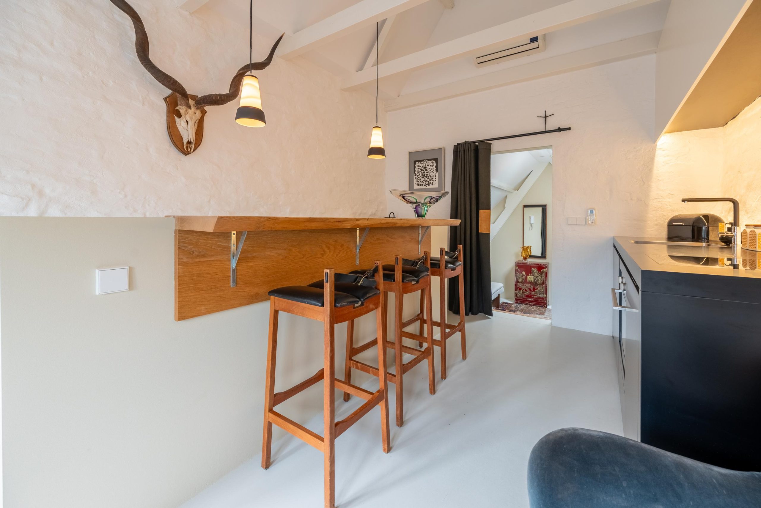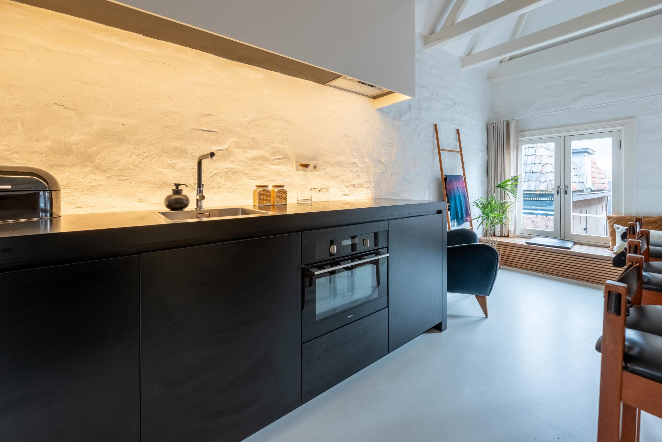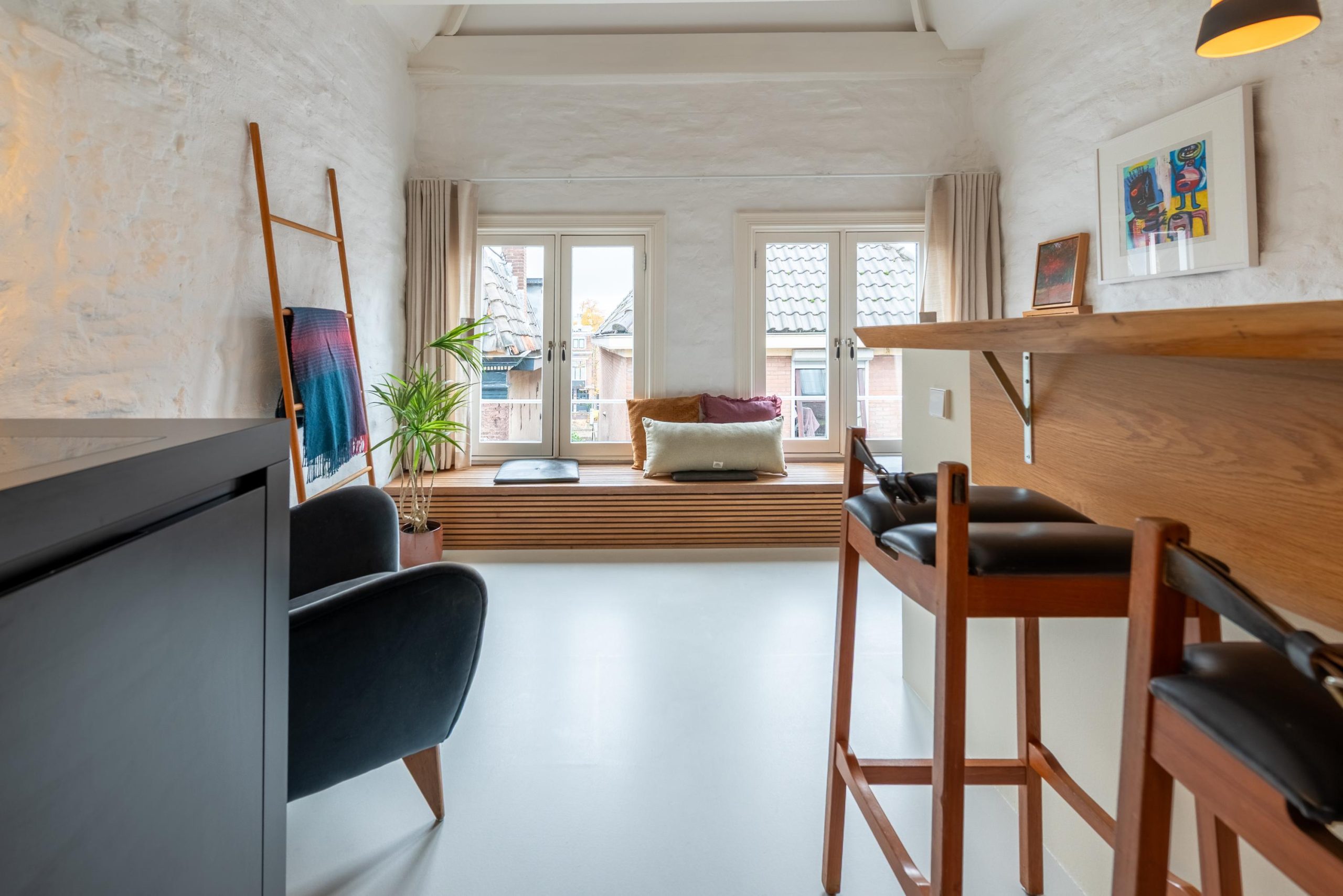 Je loopt de Weessteeg in, stapt het portiek binnen, loopt de trap omhoog. Sleutel om, deur open en zodra je ’m achter je dichttrekt, valt de rust. Binnen is het licht en rustig. In de keuken zet je snel iets lekkers klaar en schuif je aan de bar, een fijne plek voor koffie in de ochtend of een glas wijn aan het eind van de dag. Later ga je zitten met een boek op de raambank en kijk je uit over de Langendijk, met boetiekjes en levendigheid op een paar stappen afstand.