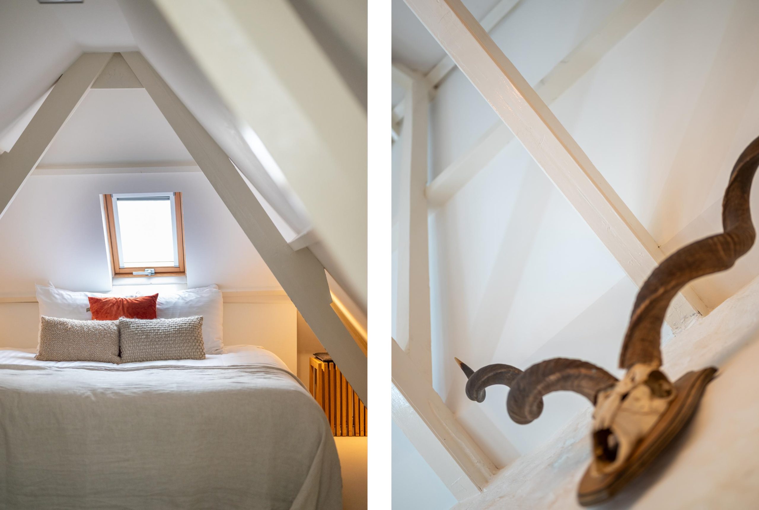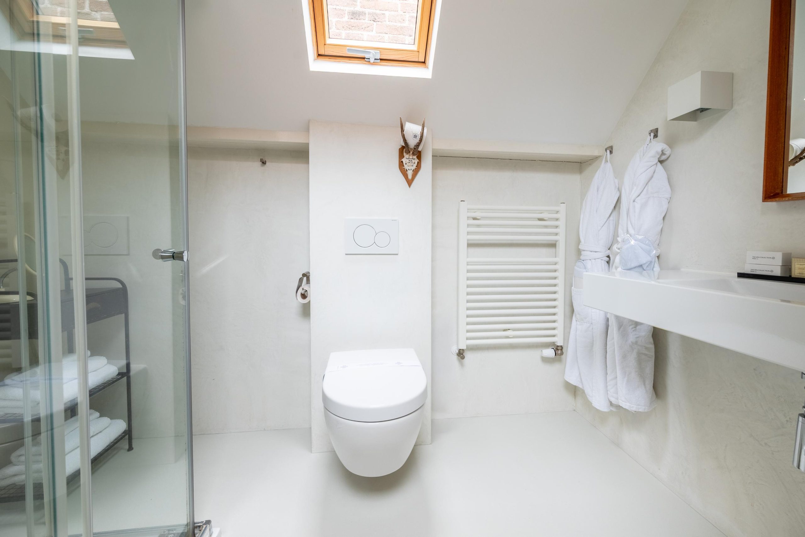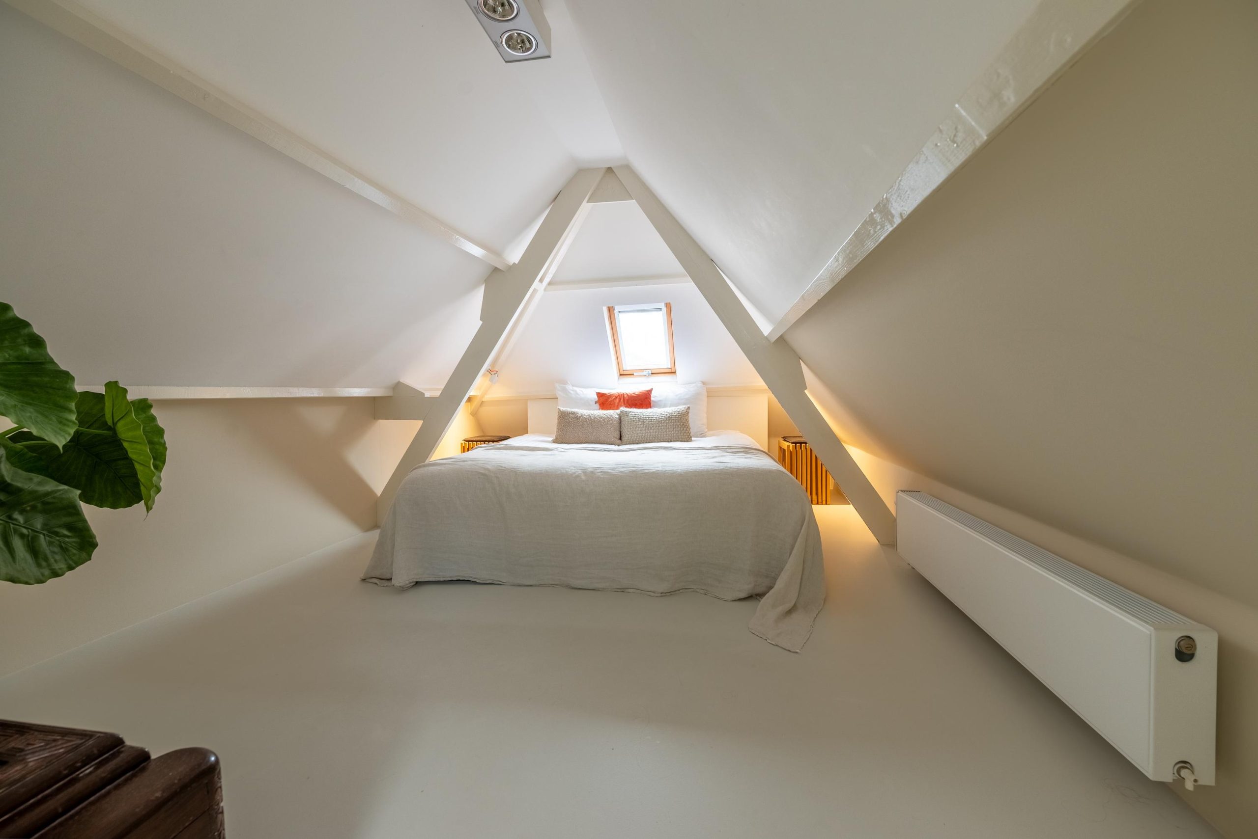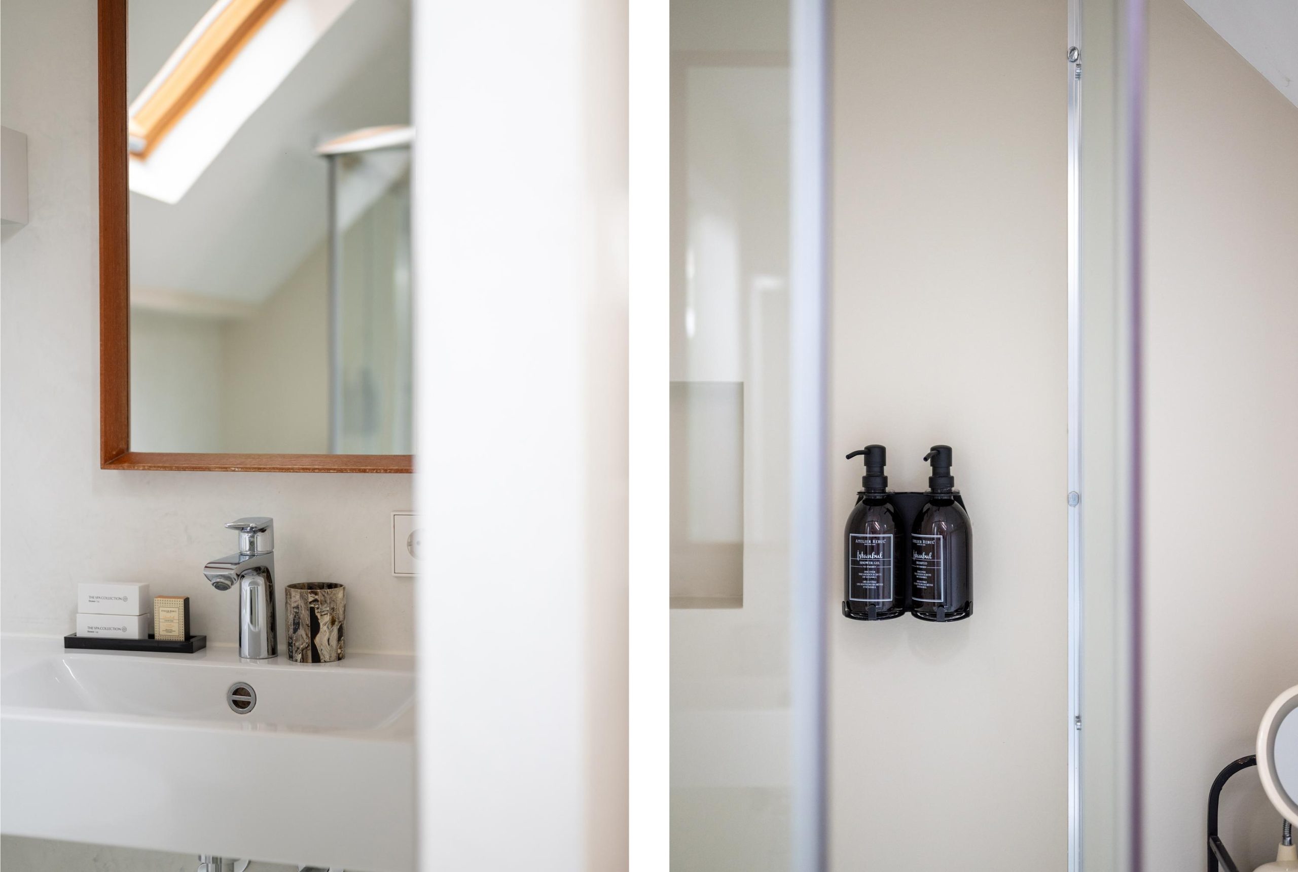 Als het tijd is om te slapen, loop je een paar treden omhoog naar het knusse slaapgedeelte onder de kap. Voor je onder de dekens kruipt, stap je nog even de badkamer in: compact en netjes, met daglicht dat via het dakraam naar binnen valt. Even opfrissen, de douche aan, en daarna is het alsof de stad ineens ver weg is.