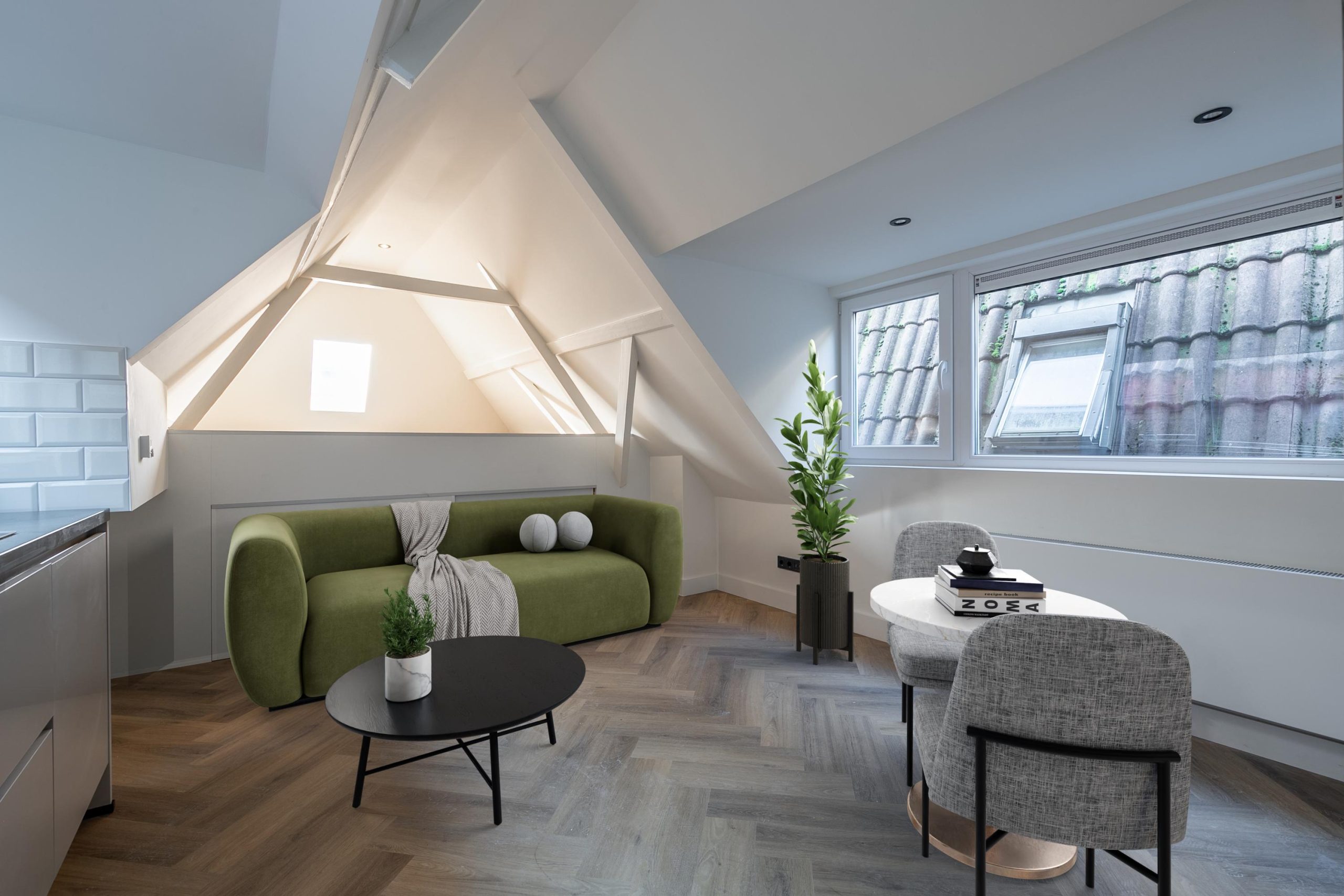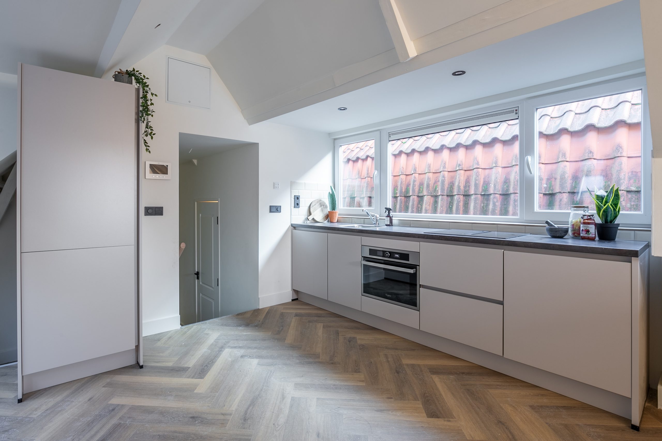 Via de kleine trapopgang kom je in je studio. Dankzij de raampartijen is het hier heerlijk licht. De lichte, moderne keuken is voorzien van alle gemakken die je nodig hebt, zoals een koelkast, vriezer, vaatwasser, inductiekookplaat met geïntegreerde afzuiging en een combi oven/magnetron. Een nieuw begin wacht op je! Deze woning is volledig instapklaar. Alles is tot in de puntjes verzorgd en geniet van een stijlvolle en comfortabele leefruimte. Hoe ga jij deze toffe ruimte inrichten?