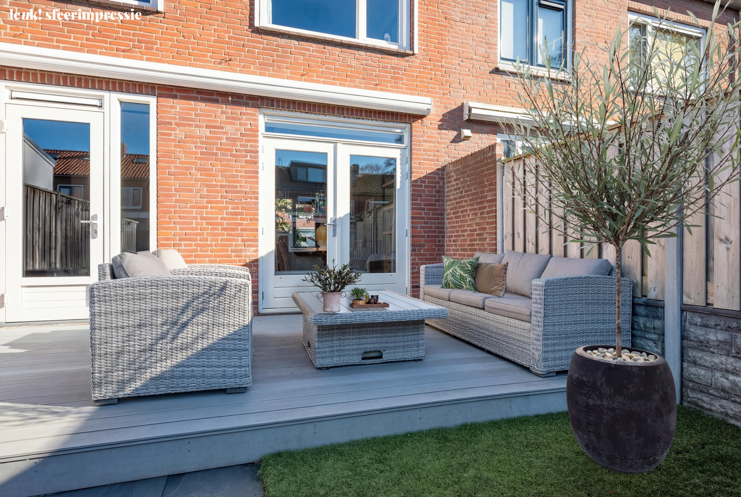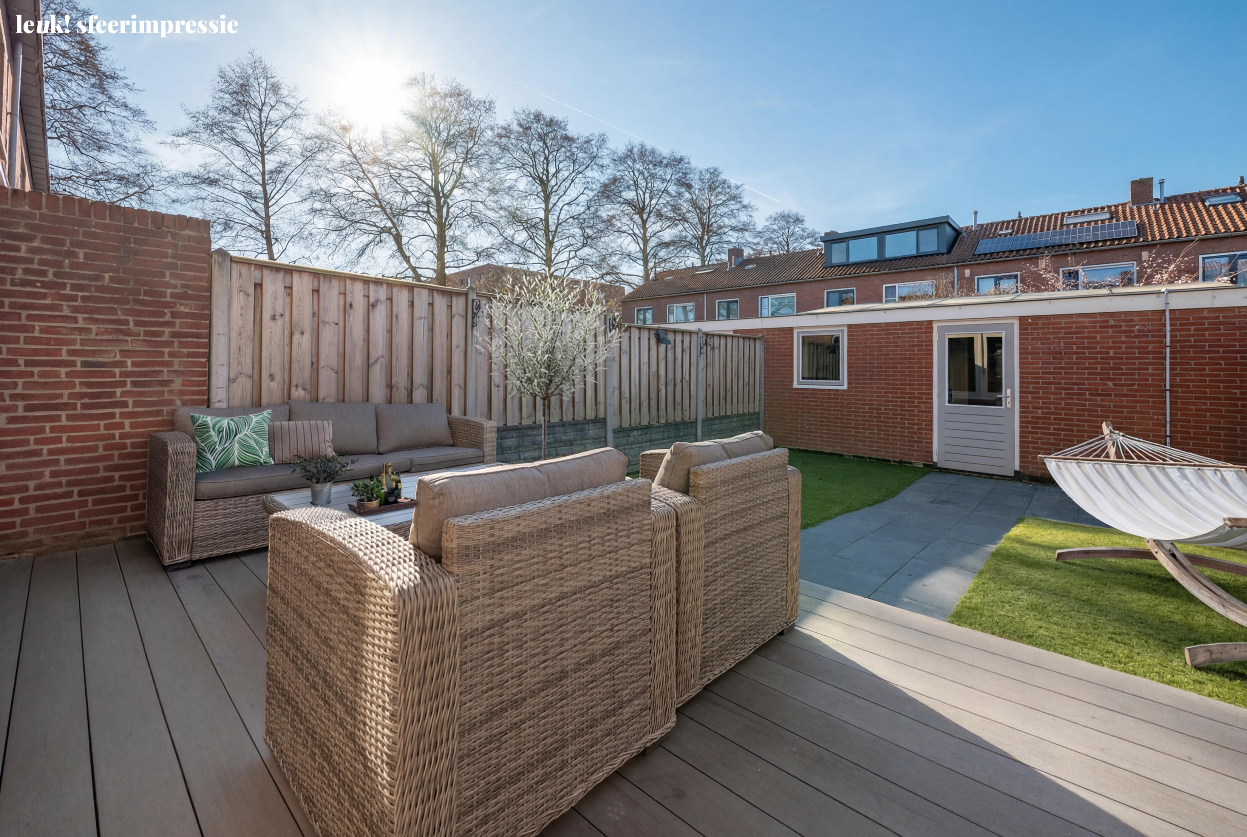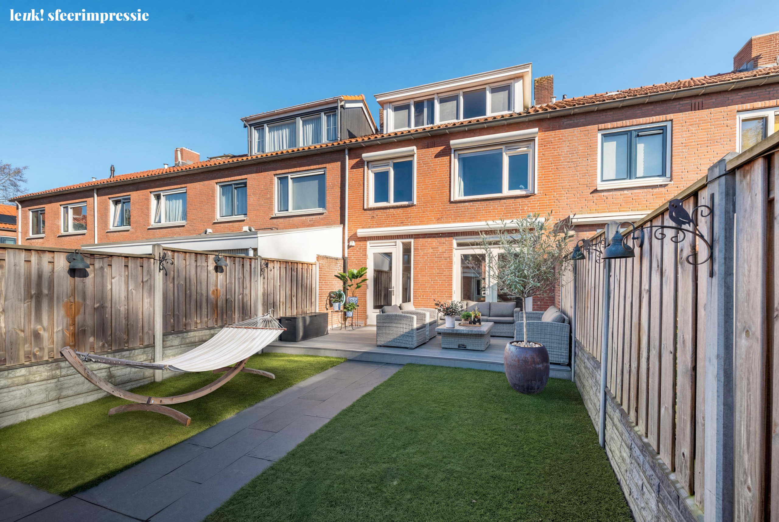 Via de achterdeur stap je de verzorgde achtertuin in, een fijne plek om buiten te zitten, te loungen of juist gezellig te eten met vrienden en familie. De combinatie van terras en groen zorgt voor een prettige balans tussen sfeer en gemak. Achterin de tuin bevindt zich een ruime berging, ideaal voor fietsen, tuingereedschap en extra opslag.