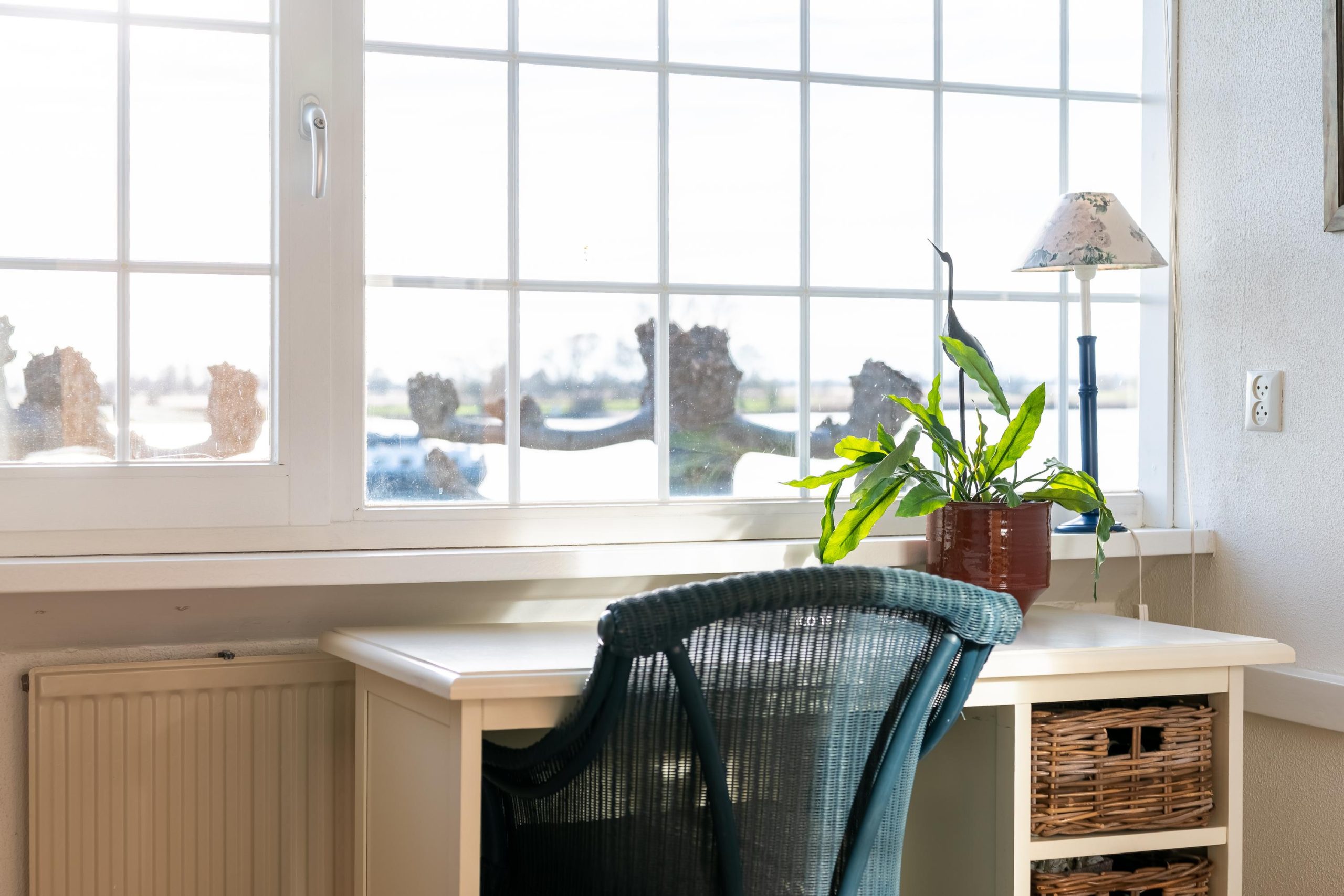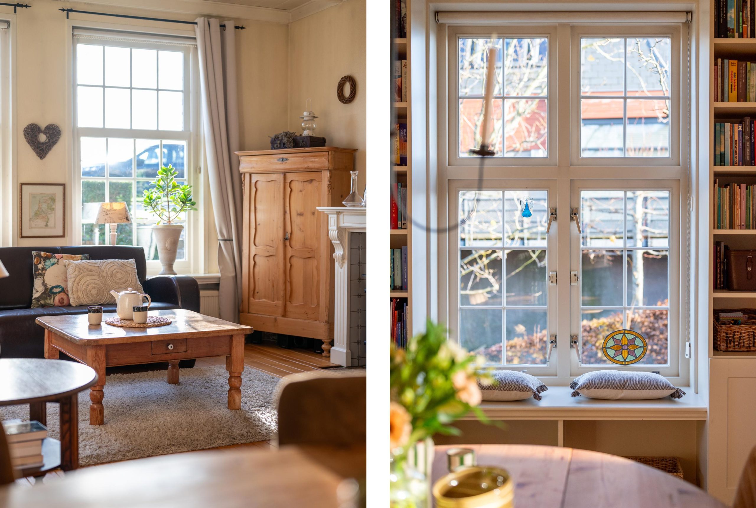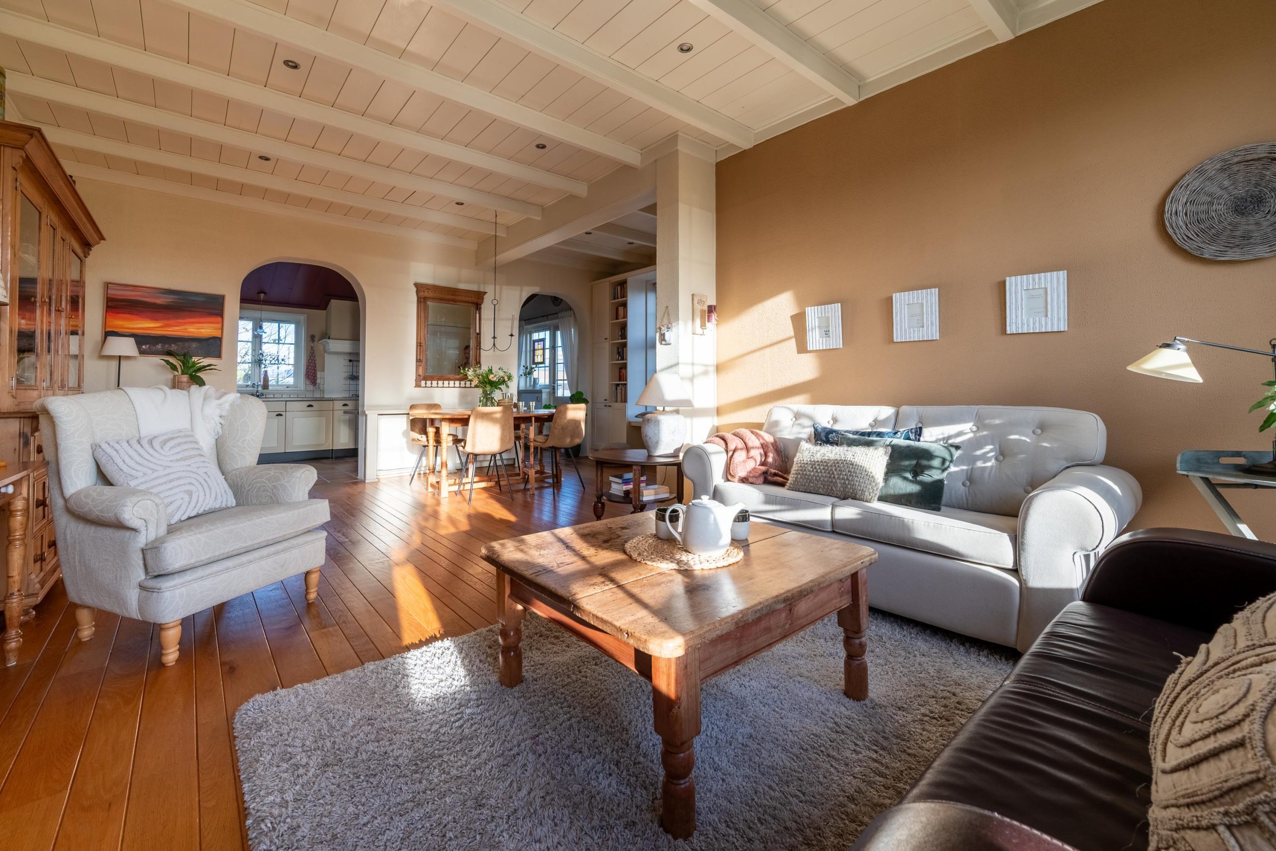 Aan de Rivierdijk 663 in Hardinxveld-Giessendam voelt elke dag als een vakantie. De woonkamer met massief eikenhouten vloer is een warm welkom. De houtkachel knispert, boeken worden verslonden en kopjes thee gedronken. De zon schijnt hier het grootste deel van de dag naar binnen en de geruite ramen zorgen voor een sfeervol lichtspel. De balken aan het plafond geven de ruimte nét dat beetje extra karakter.