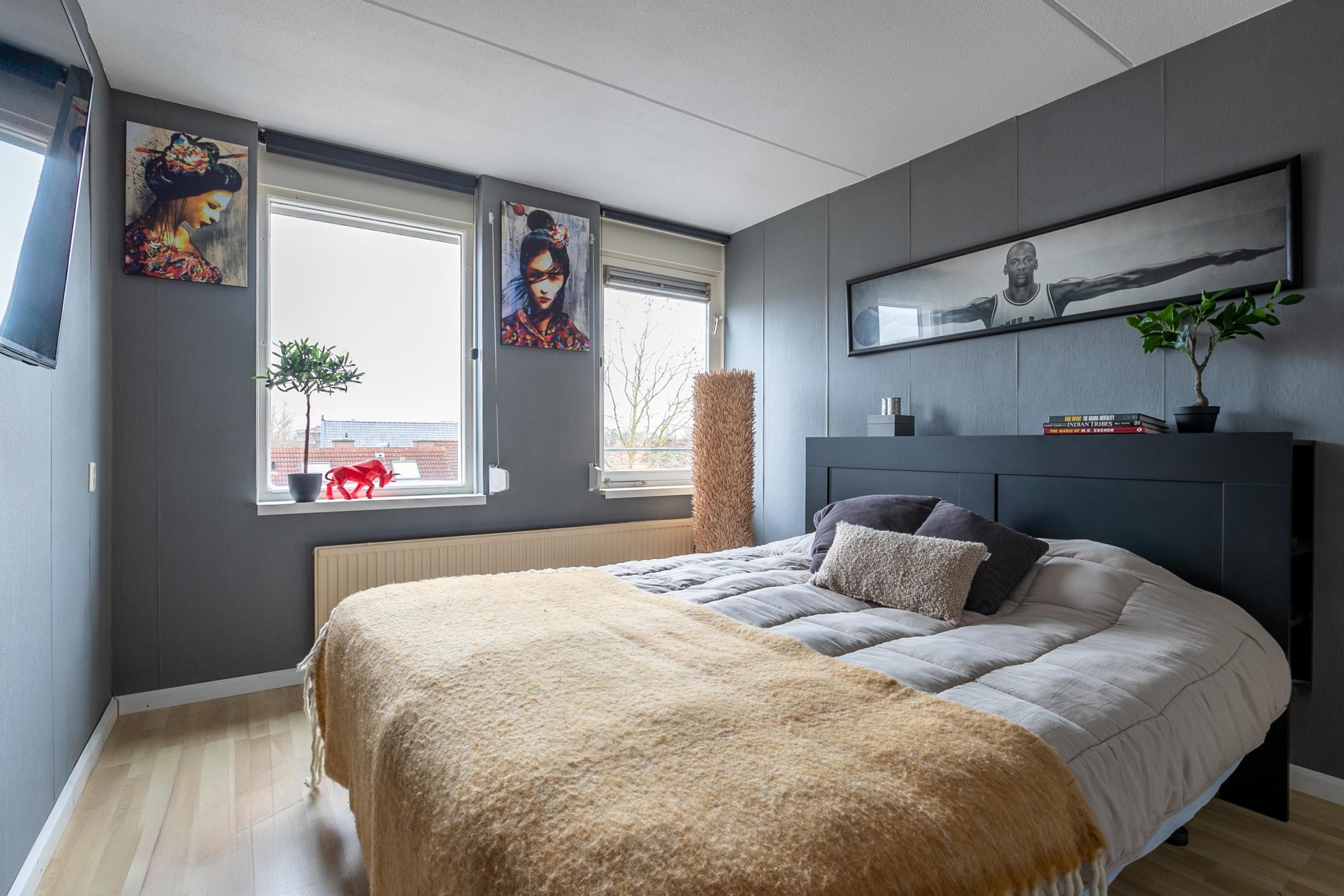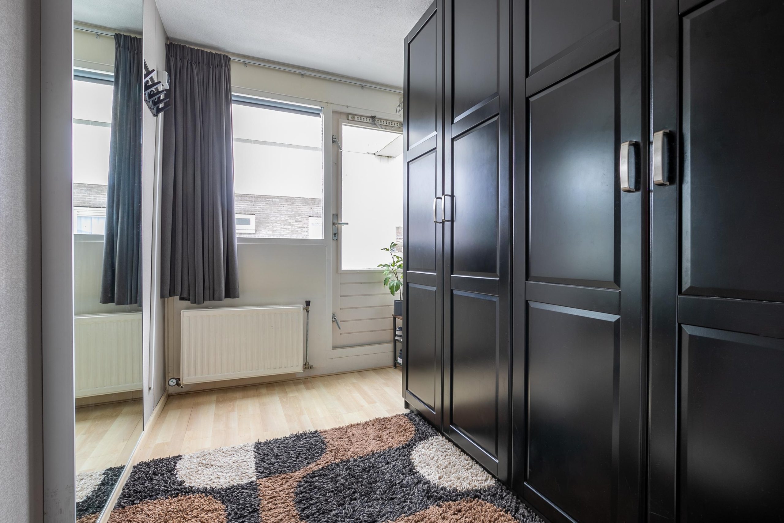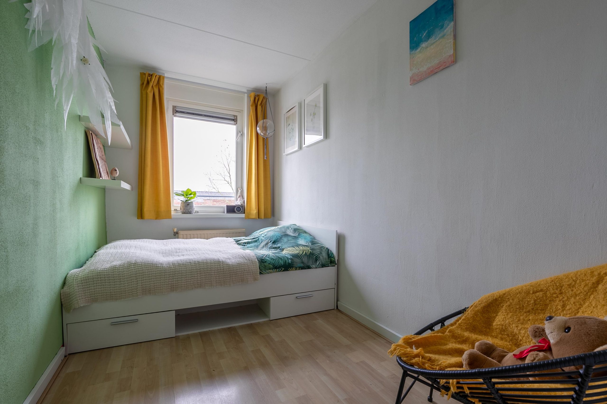 Op de bovenverdieping vind je drie slaapkamers, elk met hun eigen karakter. De master bedroom is ruim opgezet, zodat er met gemak een kingsize bed in past, en is bovendien voorzien van airconditioning, heerlijk op warme zomerdagen. De tweede slaapkamer doet nu dienst als kinderkamer, een knusse plek met voldoende ruimte om te spelen of te ontspannen. Beide kamers zijn uitgerust met rolluiken, zodat je ’s nachts in alle rust kunt slapen. De derde kamer is momenteel ingericht als kastenkamer, maar leent zich ook uitstekend als werkkamer of logeerkamer. Vanuit deze ruimte stap je via de deur het balkon op, waar je een prachtig uitzicht hebt op de kerktoren. Op zomerse dagen is het hier goed toeven met een boek of een verkoelend drankje in de hand.