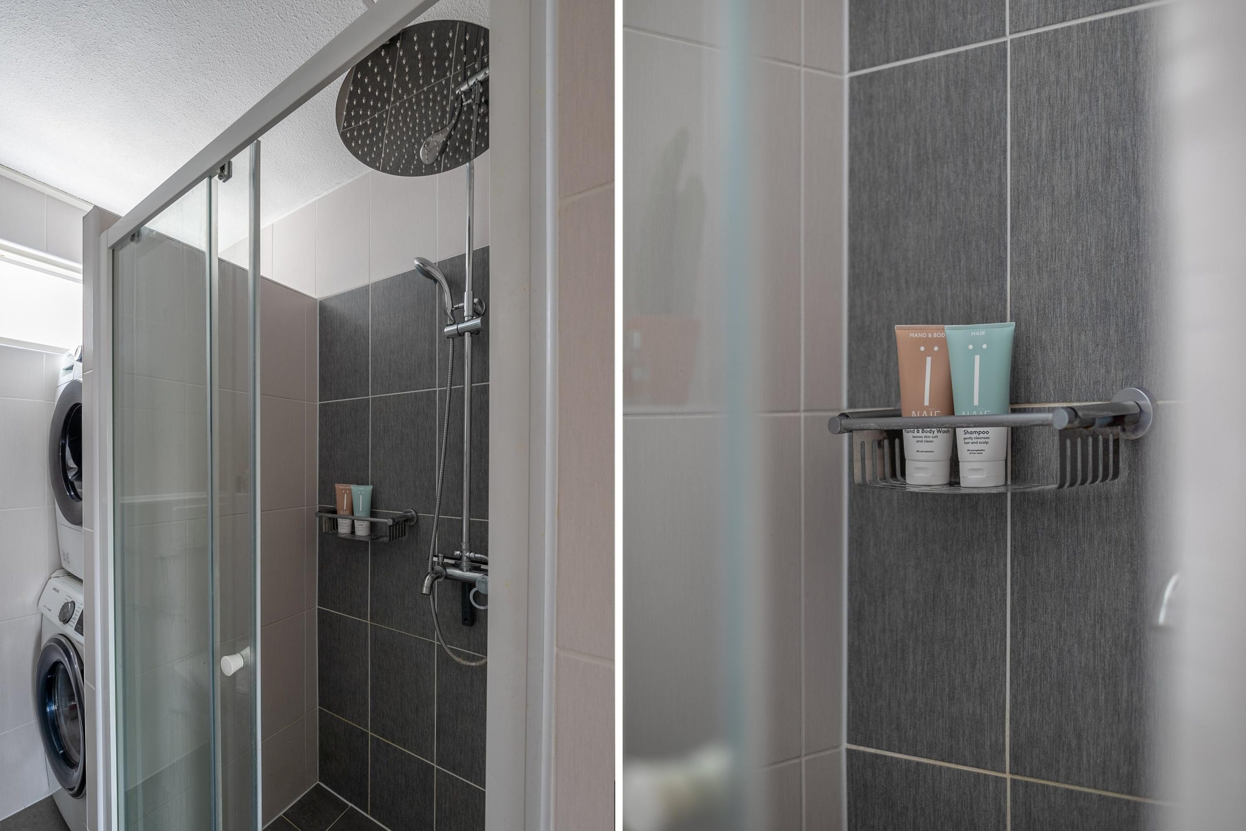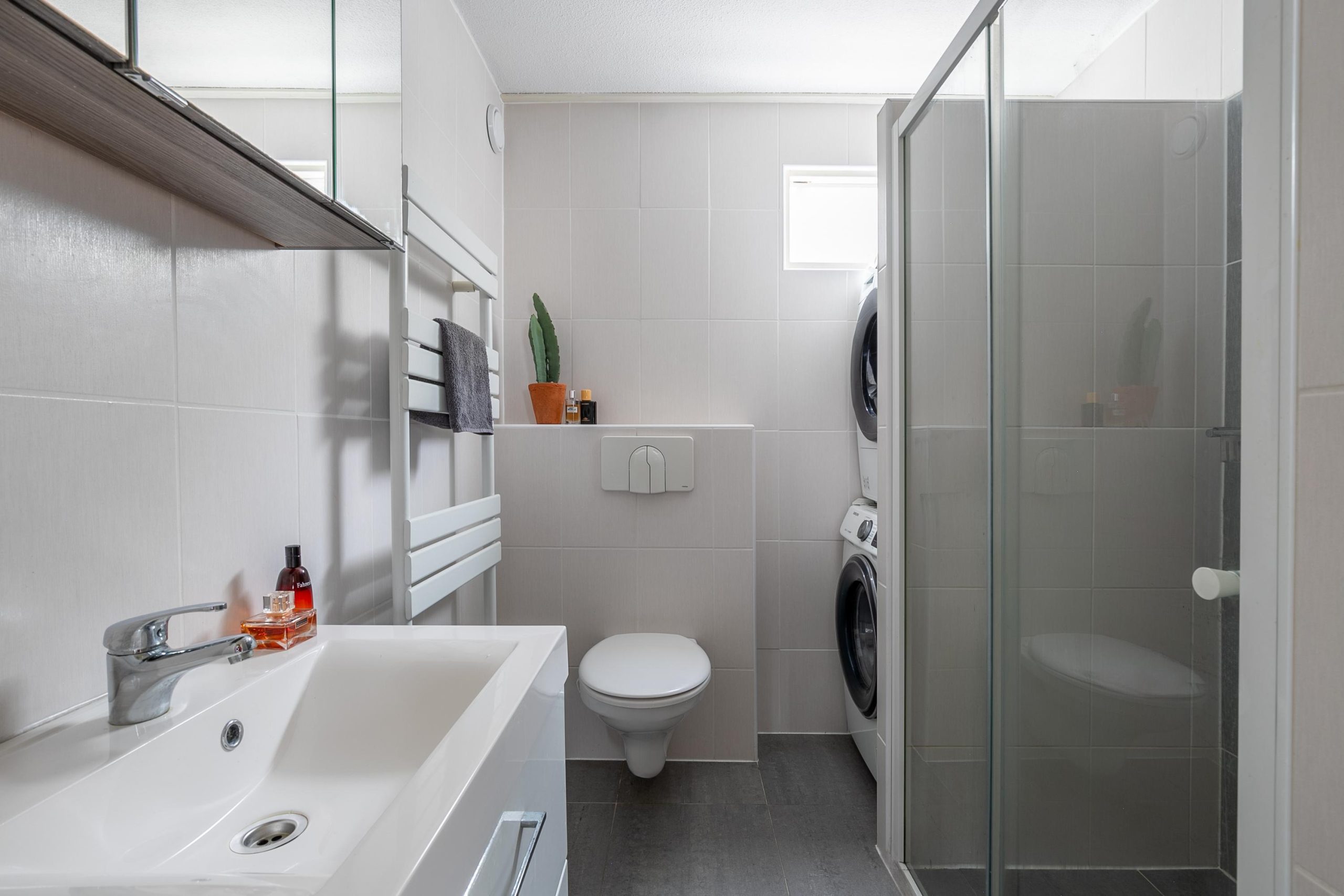De badkamer is modern en stijlvol afgewerkt, met een inloopdouche voorzien van regendouche en glazen schuifdeuren, een wandcloset en een wastafelmeubel met daarboven een spiegelkast. Een designradiator zorgt voor warme handdoeken na het douchen, en dankzij het raam en de mechanische ventilatie blijft de ruimte altijd fris. Ook de aansluiting voor wasmachine en droger is hier handig weggewerkt.