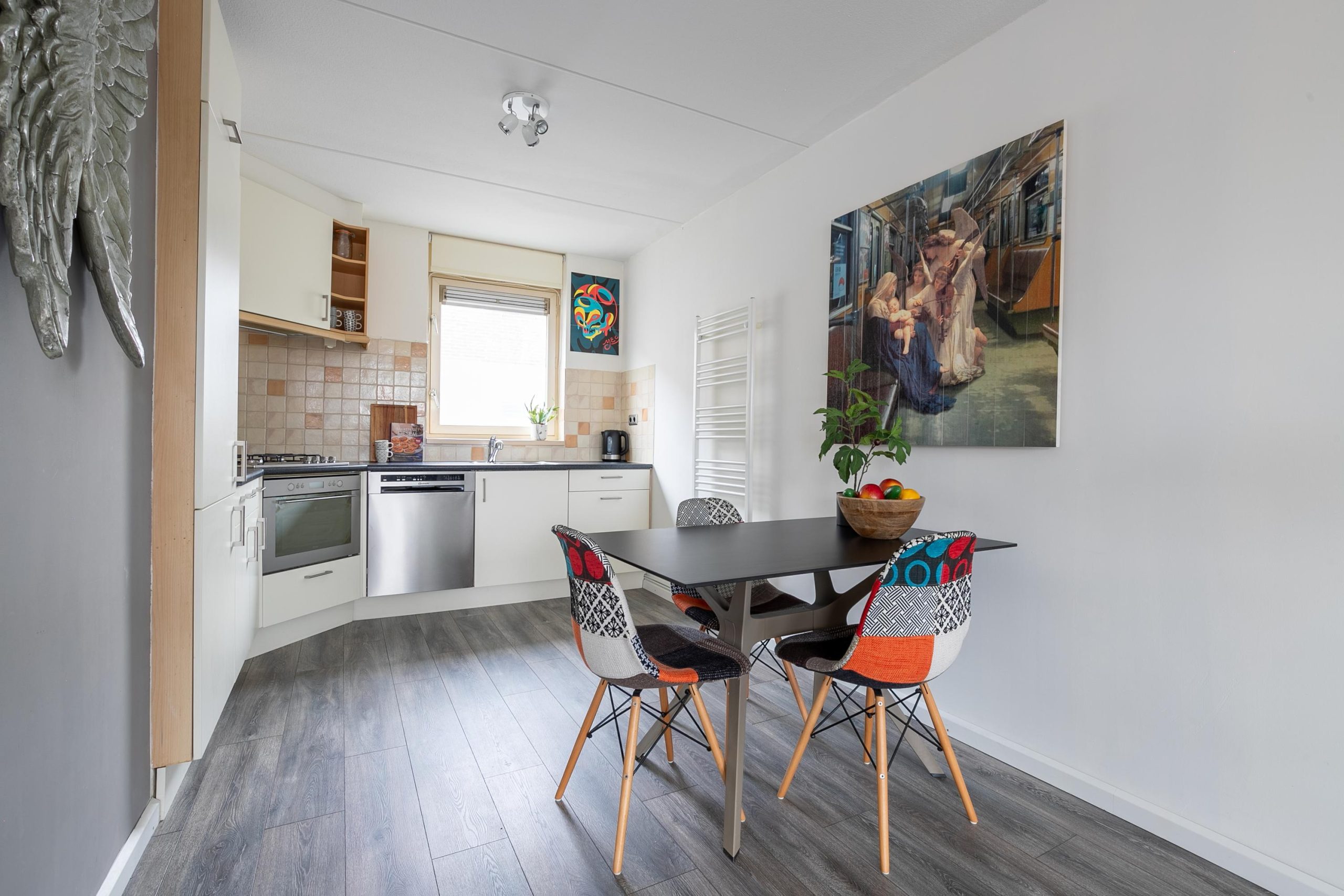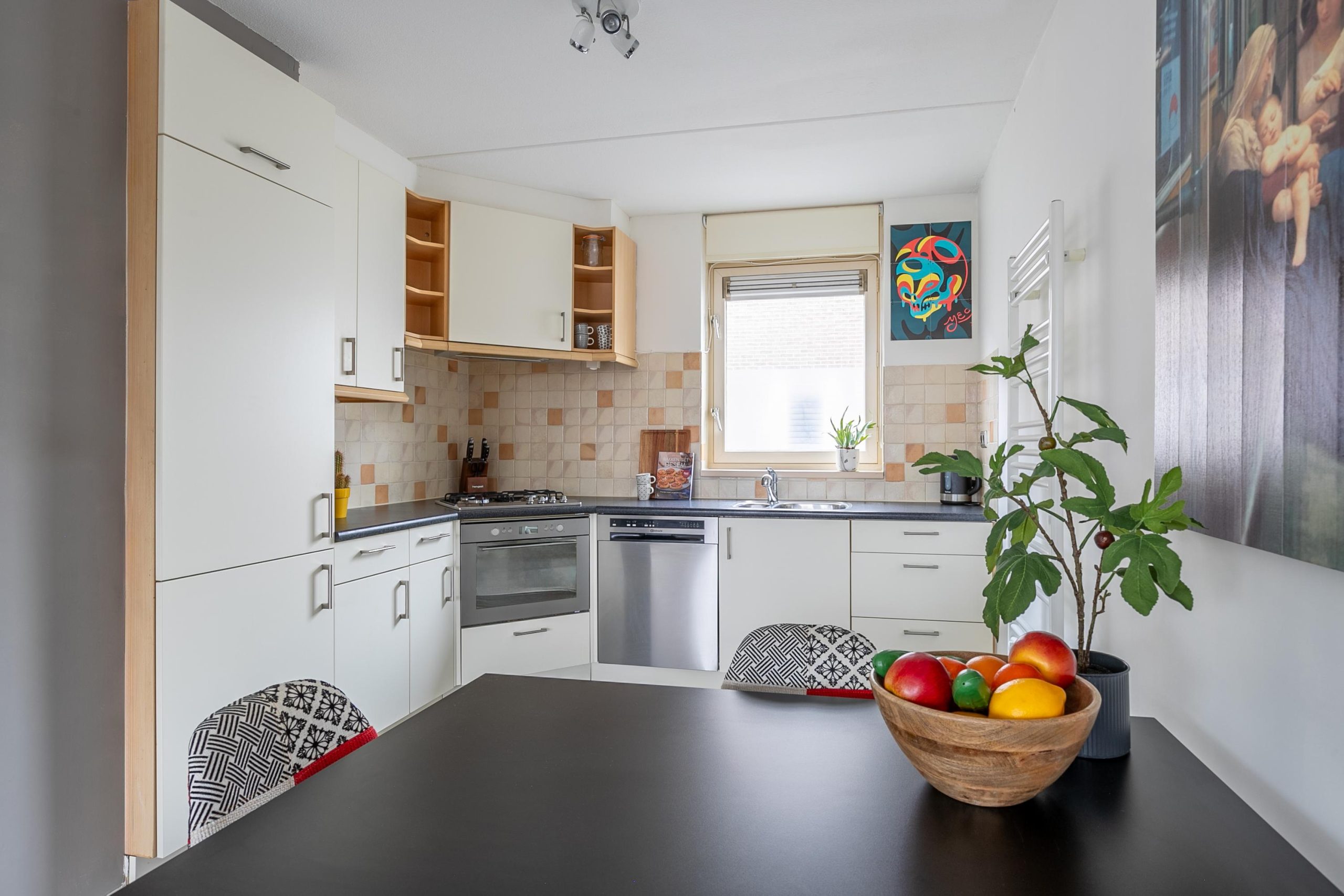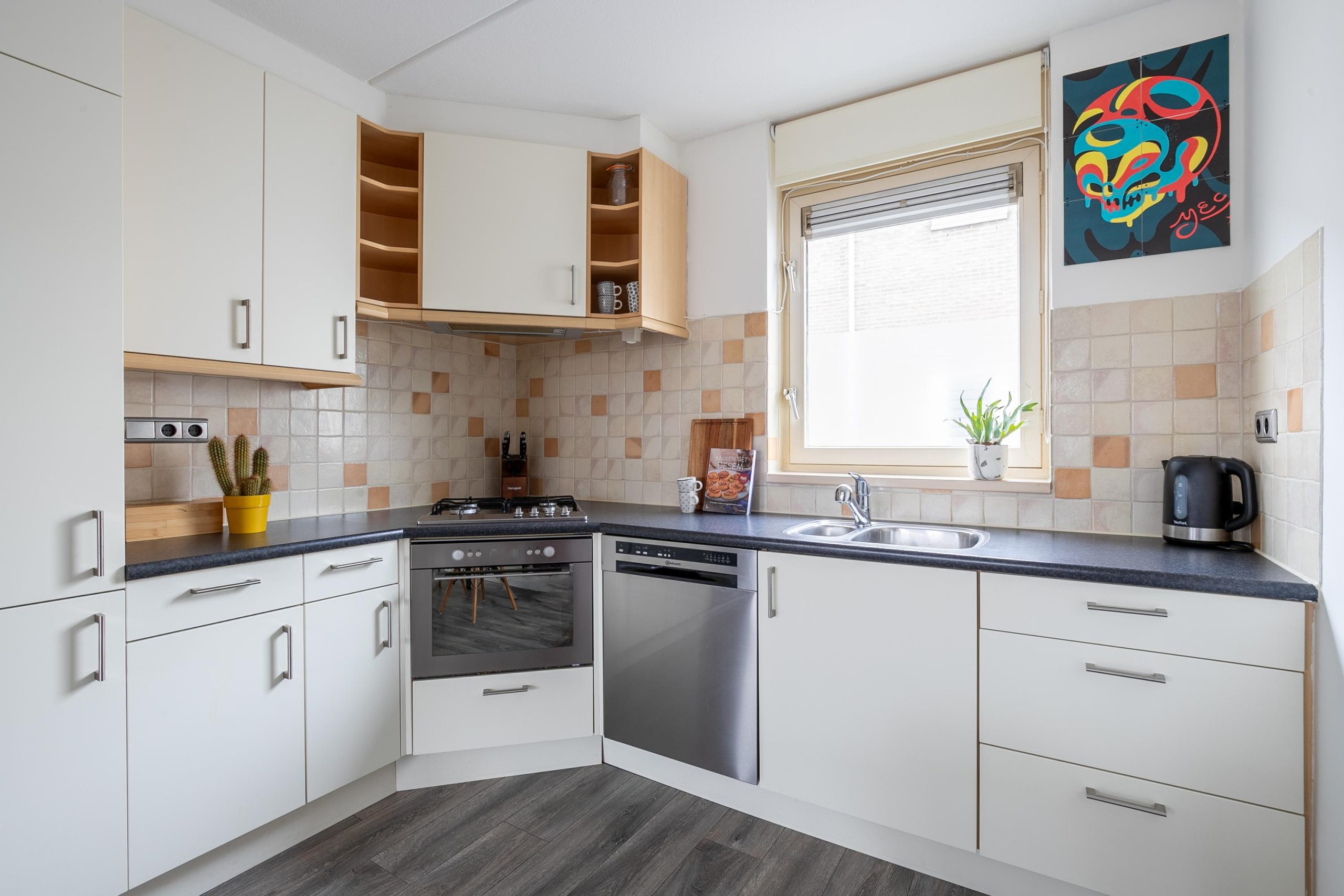 Wanneer je de woning binnenstapt, word je verwelkomd door een grote, lichte woonkamer die warmte en gezelligheid uitstraalt. De laminaatvloer loopt door tot in de open keuken, waardoor het geheel een fijne, open uitstraling heeft. De keuken is modern ingericht en voorzien van alle gemakken, zoals een gaskookplaat, oven, koelkast, vriezer en natuurlijk een vaatwasser. Terwijl je aan het koken bent, heb je uitzicht over de straat beneden en met het rolluik kun je eenvoudig wat meer privacy creëren als je daar behoefte aan hebt.