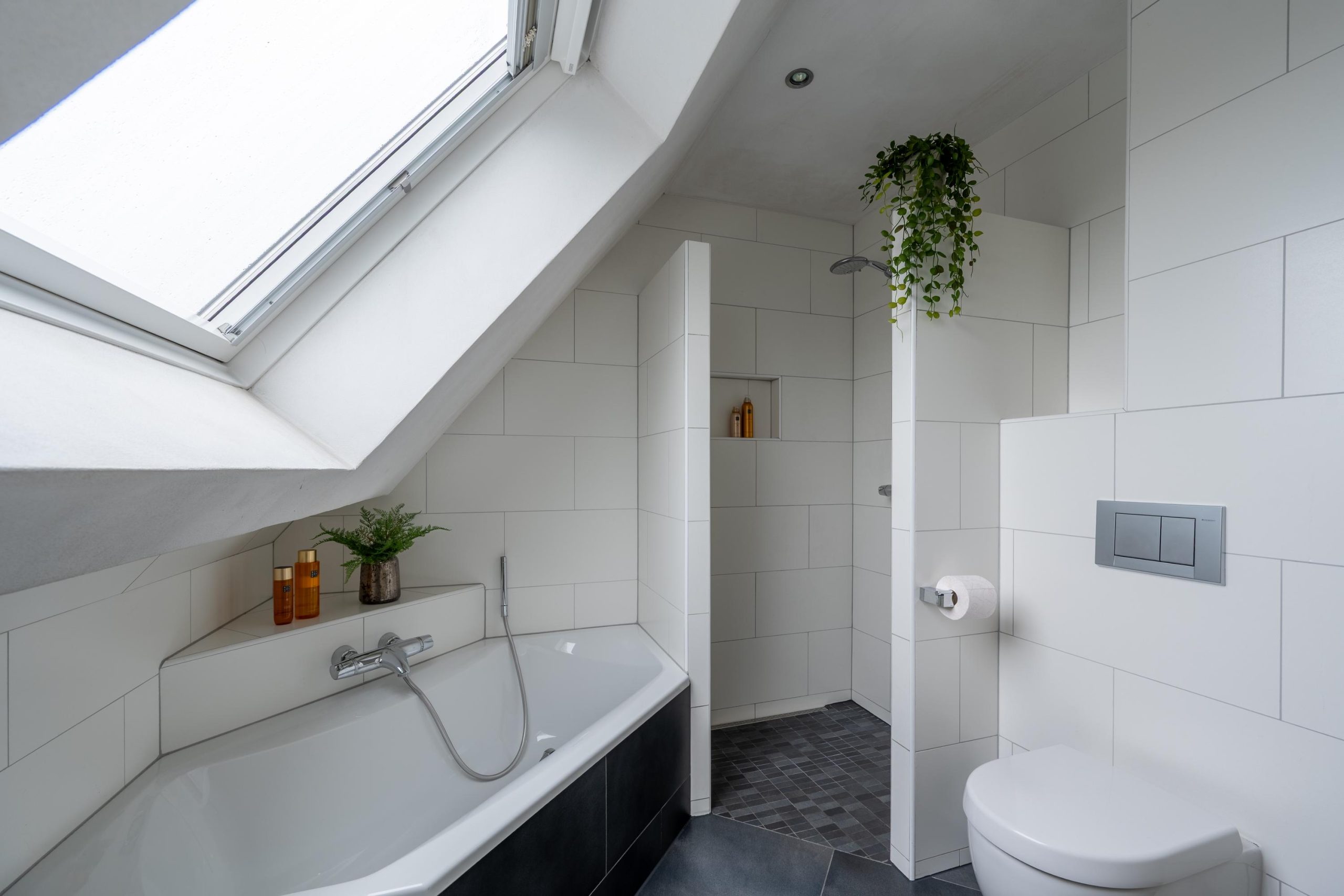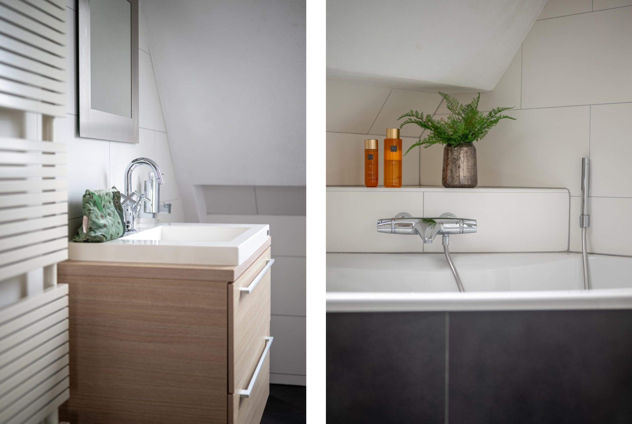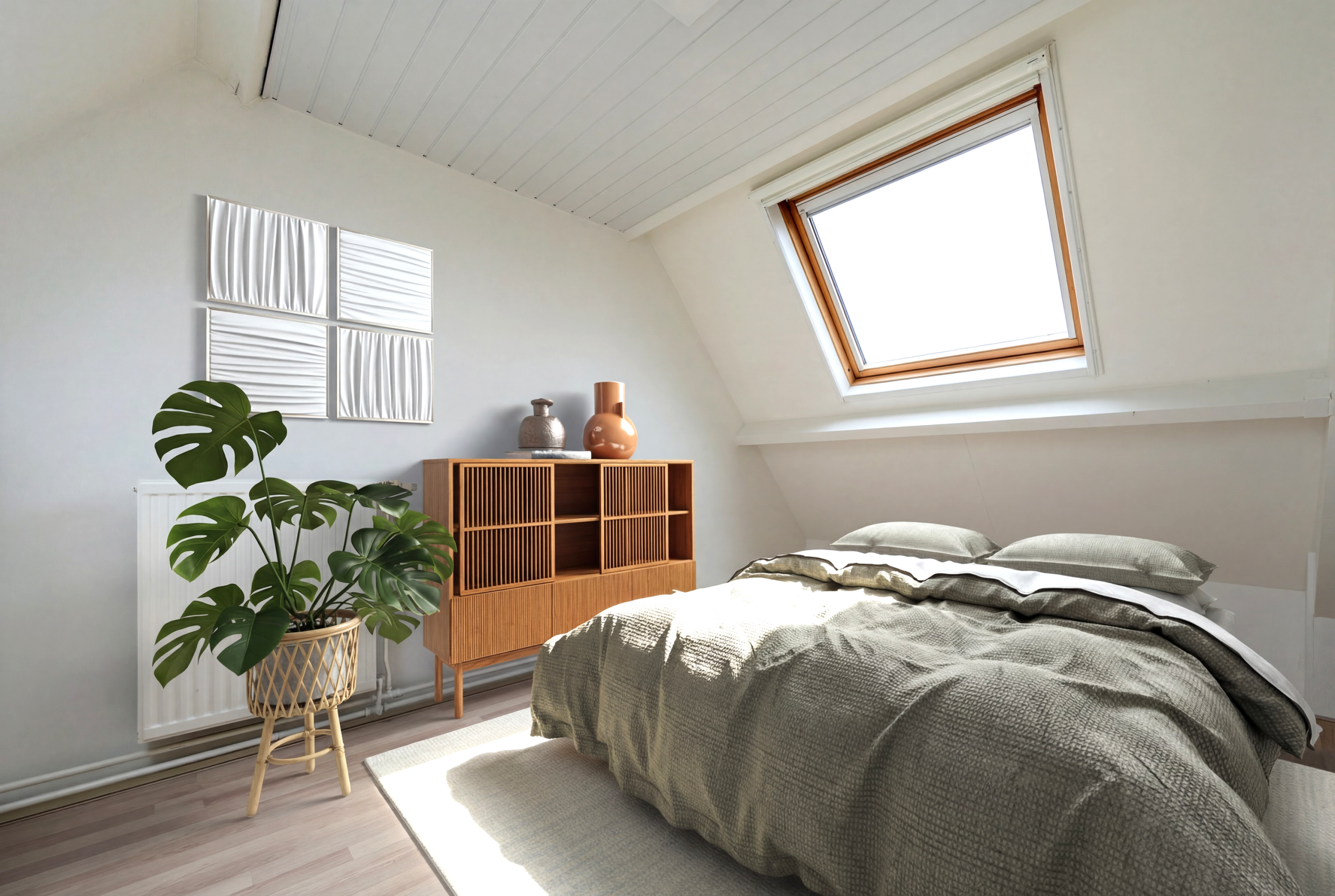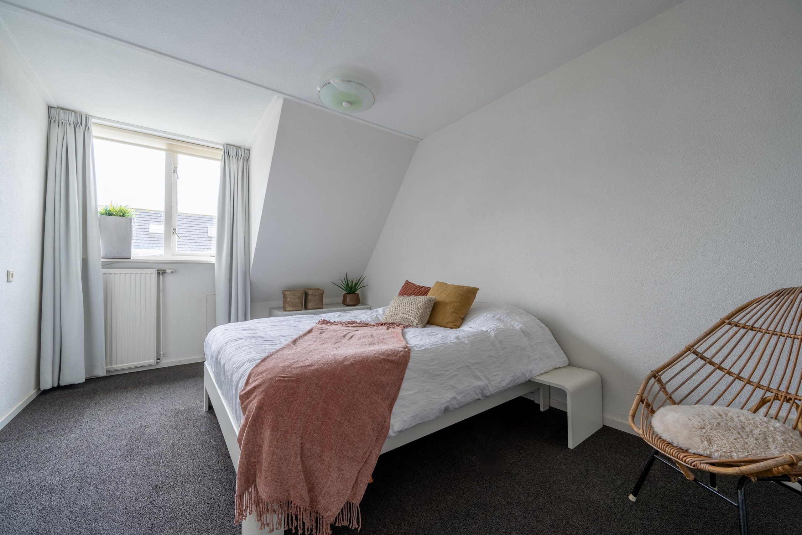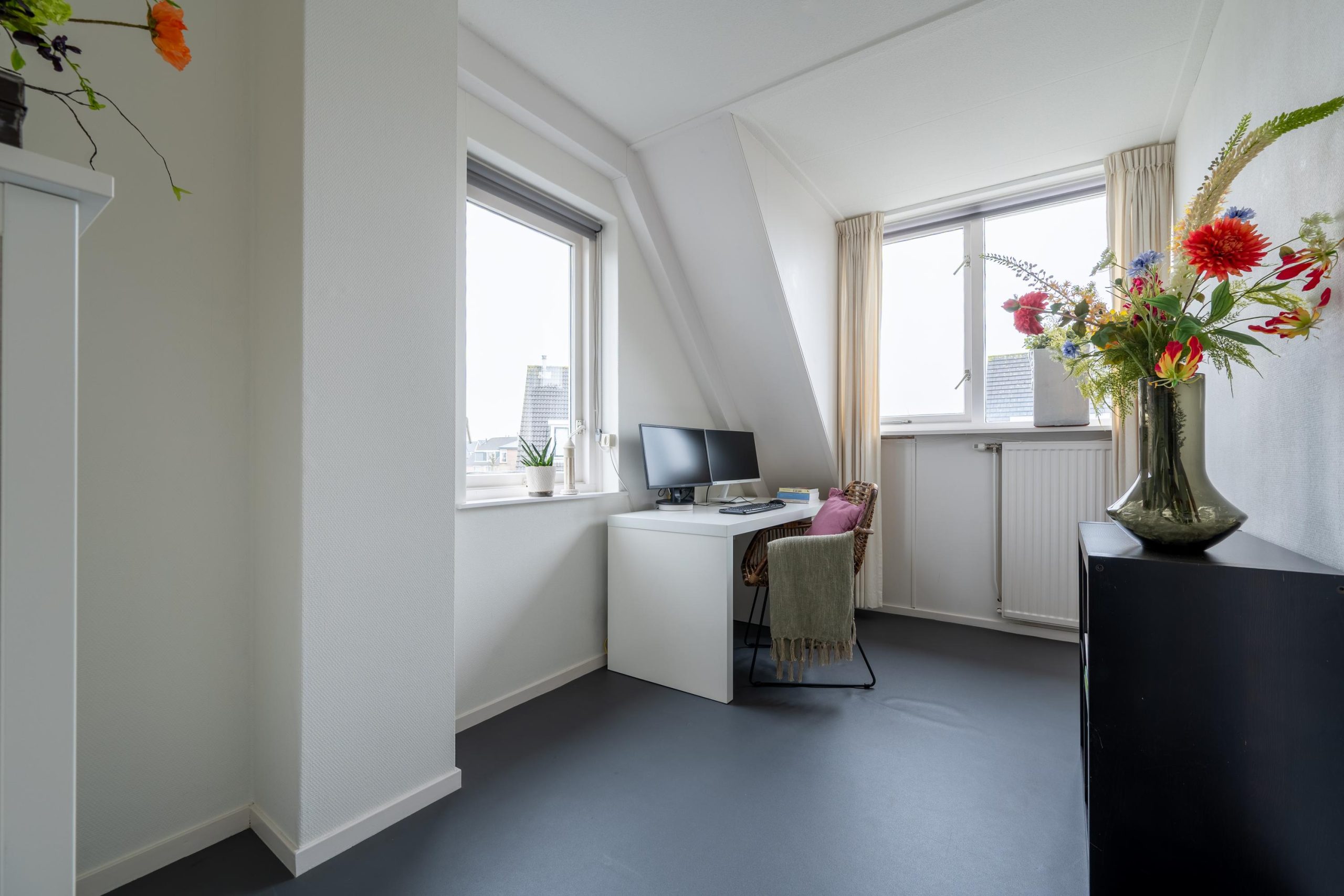Je loopt naar boven. Drie slaapkamers geven meteen ideeën: werken, slapen, kinderkamer of misschien toch een hobbykamer. Je merkt hoe je plannen al vanzelf ontstaan. De badkamer is voorzien van ligbad, douche, toilet en wastafelmeubel. Daarna nog een trap omhoog, waar een verrassend ruime vierde slaapkamer wacht met knieschotten en extra bergruimte, plus een vliering voor de spullen die je niet dagelijks nodig hebt.