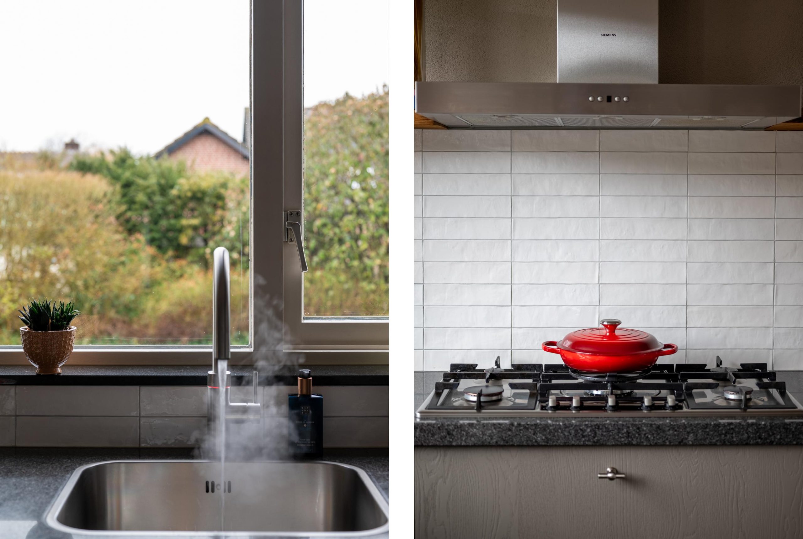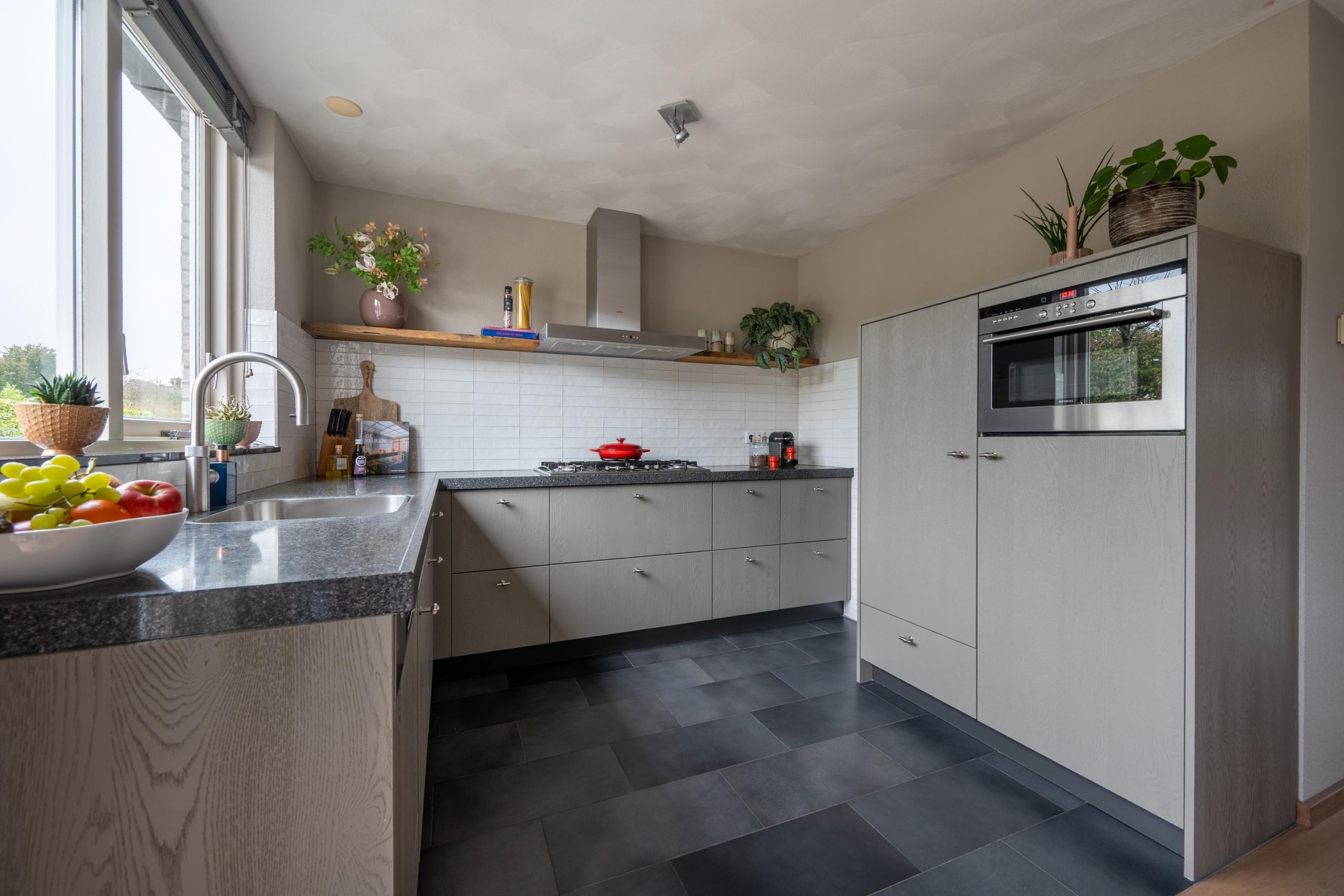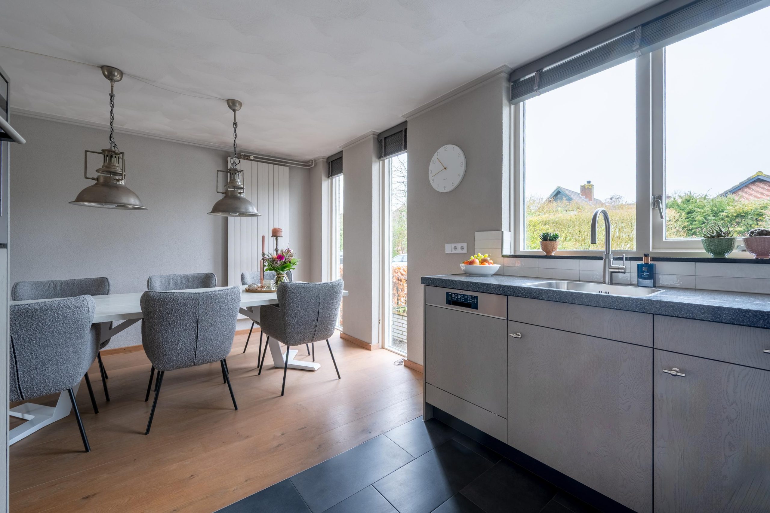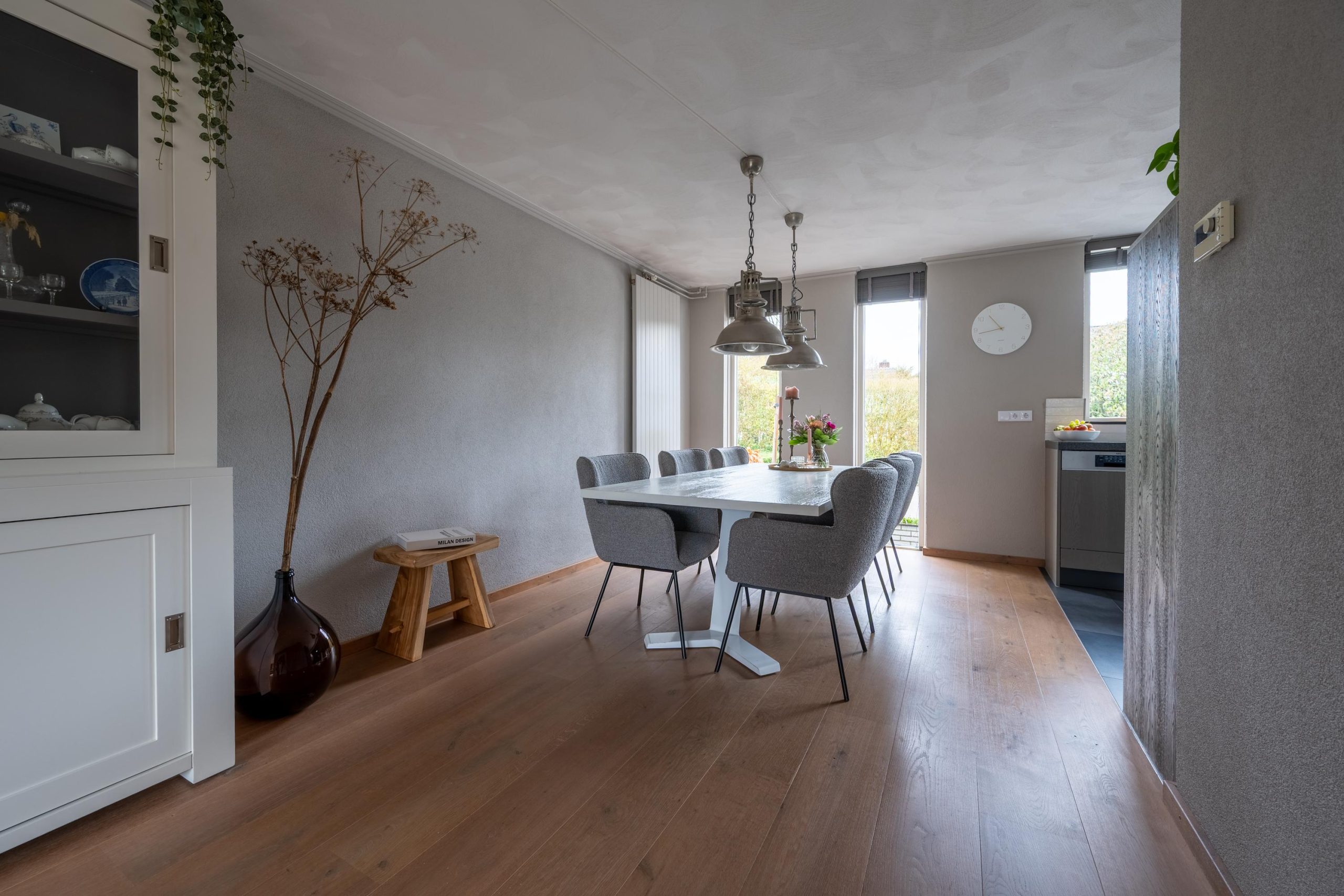 Verderop ligt de eethoek. Een plek waar je niet alleen eet, maar ook werkt, puzzelt of nog even blijft zitten na de koffie. In de keuken zie je het al voor je: een pan op de 5-pits gaskookplaat, de pasta die staat te pruttelen terwijl het gesprek gewoon doorgaat.