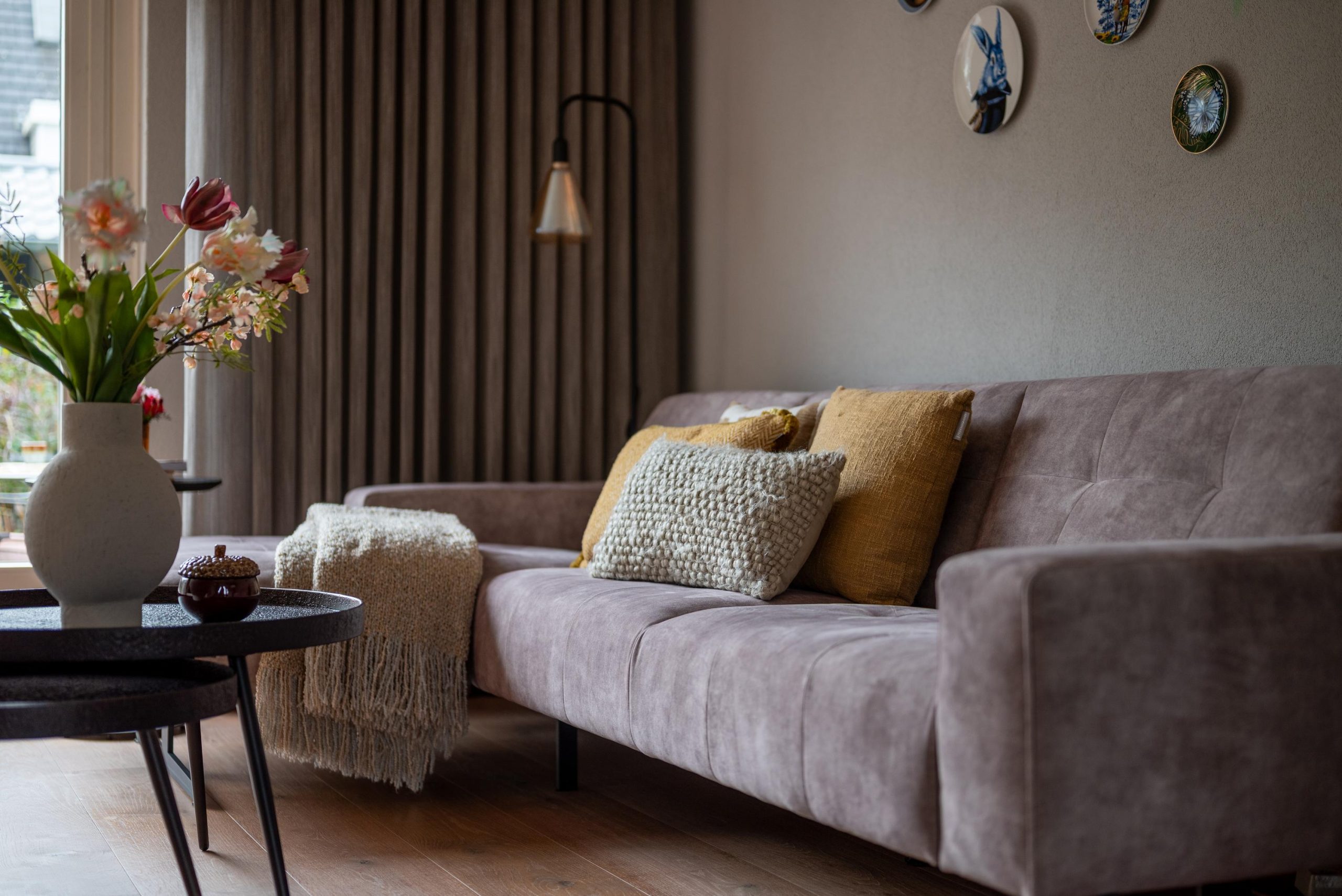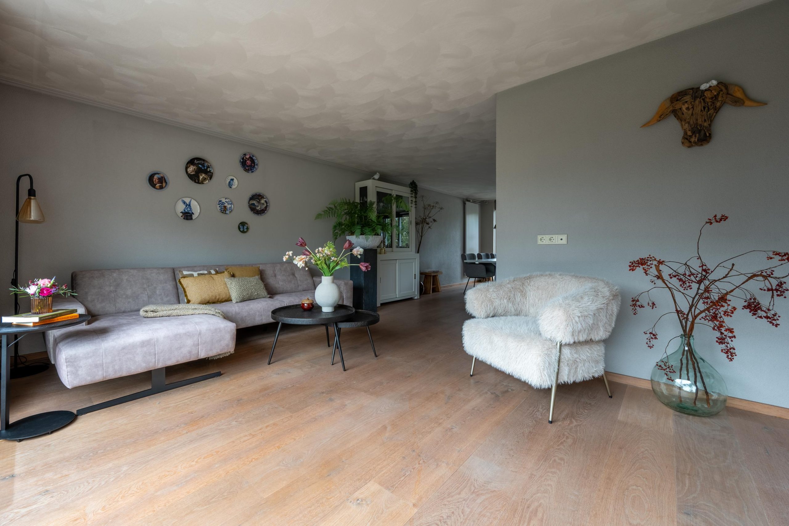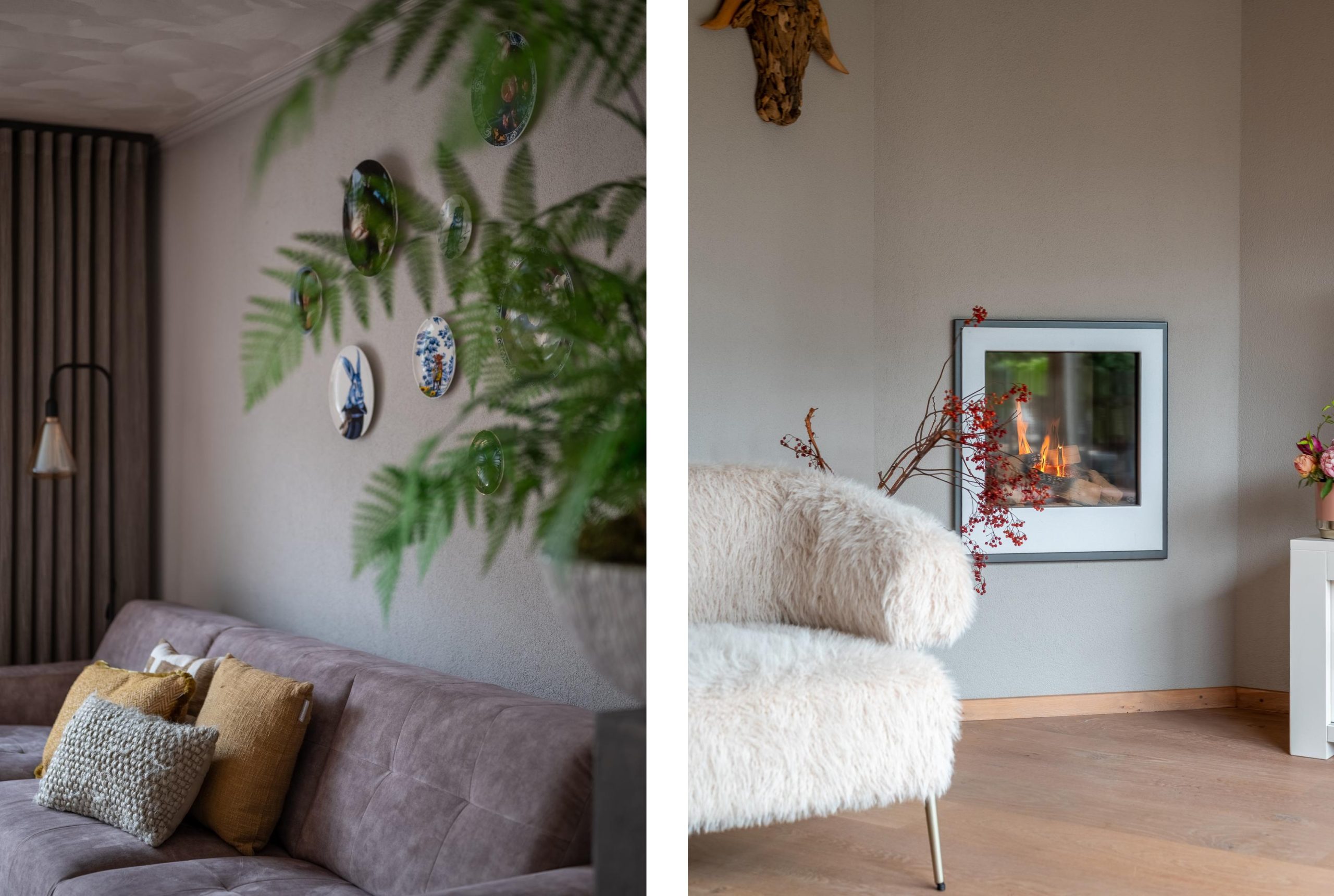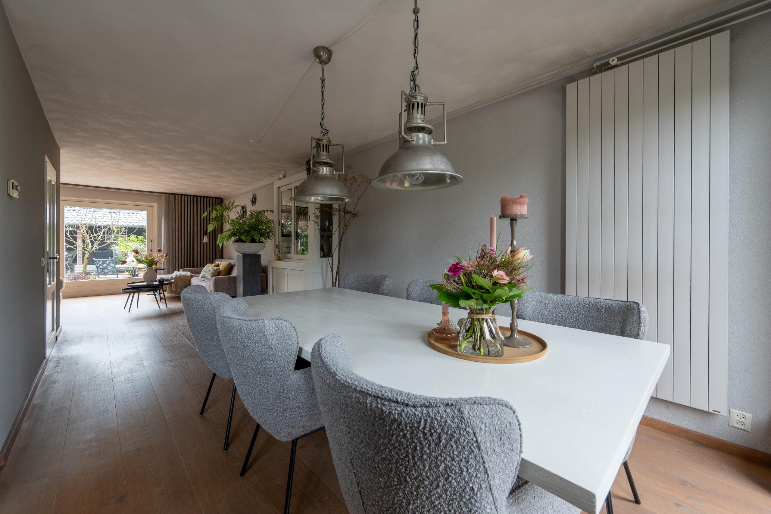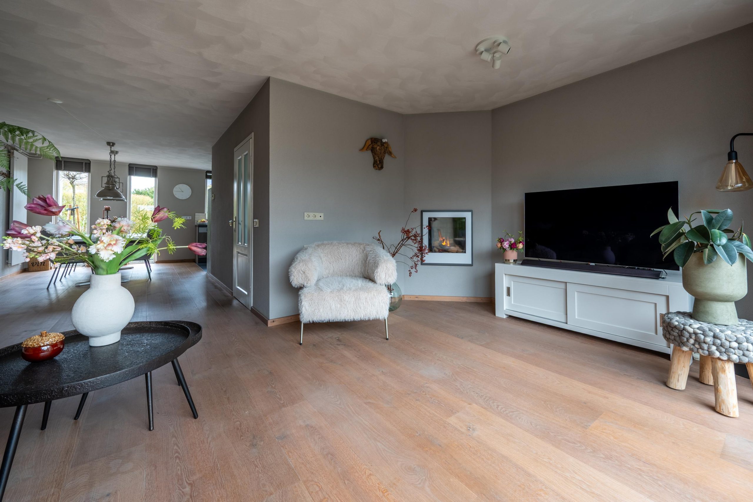 Binnen stap je de hal in en loop je door naar de woonkamer. Je blik wordt direct naar achteren getrokken, richting de schuifpui en de tuin. Je gaat even zitten, gewoon om het gevoel te testen. De gashaard aan en de ruimte wordt direct warmer. Zo’n plek waar je de dag vertraagt zonder dat je het doorhebt.