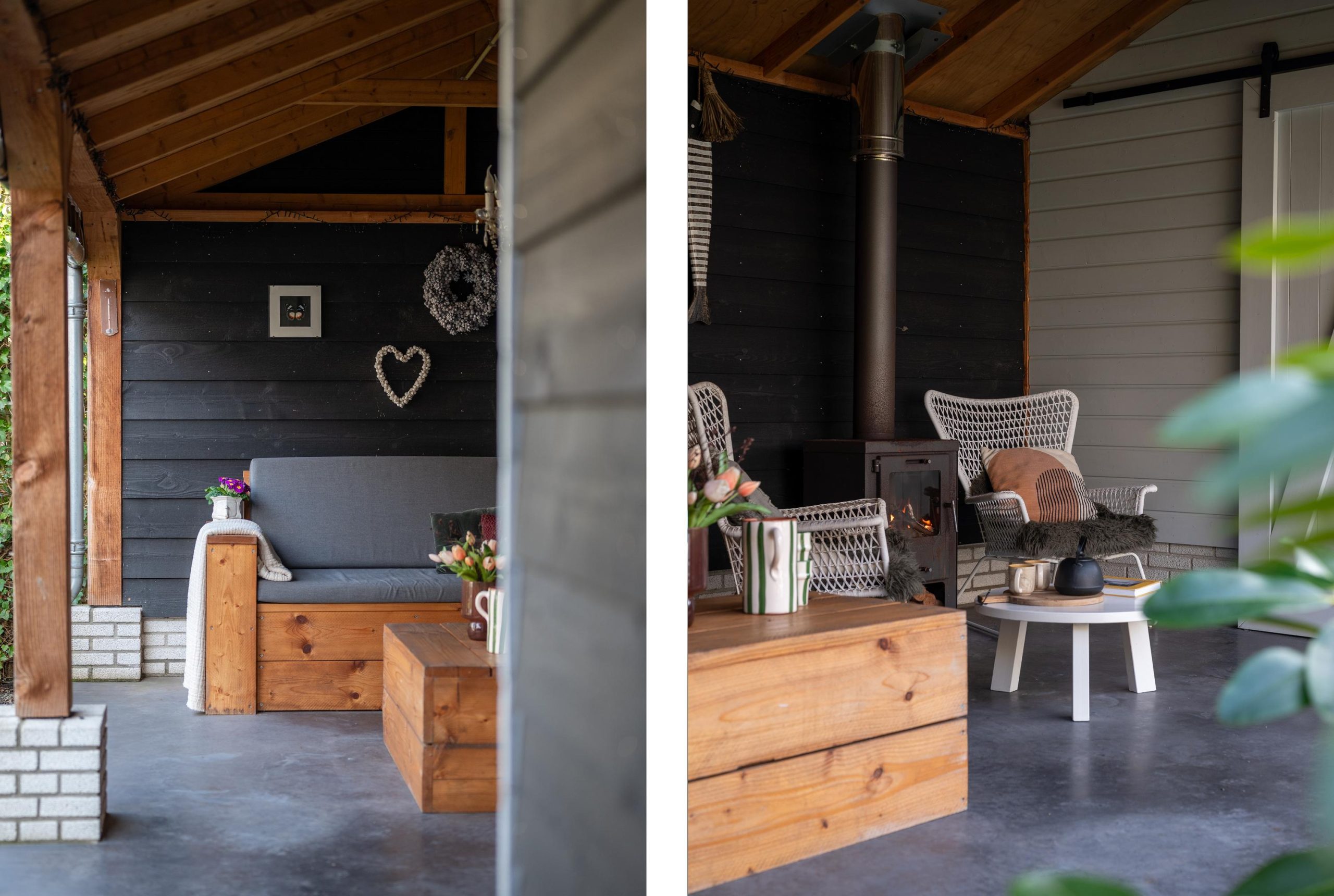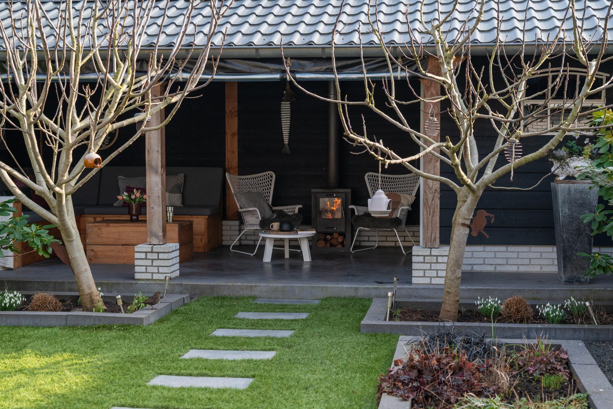 Onder de overkapping staat nog een verrassing te wachten: de houtkachel. Je gaat even zitten met een boek, of juist met vrienden die langskomen. Doordat de overkapping afsluitbaar is, zit je hier ook prettig als het later wordt of frisser aanvoelt.