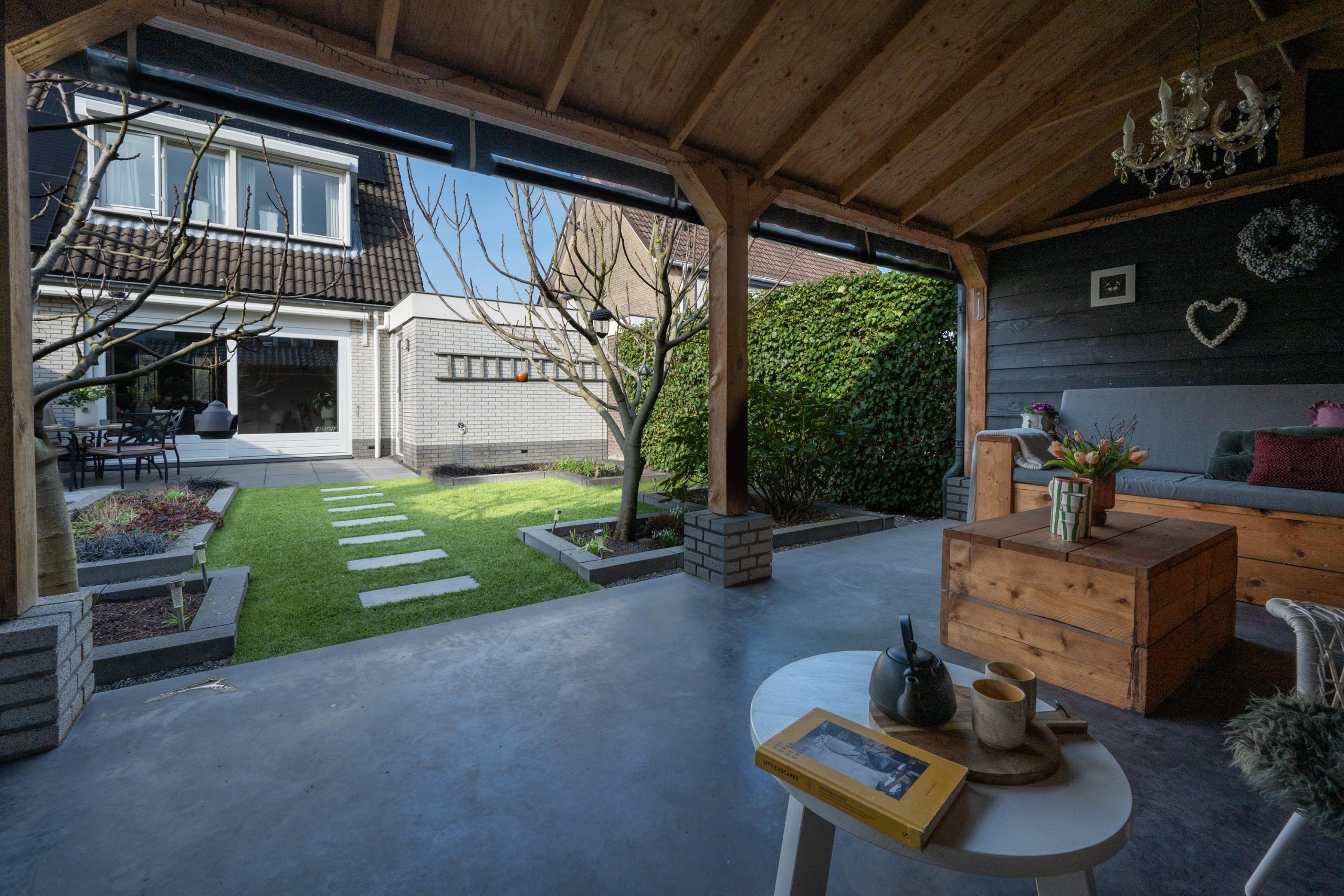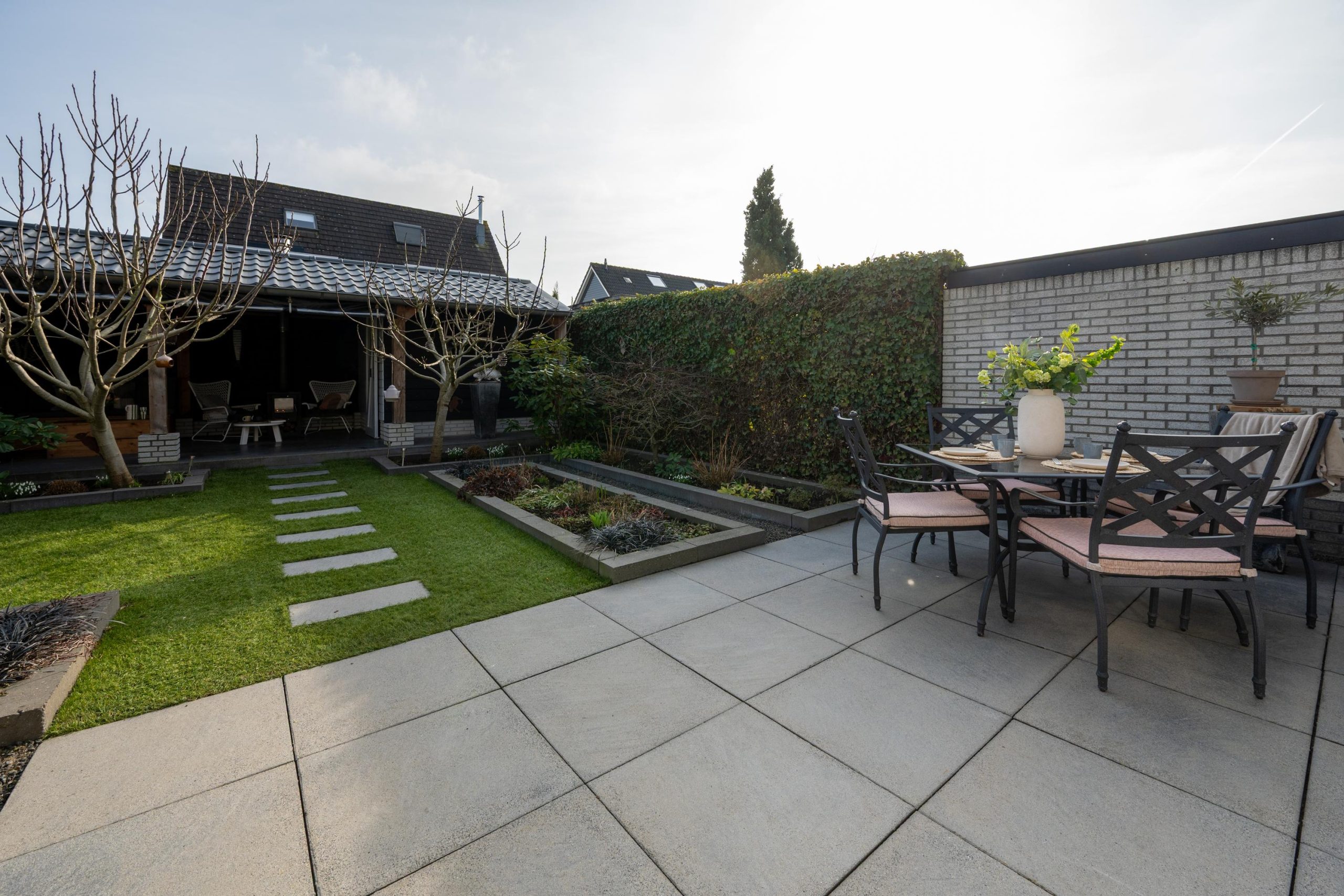 Via de pui stap je naar buiten. Buiten voelt het meteen ruim en beschut tegelijk. Je staat op het terras en kijkt de tuin in. Het pad trekt vanzelf je aandacht en leidt je naar achteren. Groen om je heen, borders die netjes zijn aangelegd en genoeg plek om te zitten in de zon of juist even de schaduw op te zoeken.