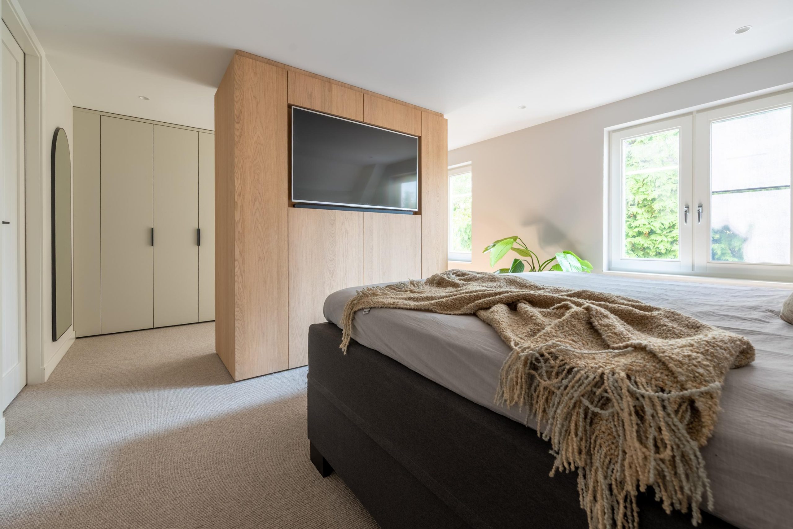 Beneden geniet je van een extra royale woonkamer met speelse doorgangen, een aangebouwd eetgedeelte dat direct in verbinding staat met de tuin, en een keuken die veel mogelijkheden biedt. Het licht, de ruimte en de vloeiende indeling maken dit een huis waar samenkomen, of dat nu tijdens lange diners of ontspannen avonden met vrienden en familie is, gezellig voelt zonder dat je bovenop elkaars lip zit.