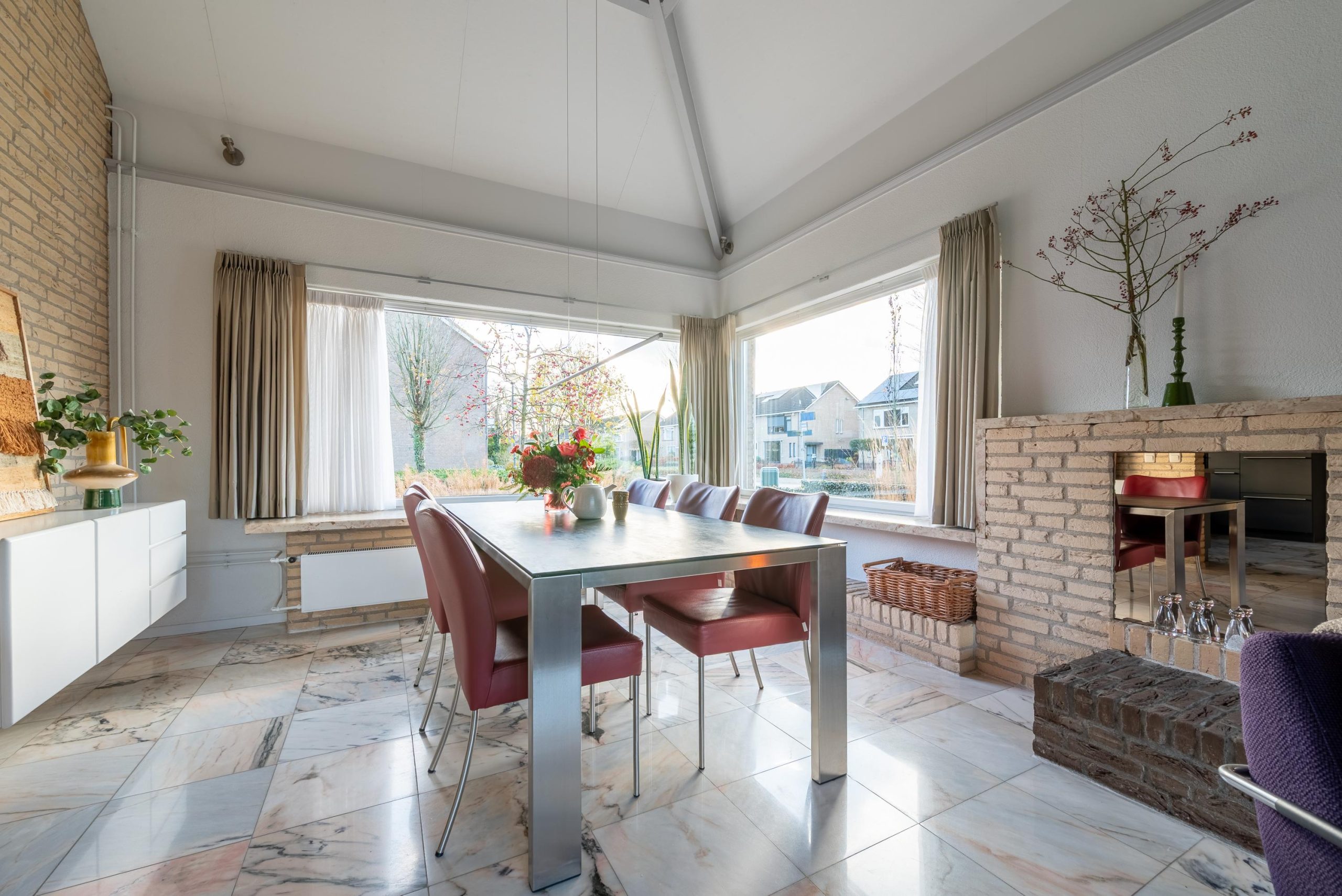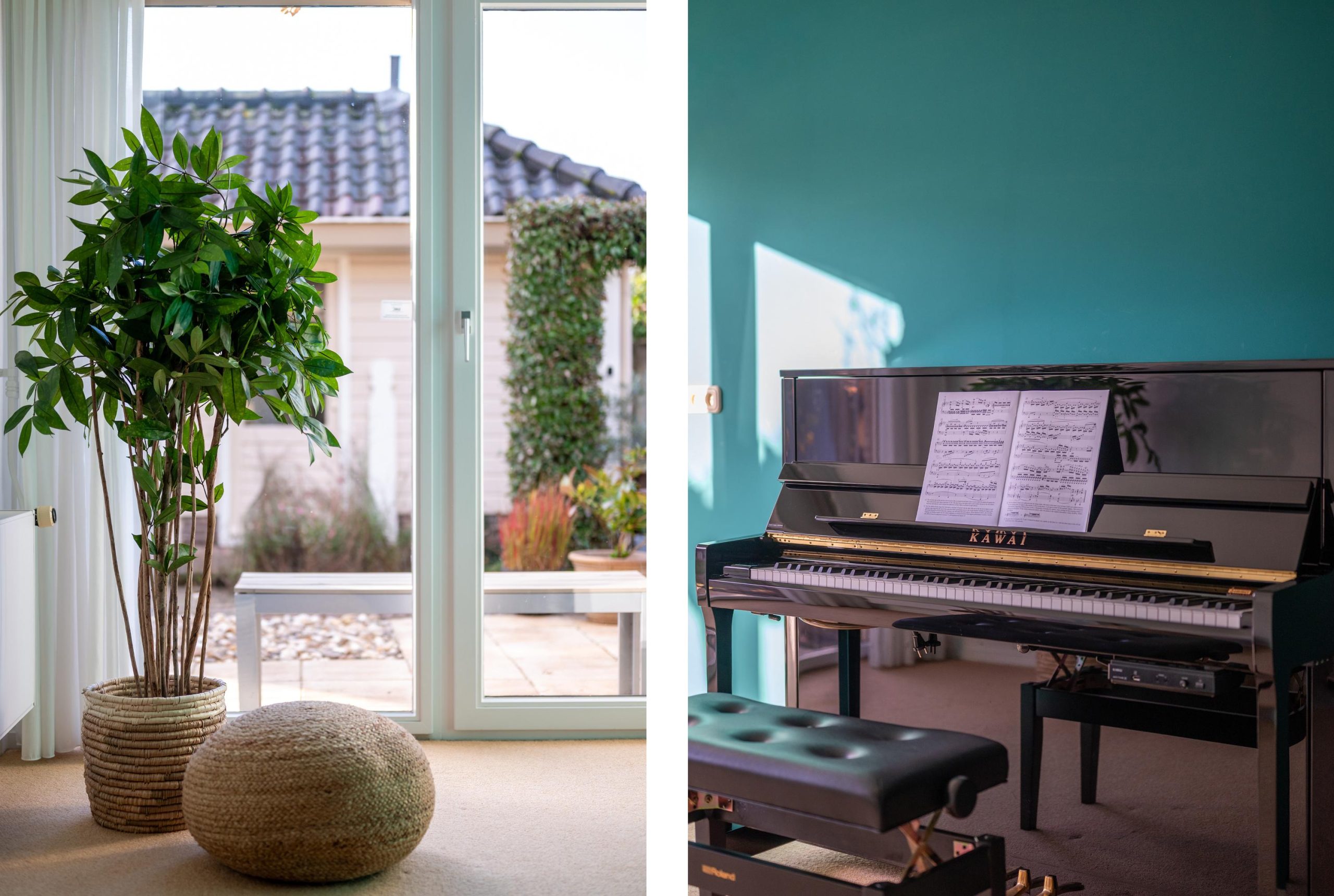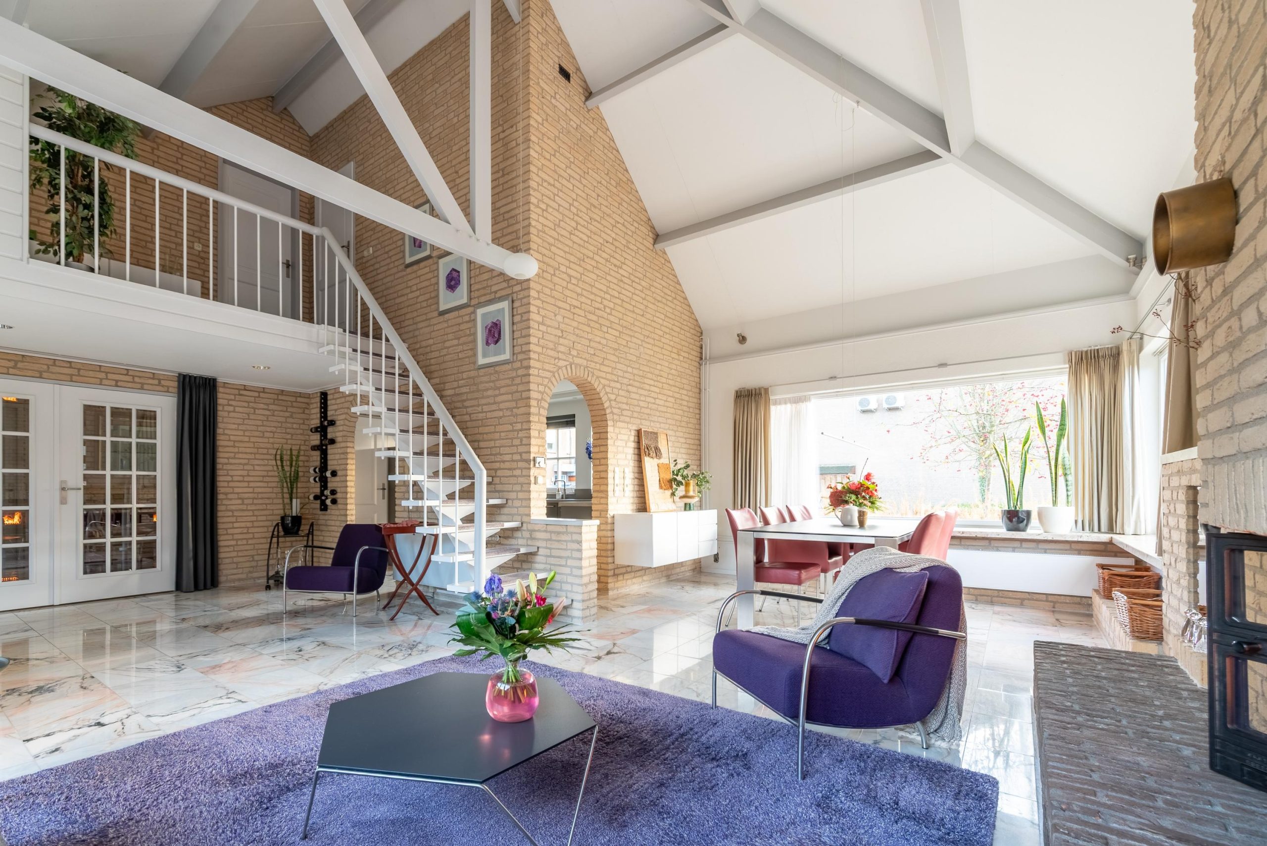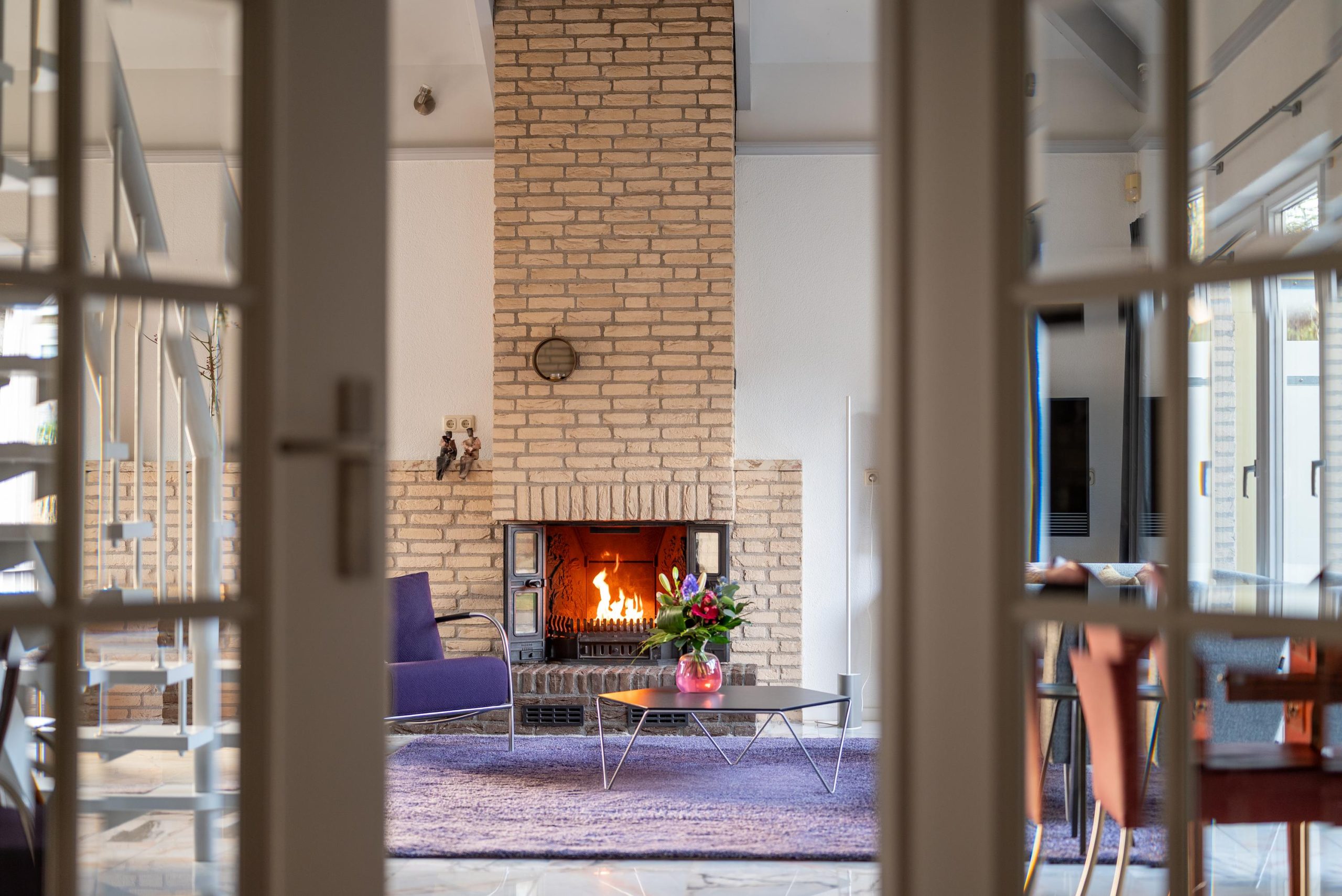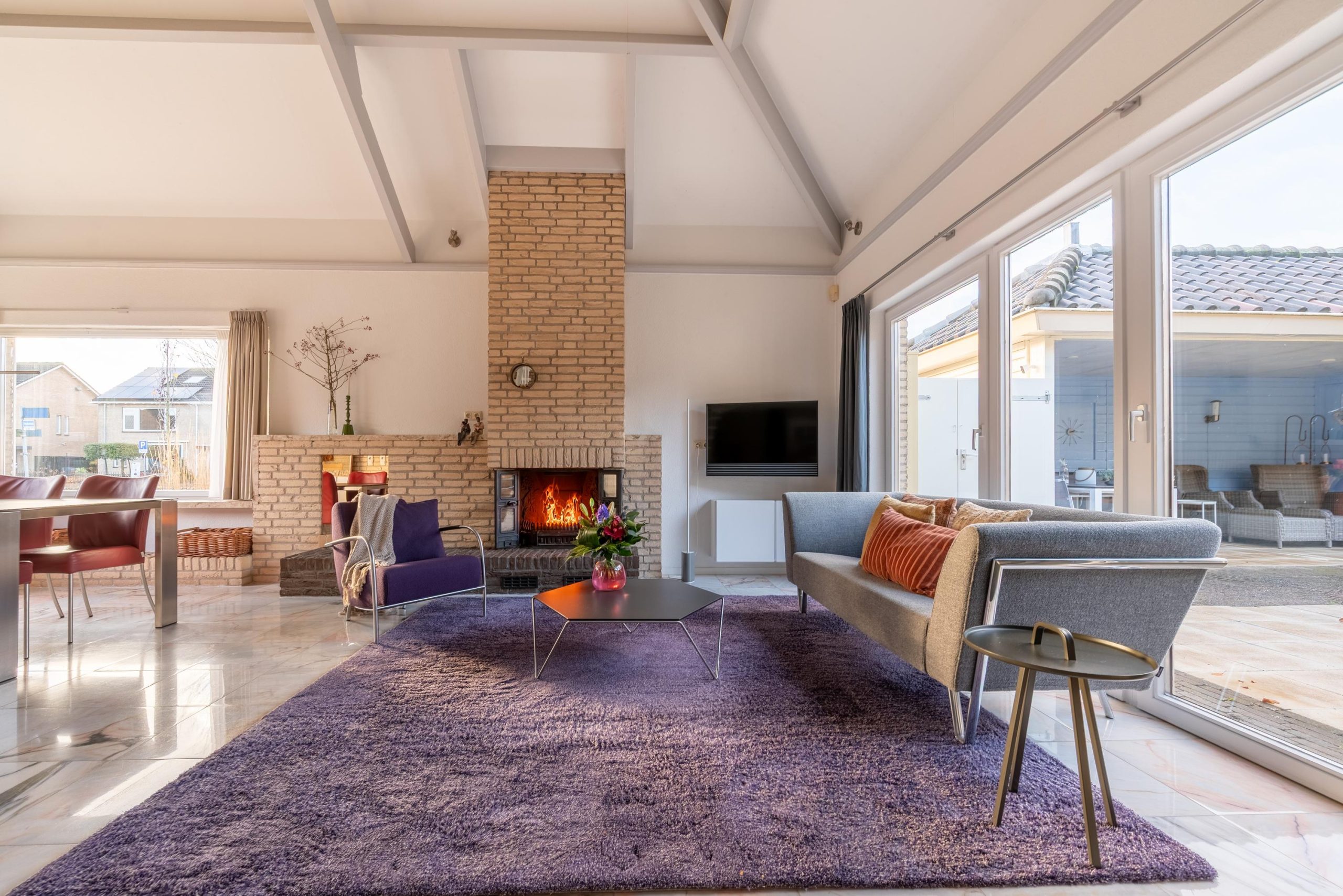 Je komt binnen in een ruime, lichte living waar je meteen even om je heen wilt kijken. De hoge plafonds met zichtbare spanten, de grote ramen en de open haard geven de woonkamer een warme, huiselijke sfeer. Via de openslaande deuren loop je zó de tuin in, waardoor binnen en buiten op mooie dagen moeiteloos in elkaar overlopen.