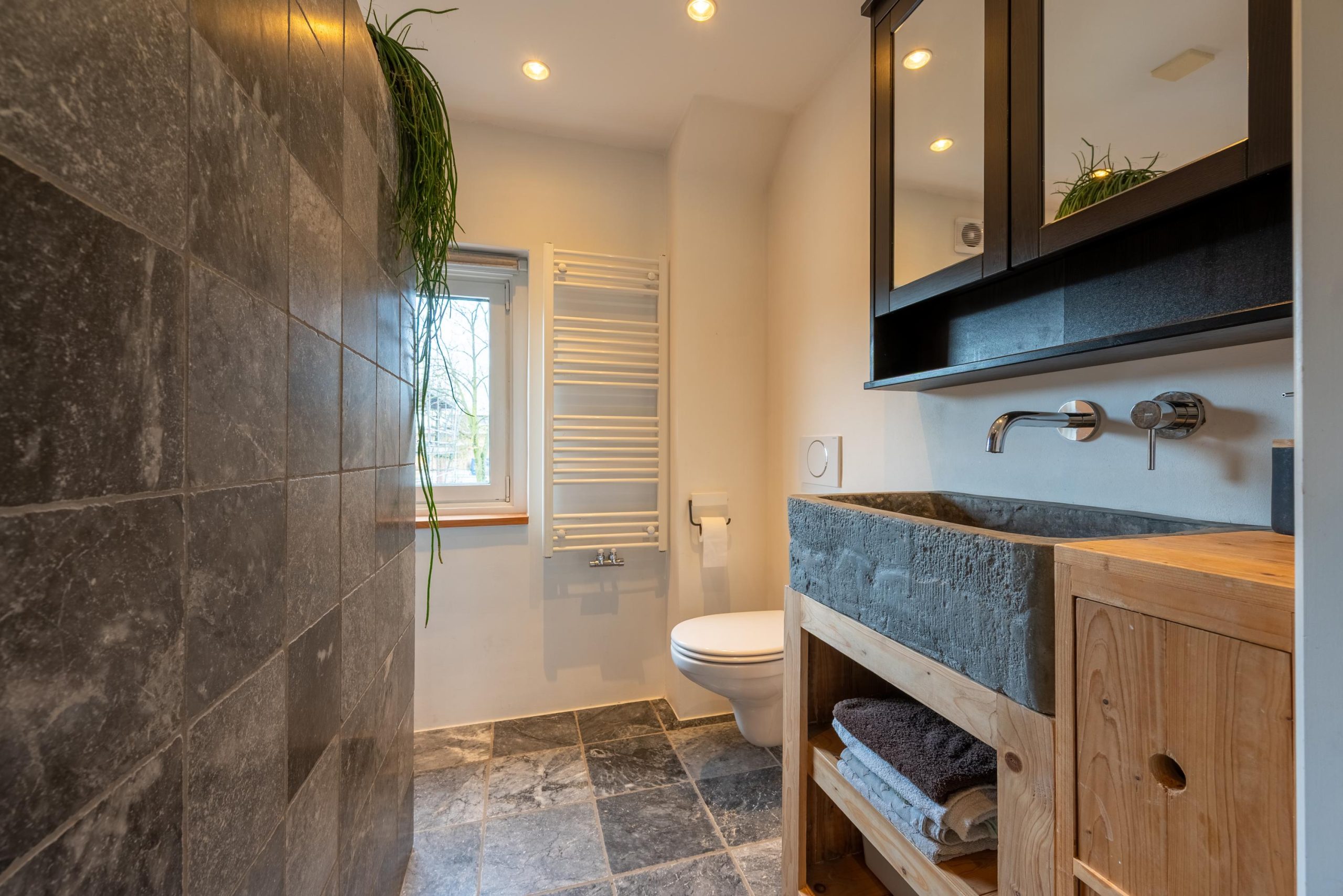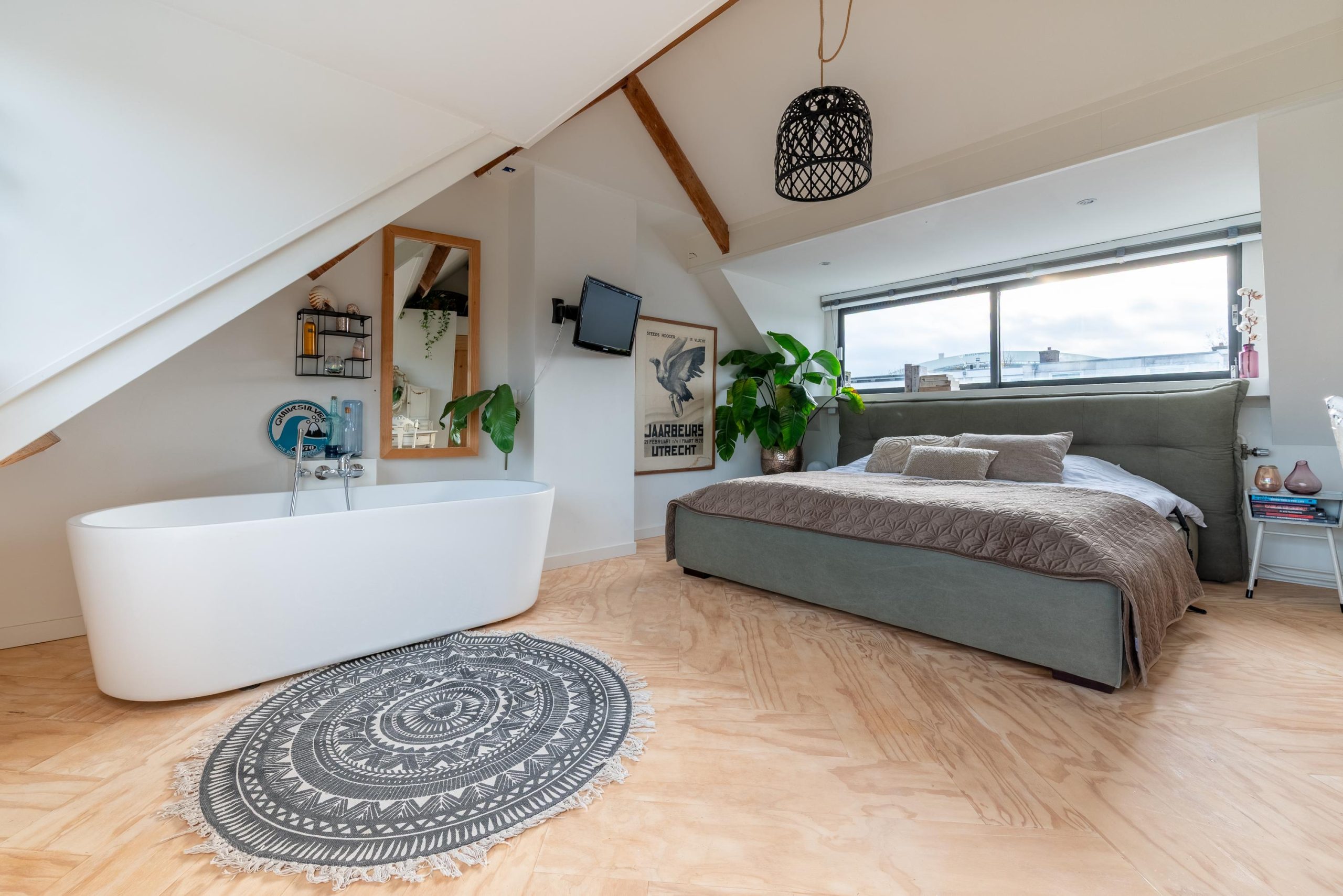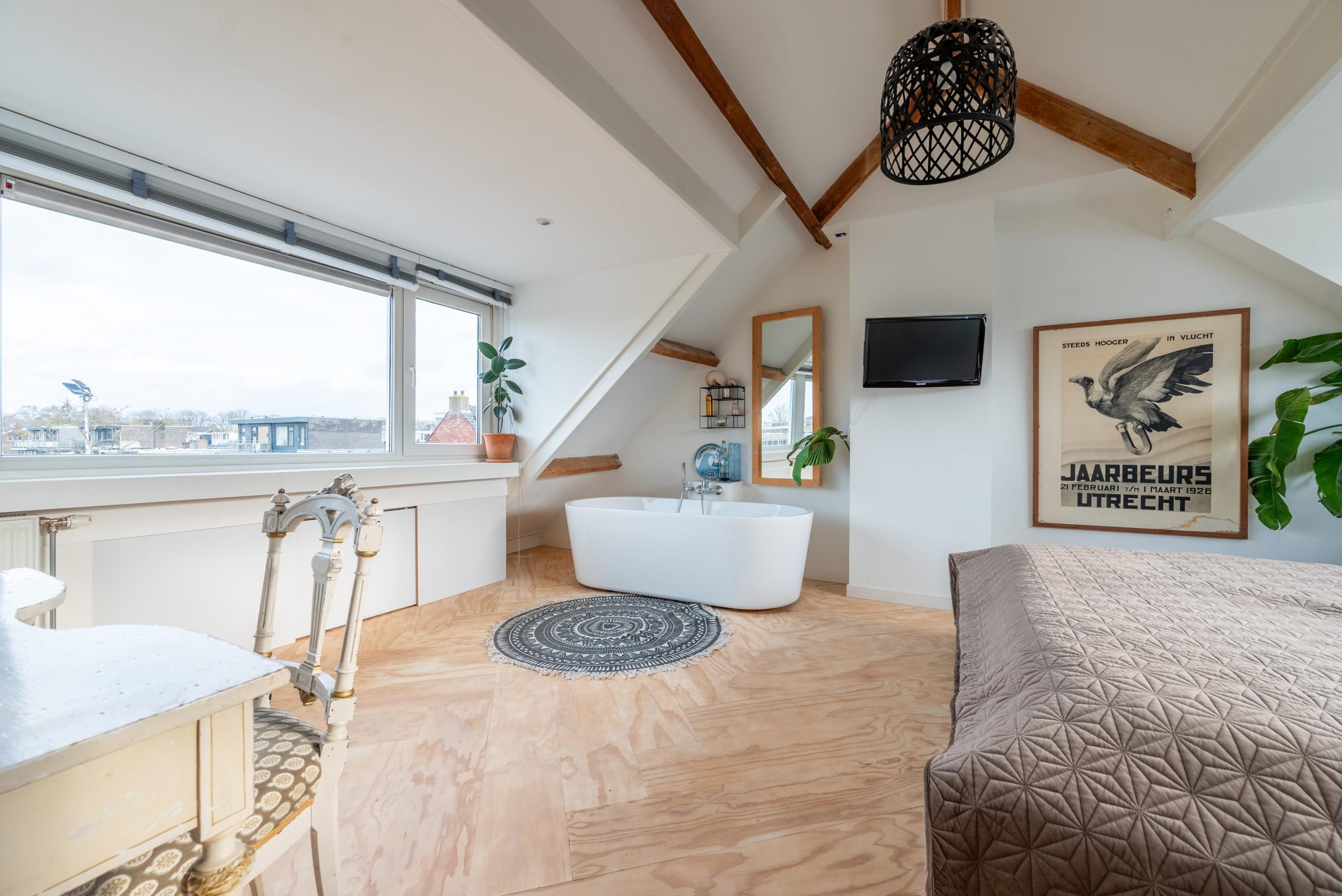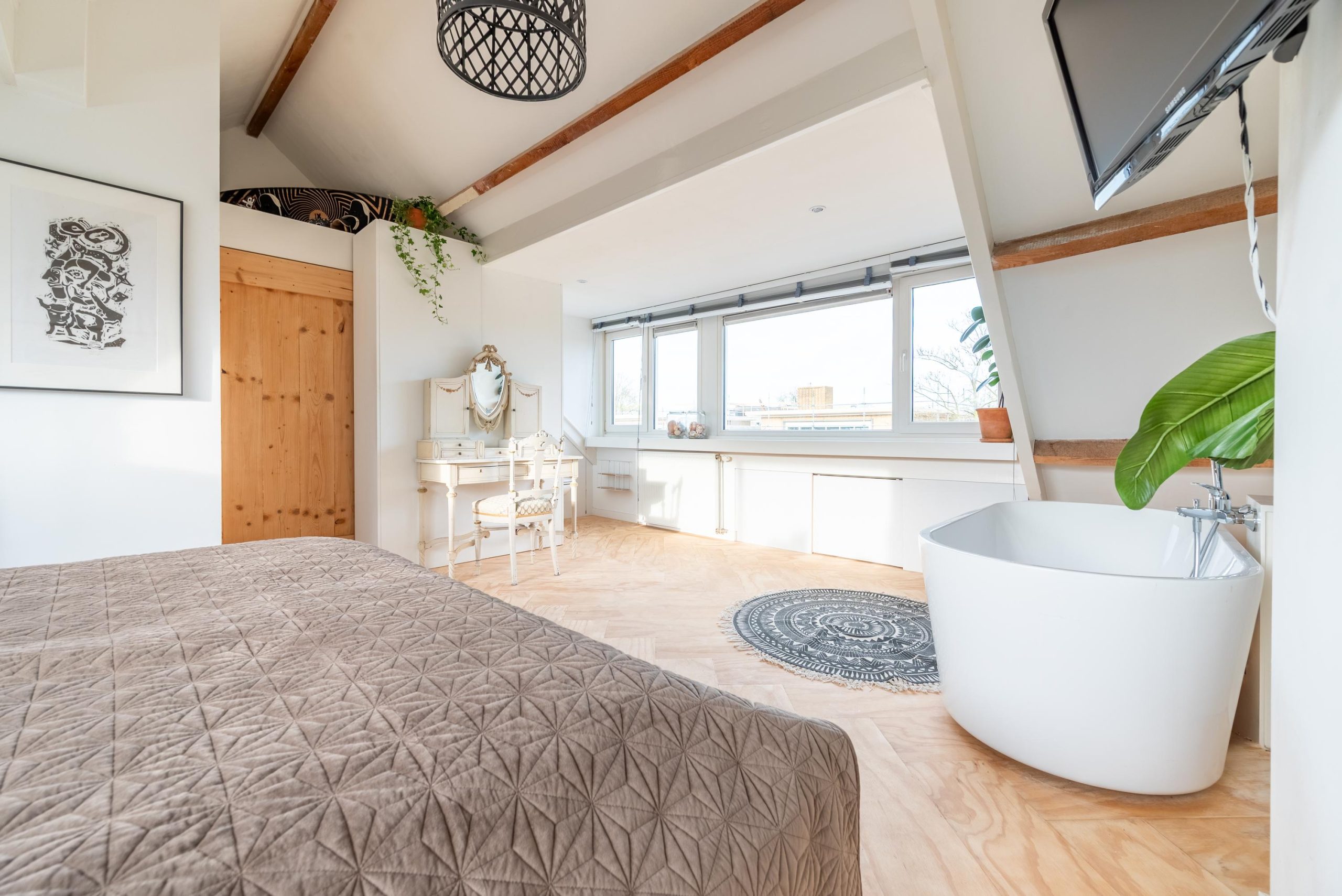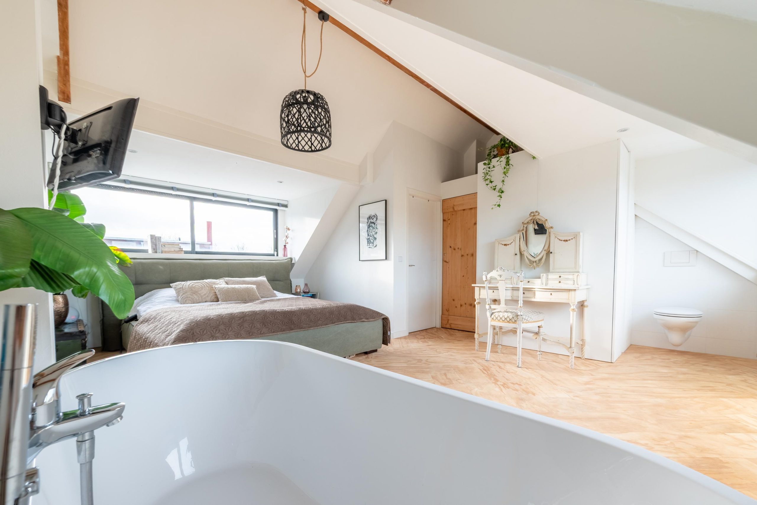 Boven voelt de slaapkamer op de tweede verdieping als een hotelachtige loft, met twee brede dakkapellen, een vrijstaand ligbad, extra toilet, houten vloer en veel licht en ruimte. In totaal zijn er drie toiletten in huis, waardoor het huis ook in praktisch opzicht helemaal is ingericht op gezinsleven. Hier kom je na een drukke dag helemaal tot rust.